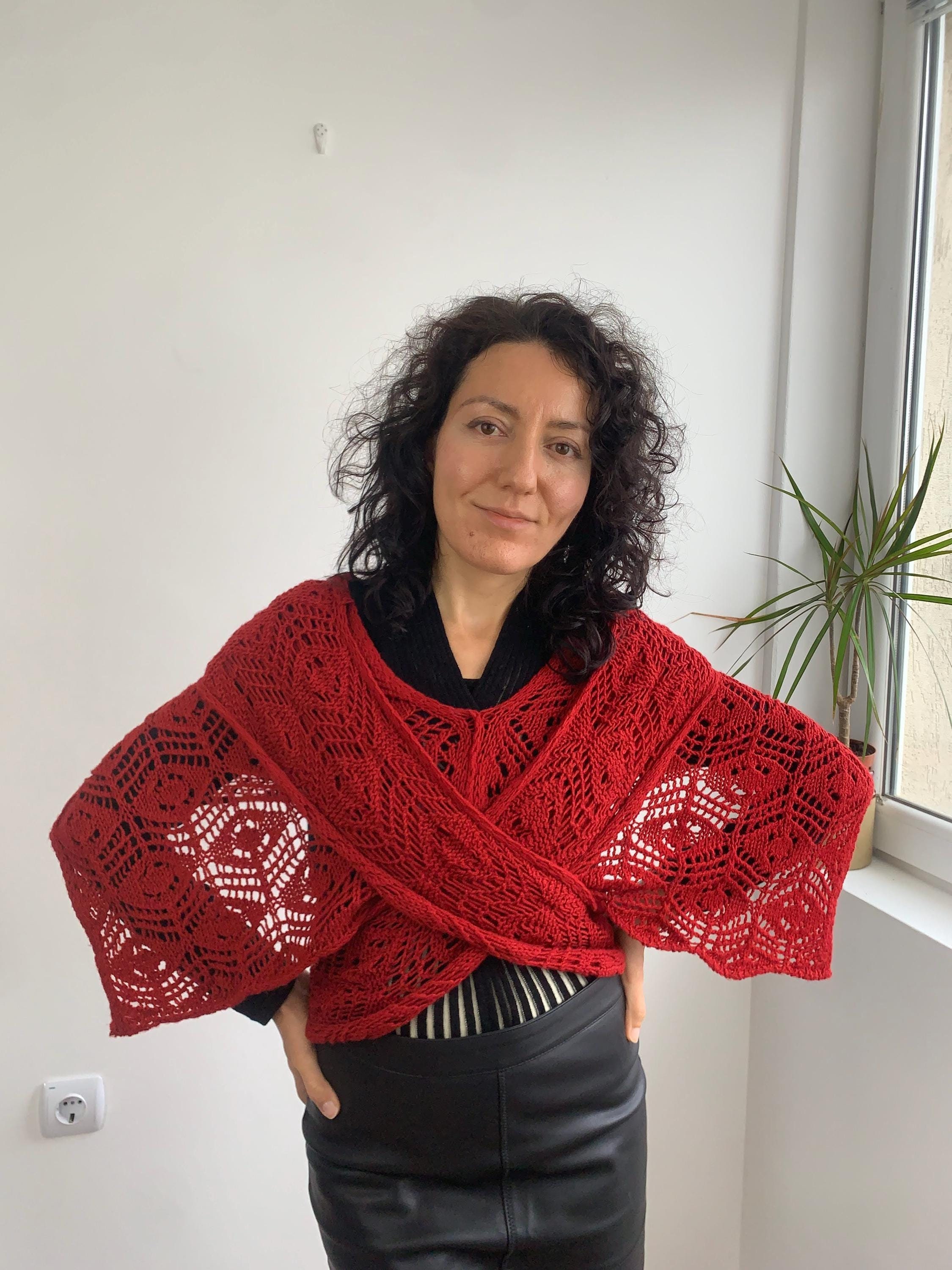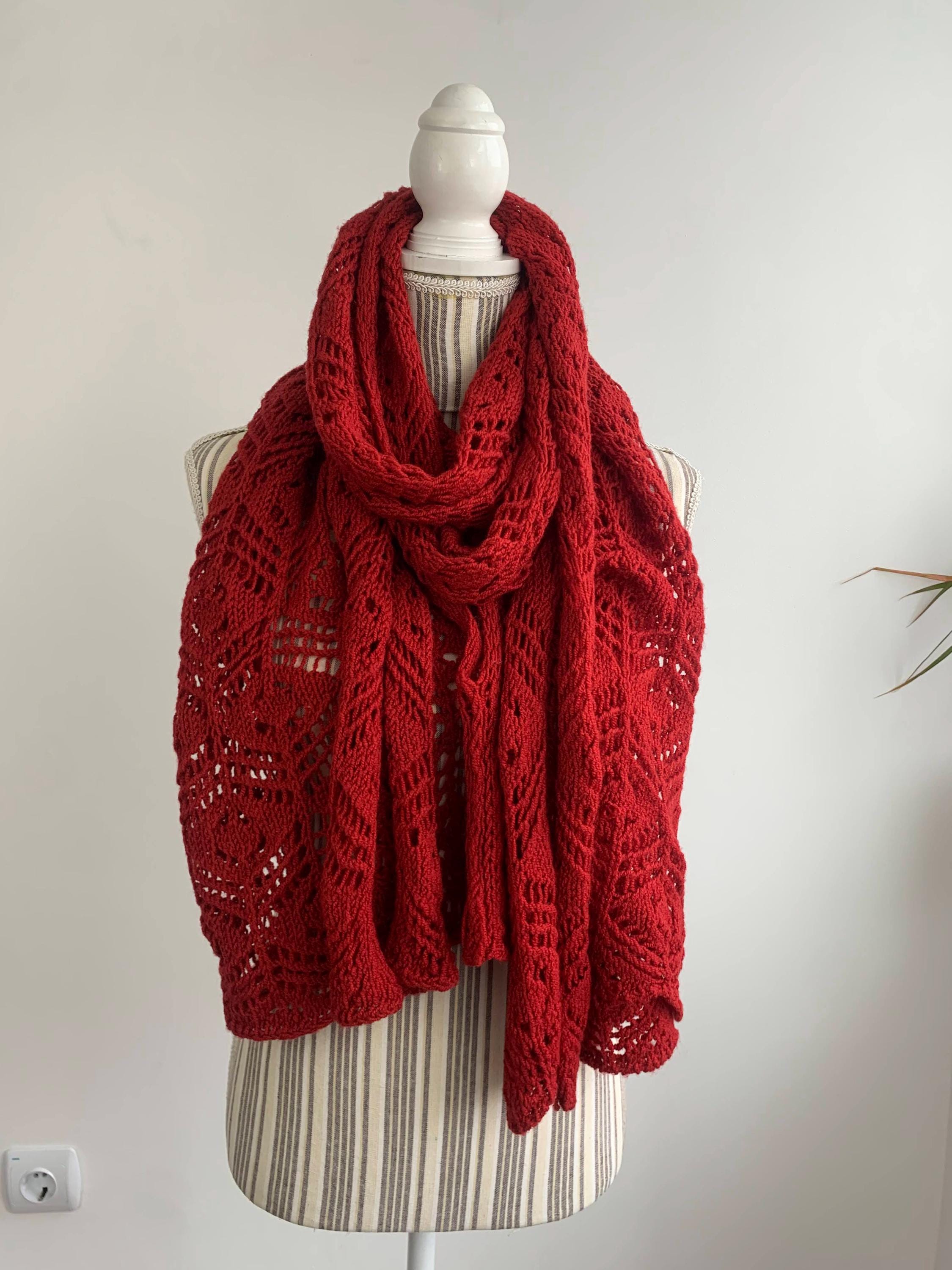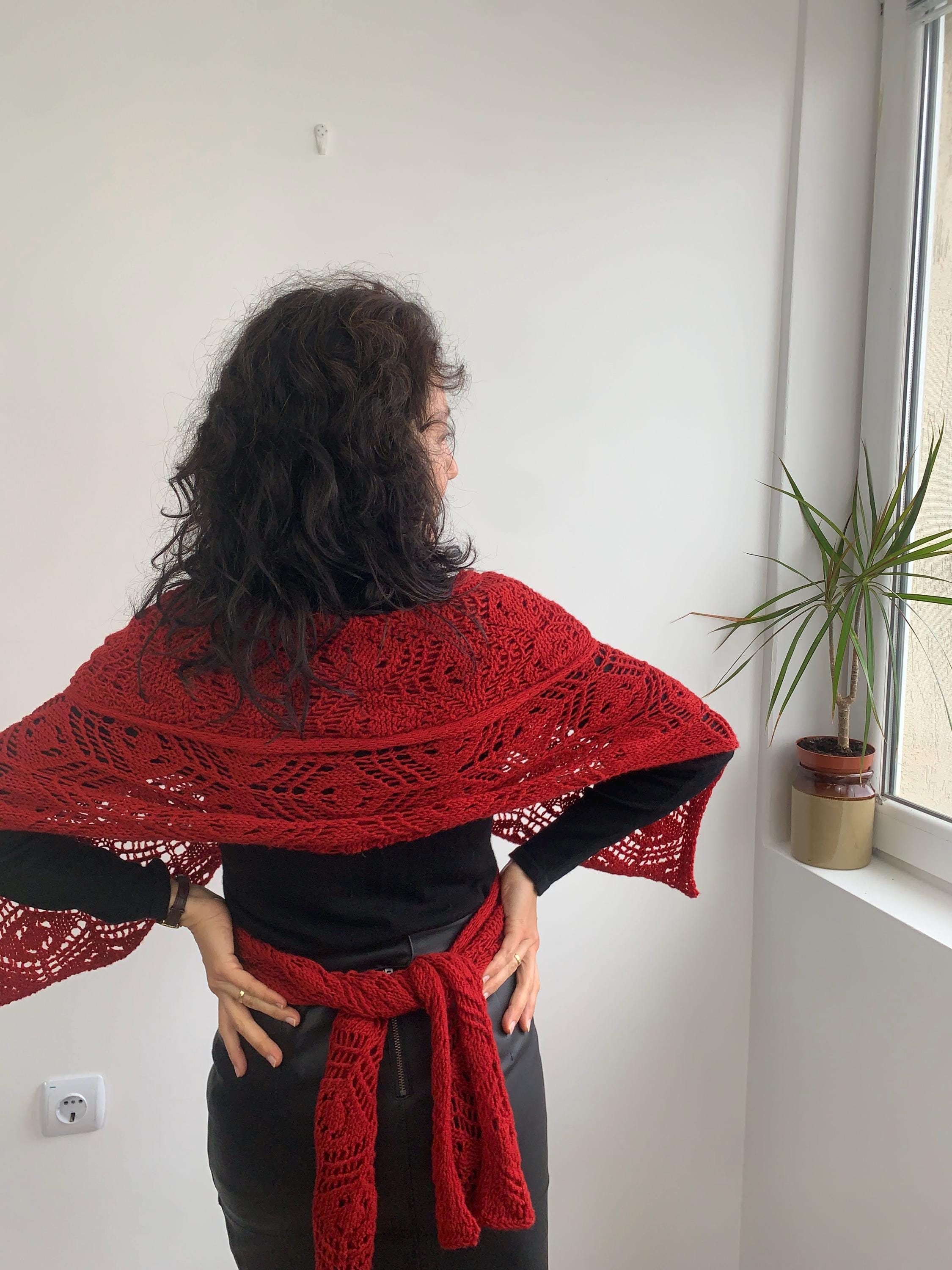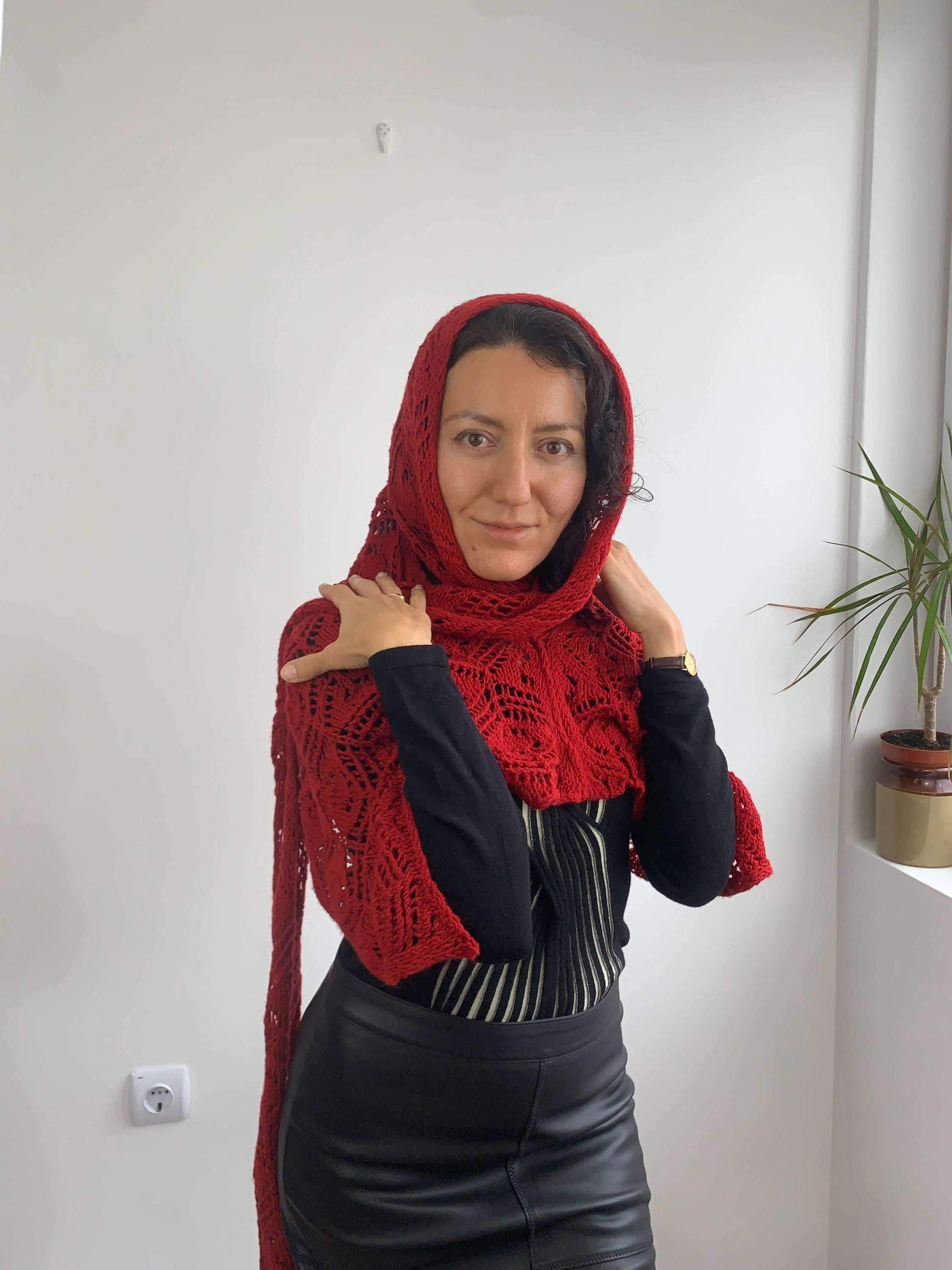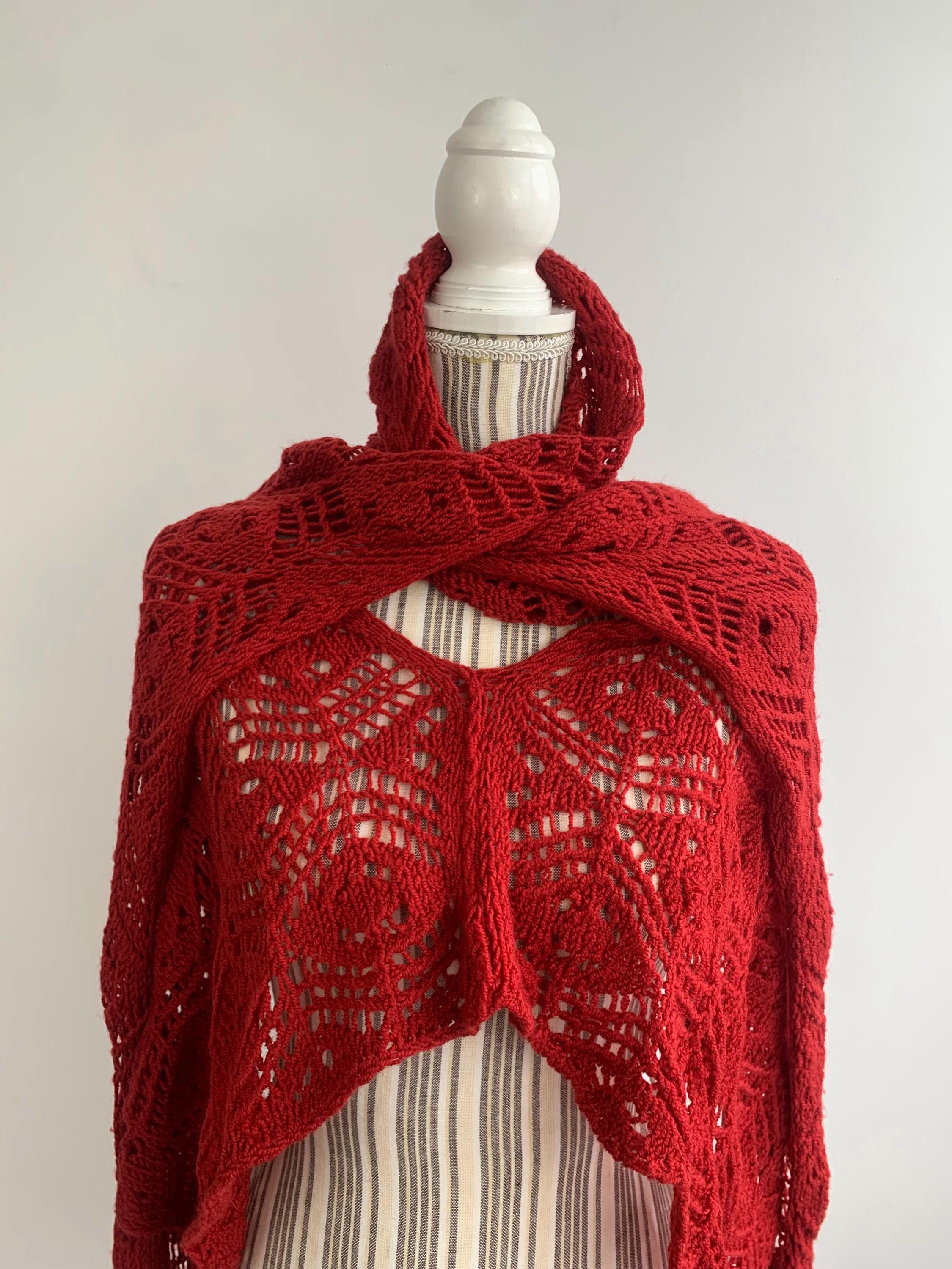 This is a pretty wine red lace knitted multi way cropped cardigan with scarf. This boho chic versatile pullover scarf would be the perfect go to multi way accessory that you need. It i made of soft acrylic wool yarn