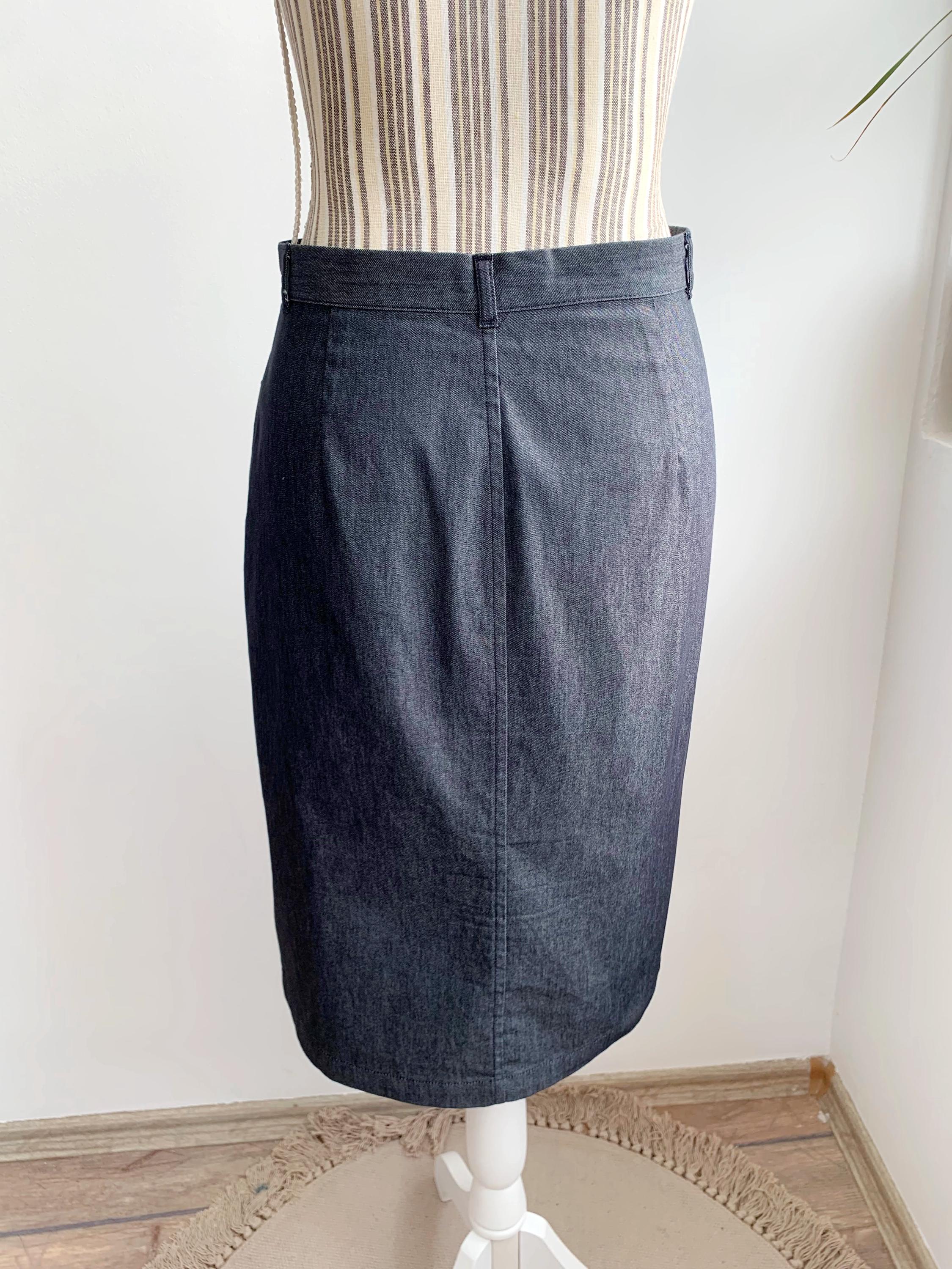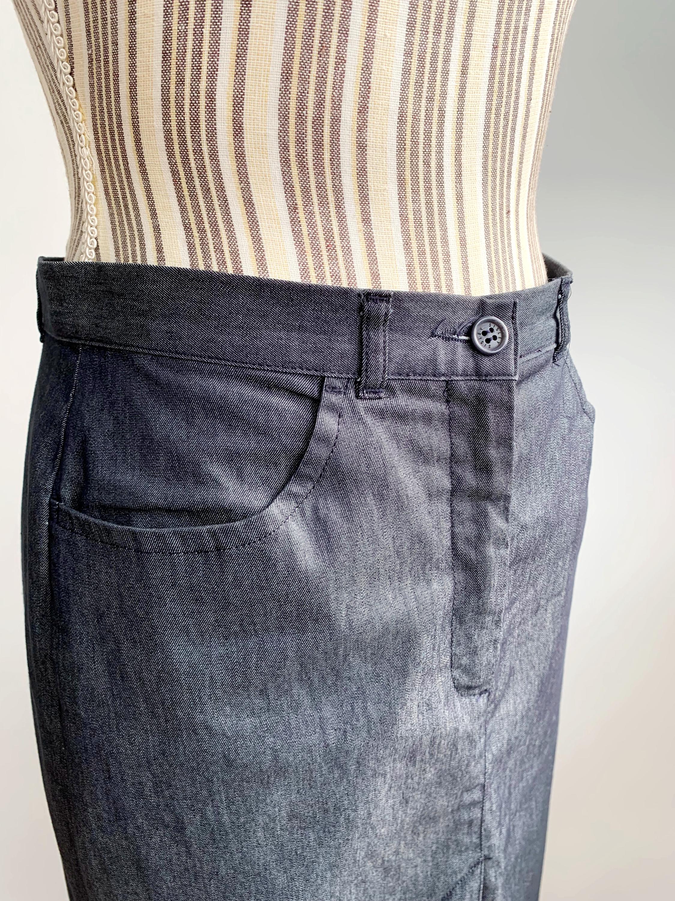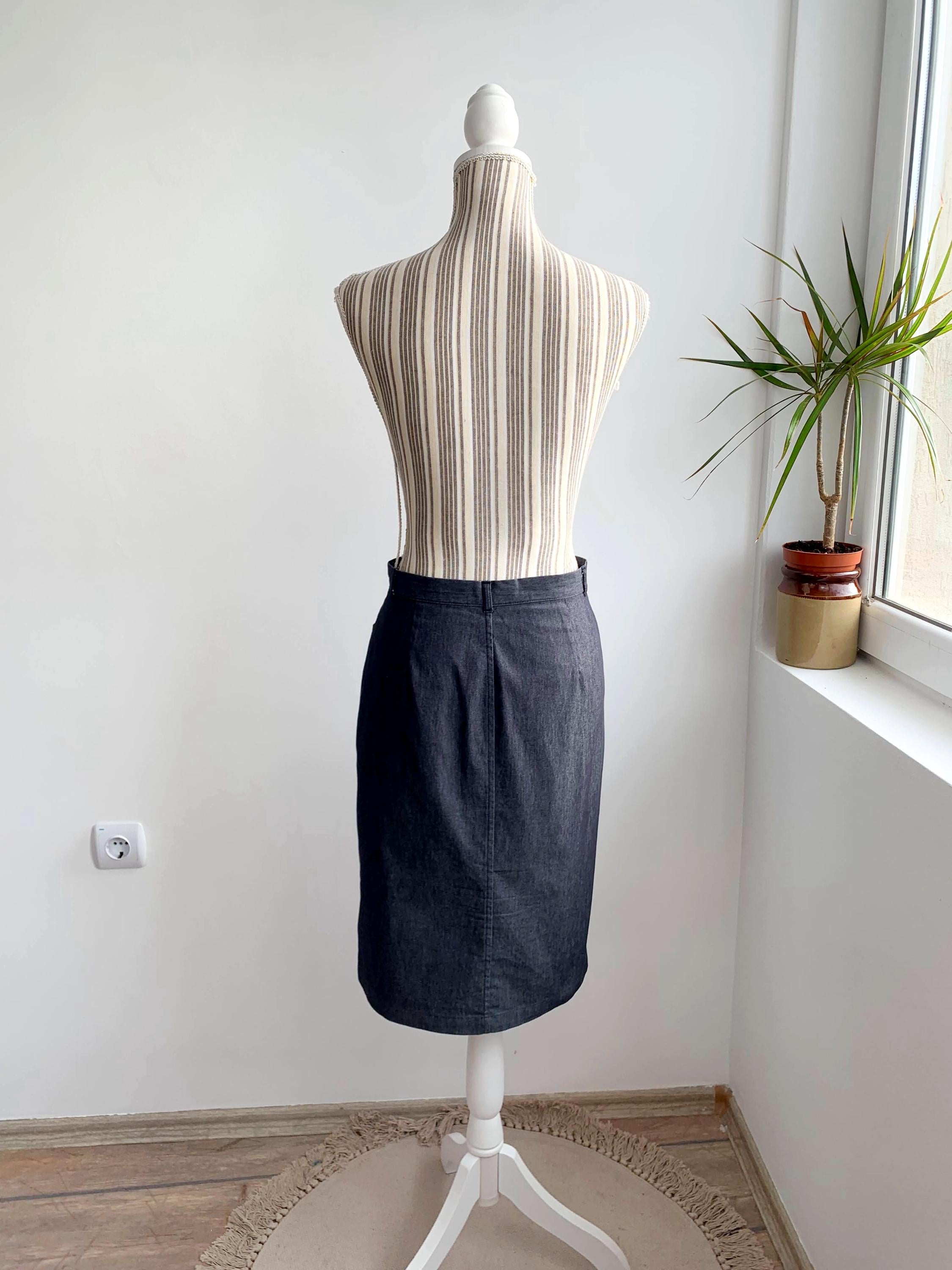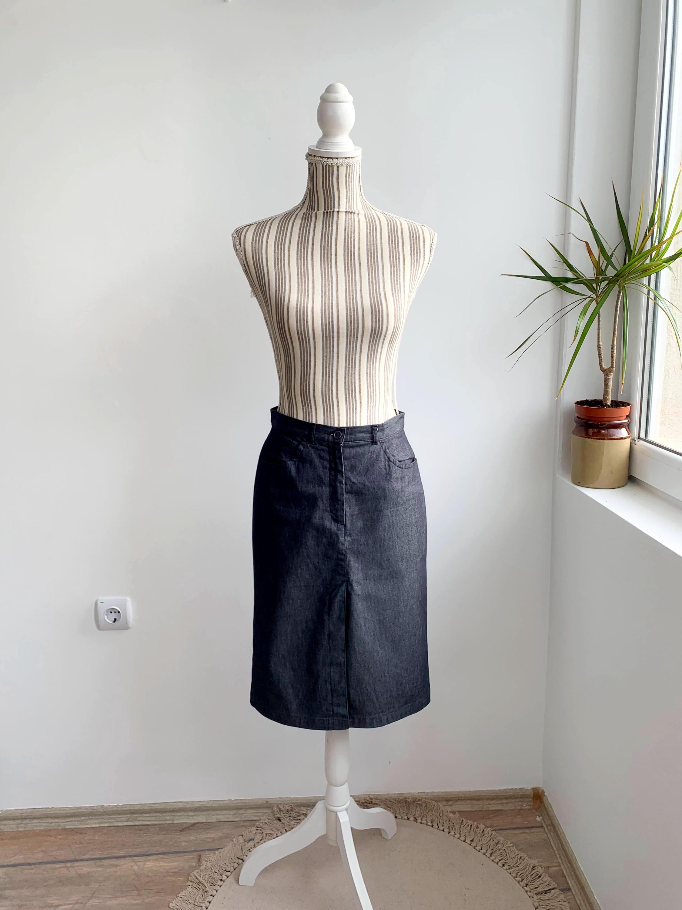 This is a vintage knee length denim skirt by the brand Sisley. This casual denim pencil skirt has a fitted silhouette and front split. This sexy wiggle midi denim skirt is the perfect preppy skirt that you can put on whenever you feel you have nothing to wear. This midi skirt is made of lightweight chambray cotton fabric which has a little bit of stretch (the fabric is 75% cotton, 23% polyamide, 2% elastane). The size marked is 42, it fits like size S.