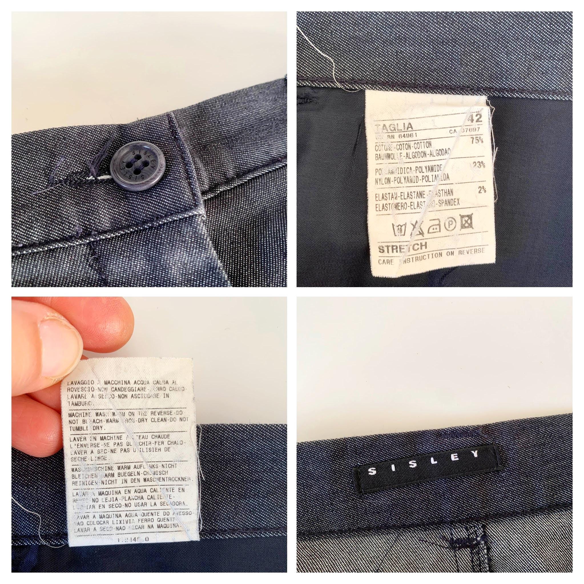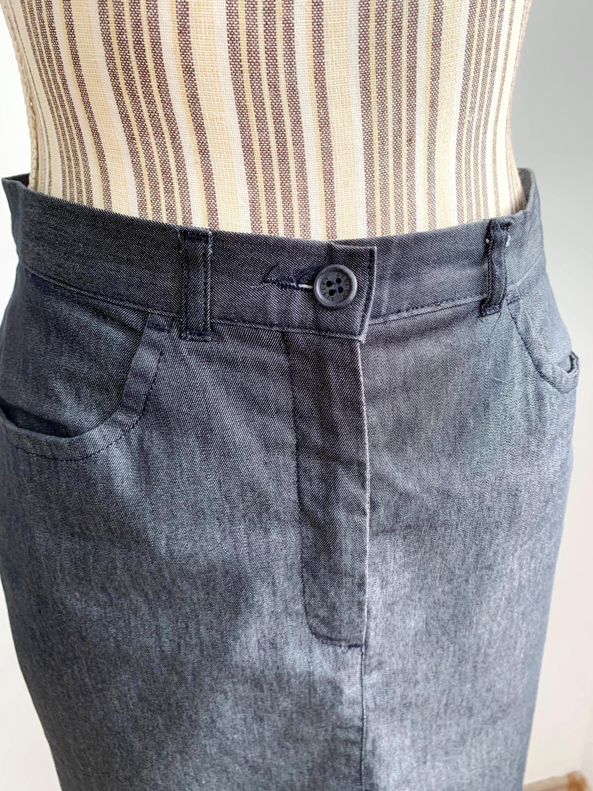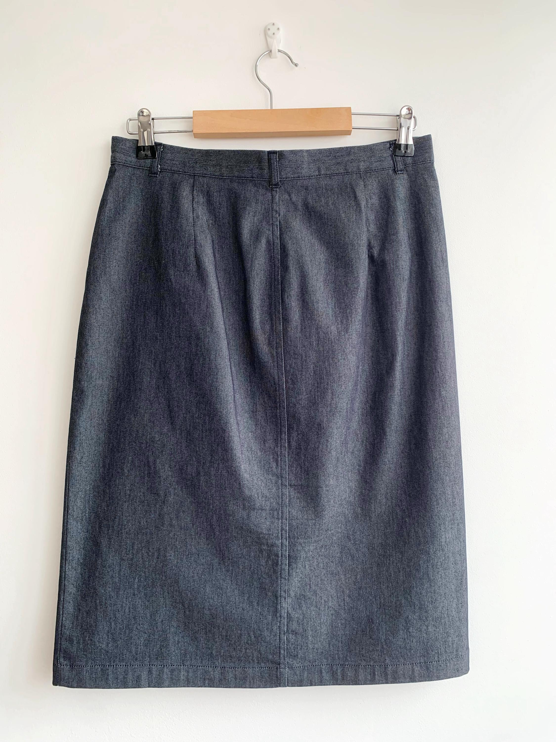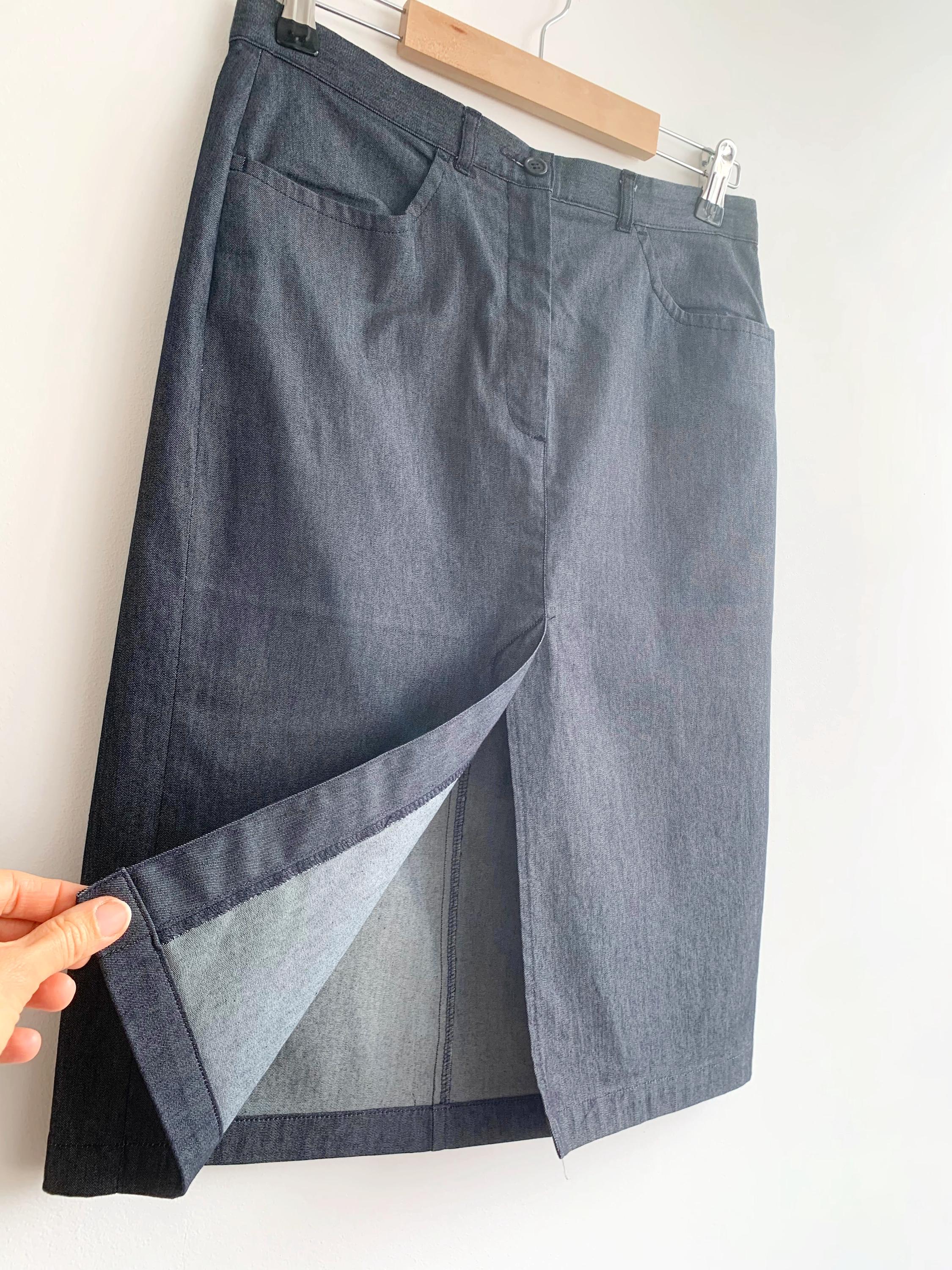 This is a vintage knee length denim skirt by the brand Sisley. This casual denim pencil skirt has a fitted silhouette and front split. This sexy wiggle midi denim skirt is the perfect preppy skirt that you can put on whenever you feel you have nothing to wear. This midi skirt is made of lightweight chambray cotton fabric which has a little bit of stretch (the fabric is 75% cotton, 23% polyamide, 2% elastane). The size marked is 42, it fits like size S.