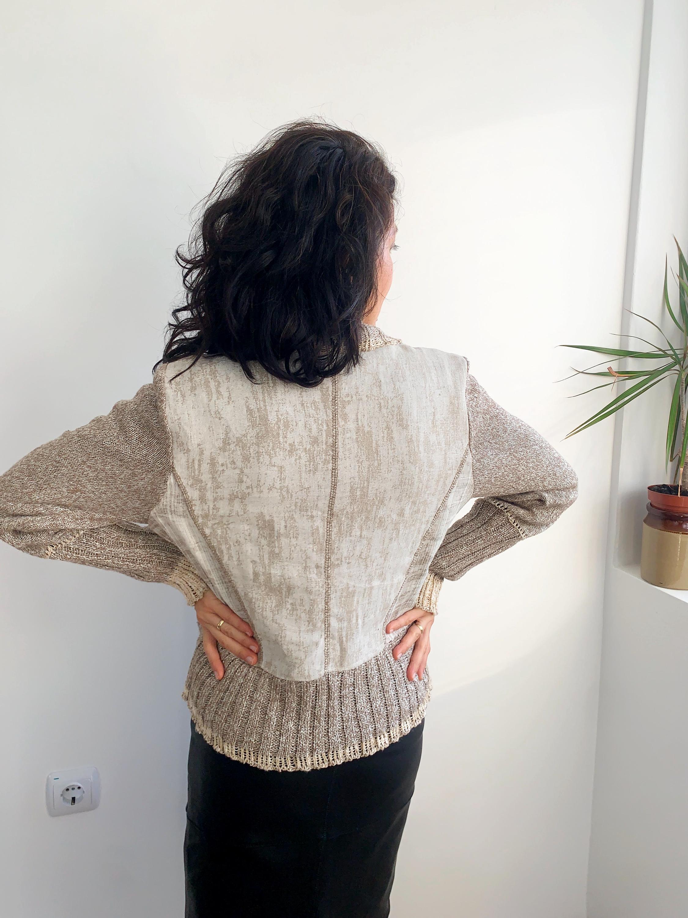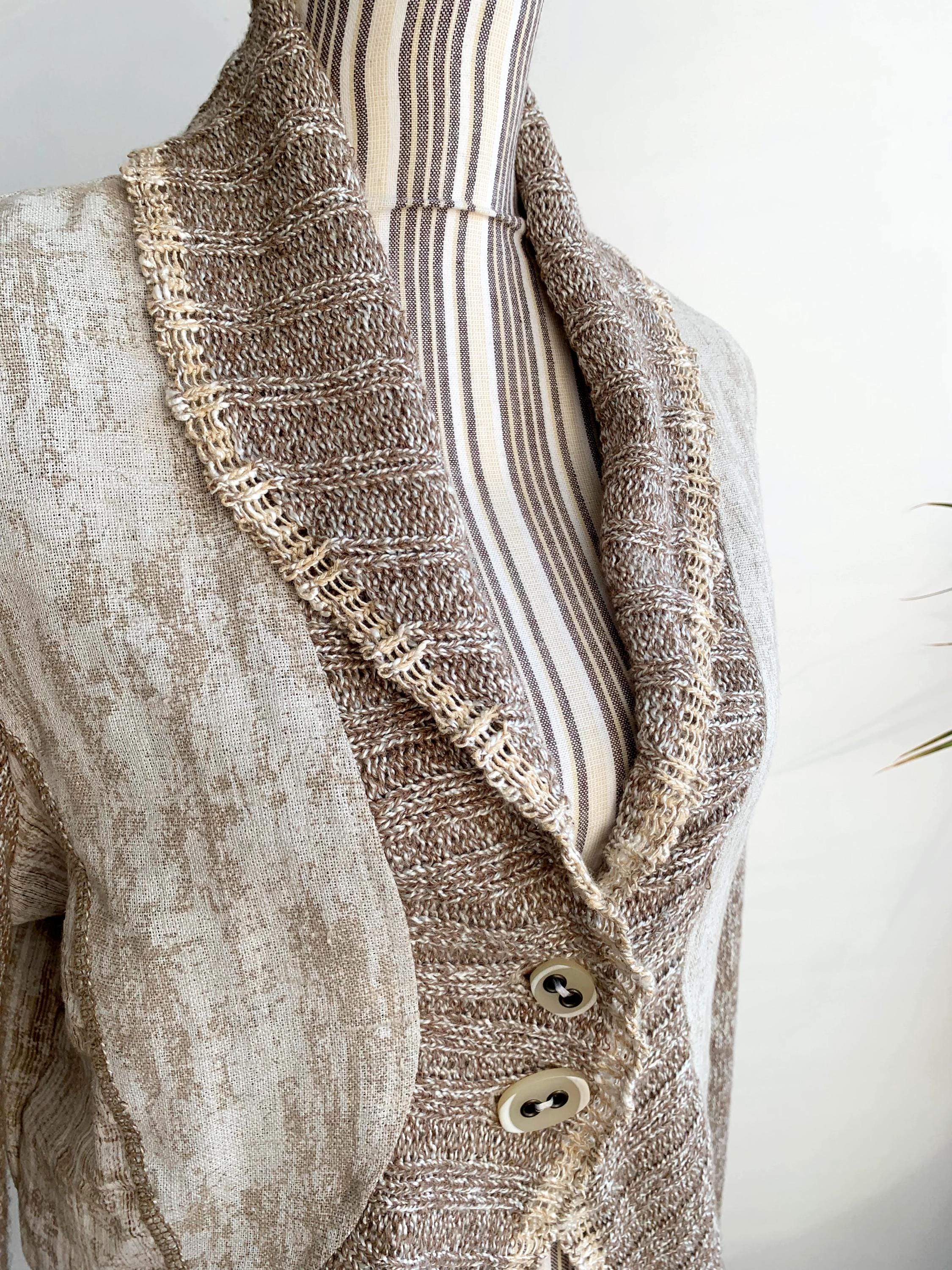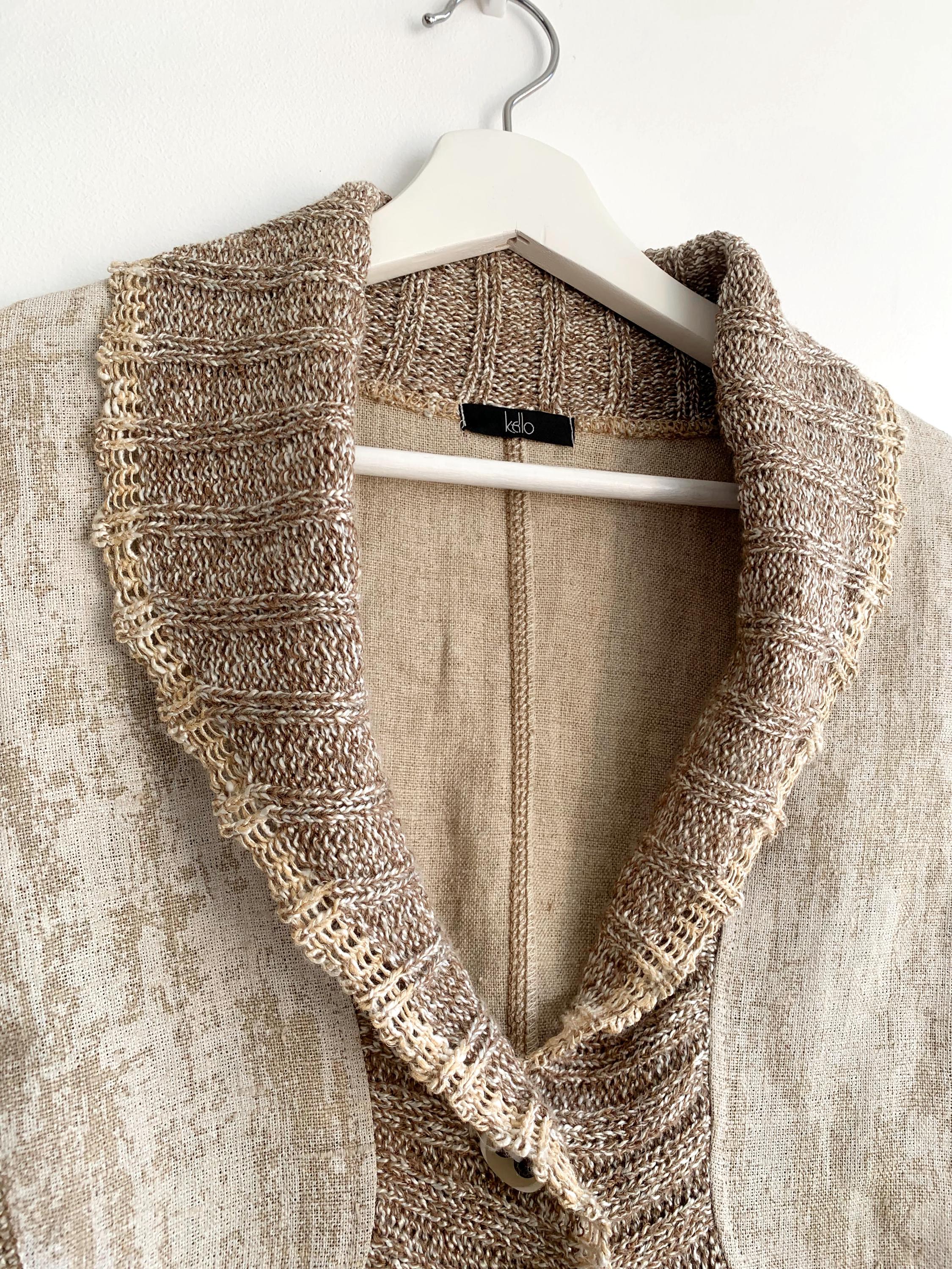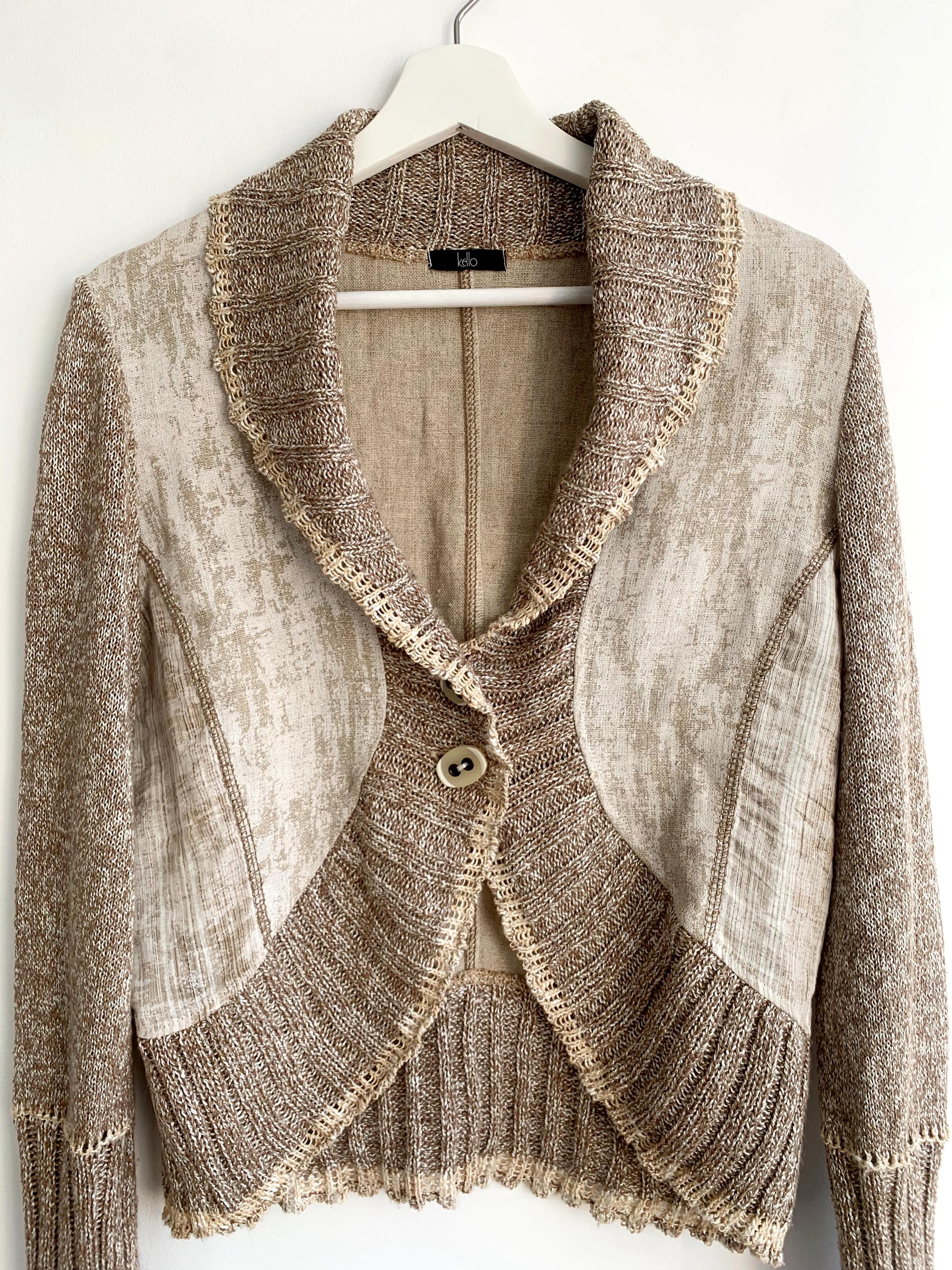 This is a beautiful vintage linen cotton blend cardigan for women with knitted collar and knitted long sleeves with two button closure. This bolero style short light linen unlined coat is perfect for the spring summer season. The size marked is 40 which fits like size M. Please check the measurements below