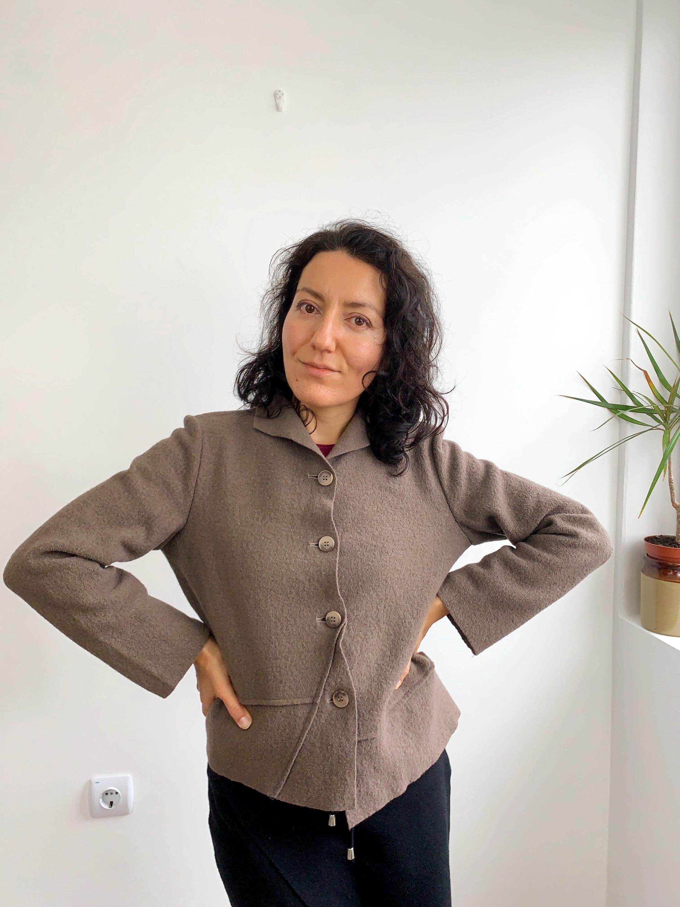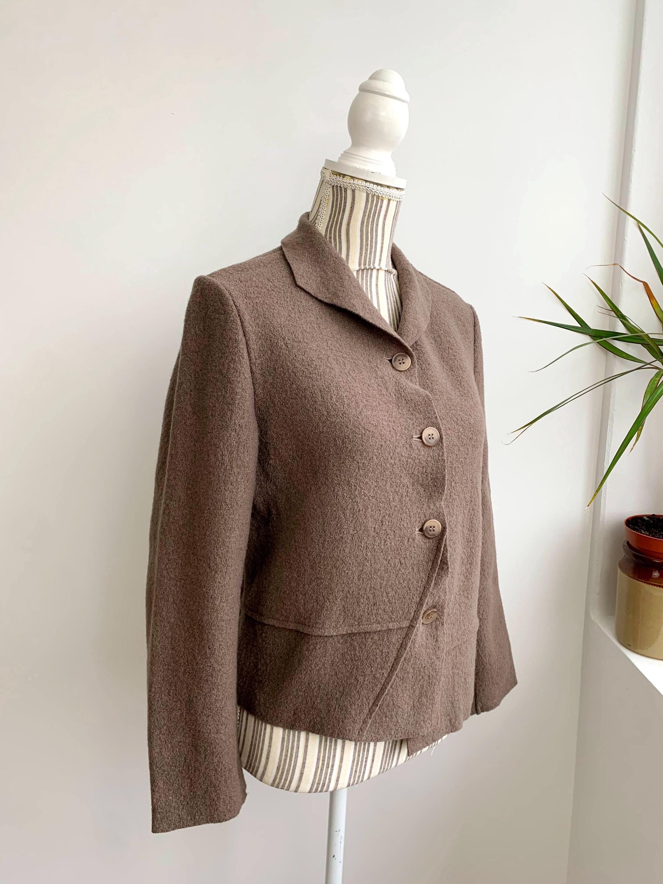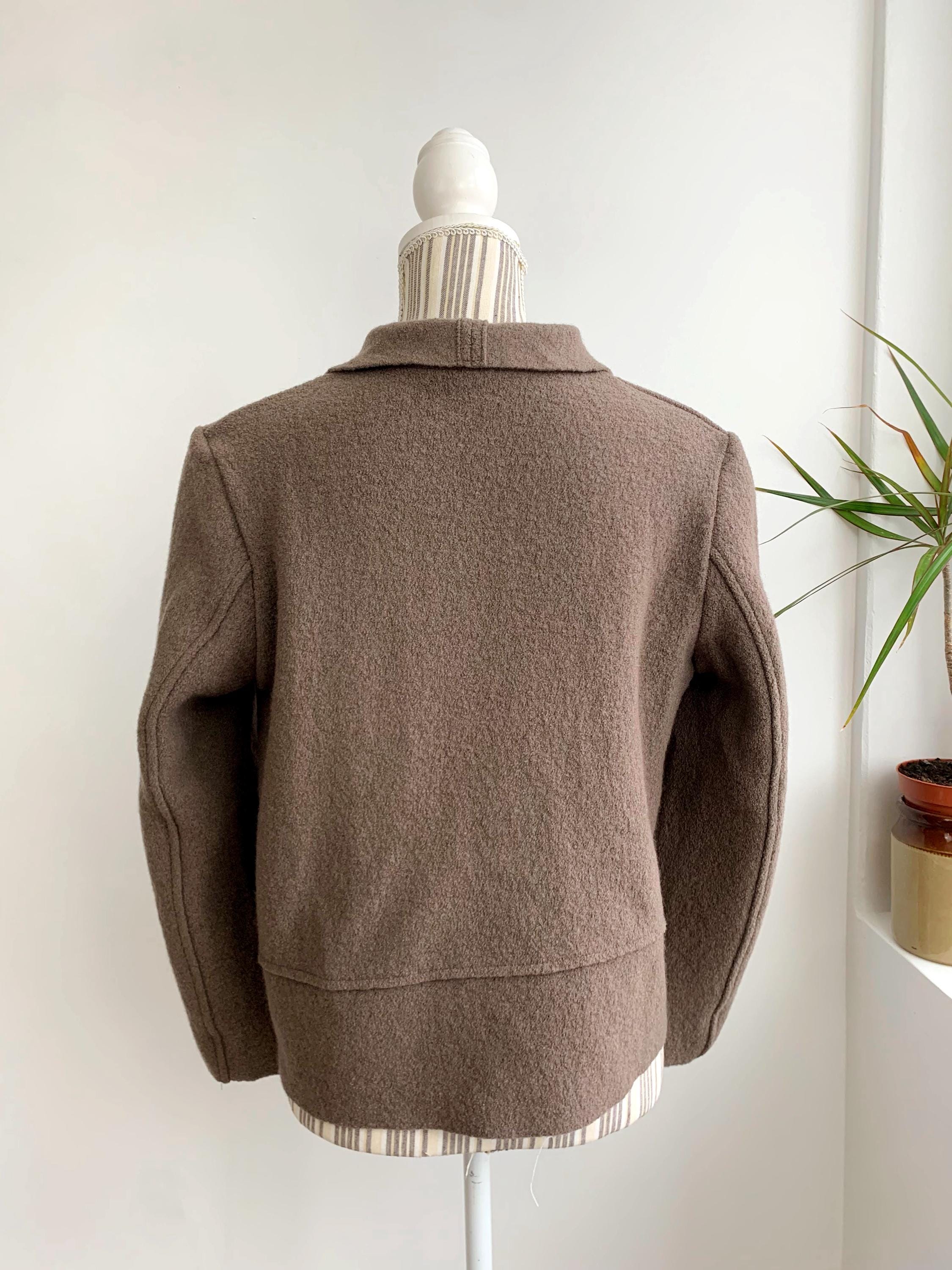 Lovely vintage boiled wool unlined blazer jacket with asymmetrical silhouette and button front closure. Beautiful taupe brown grey wool sweater blazer with no lining, perfect for the spring fall season.