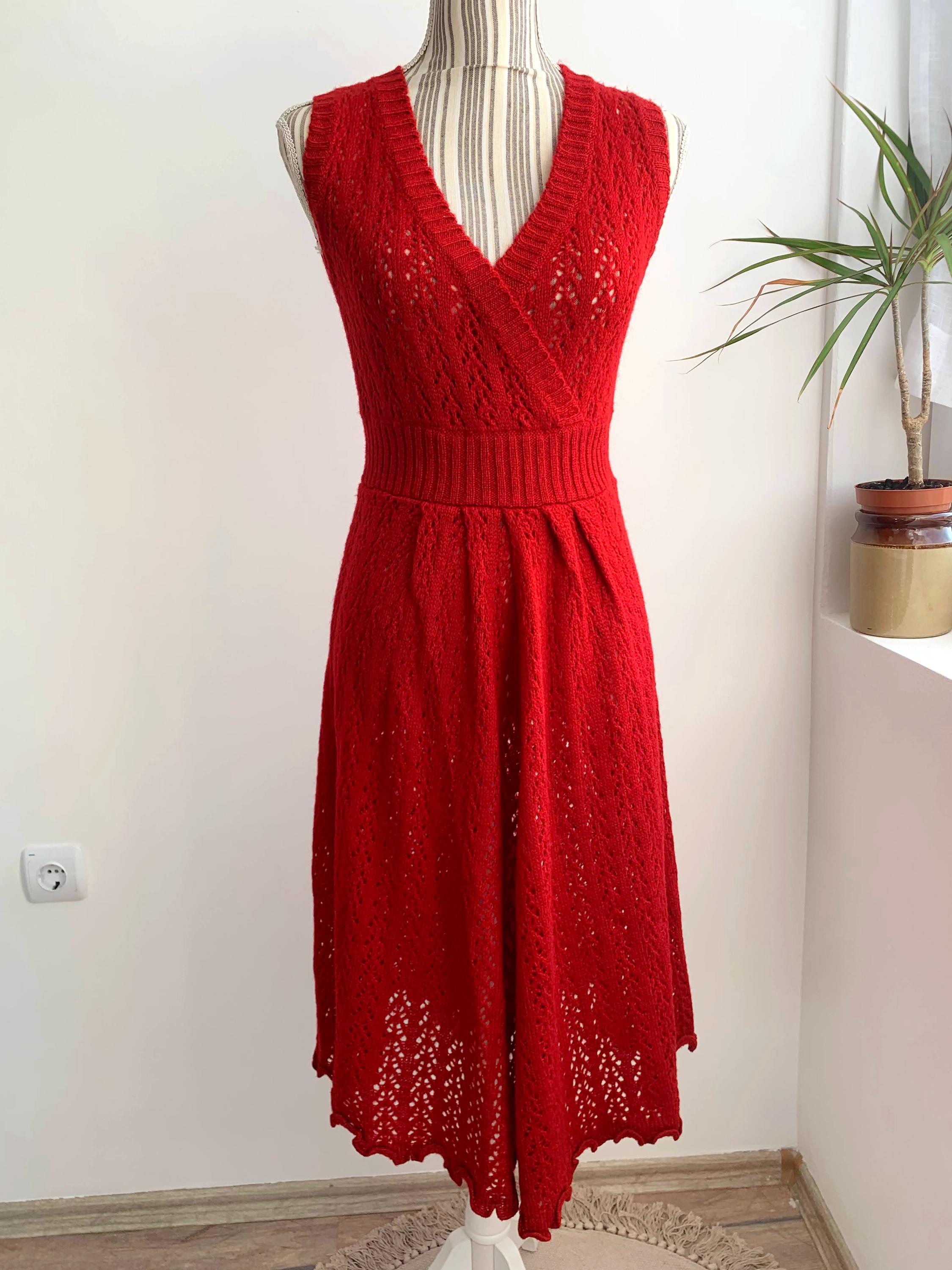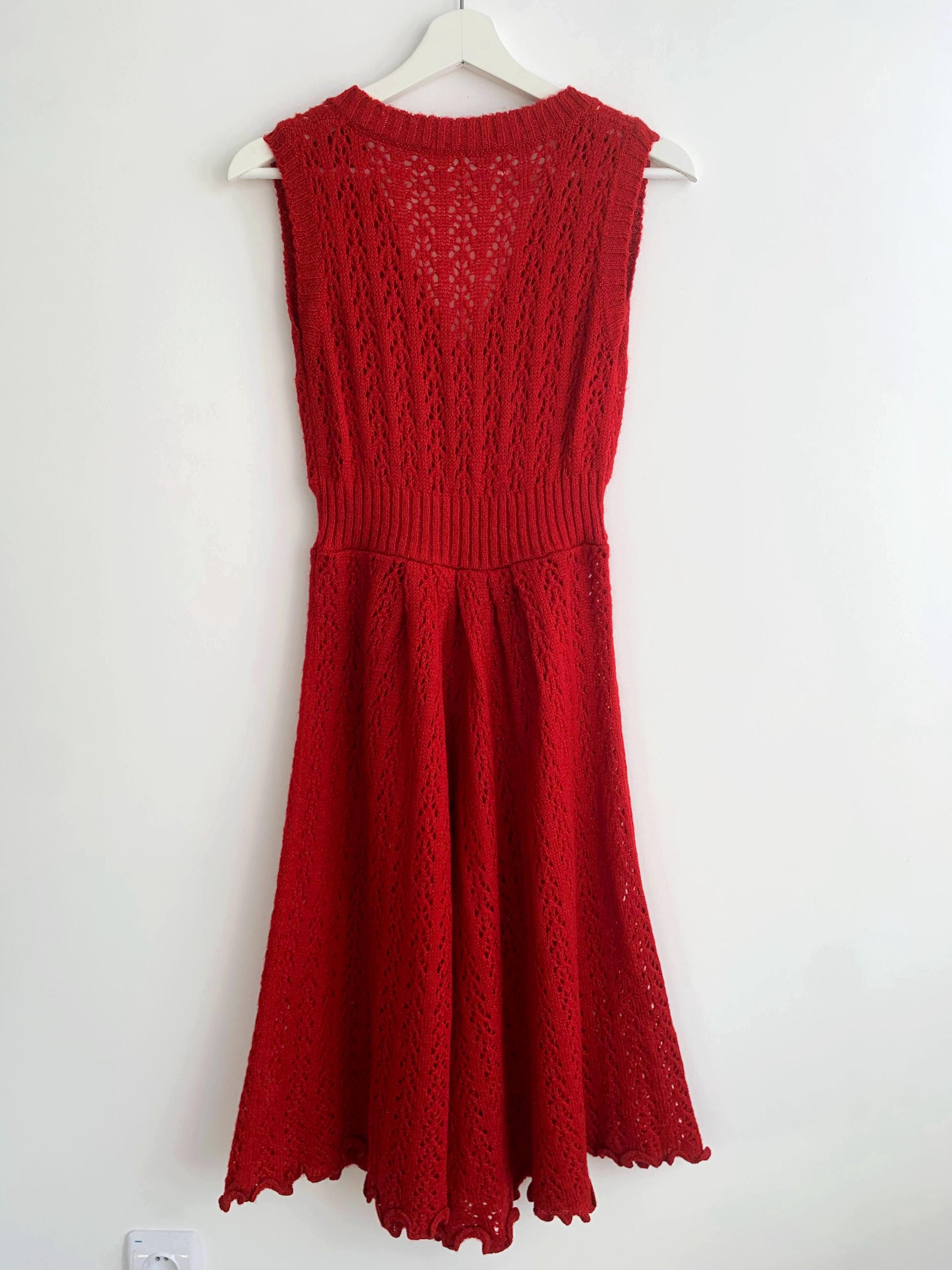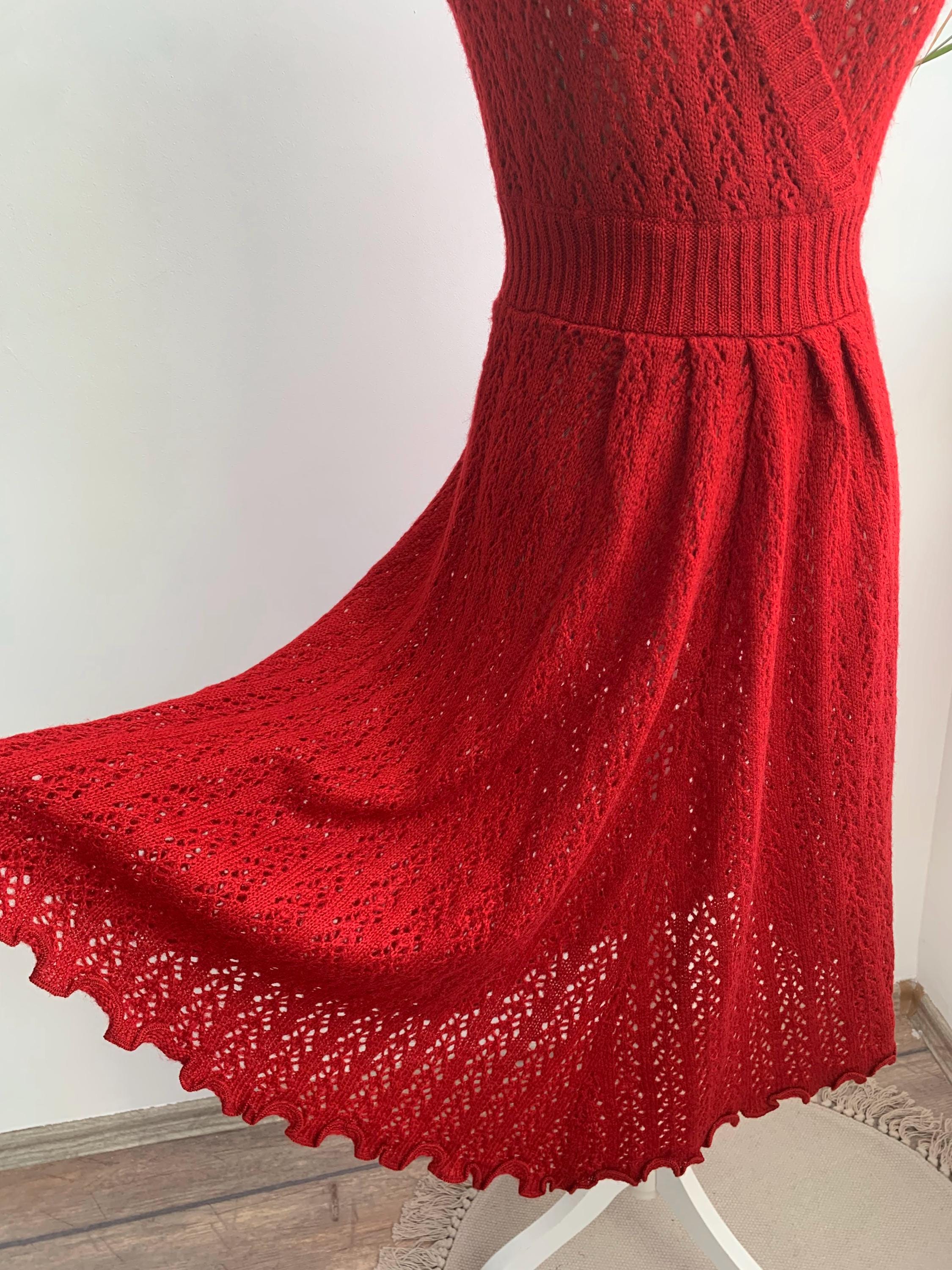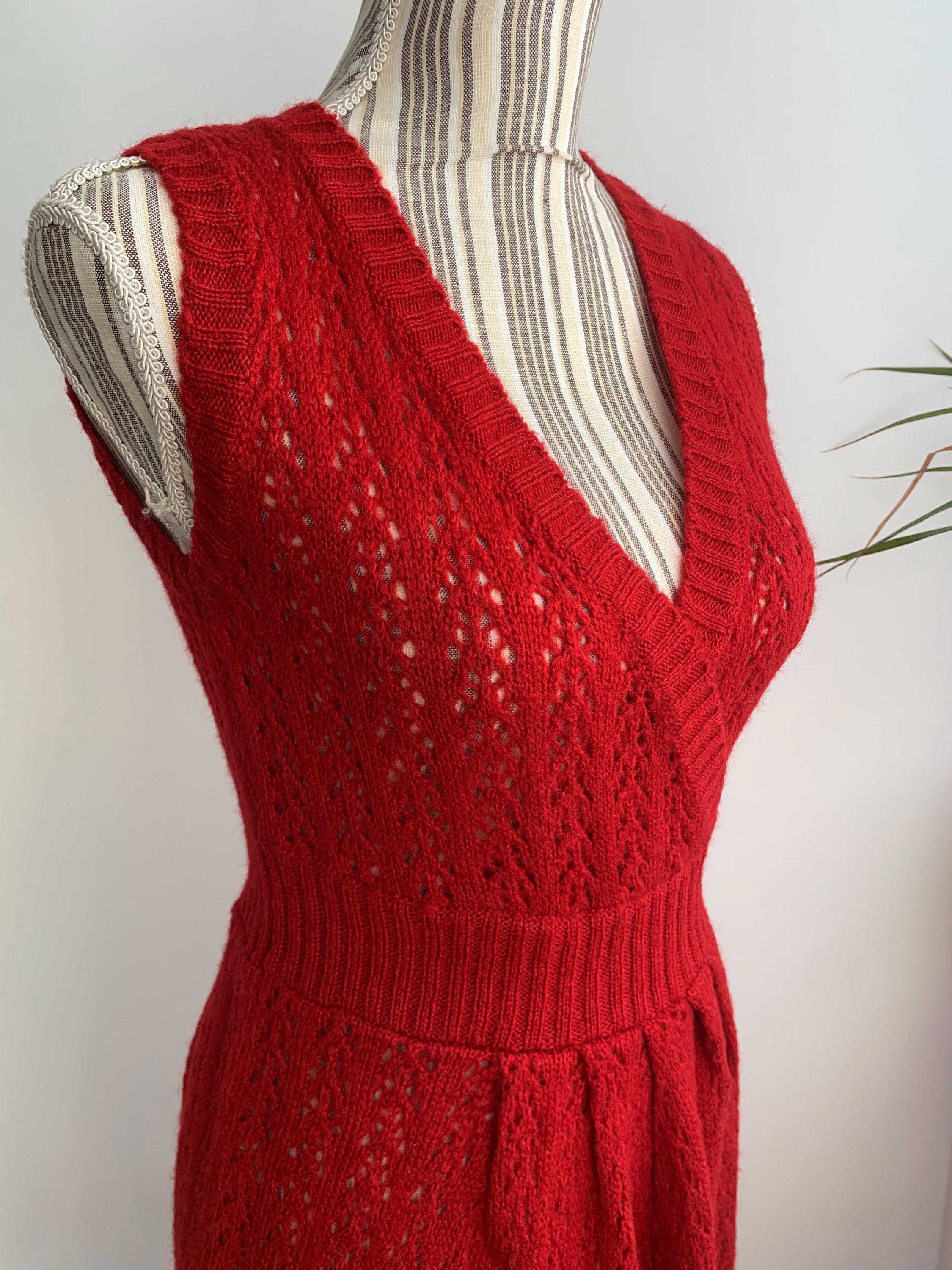 This is a vintage red wool blend knitted midi dress with high waistline and a line silhouette. Fits like size S. I am modelling the dress and I wear size S/ EUR 36 / US 6 / UK 10.