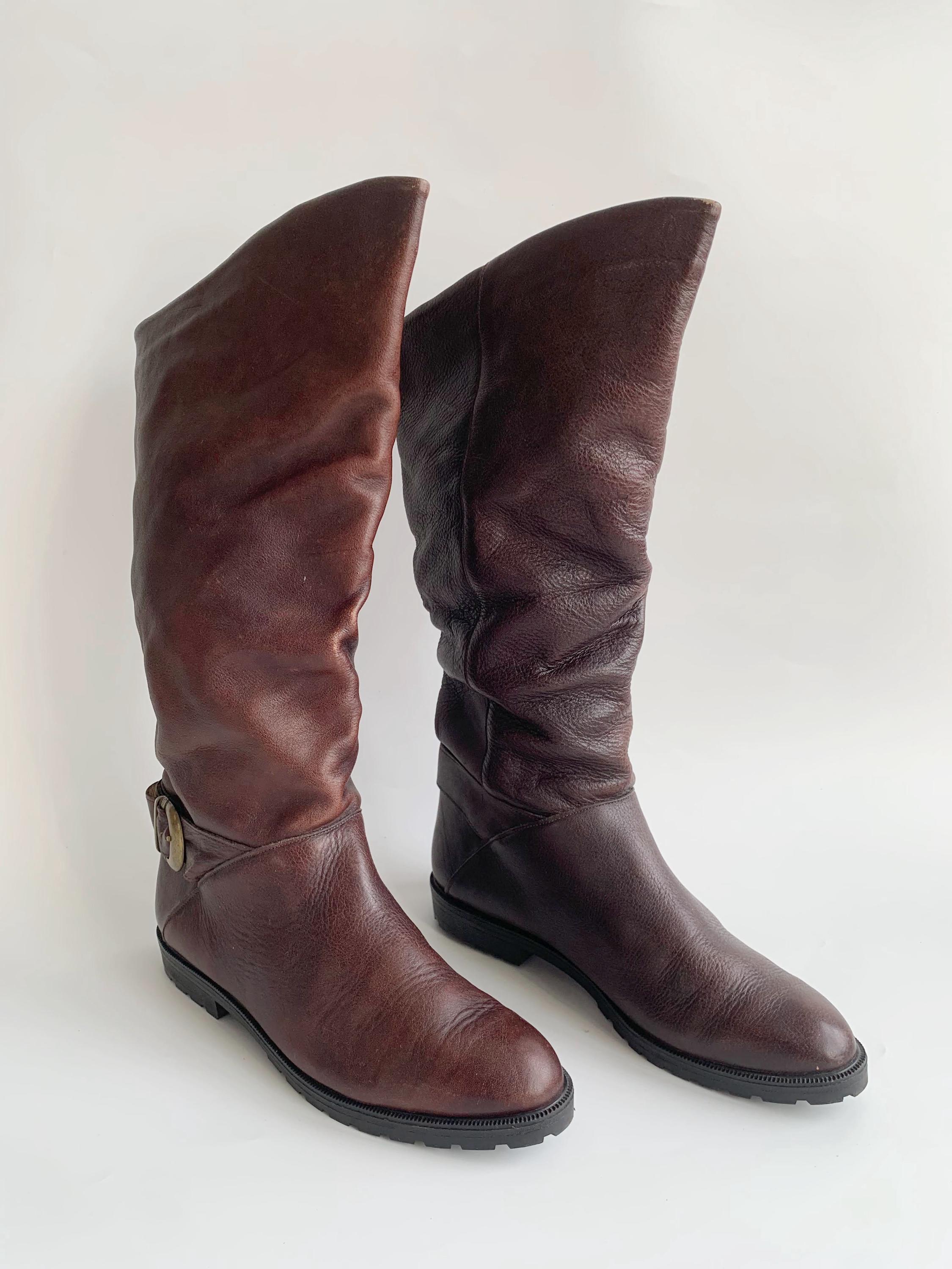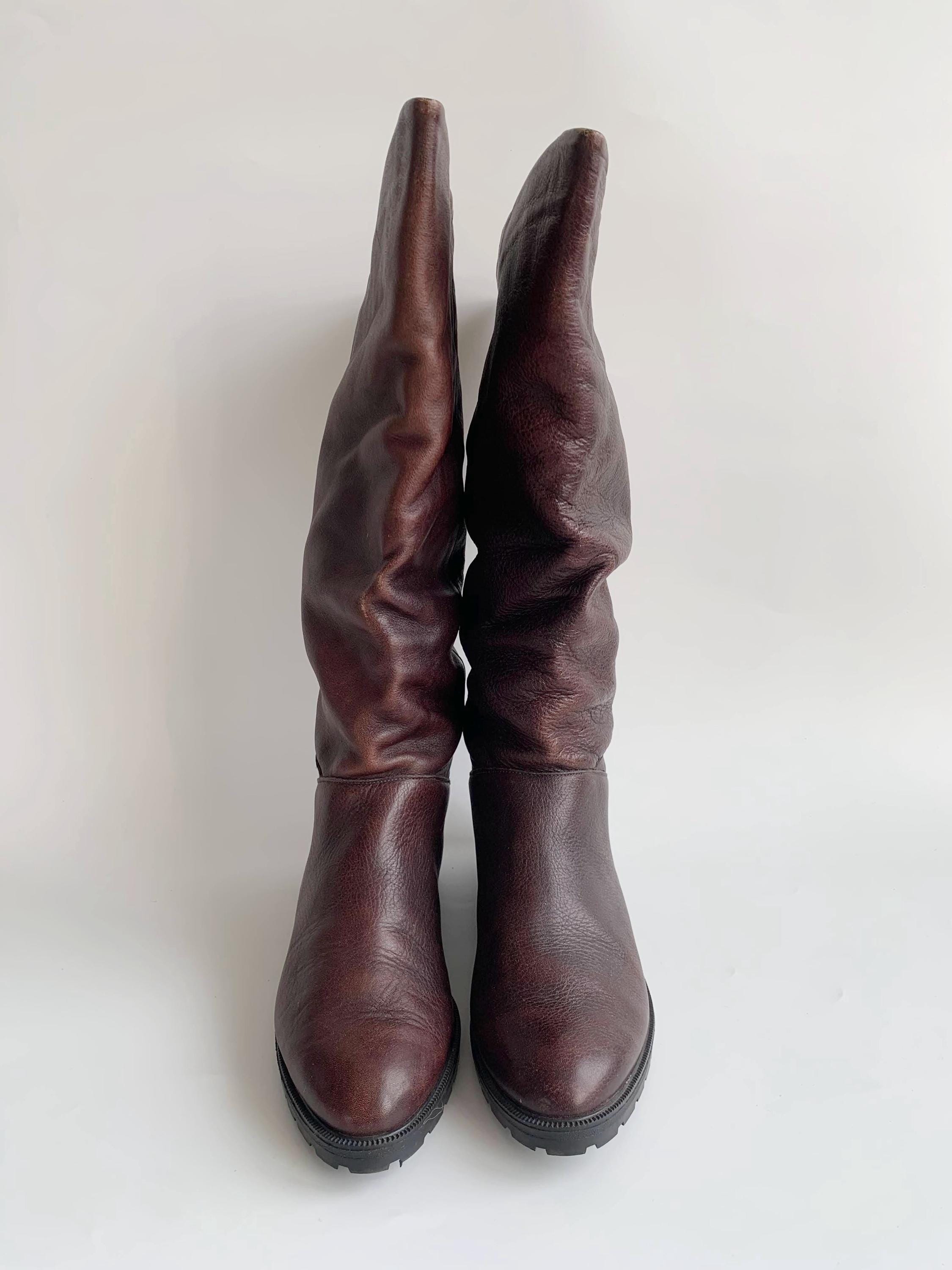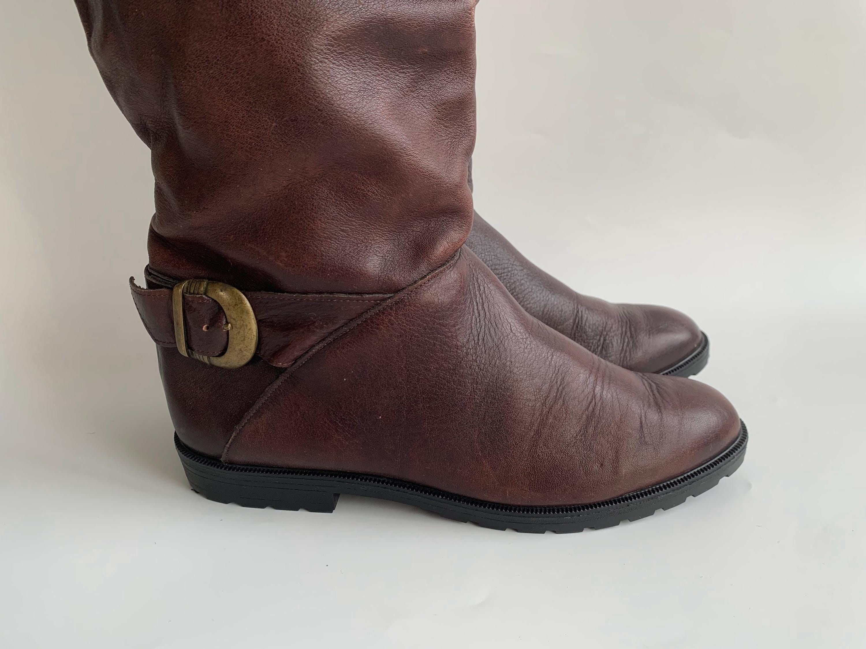 Condition: These burgundy brown leather boots have a distressed leather look. There are scratches and marks on the leather surface and some fading of the leather around the creases where the boots slouches at the ankle. I have tried to capture these signs of wear in the close up photos.