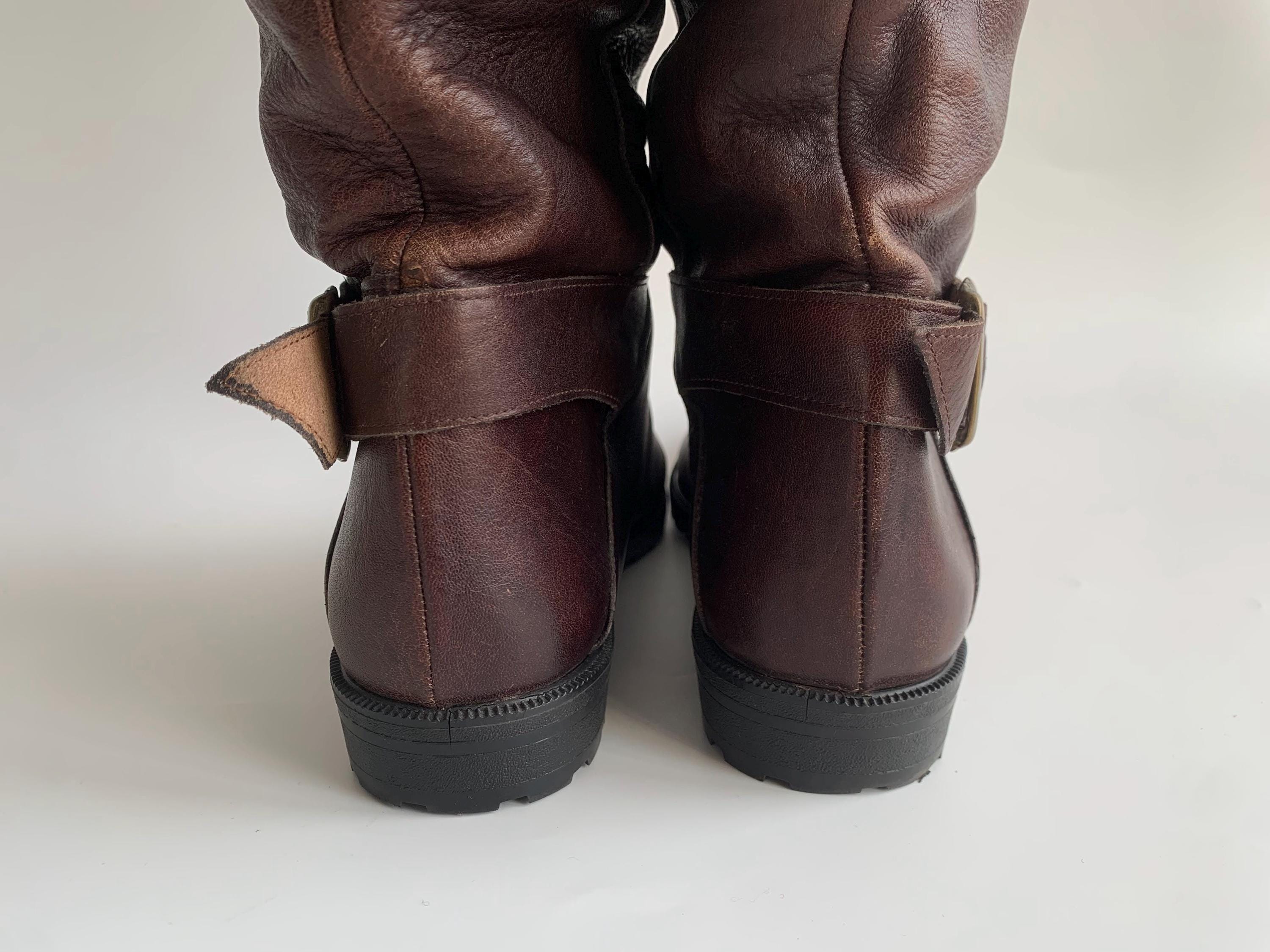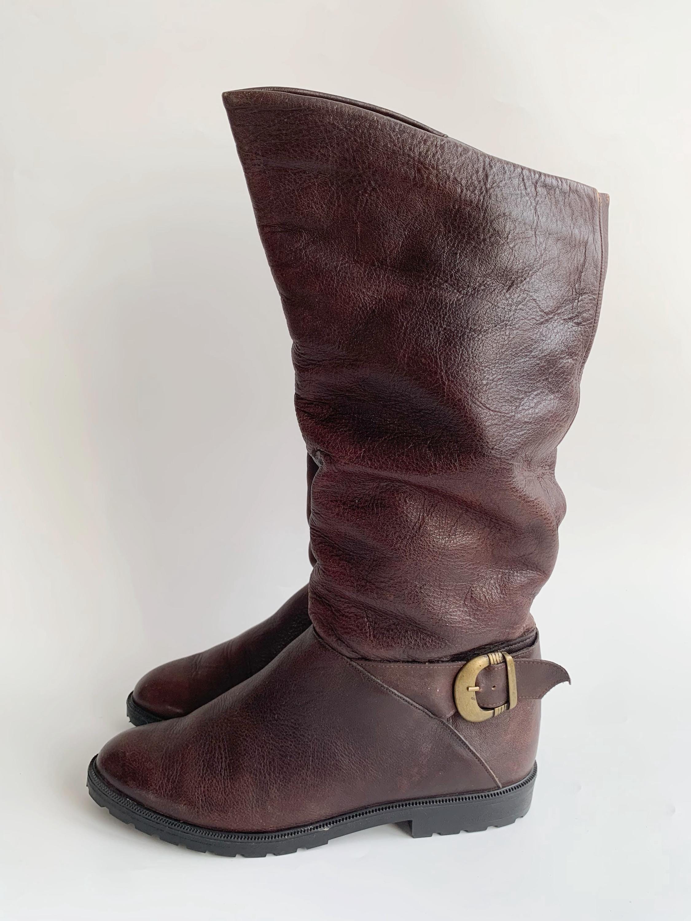 These are vintage 80s burgundy brown leather boots for women made of super soft distressed genuine leather, felted wool lining and rubber non slip sole. These low heel slip on boots have wife calf and ankle, so you can easily pull them on and take them off. These slip on boots are size EUR 40, however they fit smaller, like size EUR 38, UK 5, US 7.5. Please check the measurements below.
