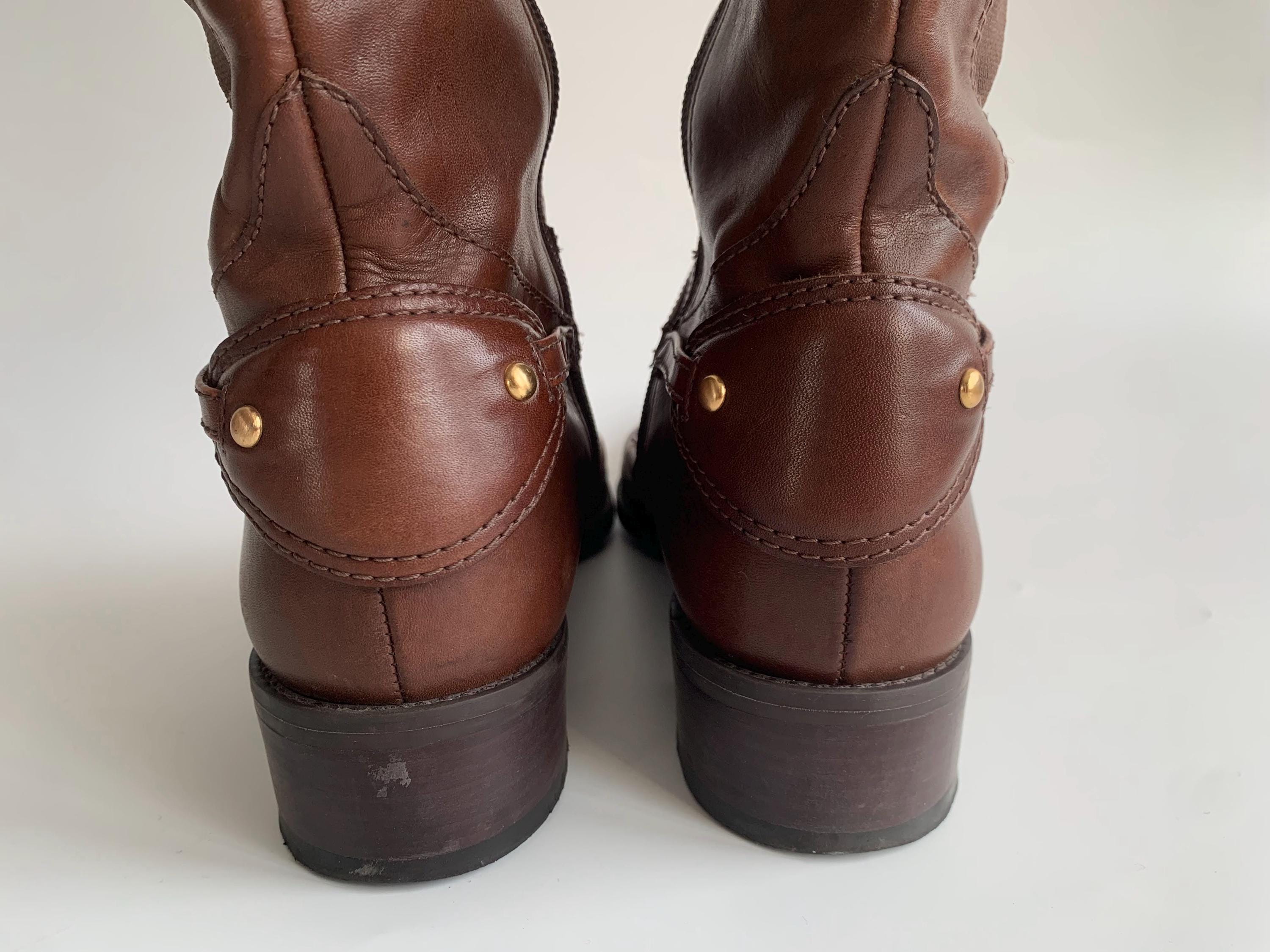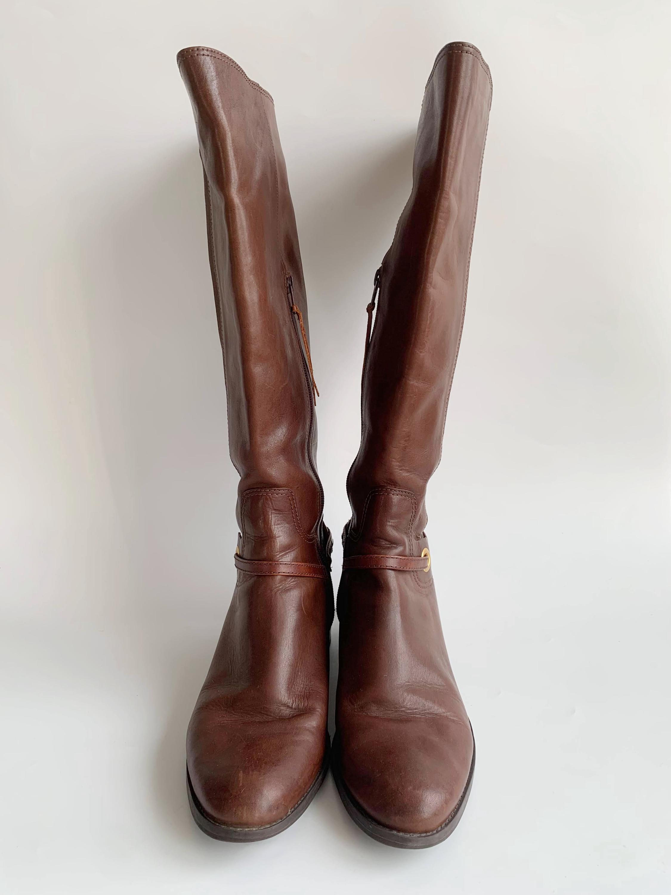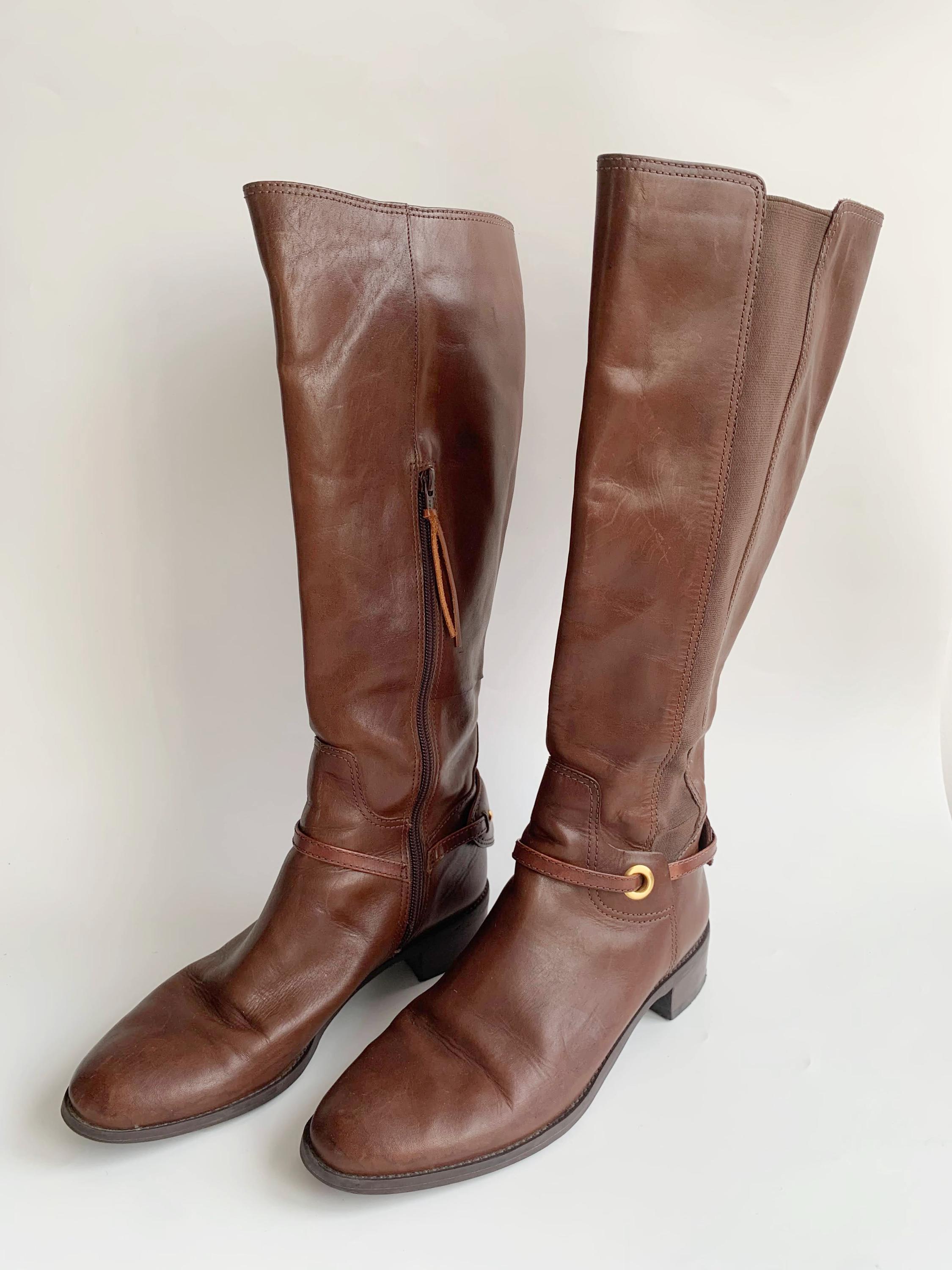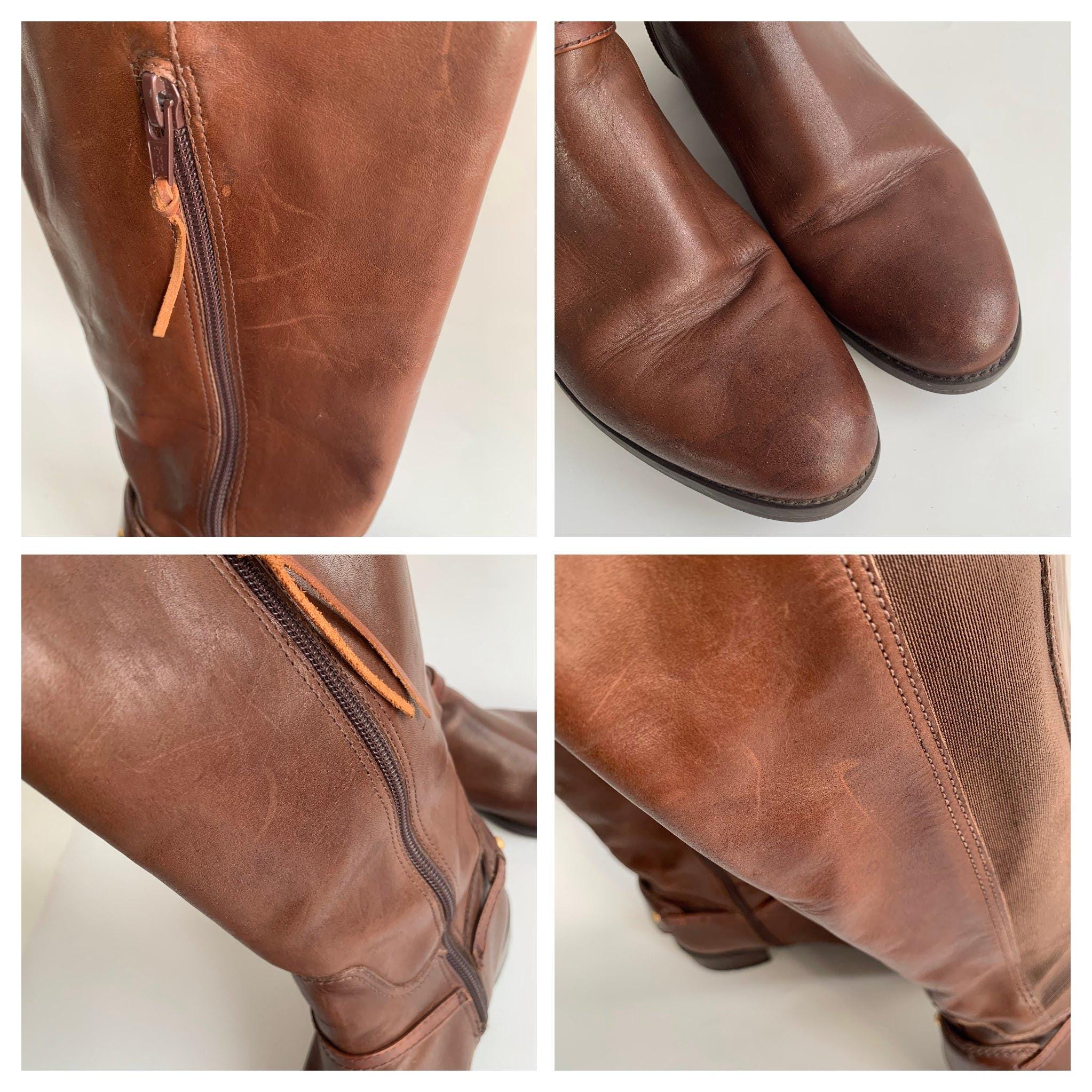 These are vintage Y2K toffee brown leather riding boots with non slip rubber soles, side zippers and side elastic bands for extra comfort. These tall leather boots are made of genuine leather in toffee brown color which has a heavily distressed look due to the wear. These tall boots have felted wool lining for extra warmth. The size marked on these equestrian boots is EUR 39. They fit like UK 5.5, US 8 women's shoe size. Please check the measurements below.