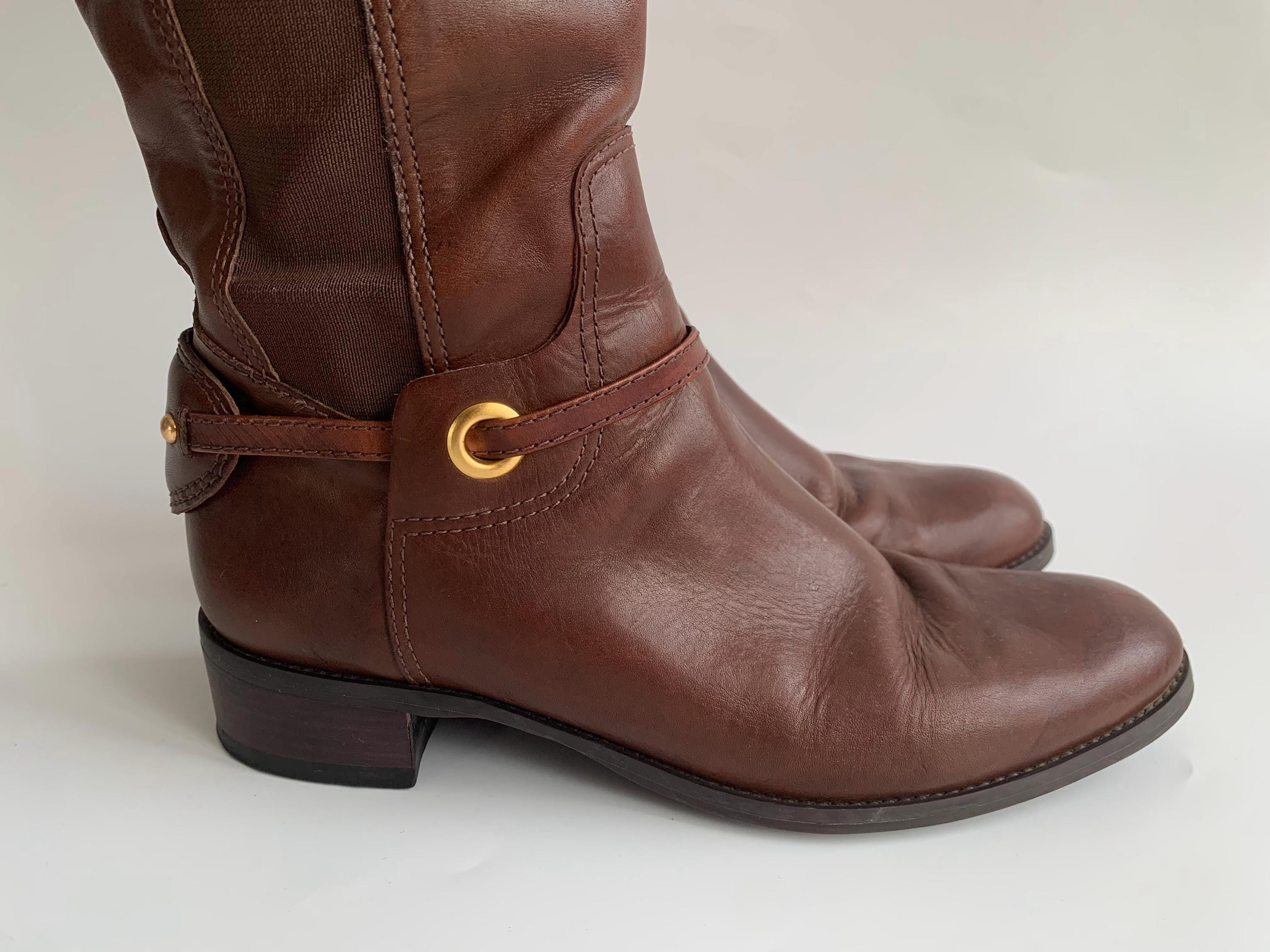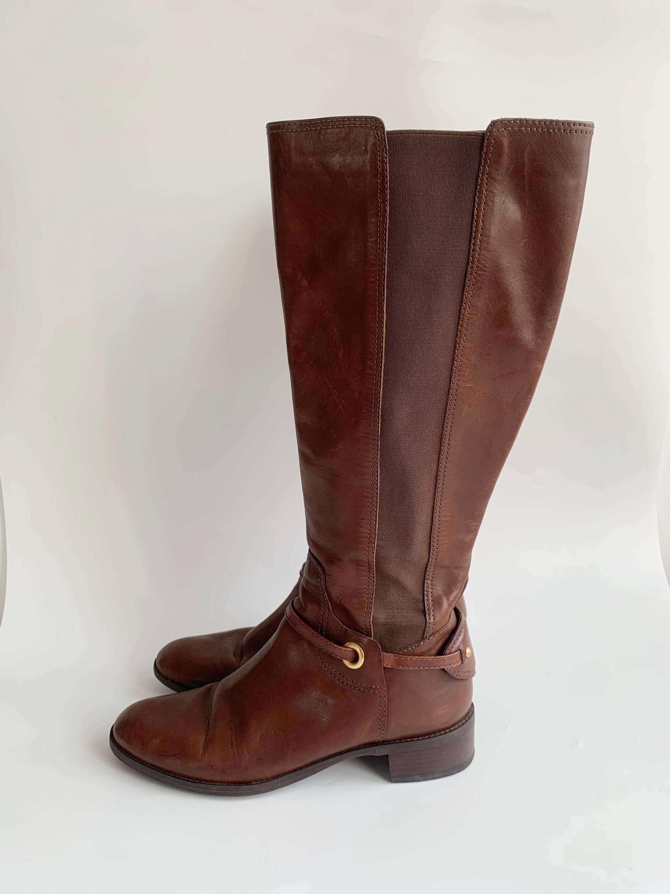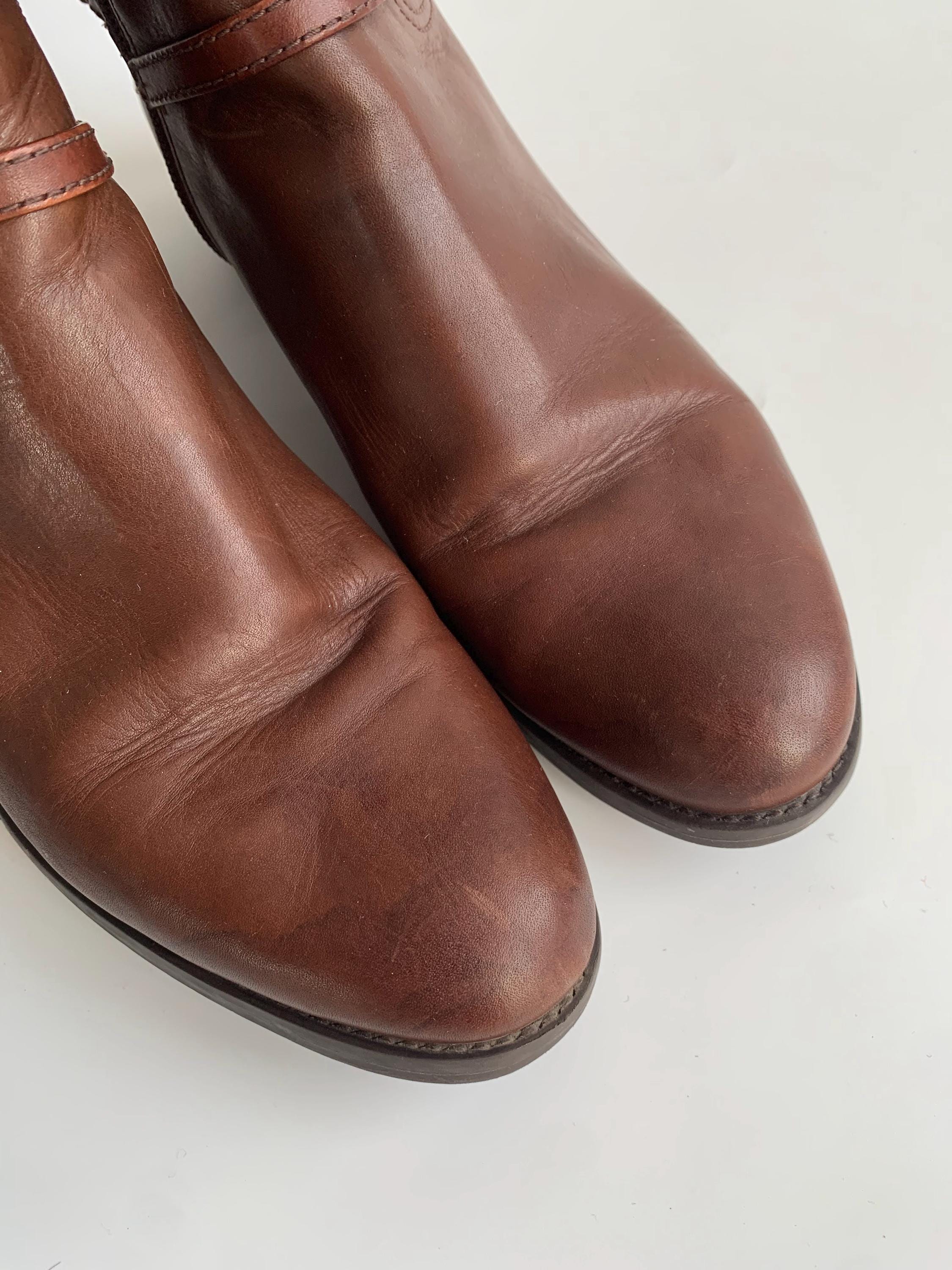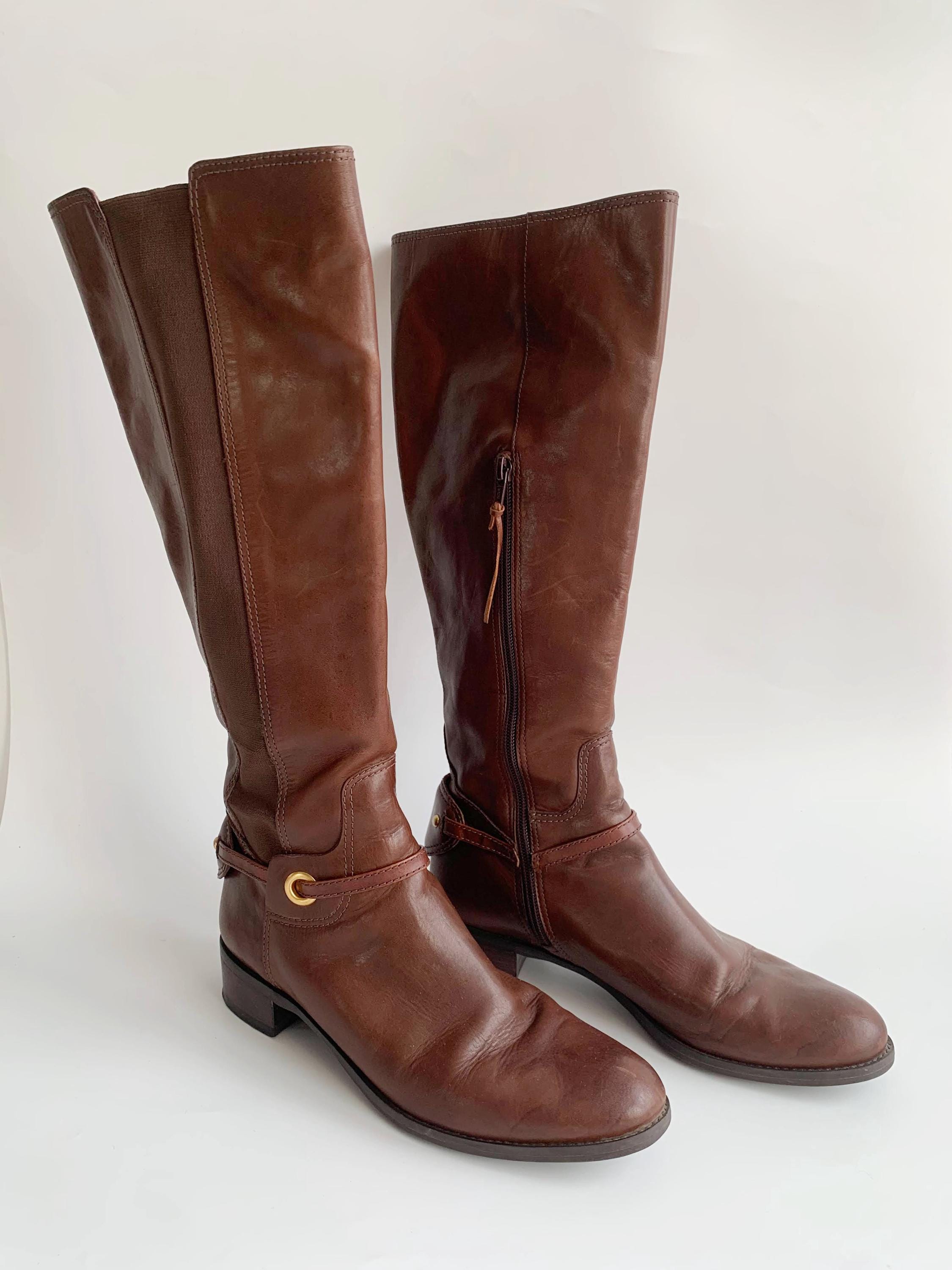 These are vintage Y2K toffee brown leather riding boots with non slip rubber soles, side zippers and side elastic bands for extra comfort. These tall leather boots are made of genuine leather in toffee brown color which has a heavily distressed look due to the wear. These tall boots have felted wool lining for extra warmth. The size marked on these equestrian boots is EUR 39. They fit like UK 5.5, US 8 women's shoe size. Please check the measurements below.
