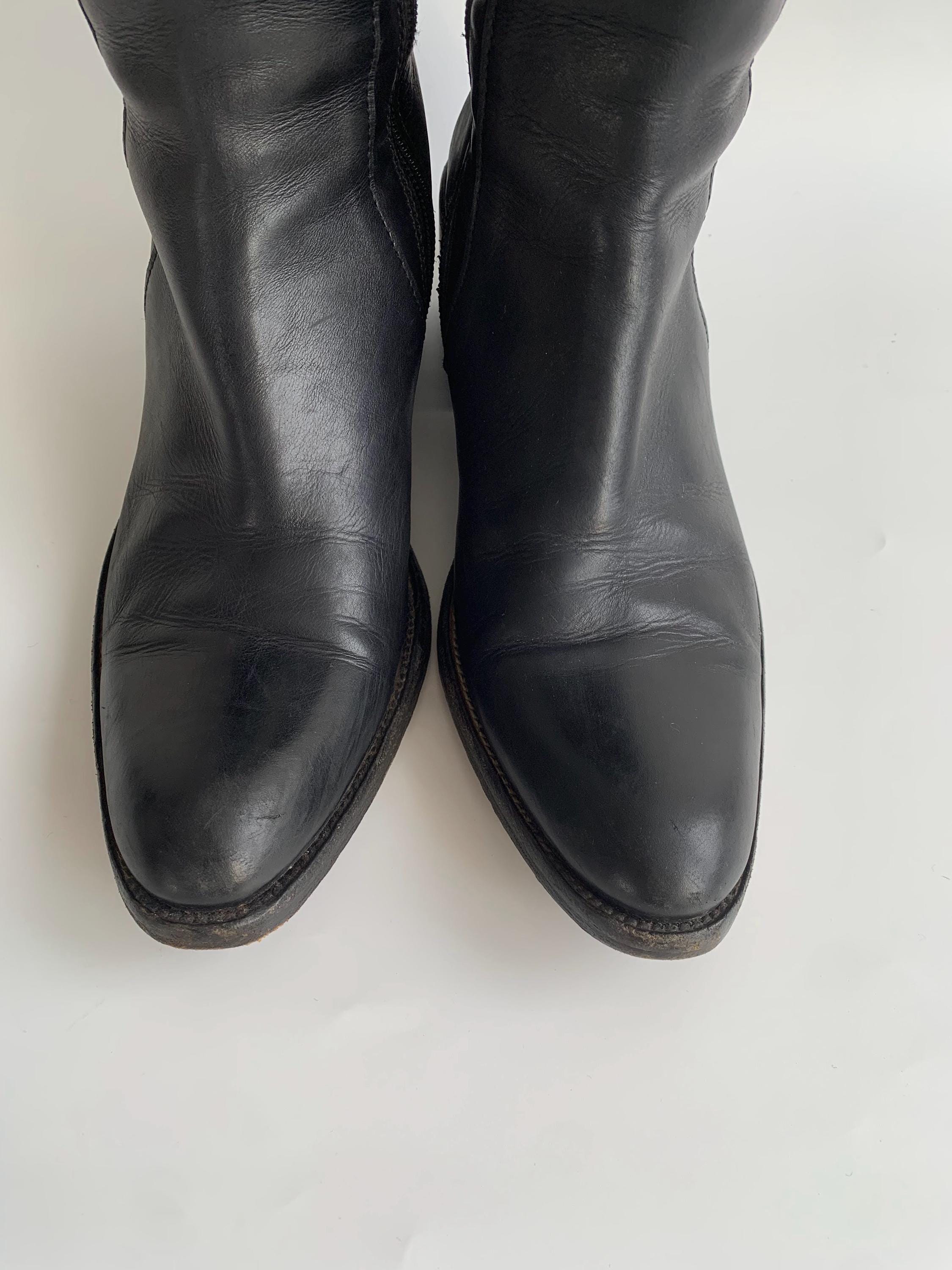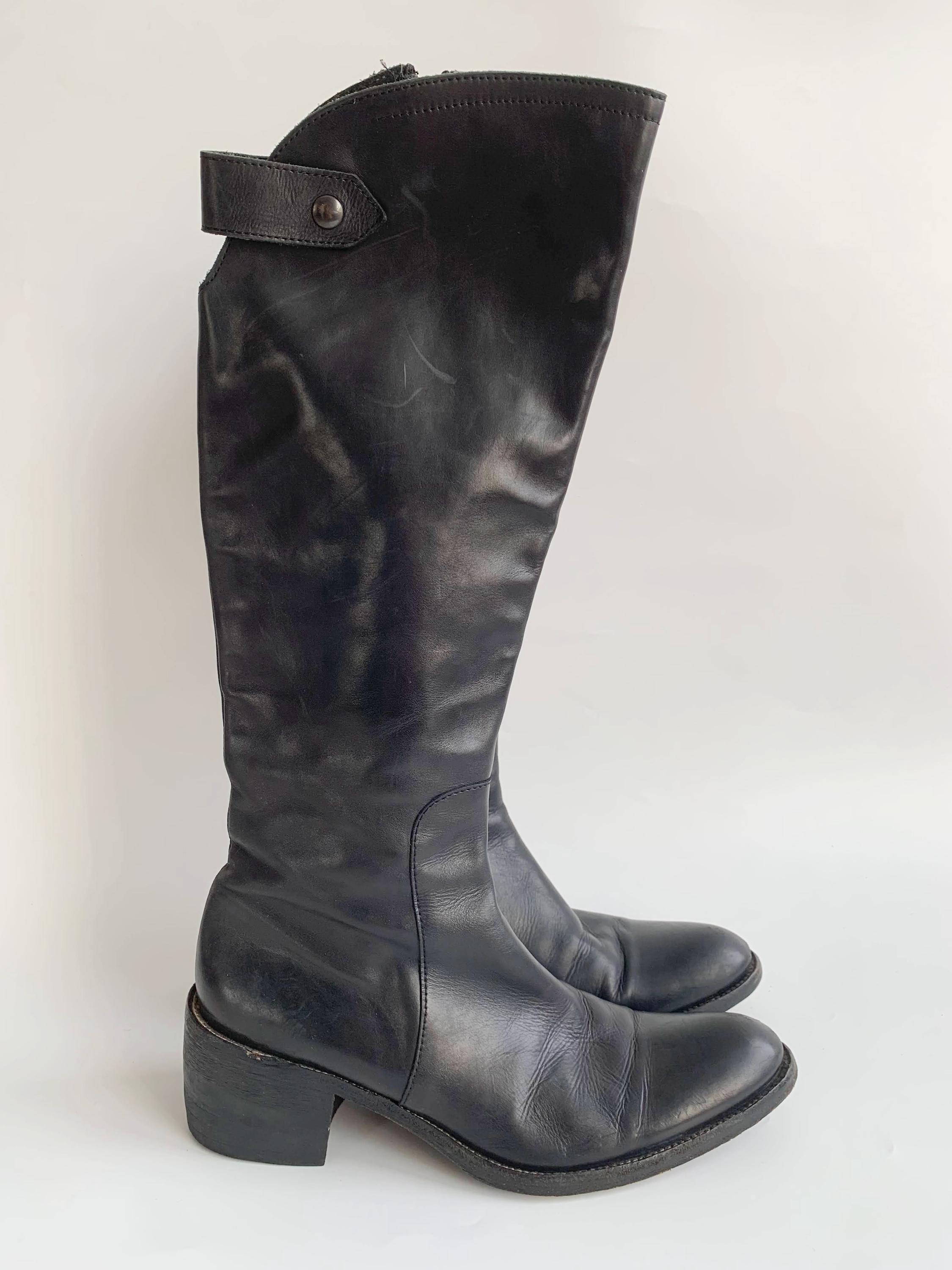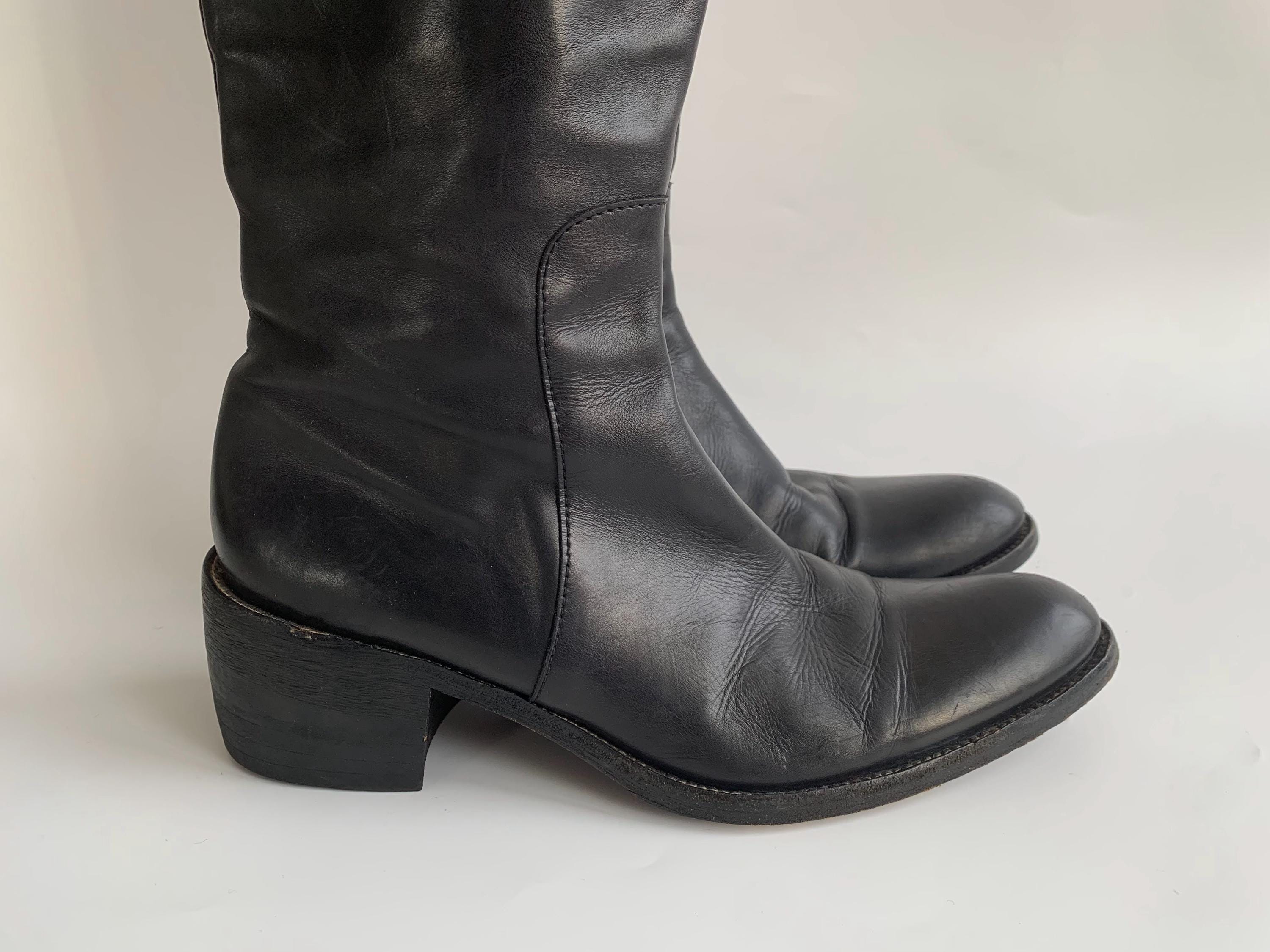 These are vintage Y2K black leather riding boots with non slip leather soles and metal toe caps. These tall rigin boots have side zippers and real leather lining. These tall leather boots are made of genuine leather which has a heavily distressed look due to the wear. These tall boots have low comfortable block heels. The size marked on these equestrian boots is EUR 38 1/2. They fit like UK 6, US 8 women's shoe size. Please check the measurements below.