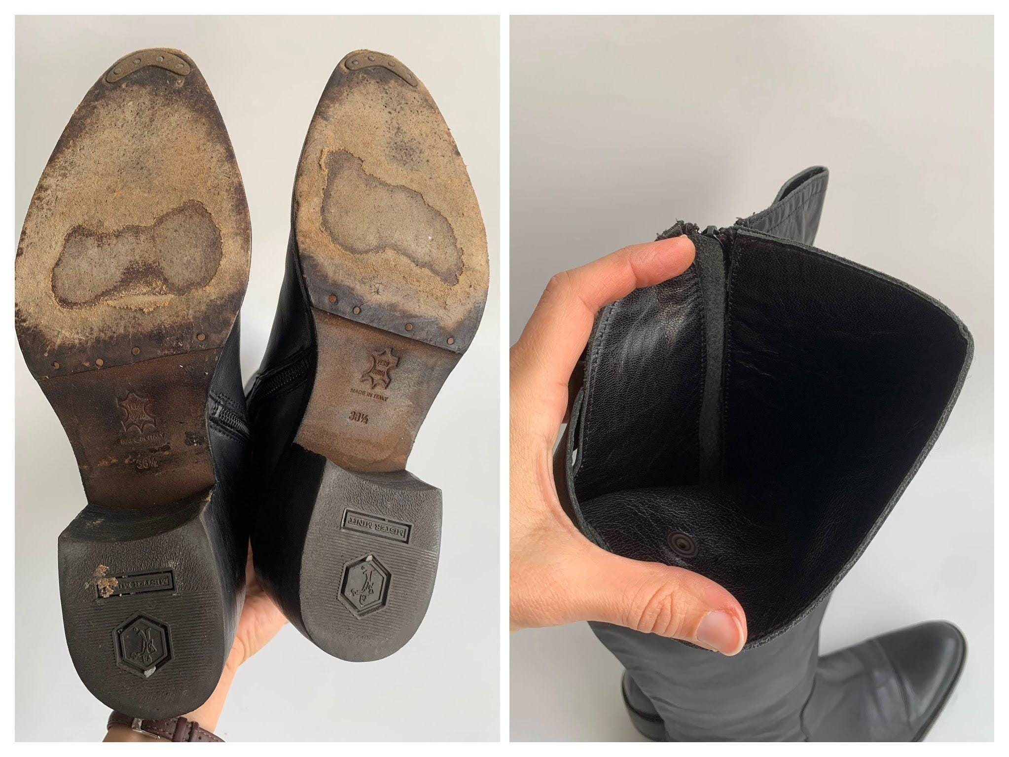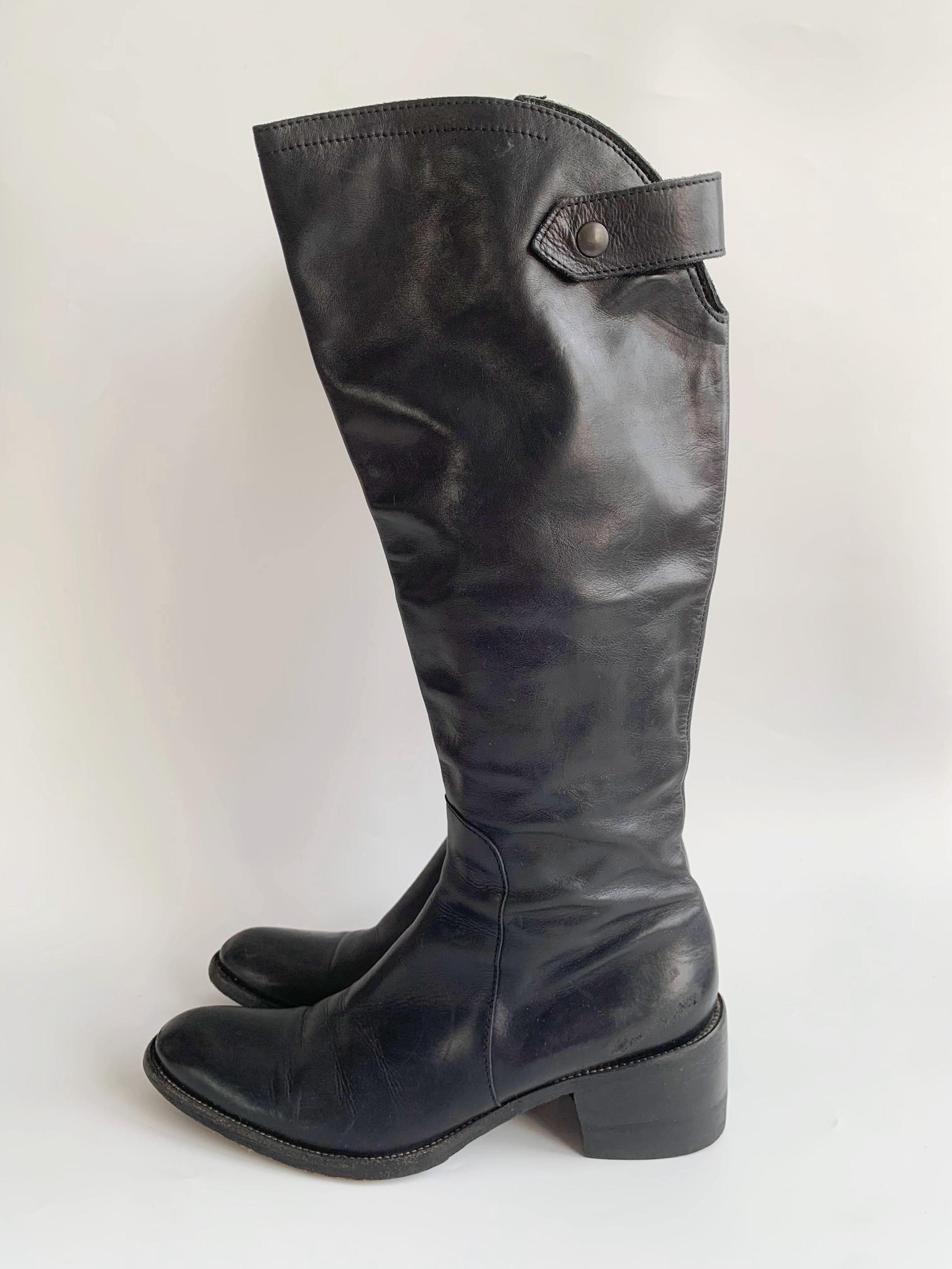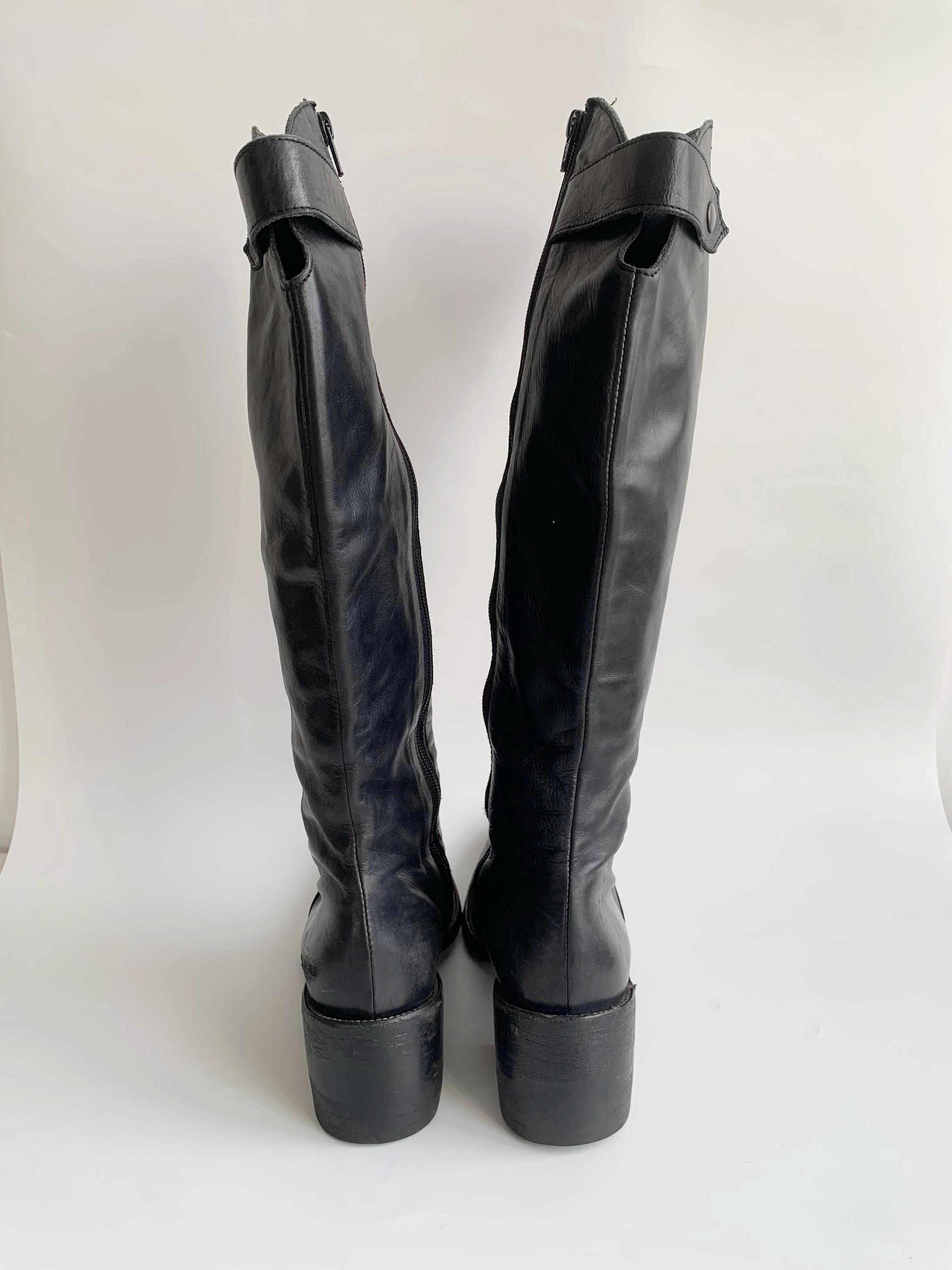 These are vintage Y2K black leather riding boots with non slip leather soles and metal toe caps. These tall rigin boots have side zippers and real leather lining. These tall leather boots are made of genuine leather which has a heavily distressed look due to the wear. These tall boots have low comfortable block heels. The size marked on these equestrian boots is EUR 38 1/2. They fit like UK 6, US 8 women's shoe size. Please check the measurements below.