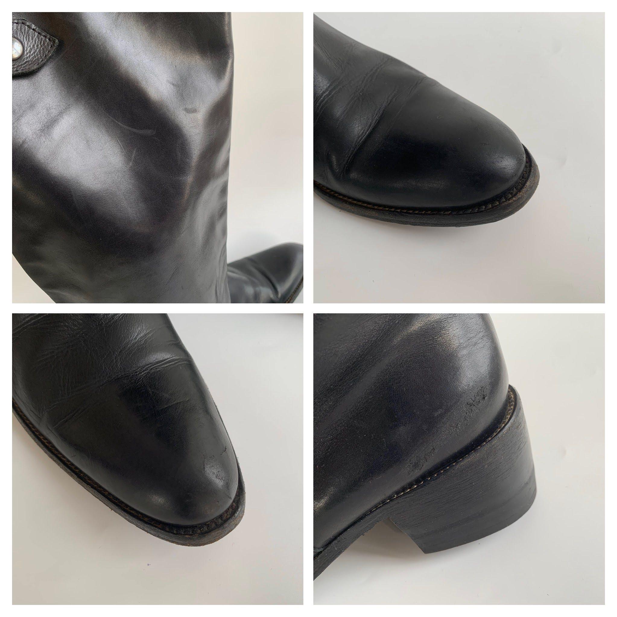 Condition: These flat leather boots were much loved and they have a heavily distressed look due to the wear. The leather has marks and scratches all over the leather surface, especially around the toes and heels.