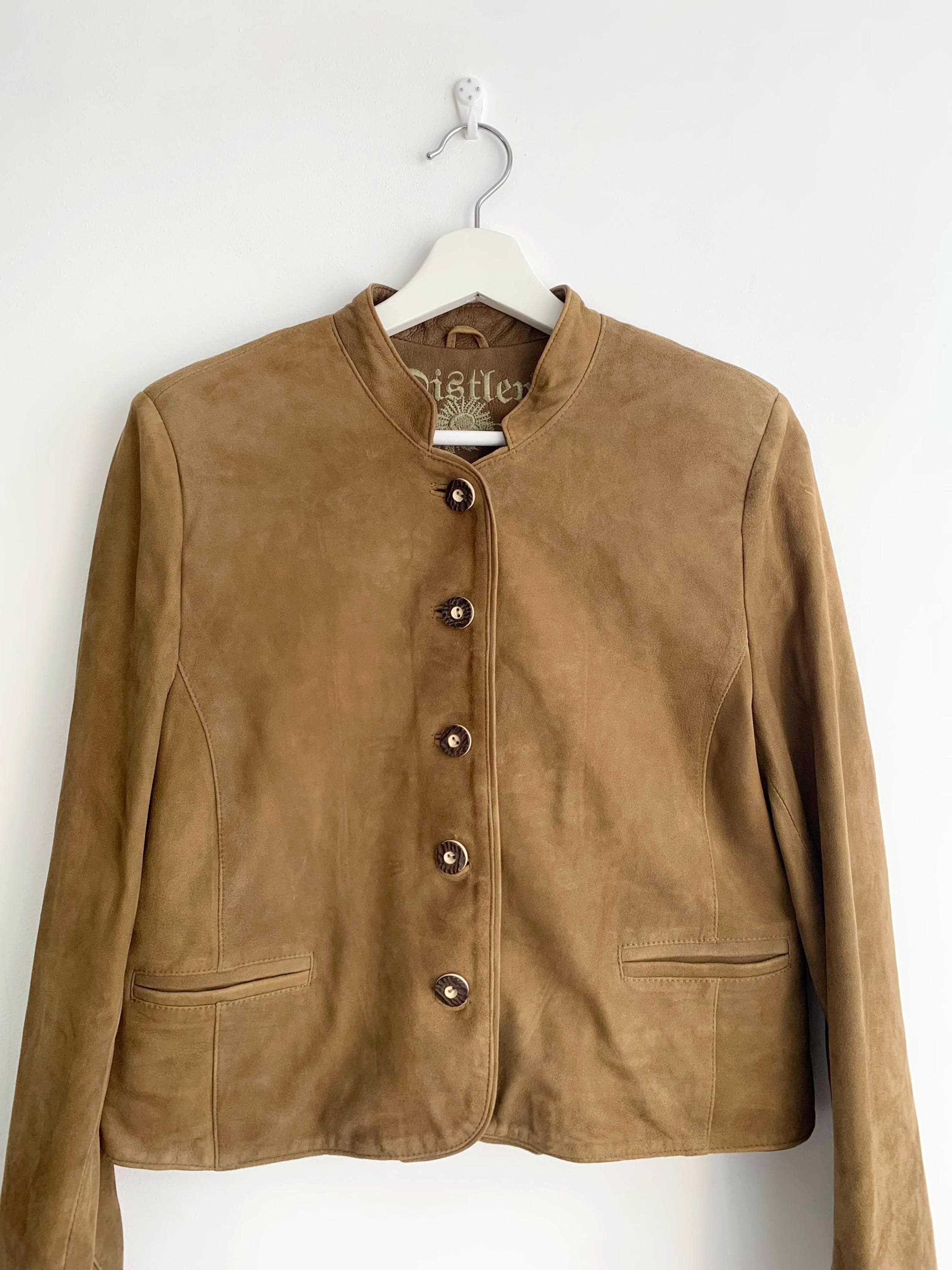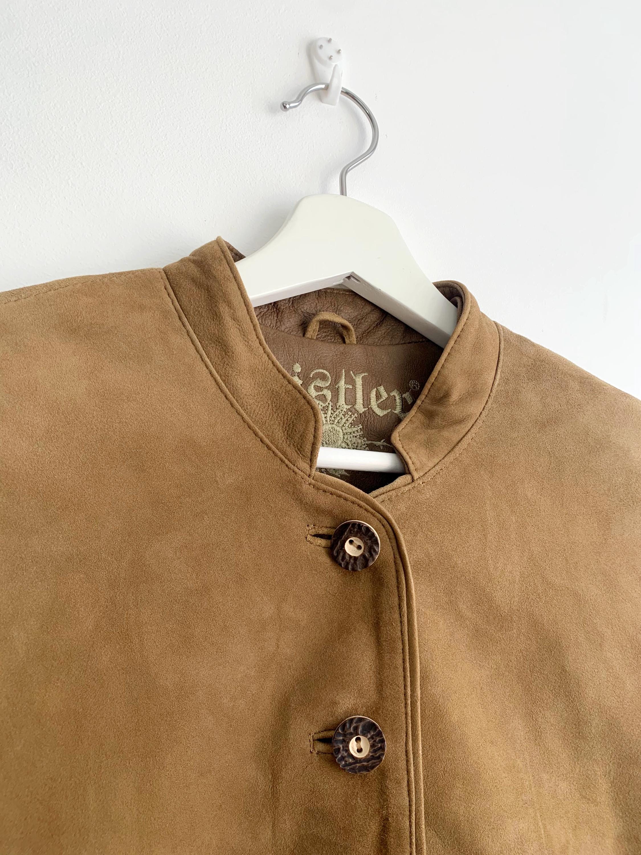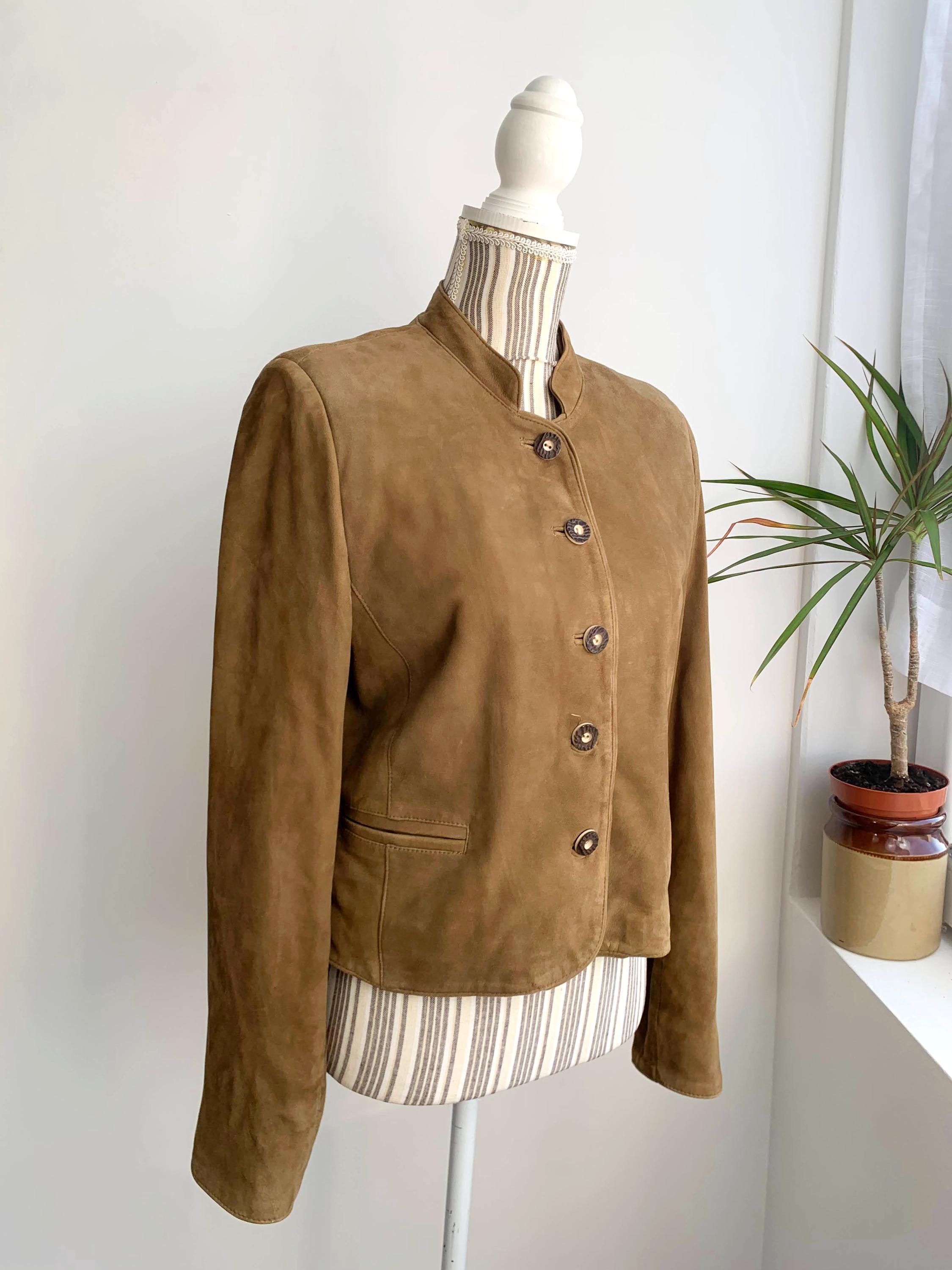 This is a vintage khaki green suede leather trachten folk jacket made of real suede leather with front pockets and horn buttons. The size marked is 36 it fits like size S. Please check the measurements below. I am modelling the jacket and I am size S/ EUR 36 / US 6 / UK 10.