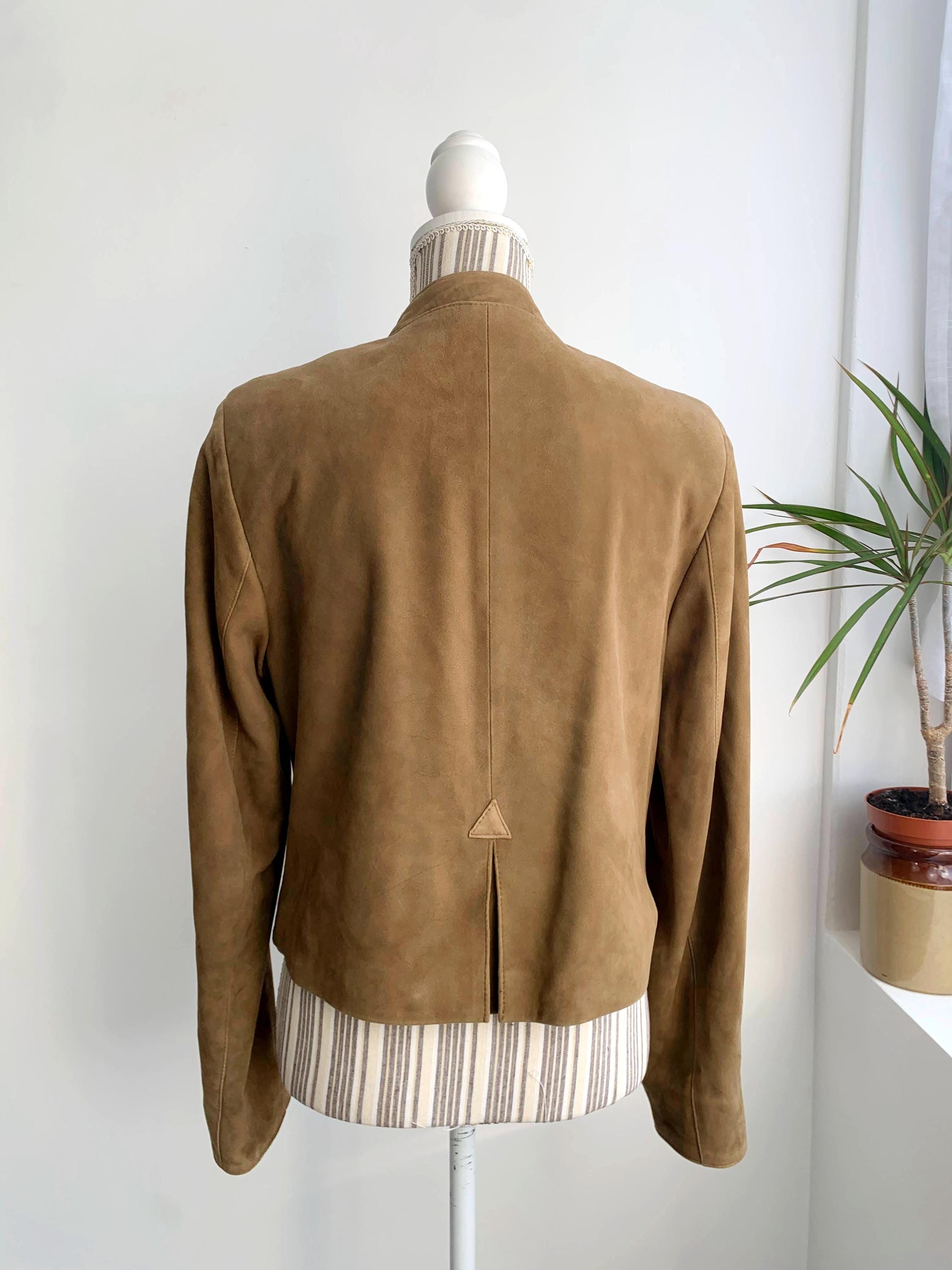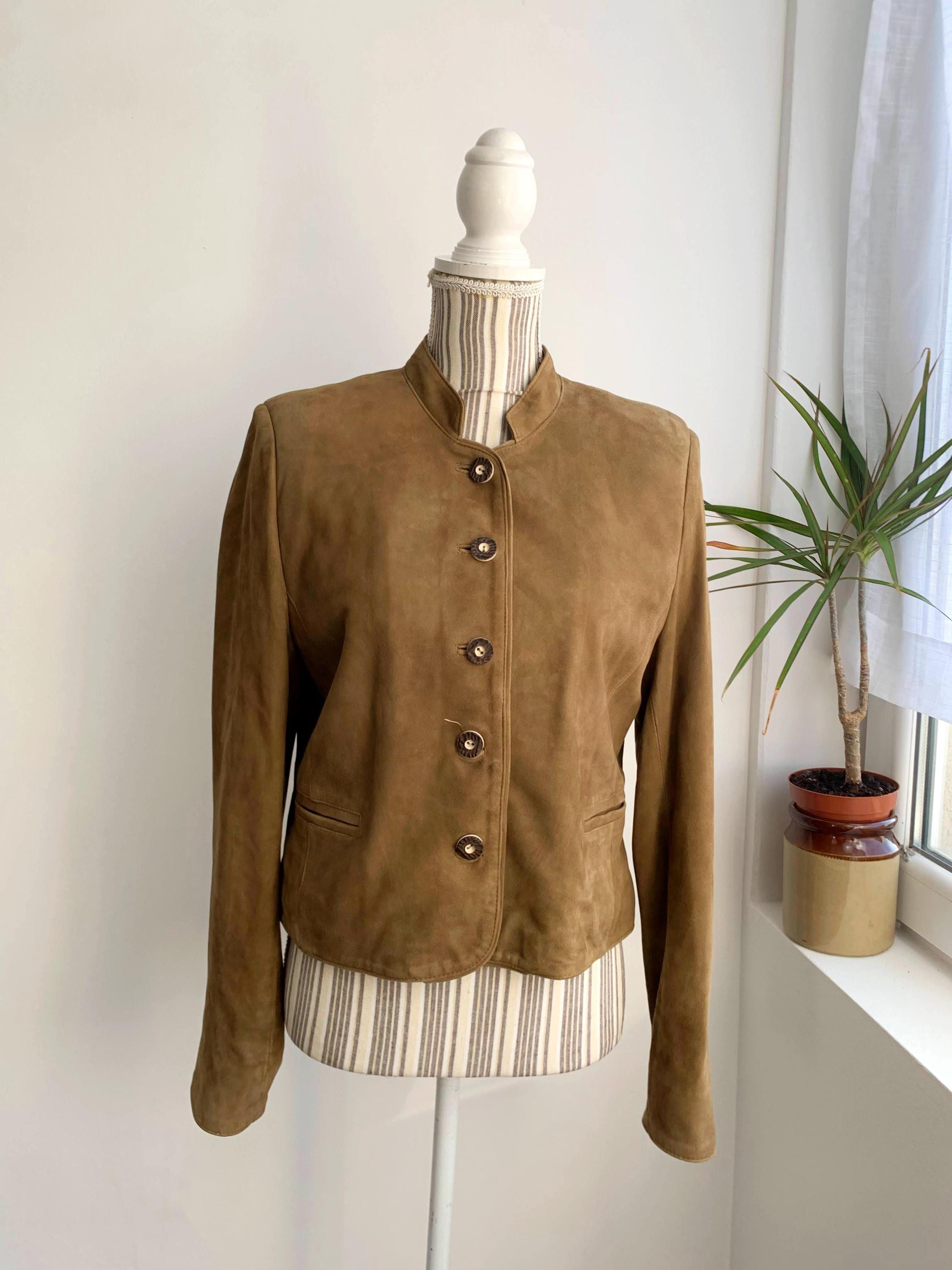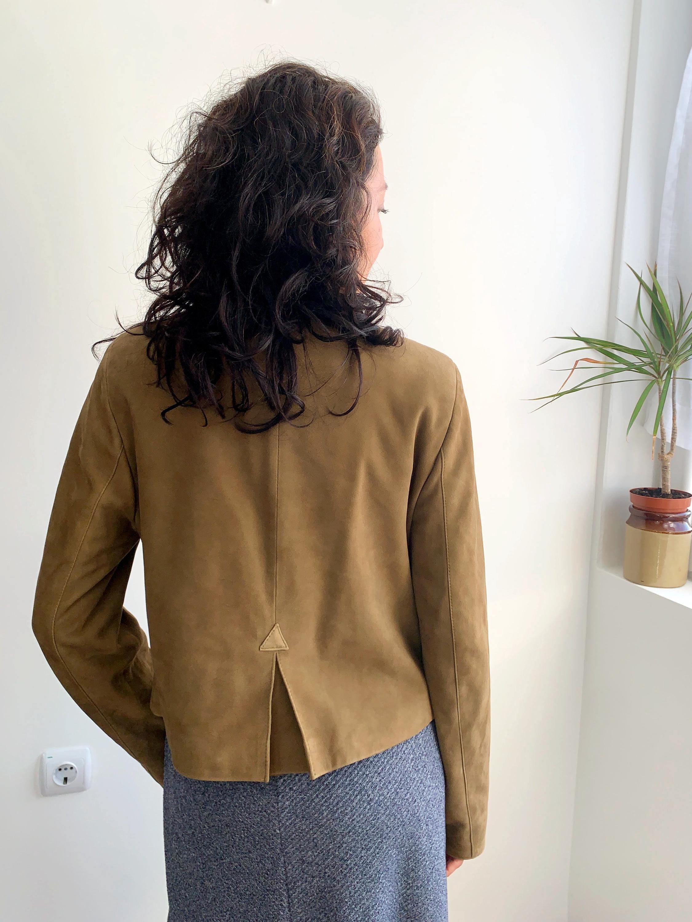 This is a vintage khaki green suede leather trachten folk jacket made of real suede leather with front pockets and horn buttons. The size marked is 36 it fits like size S. Please check the measurements below. I am modelling the jacket and I am size S/ EUR 36 / US 6 / UK 10.