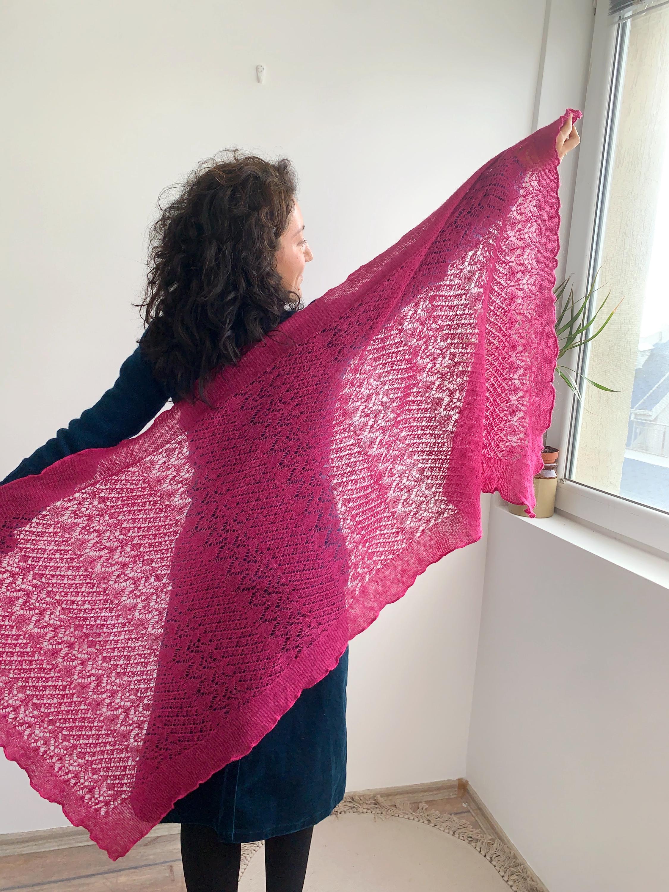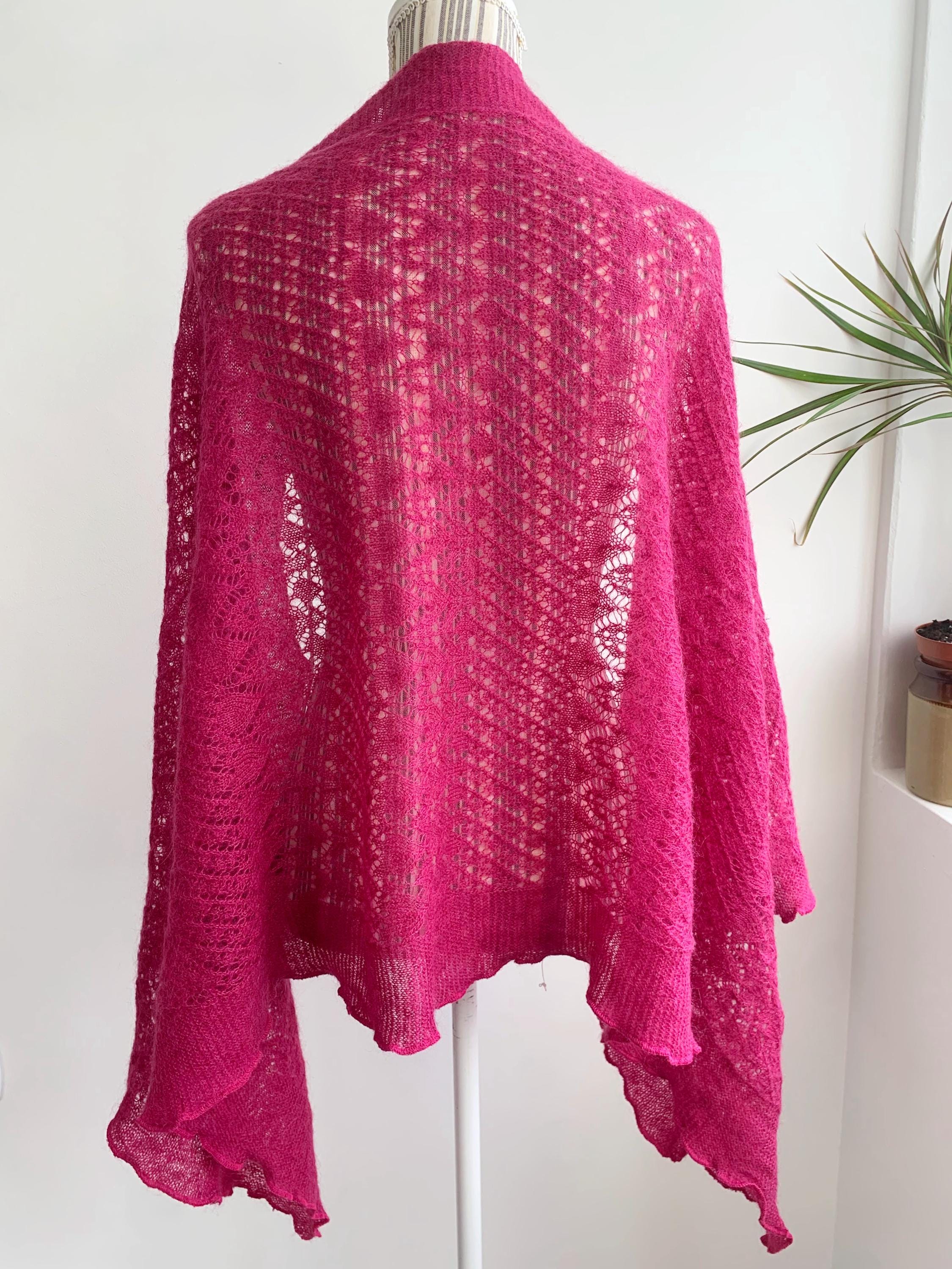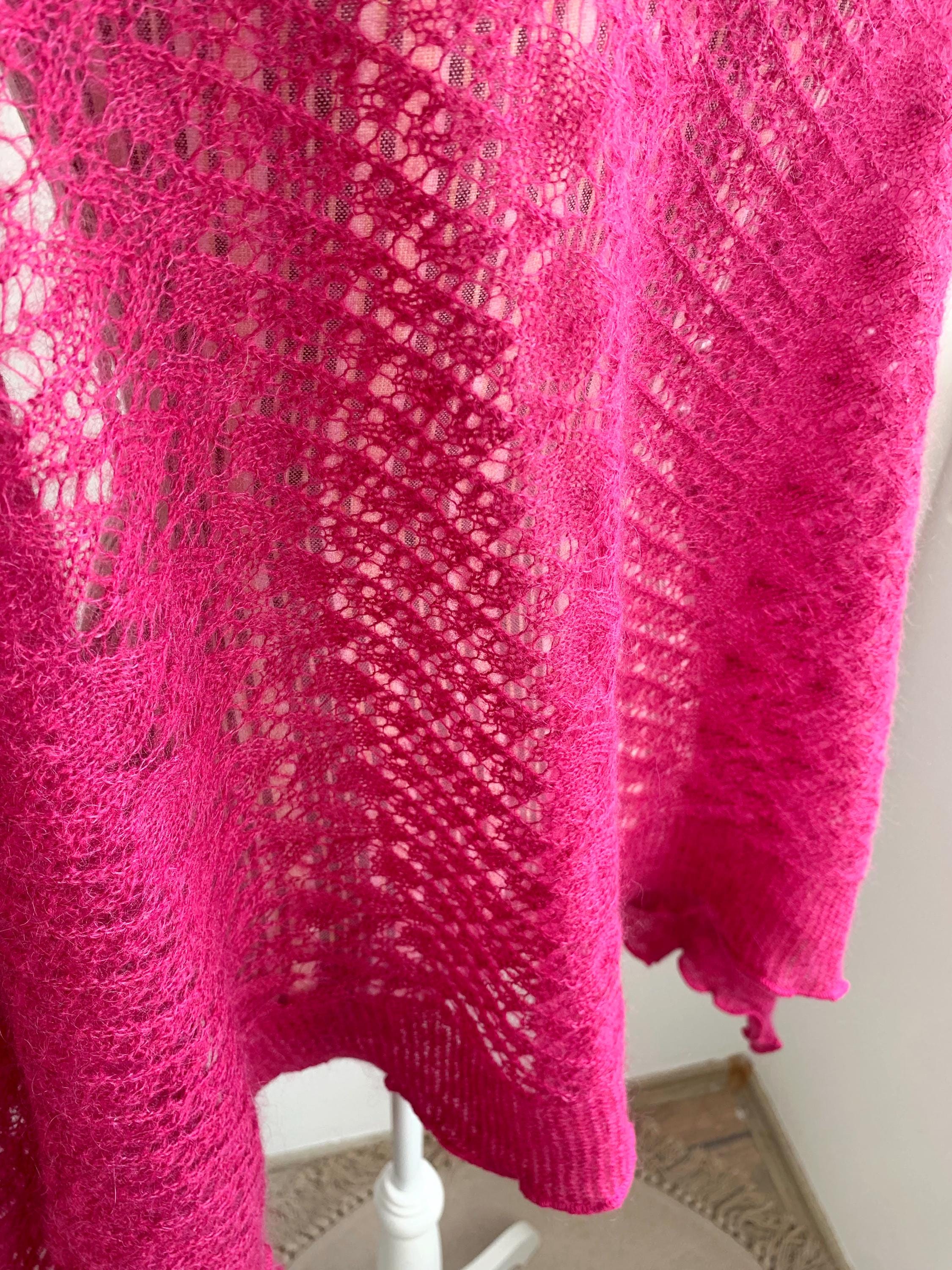 This is a beautiful vintage soft mohair blend knitted shawl for women in fuchsia pink color with delicate lace pattern. This soft sheer mesh lace shawl is the perfect lightweight shawl wrap to keep you warm and yet so romantic.