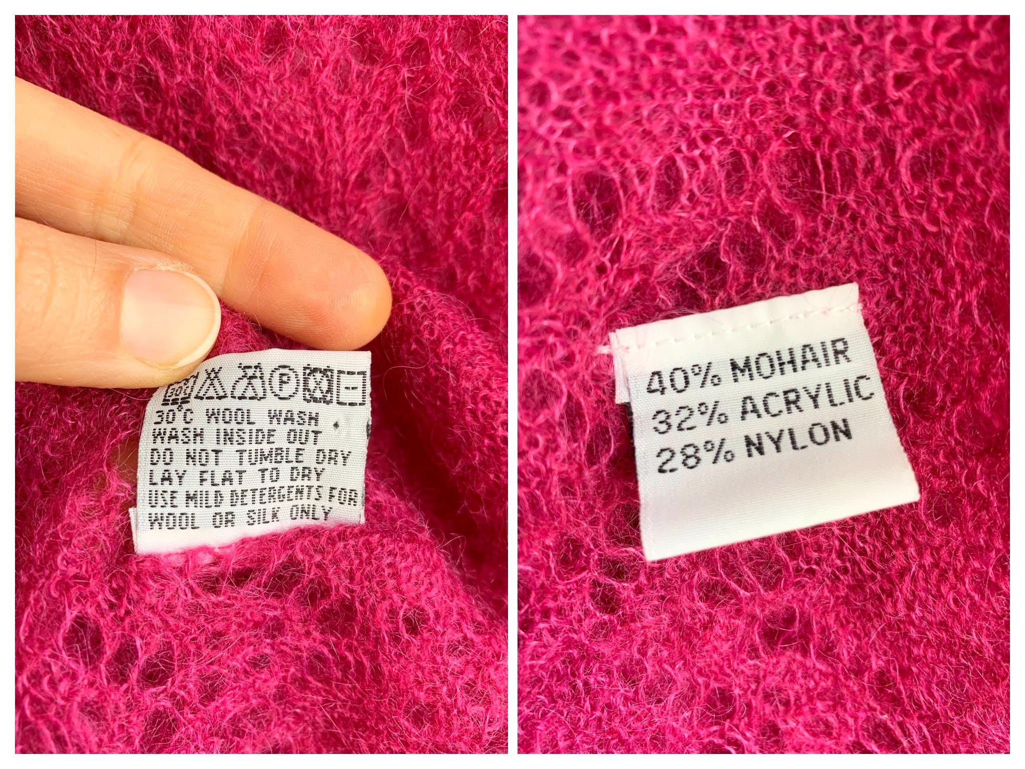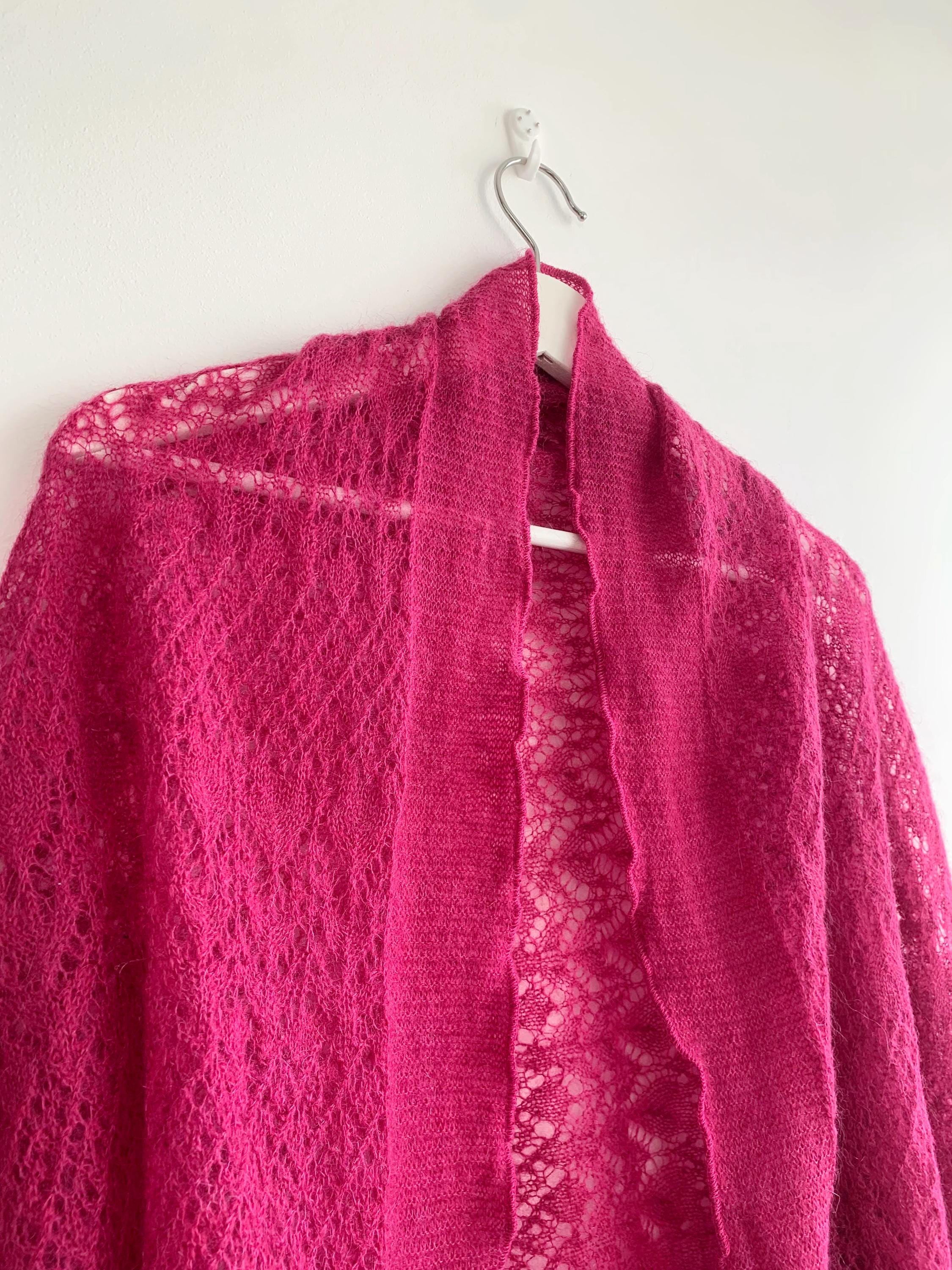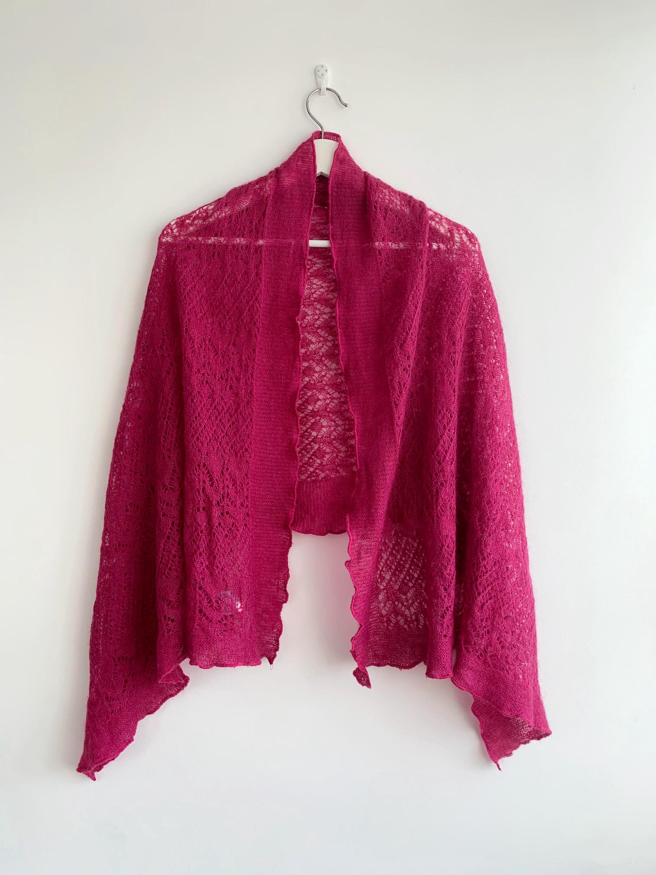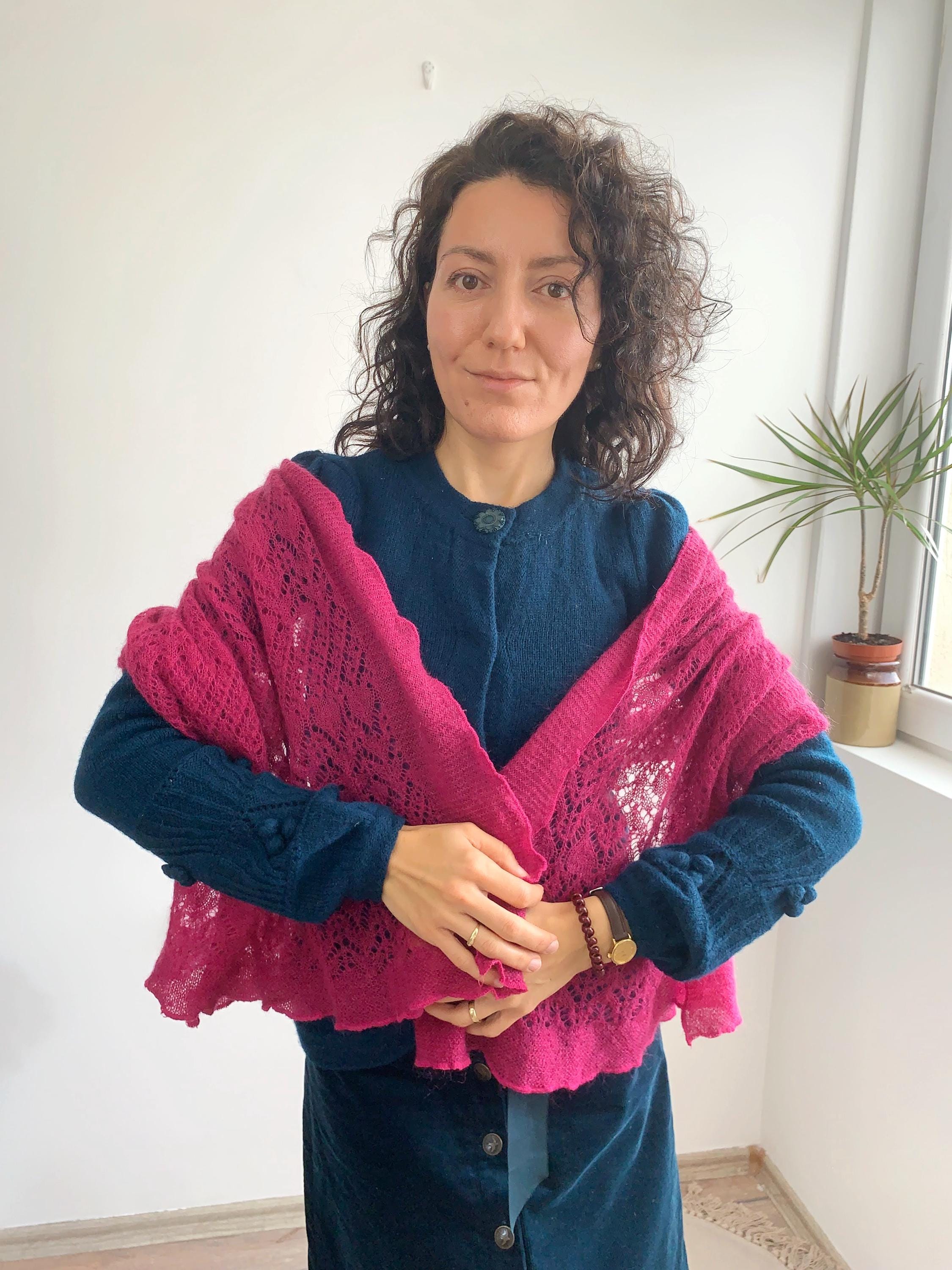 This is a beautiful vintage soft mohair blend knitted shawl for women in fuchsia pink color with delicate lace pattern. This soft sheer mesh lace shawl is the perfect lightweight shawl wrap to keep you warm and yet so romantic.