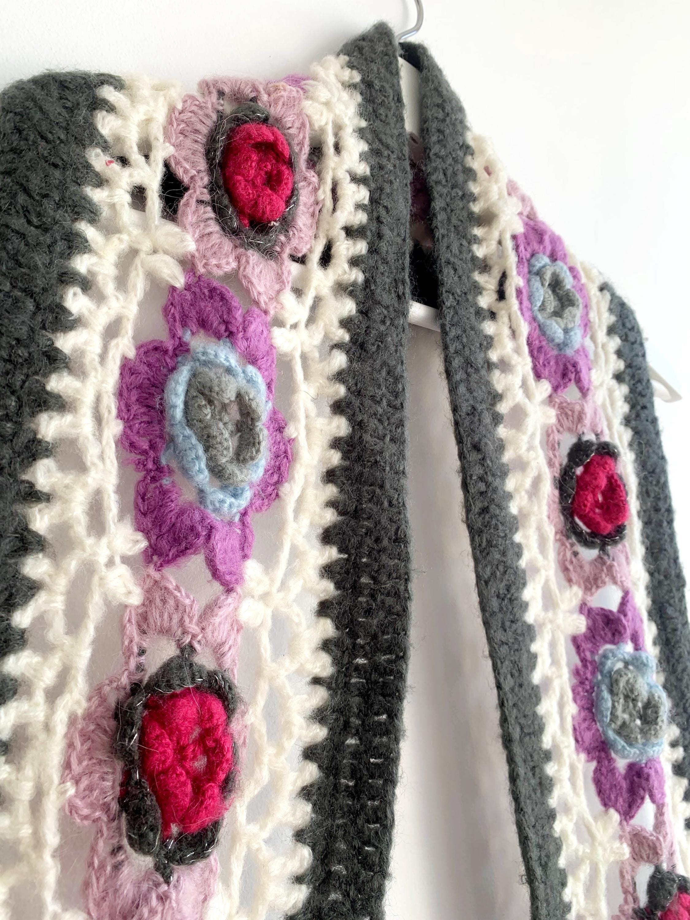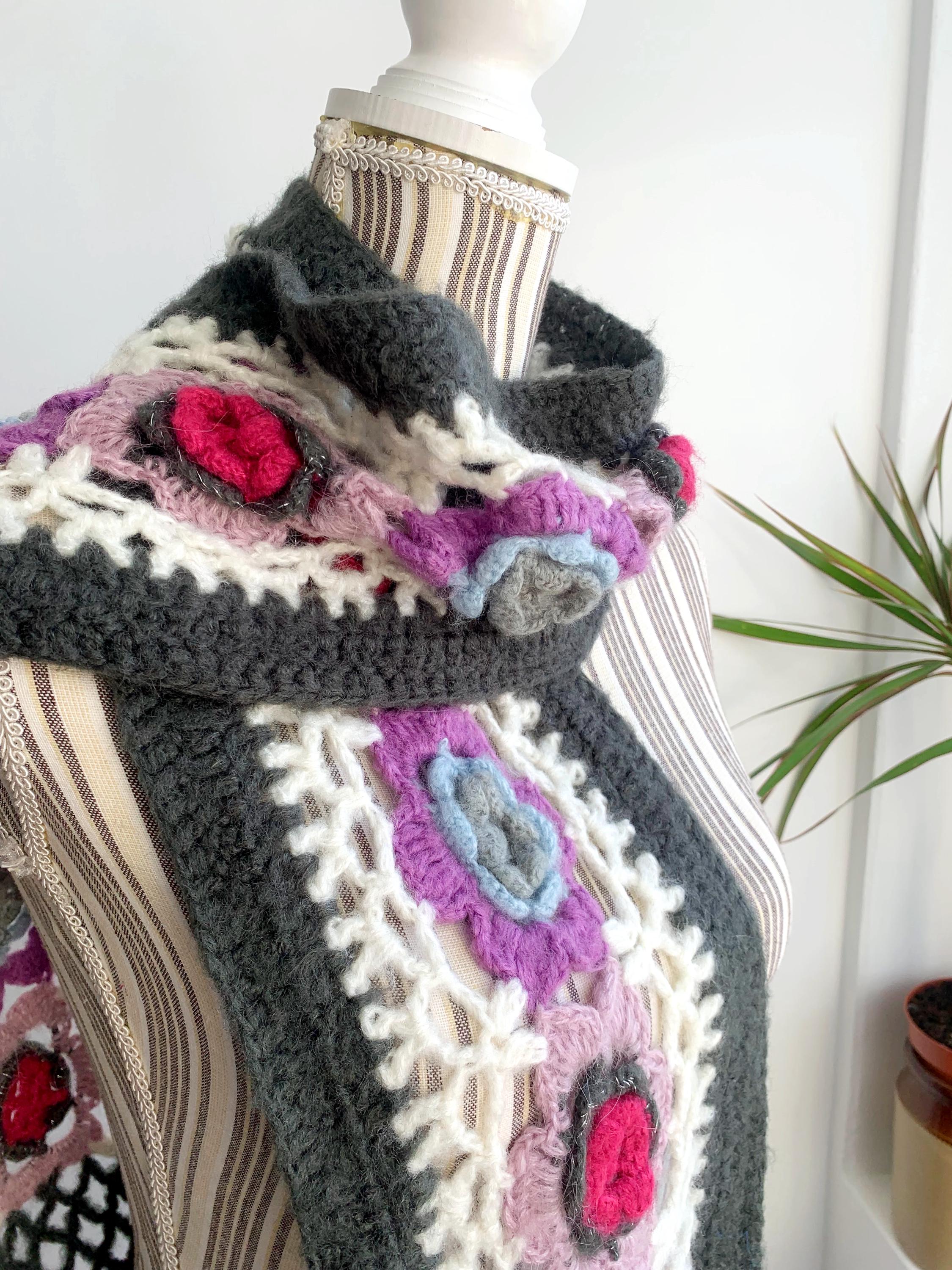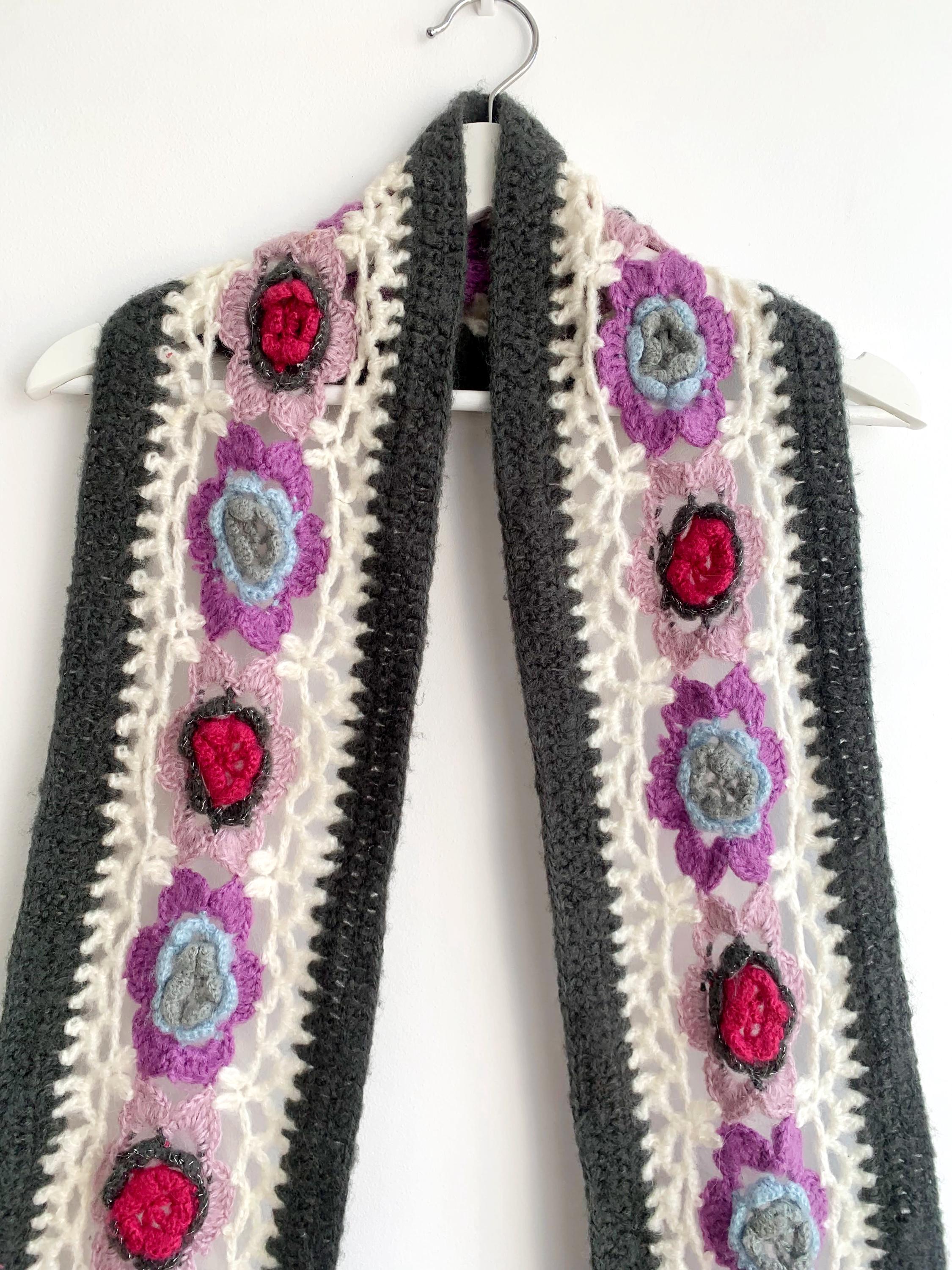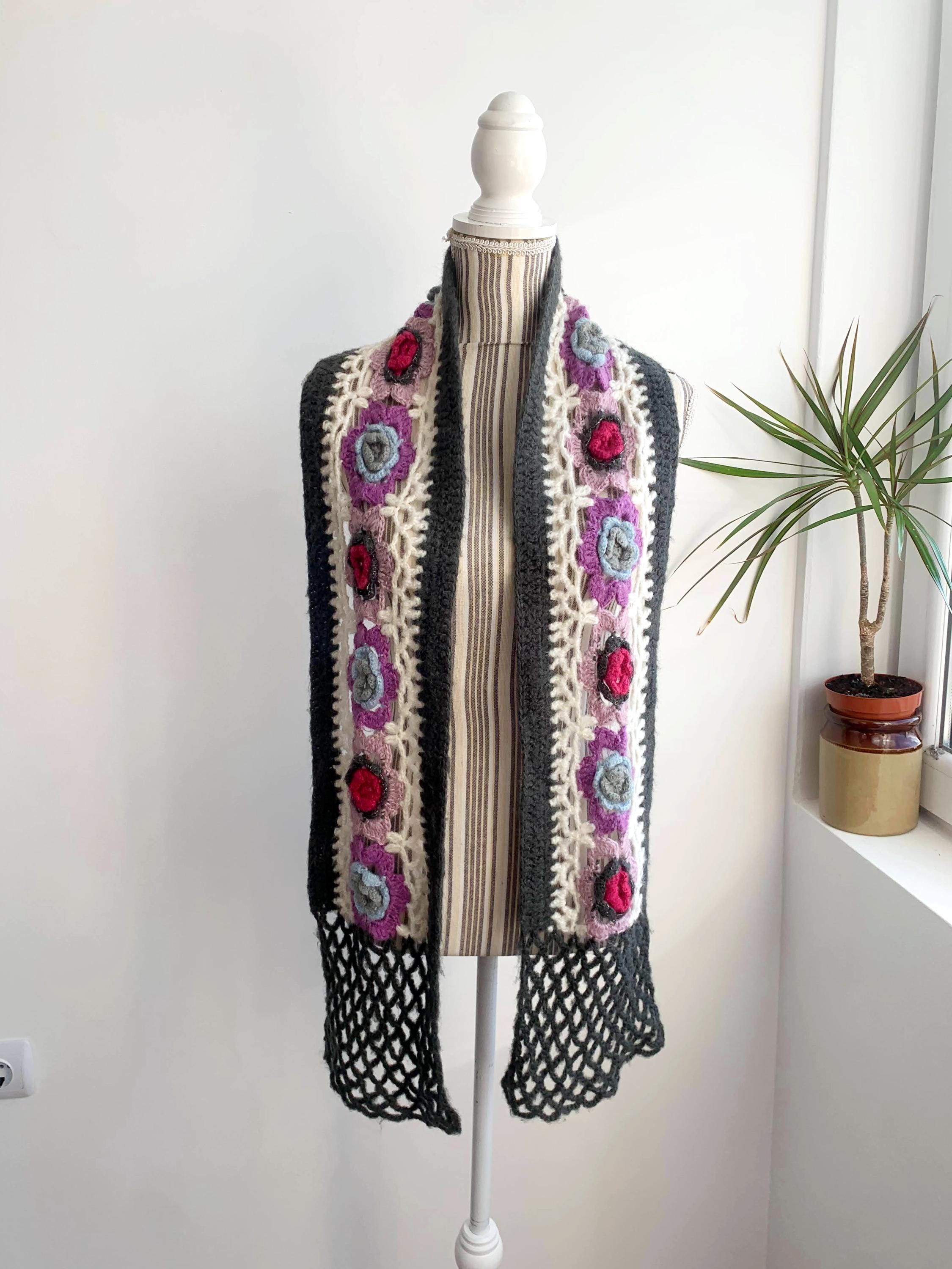 This is a vintage handmade crochet lace scarf in grey and white and floral applique decoration - beautiful purple, pink and blue roses. This long boho neck scarf is perfect to pair with any classic outfit to achieve a 70s style hippie look. Amazing vintage fashion gift for your sister, mother or a girlfriend.
