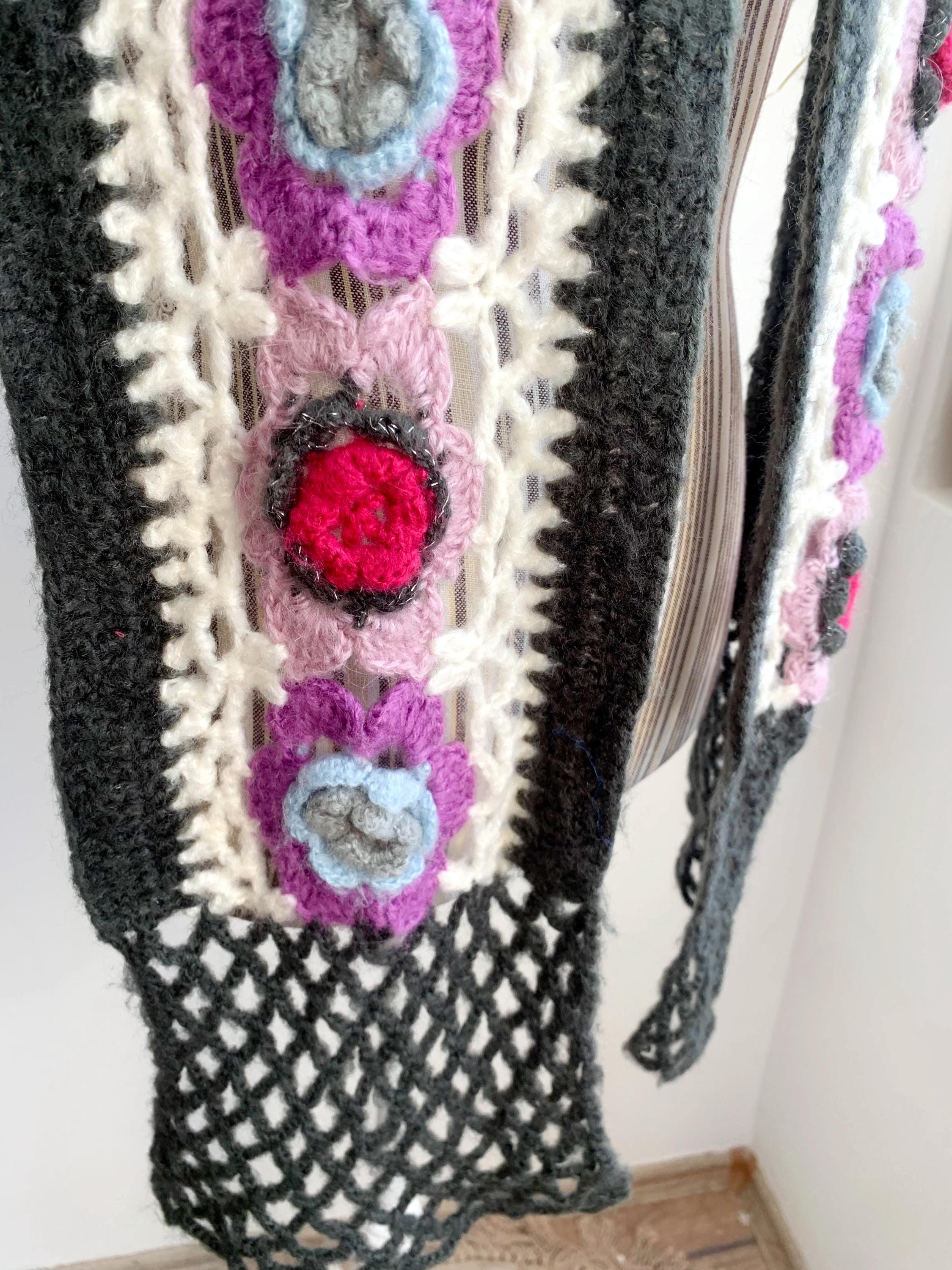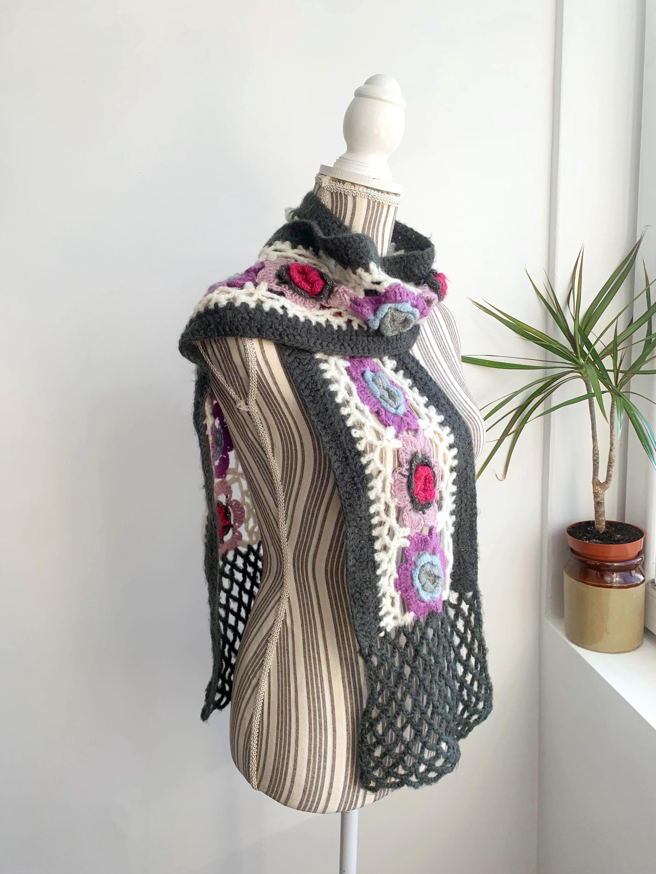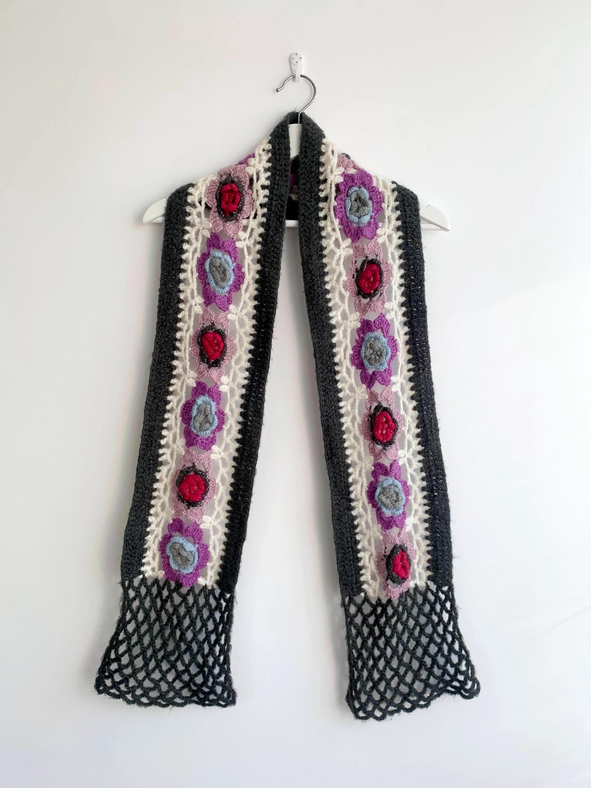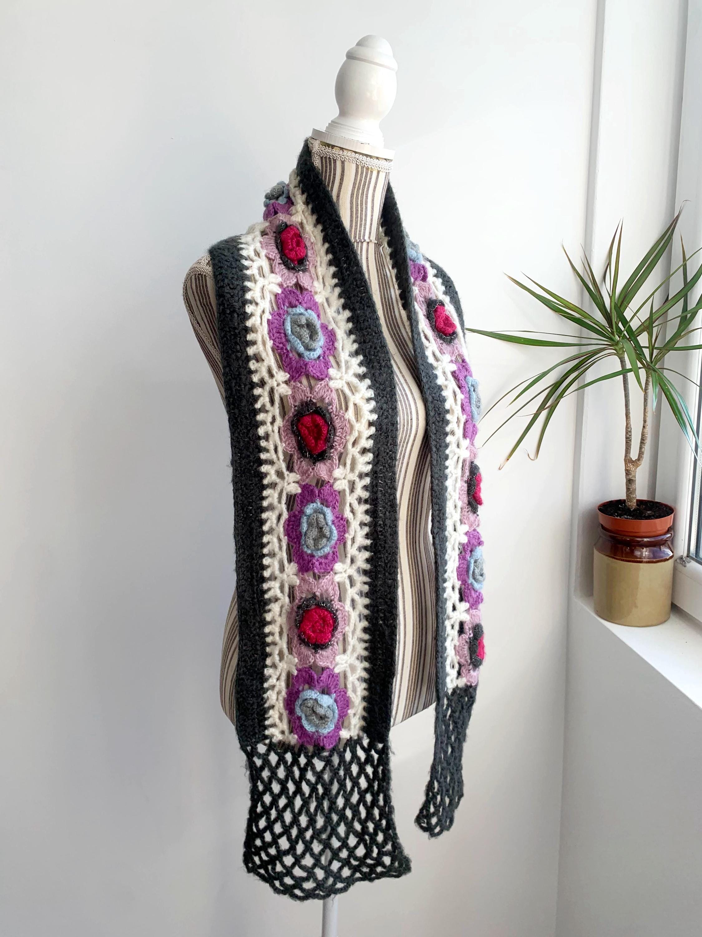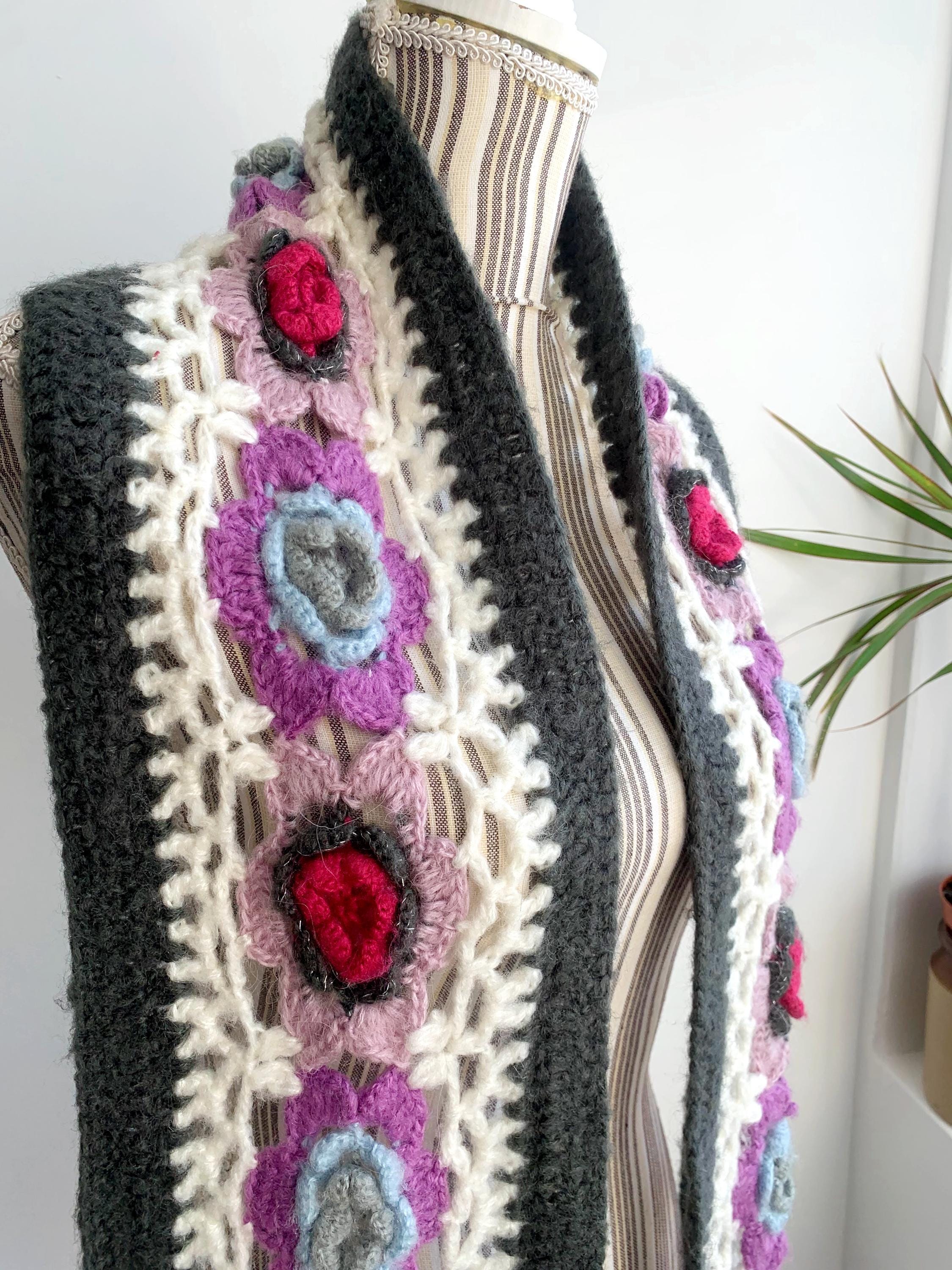 This is a vintage handmade crochet lace scarf in grey and white and floral applique decoration - beautiful purple, pink and blue roses. This long boho neck scarf is perfect to pair with any classic outfit to achieve a 70s style hippie look. Amazing vintage fashion gift for your sister, mother or a girlfriend.