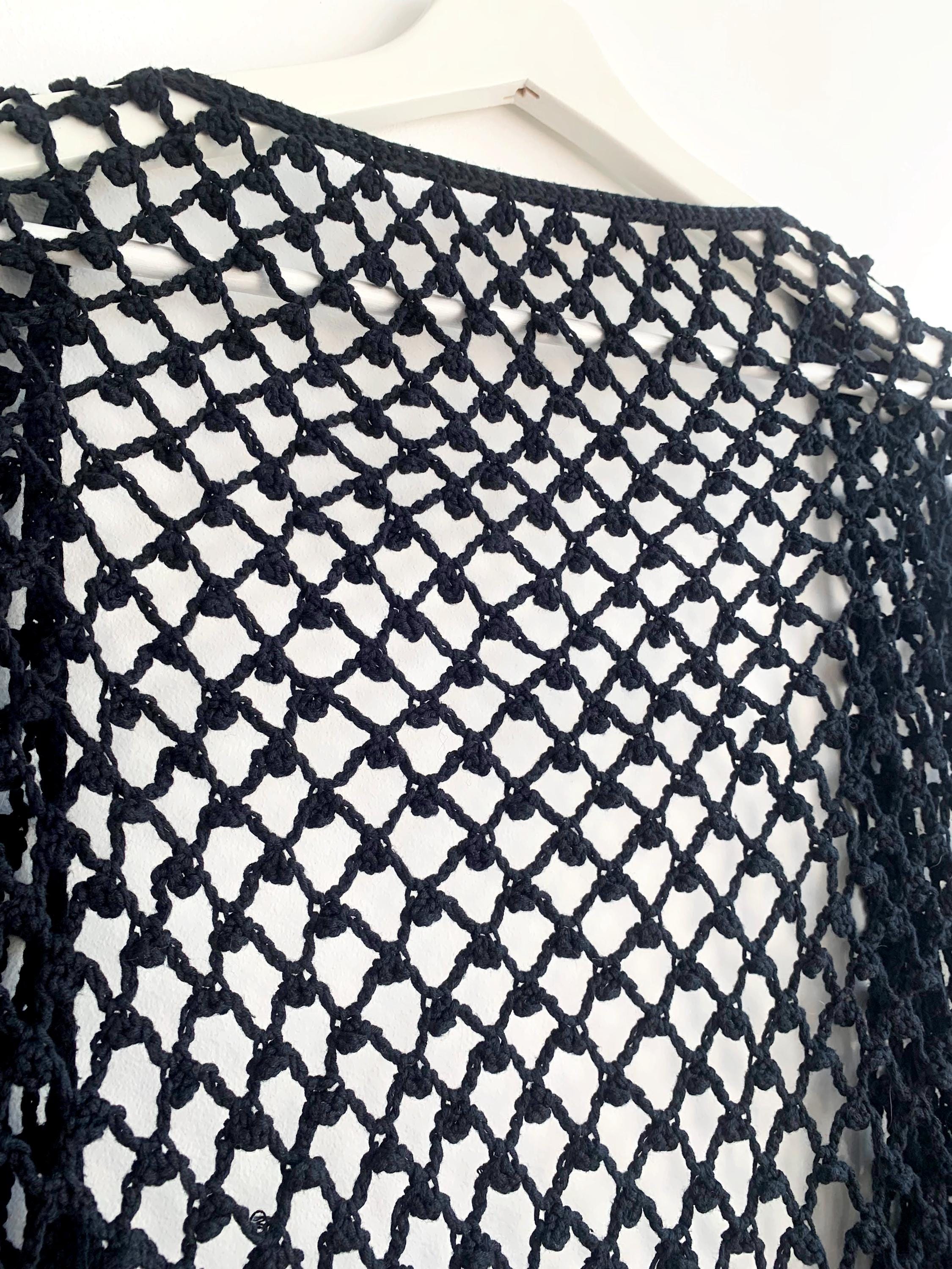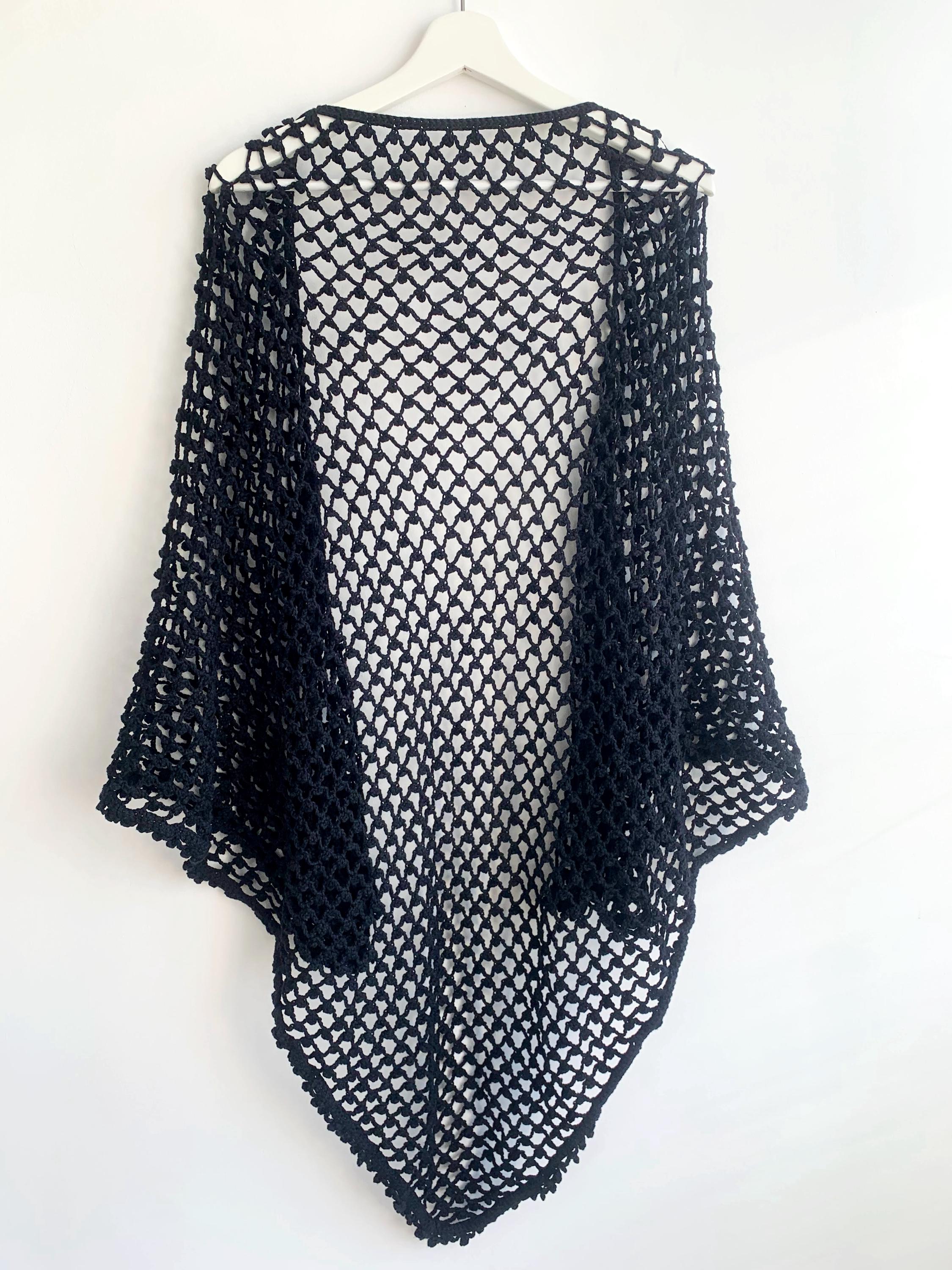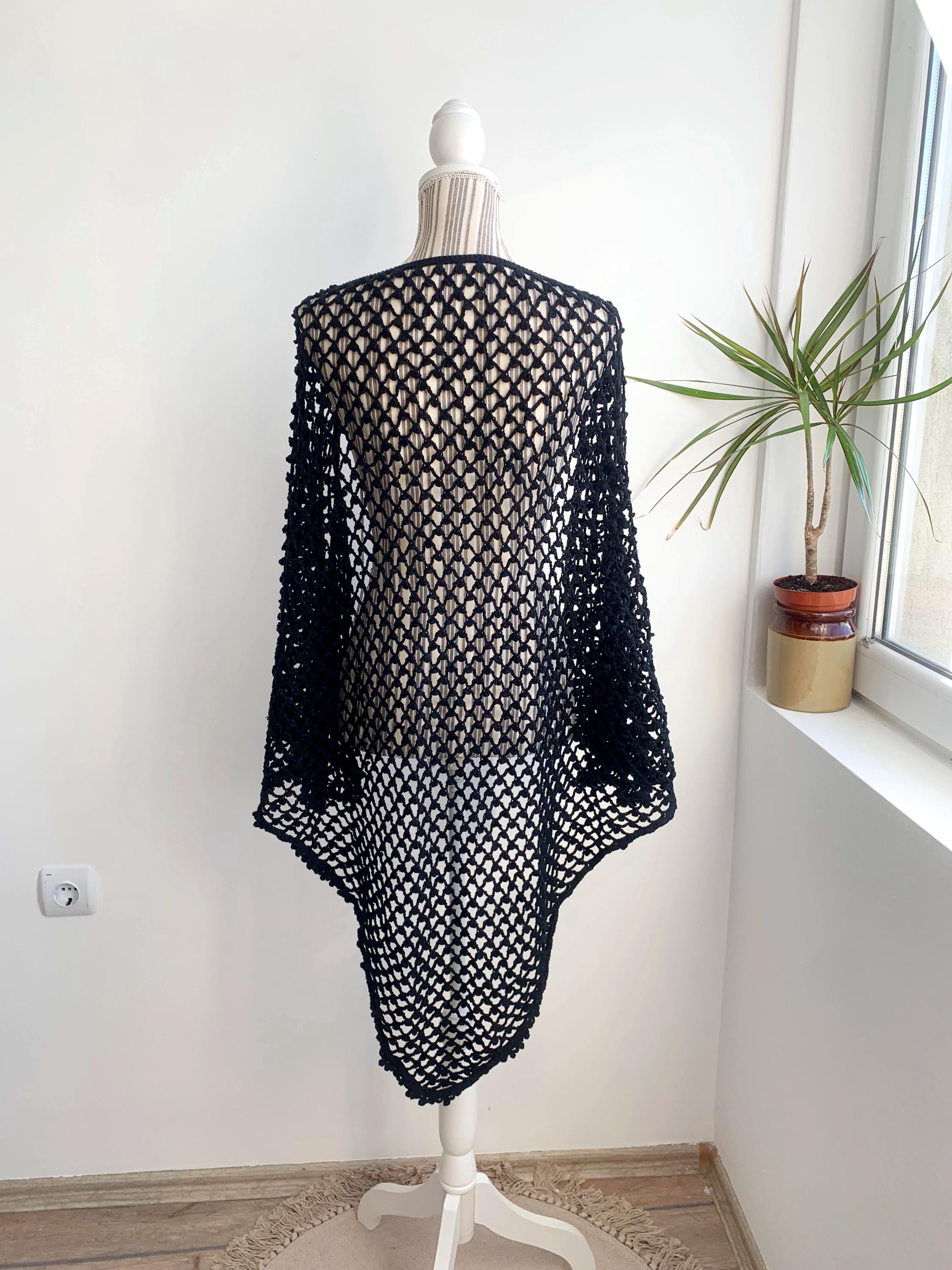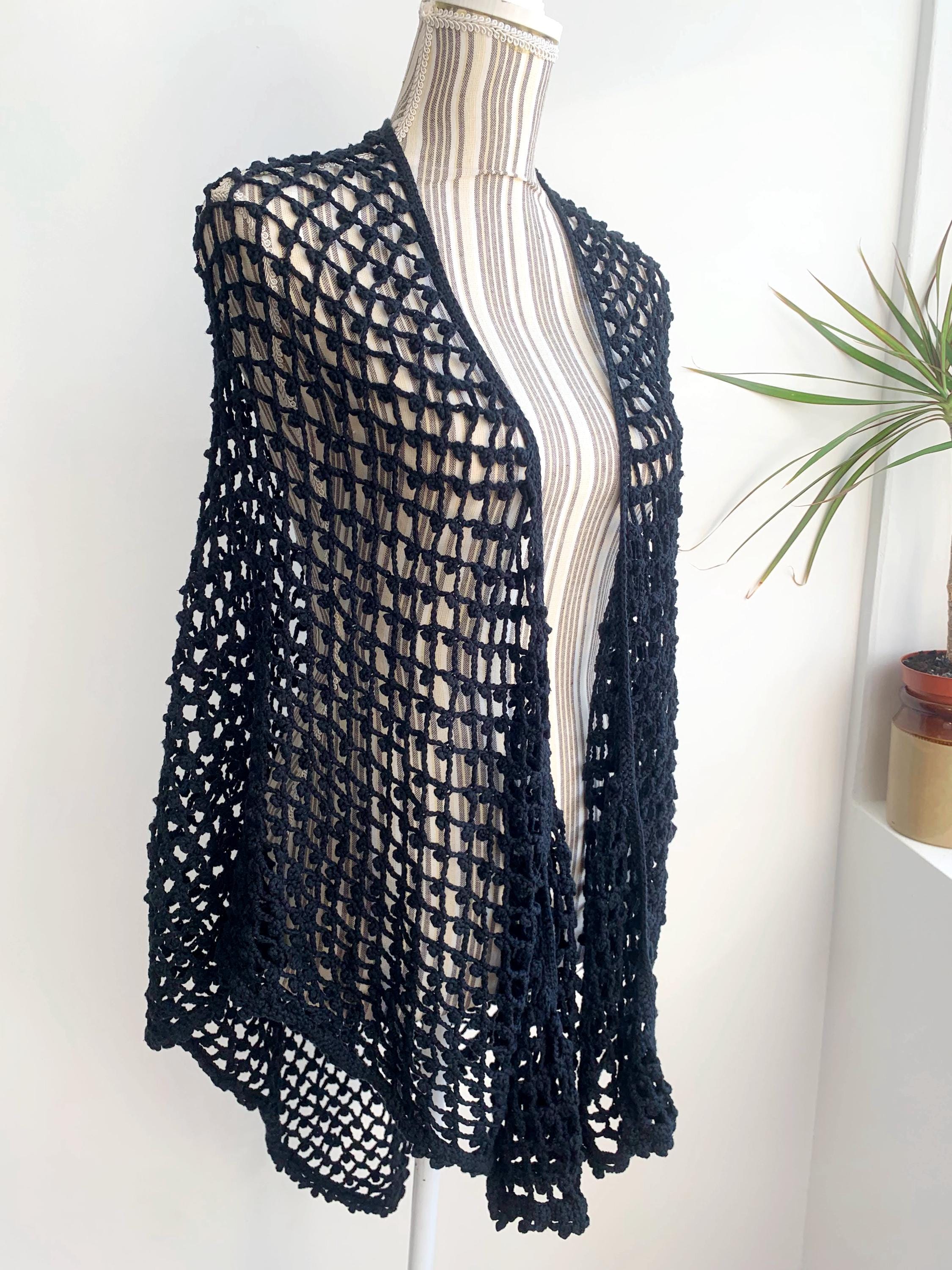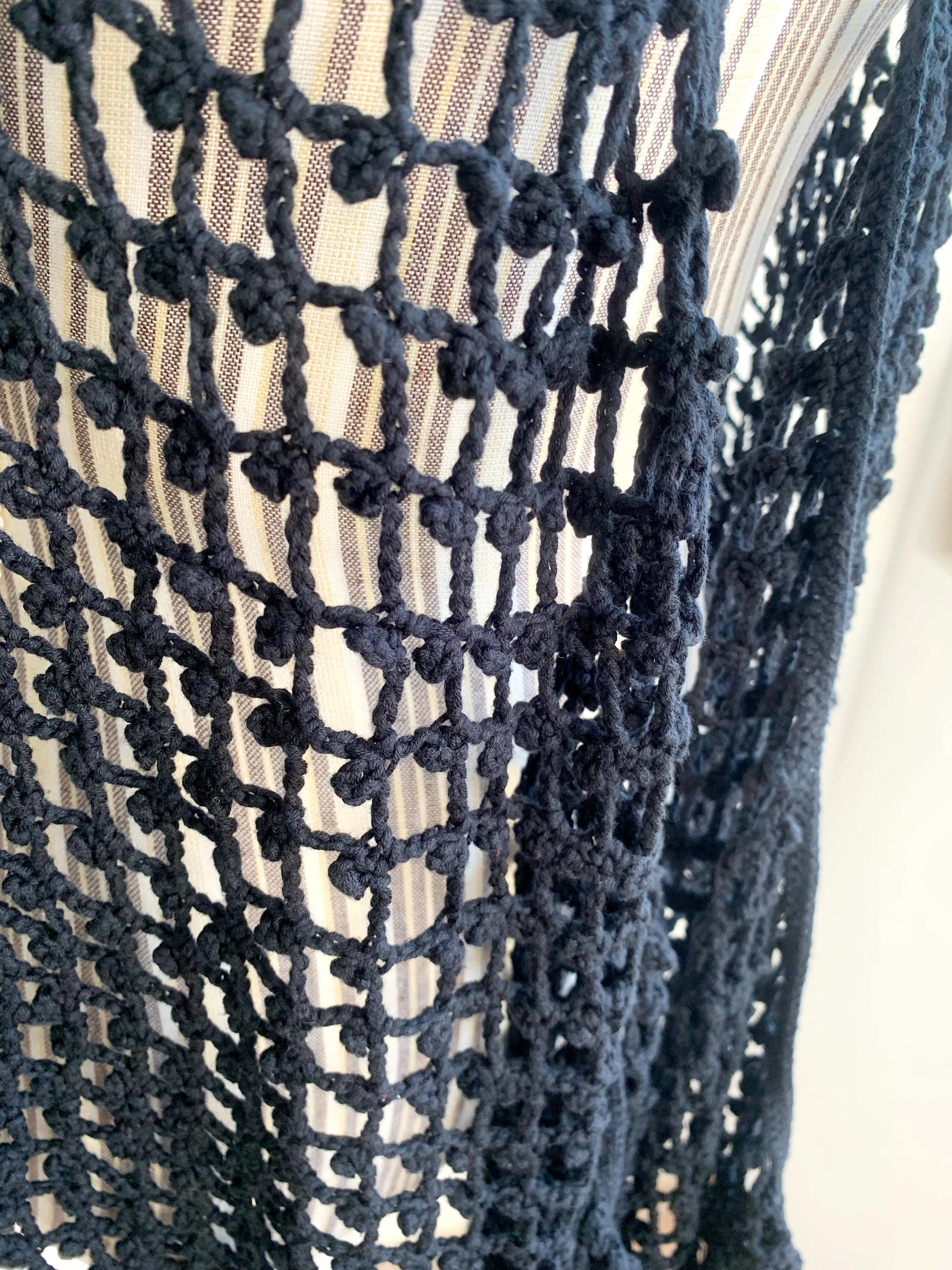 This is a vintage handmade crochet lace shawl. This boho crochet shawl is made of black yarn which feels like acrylic wool or could be wool/cotton blend. This fishnet triangle shawl can be worn as a shoulder wrap shawl or as a bib scarf. Beautiful piano shawl that will be the perfect retro accessory for your outfit. Amazing sustainable gift for a vintage lover.