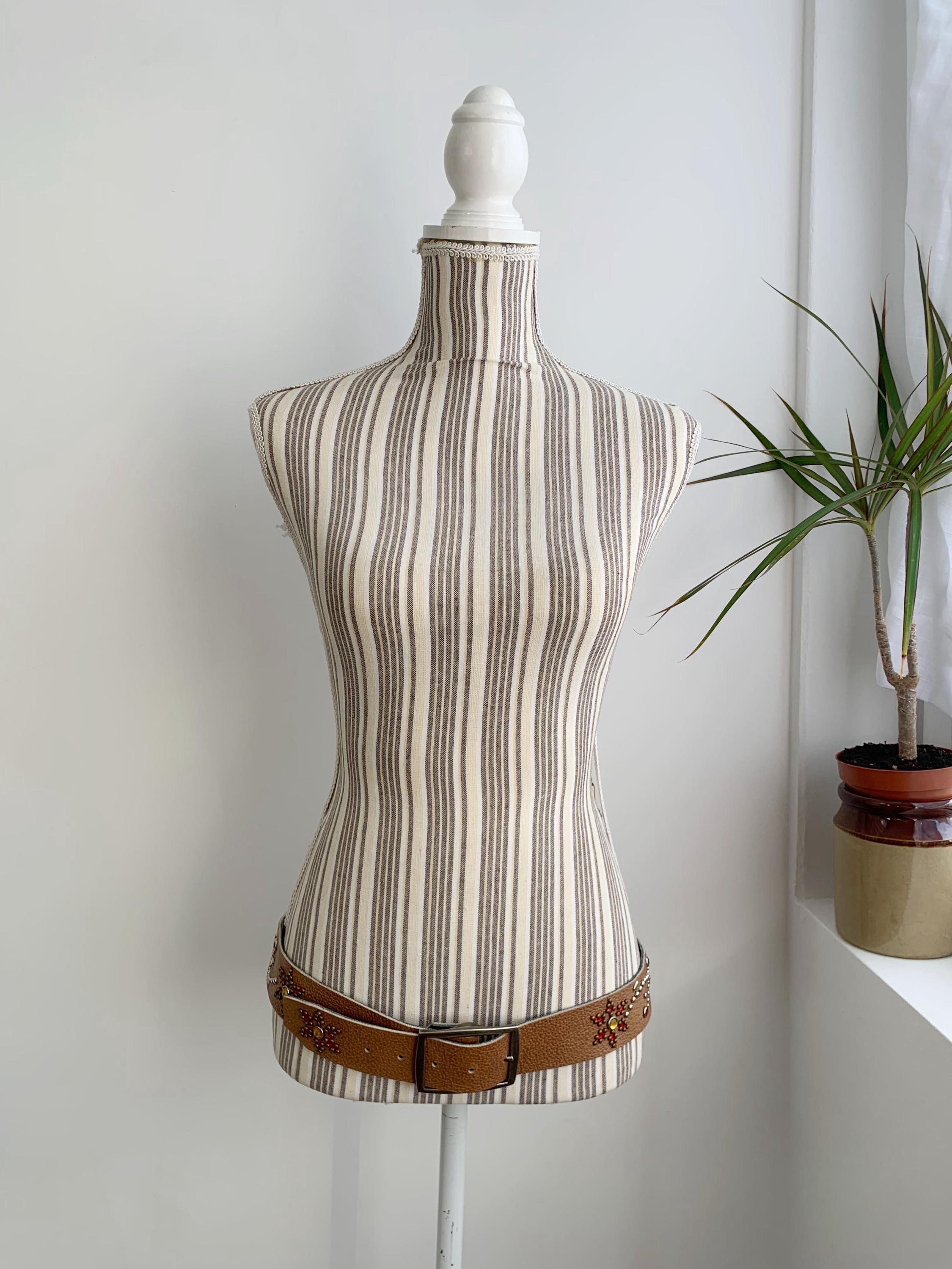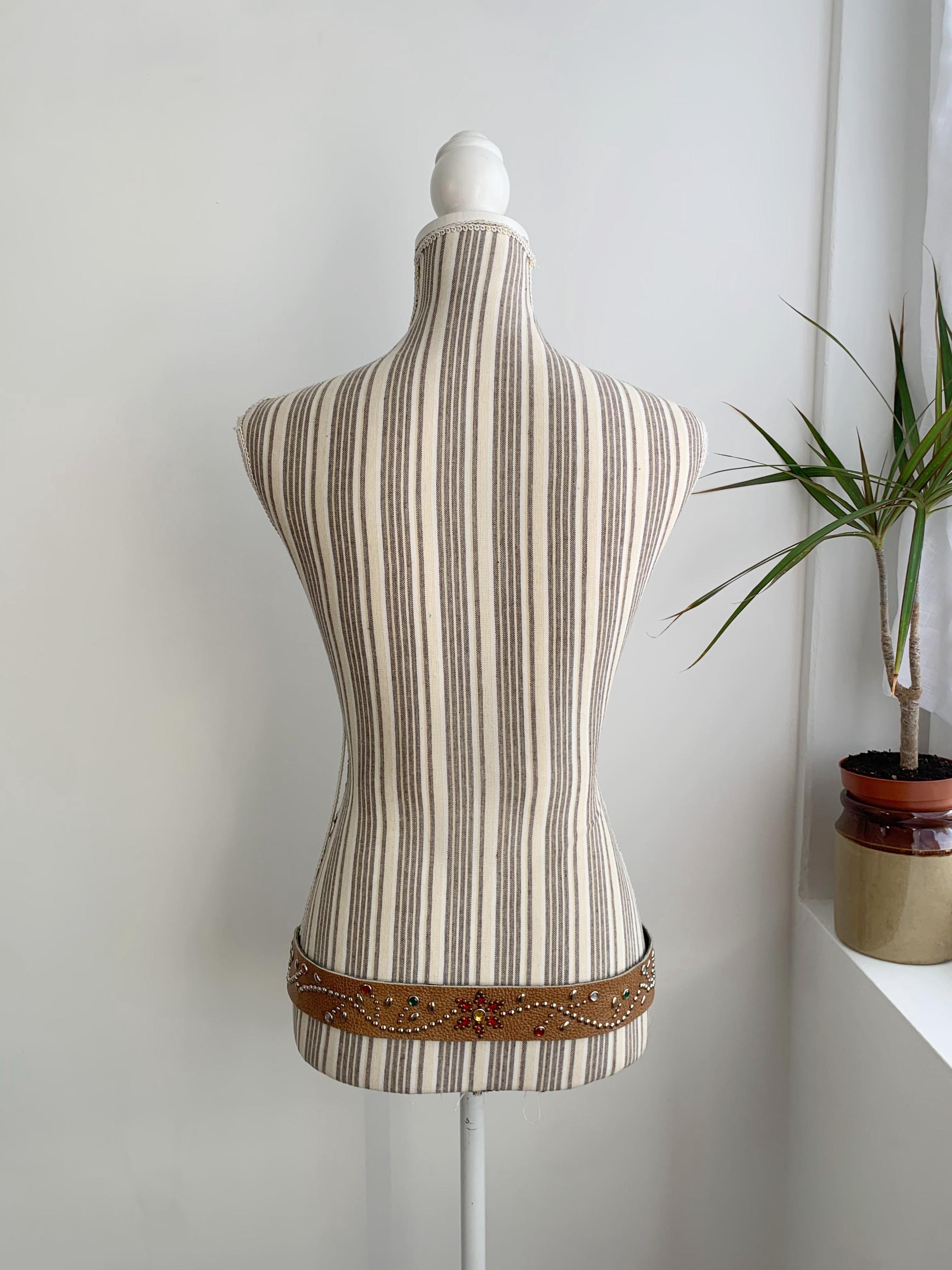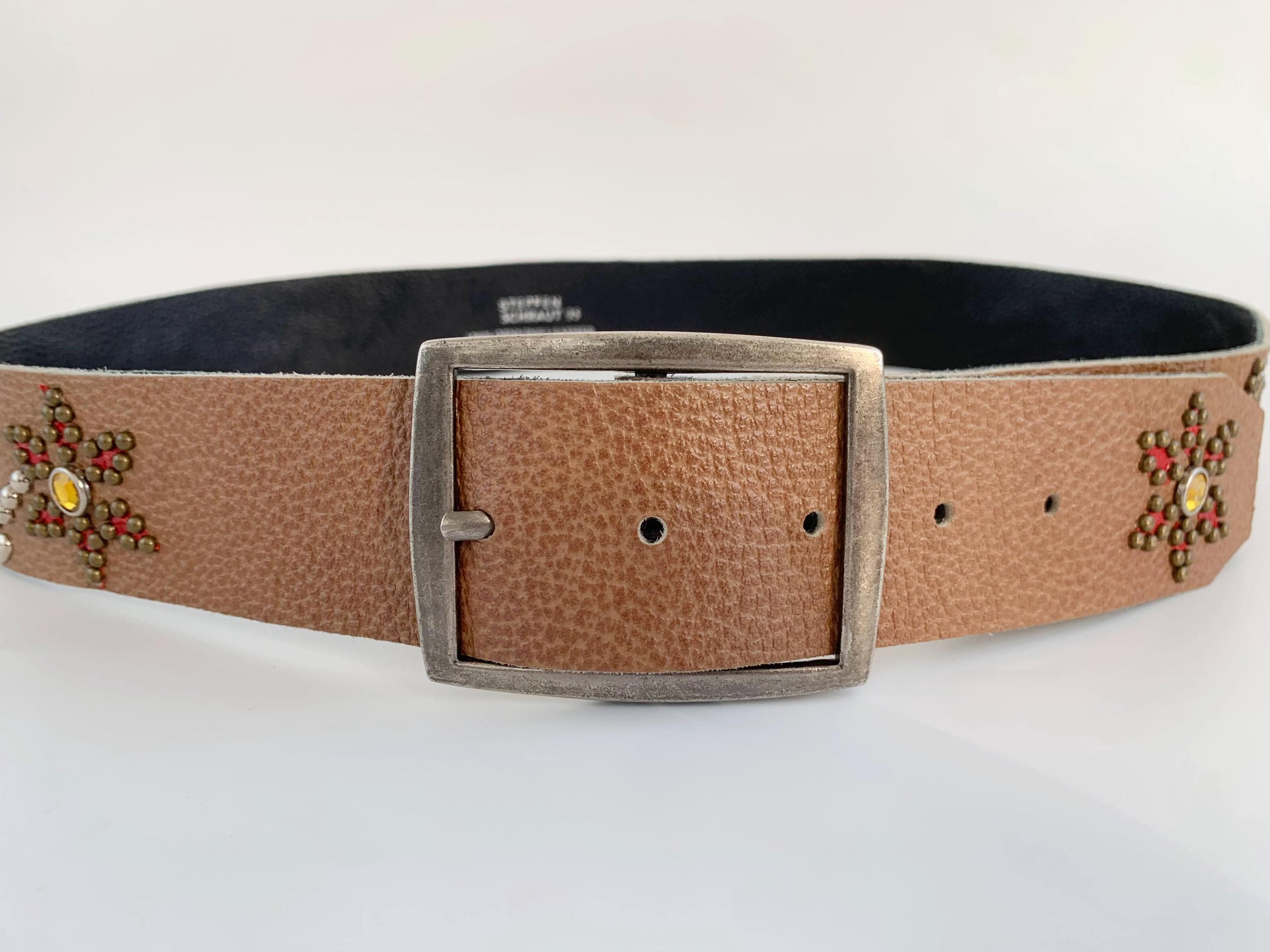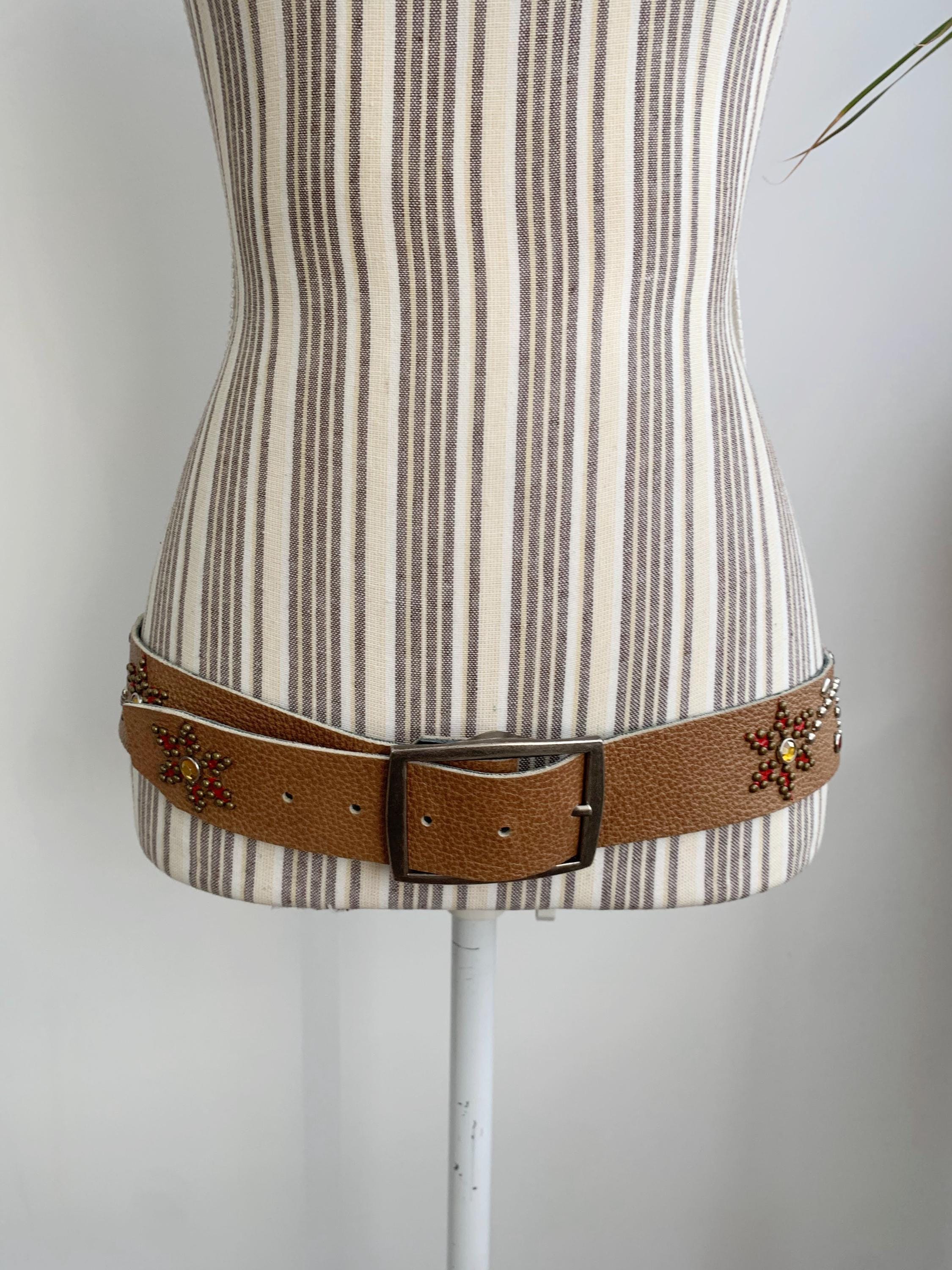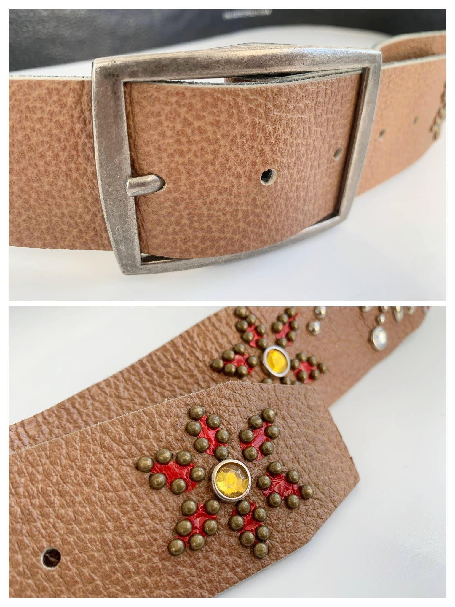 This is a vintage Y2K camel brown leather studded belt with shiny brass and silvet studs with floral embellishment. This boho chic waist belt is heavily studded all over the leather surface. Cute hippie chic accessory to give a more edgy look to your simple outfits.