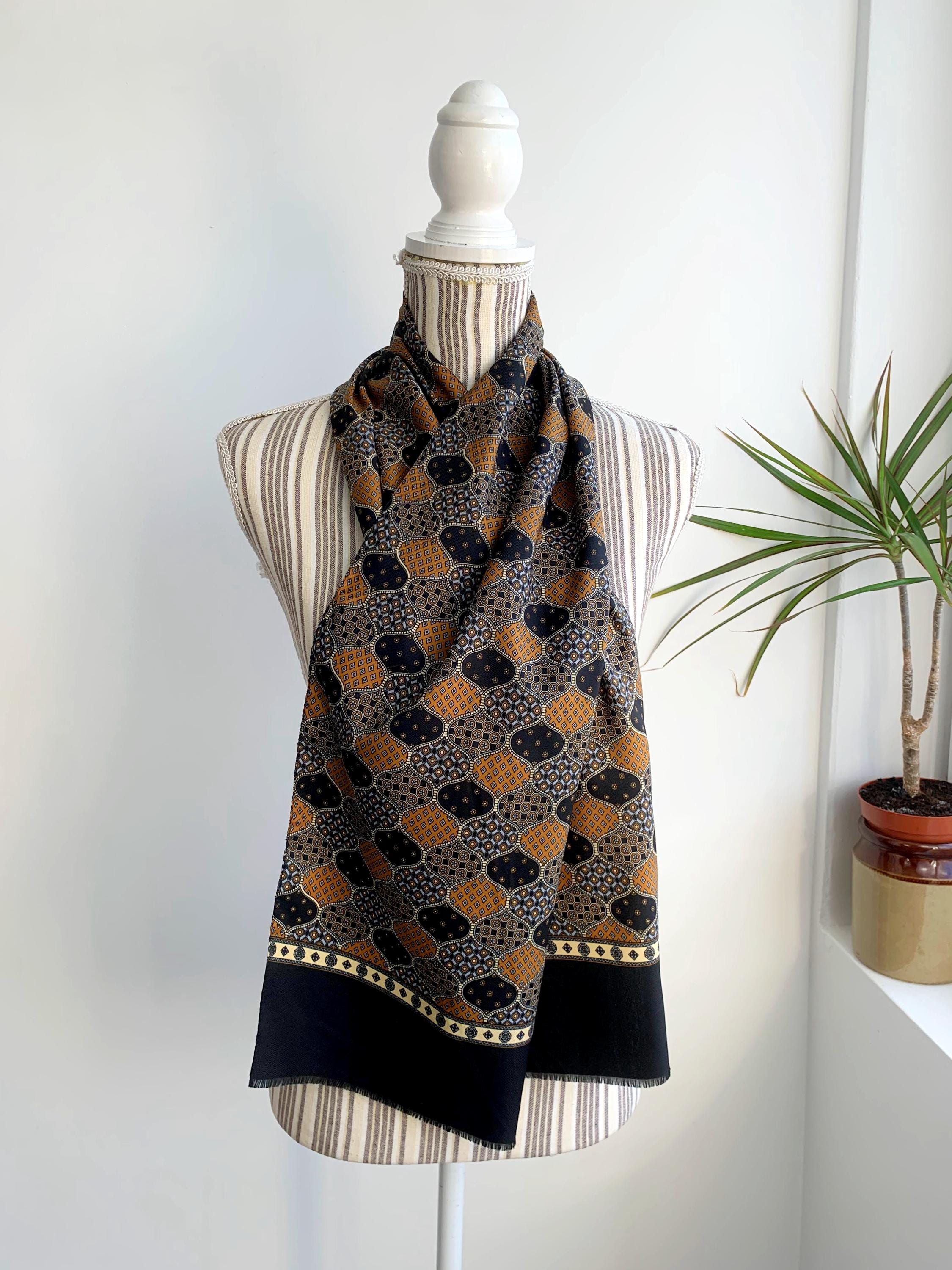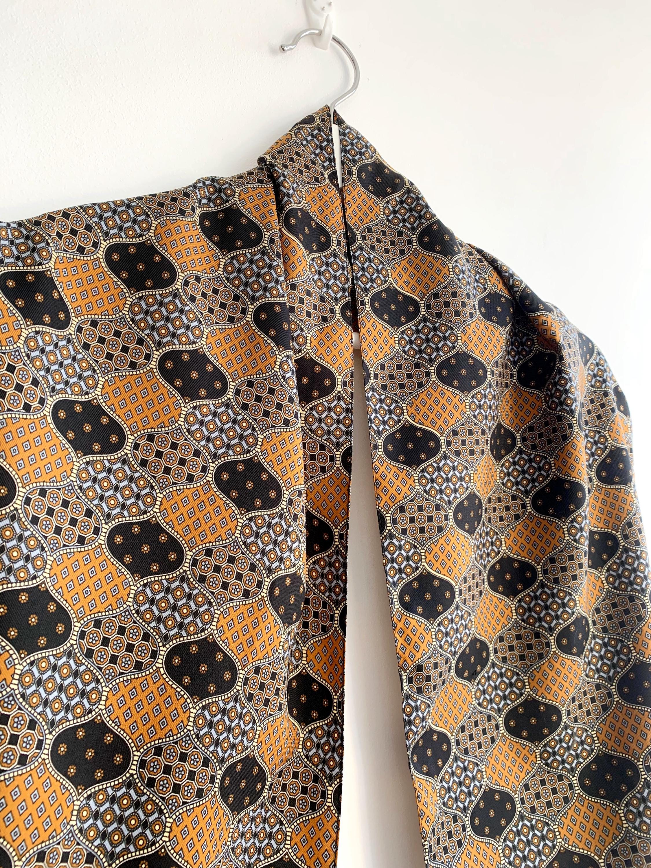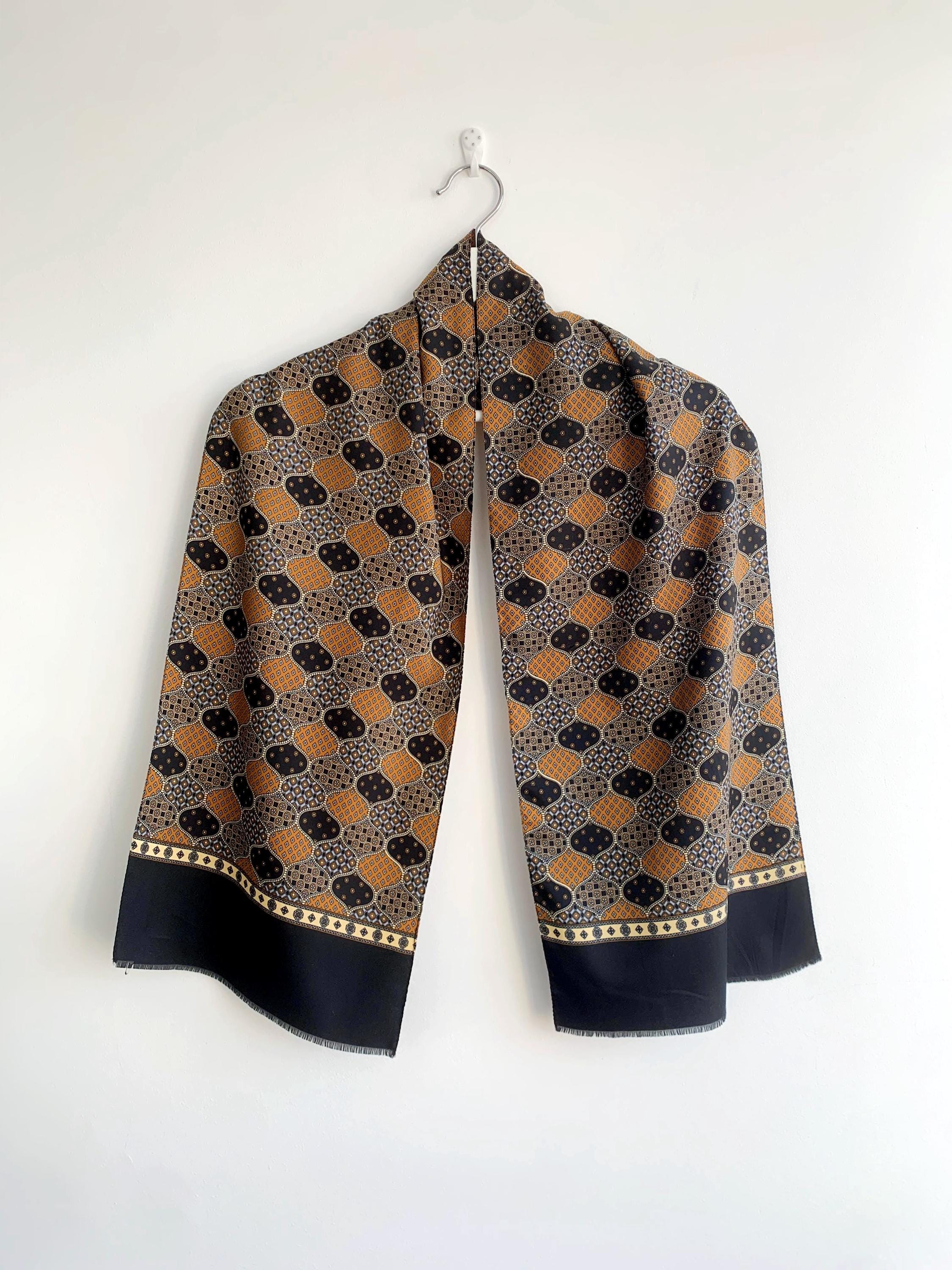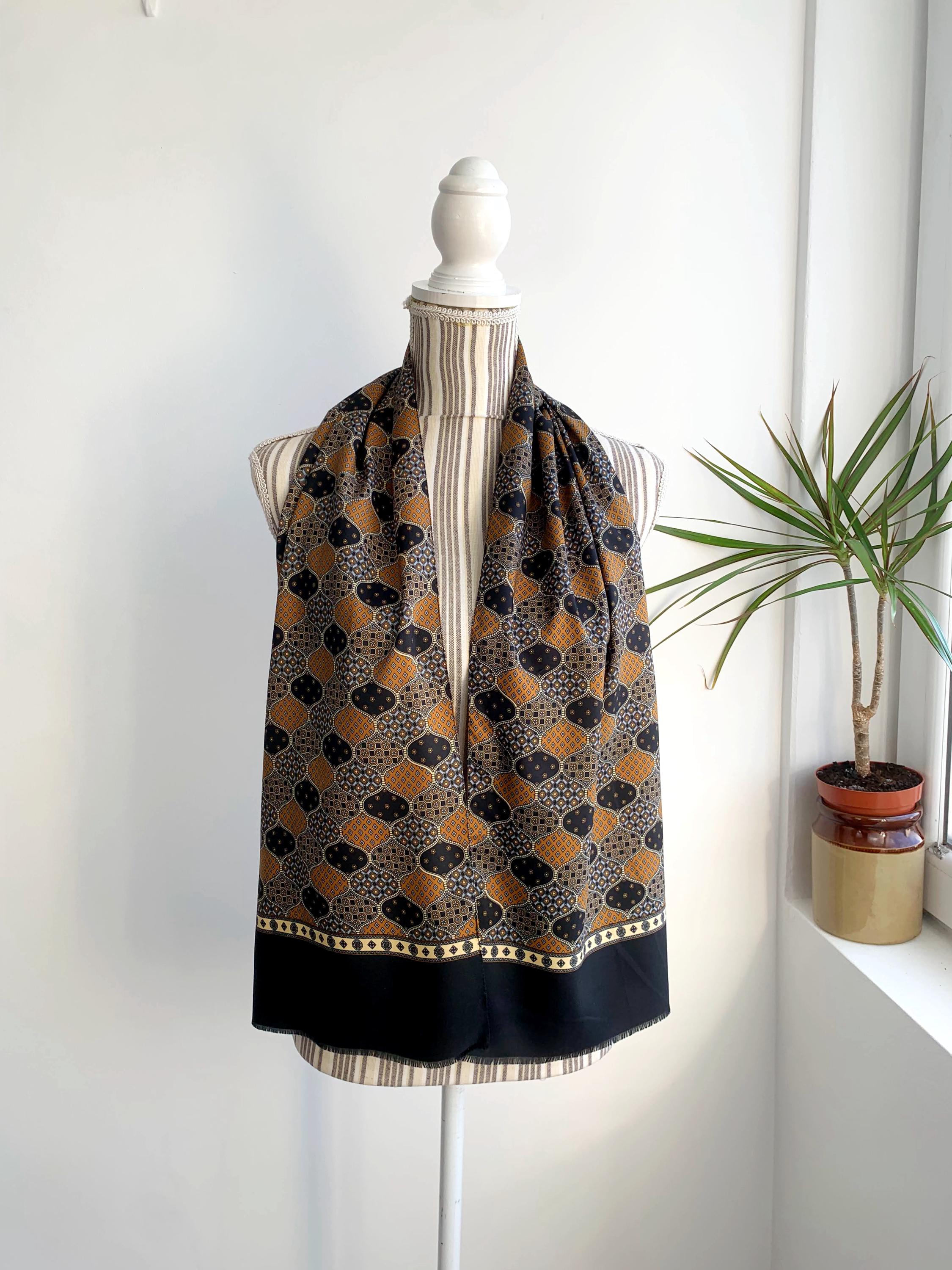 This is a vintage 70s novelty print scarf for men made of lightweight polyester fabric with ditsy floral geometric print in shades of mustard yellow, camel brown, light blue and black.