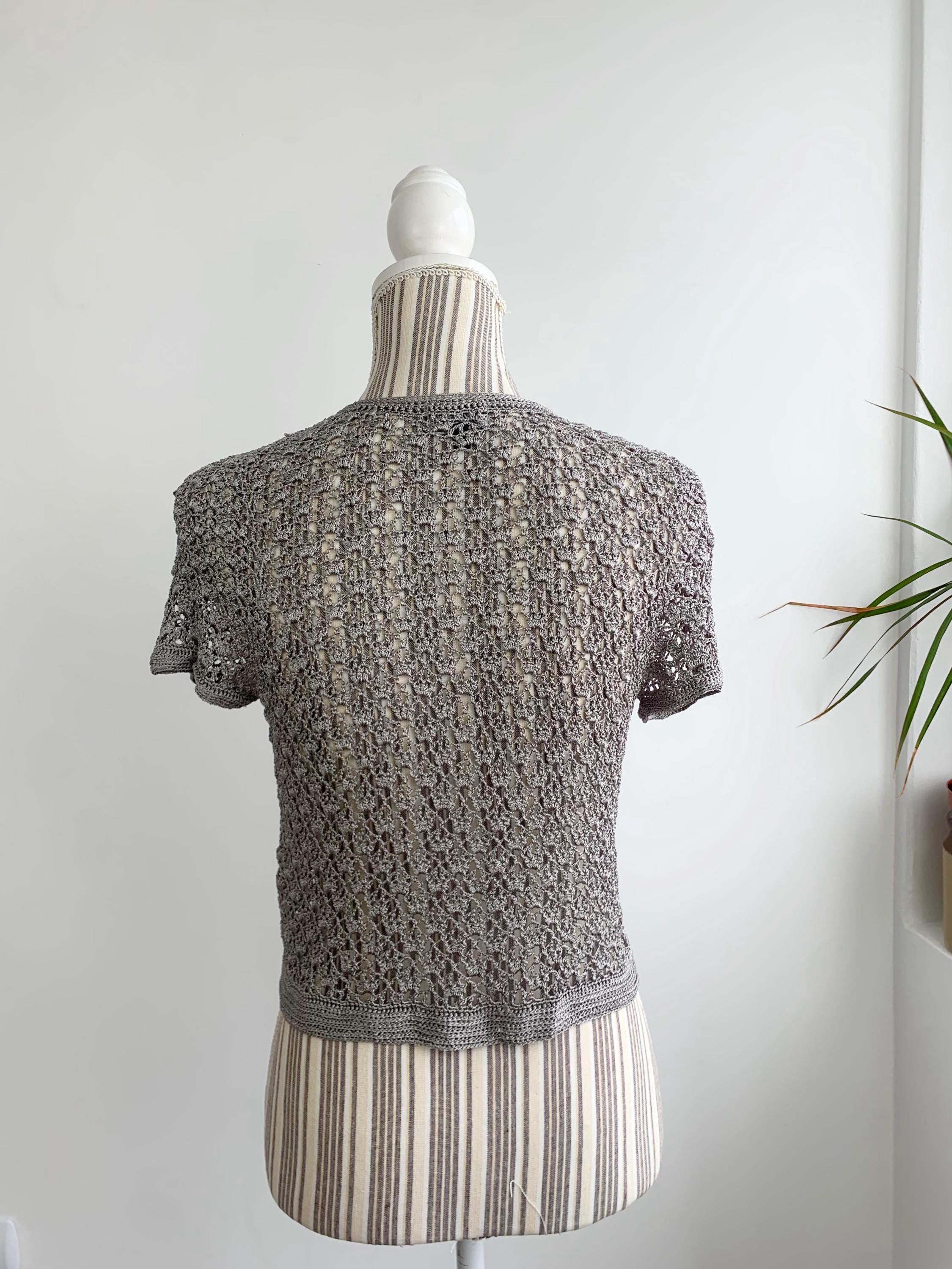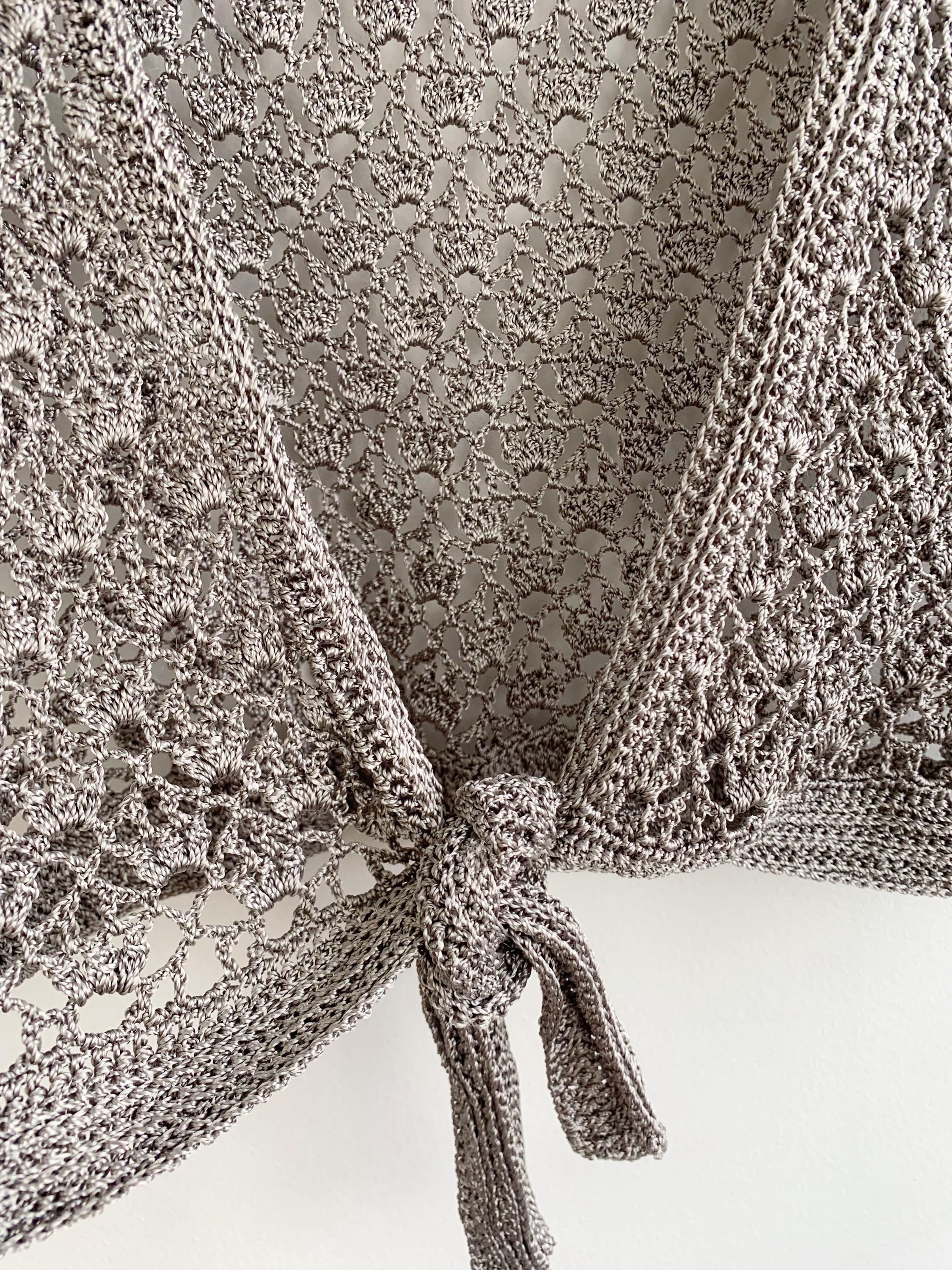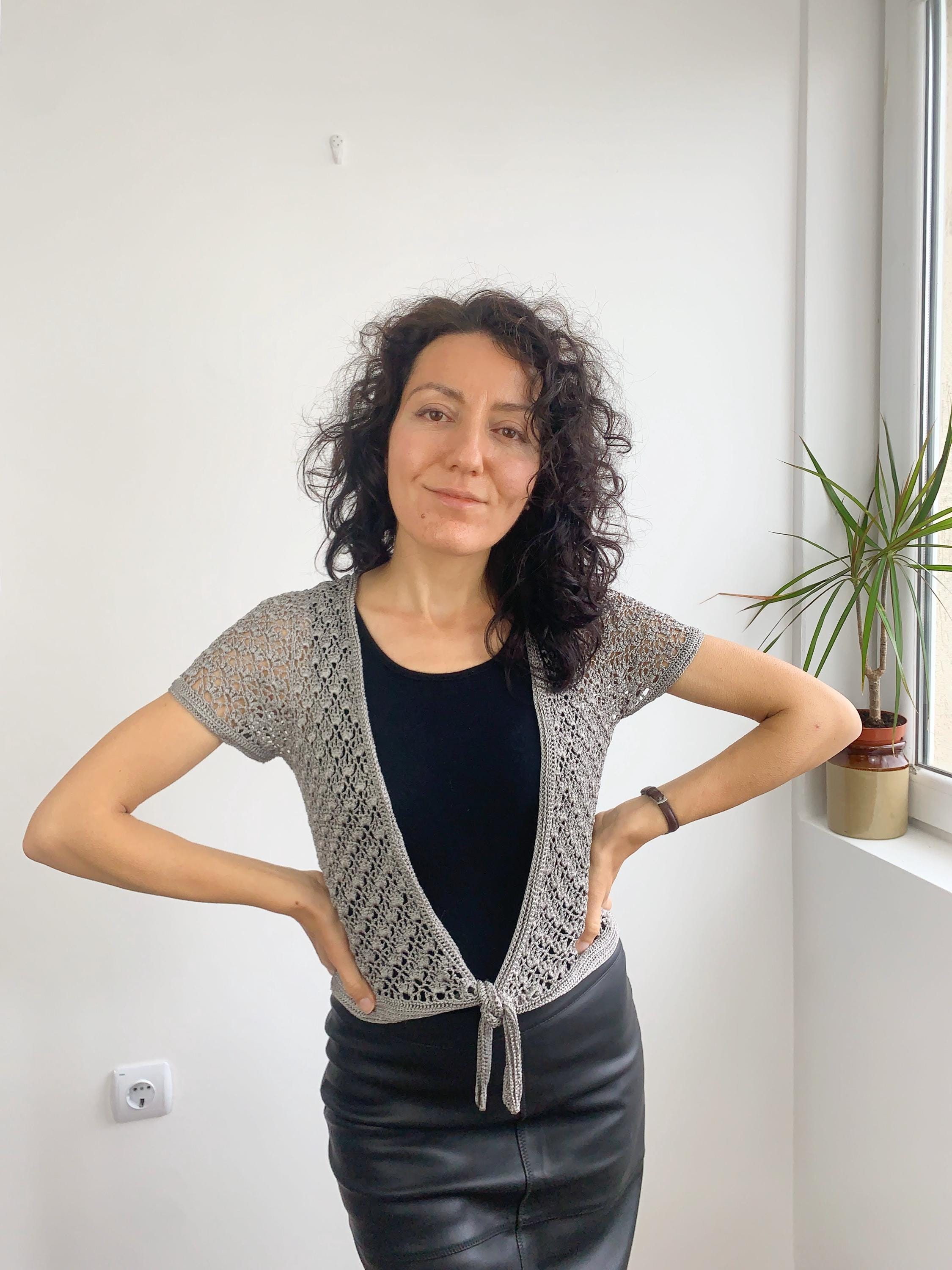 This is a pretty silver grey lace cardigan made of shiny viscose thread with delicate lacey pattern. This tie front crochet cardigan has a lovely lace geometric pattern. It is so stylish and elegant that you can wear it over evening gowns or pair it with jeans and a crop top for a boho look. The fabric is stretchy. This cropped bolero has delicate satin silky shine when exposed to light. This mesh sweater top is perfect to wear as an elegant cardie or even as a beach cover up. This silver grey lace cardigan has a cropped silhouette. The size marked is M, however it fits smaller like size S. Please check the measurements below.