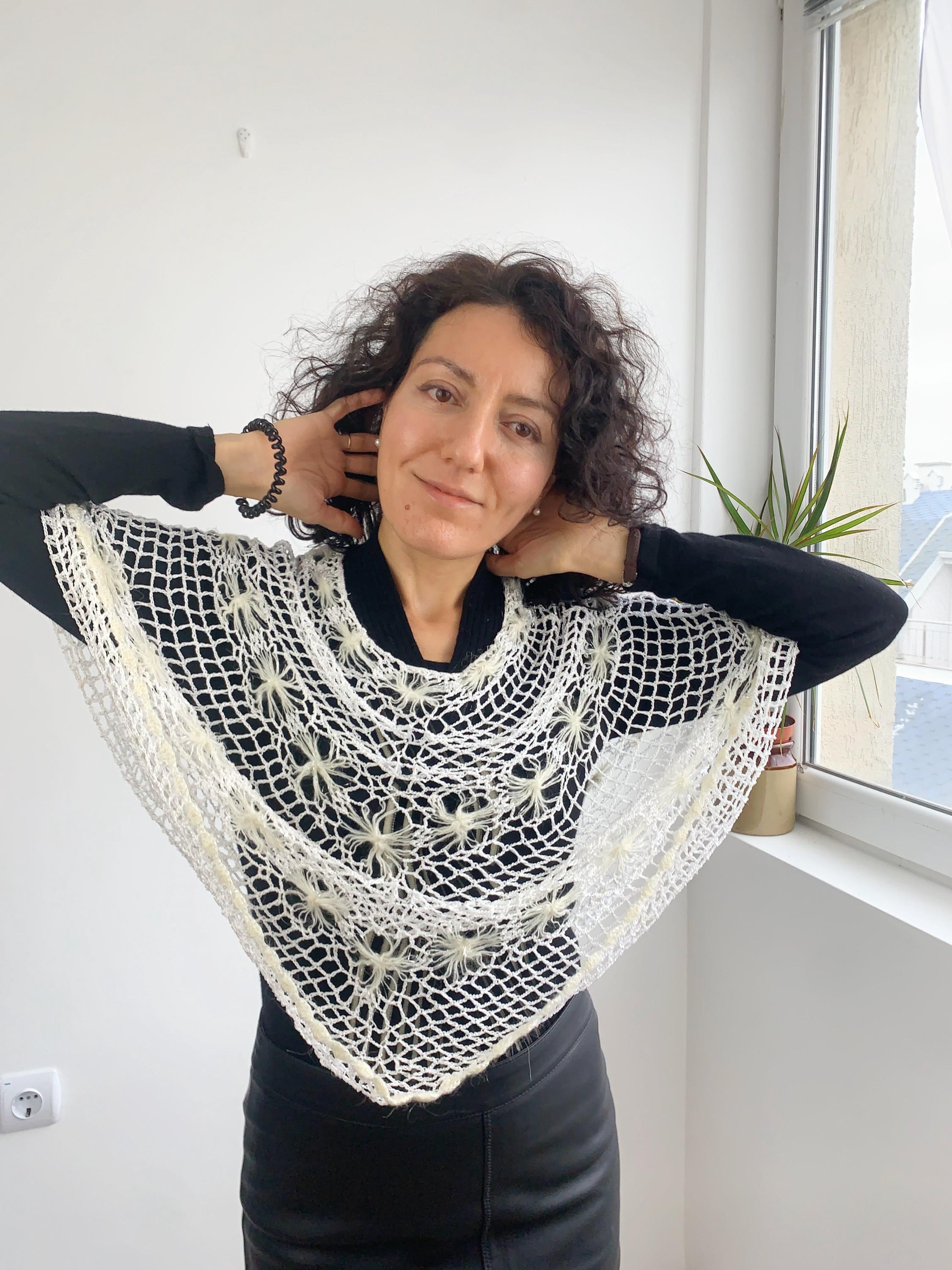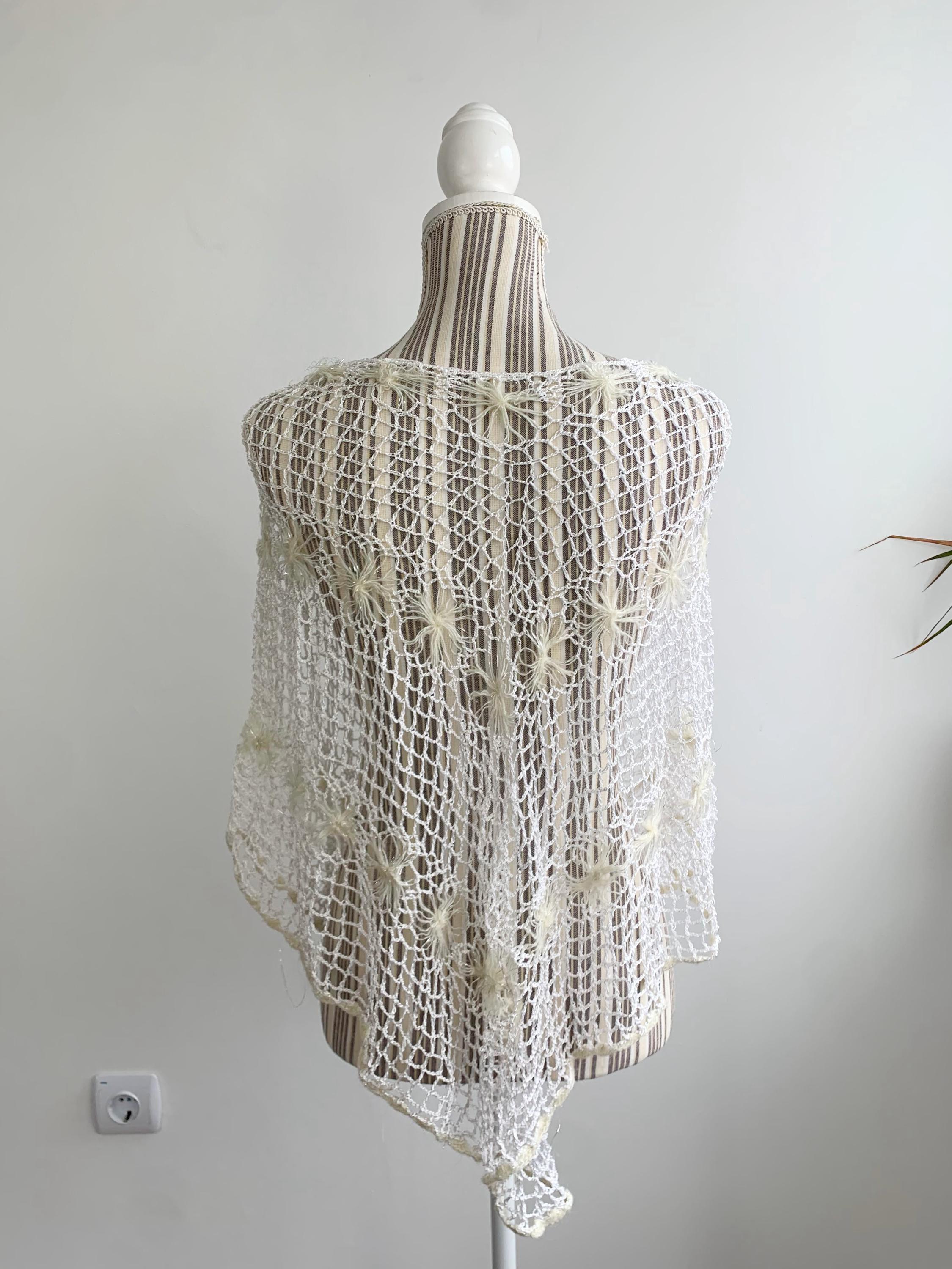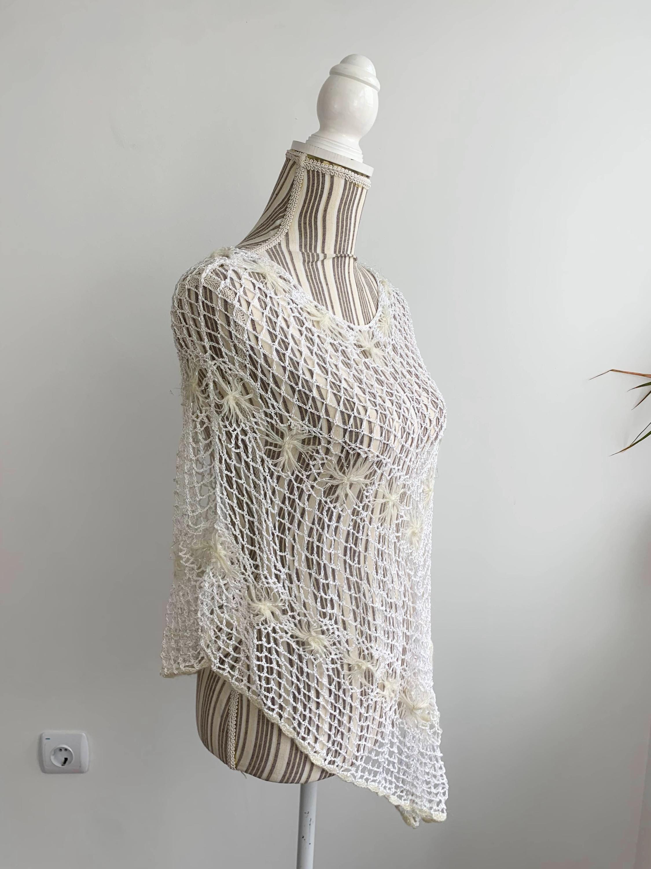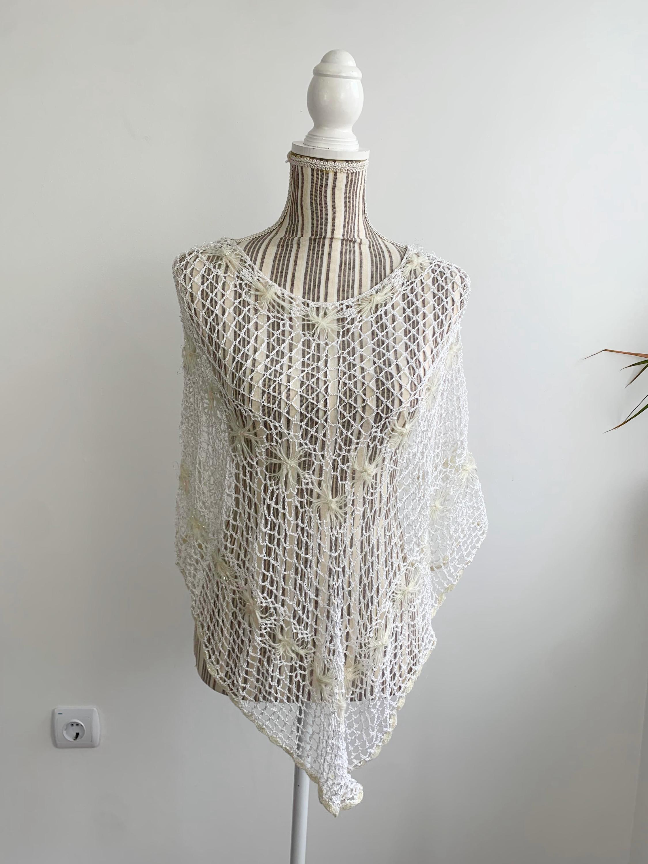 This is a beautiful white lace crochet poncho for women made of pearl white silky viscose thread which has a beautiful shine when exposed to light and delicate cream color mohair wool and silver lame accents. This sheer mesh top has beautiful lacey geometric pattern and scalloped edges. This boho shawl cape will look awesome as a beach cover up or as a bohemian lace crop top.