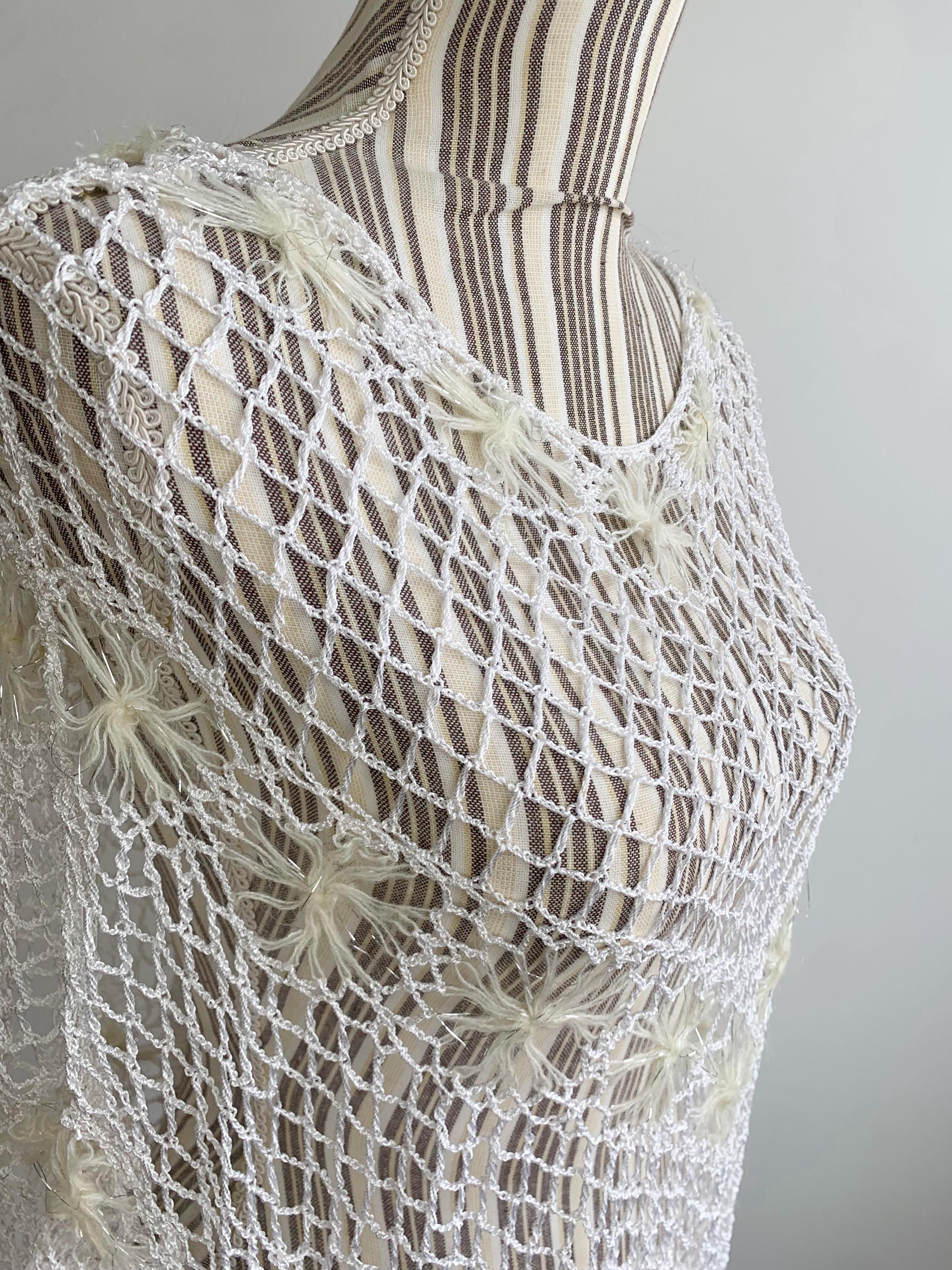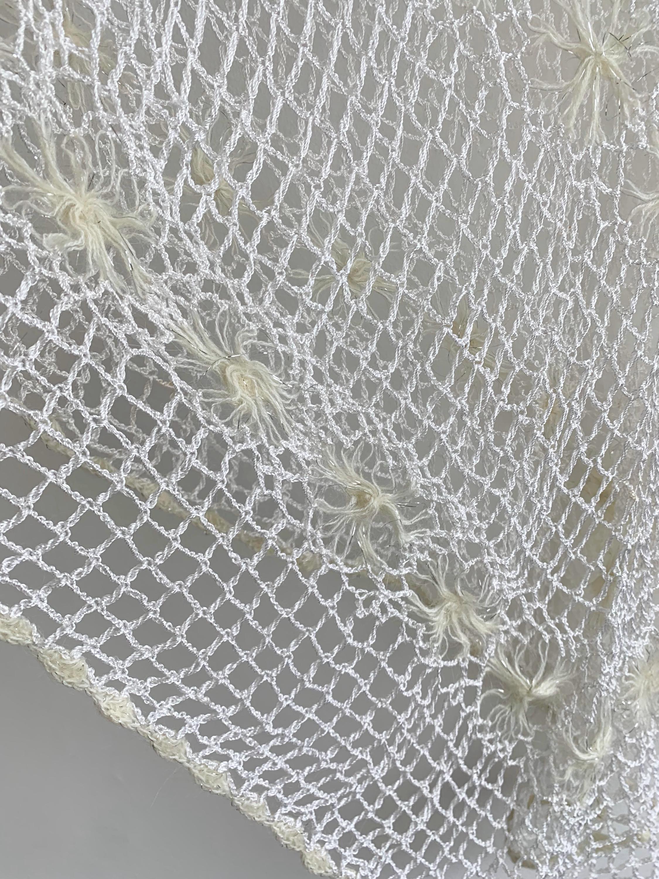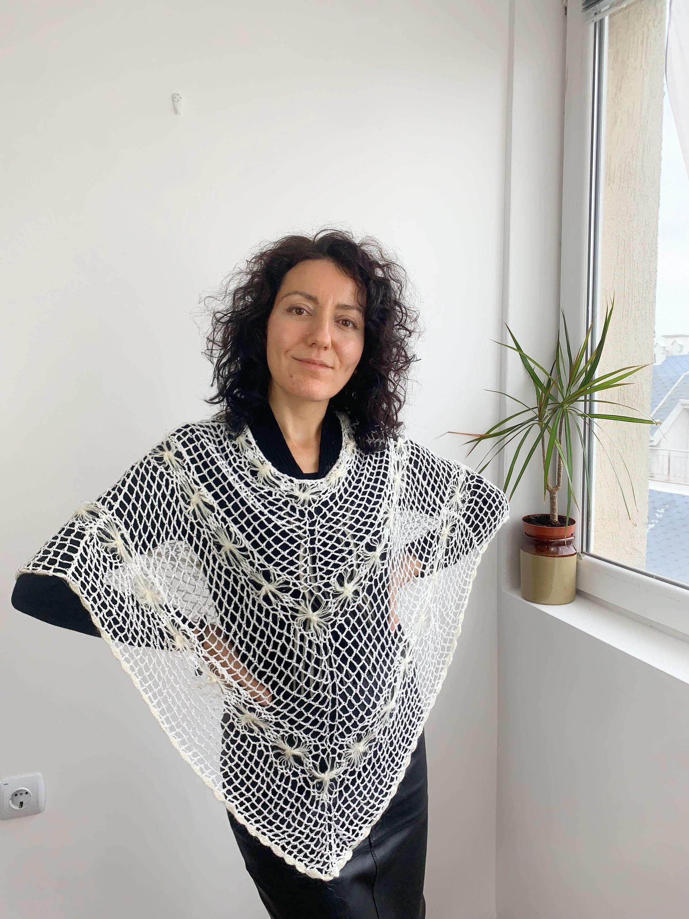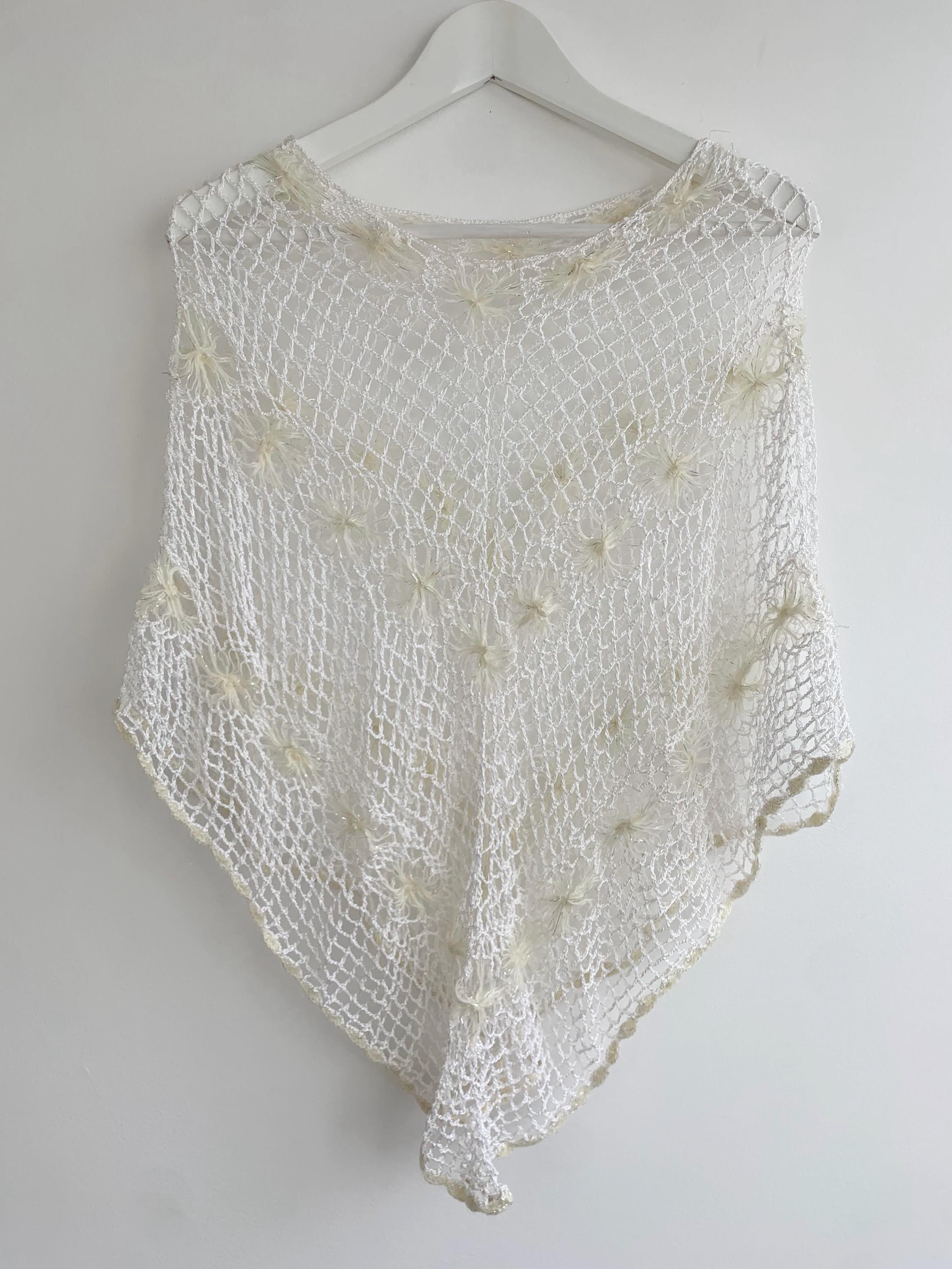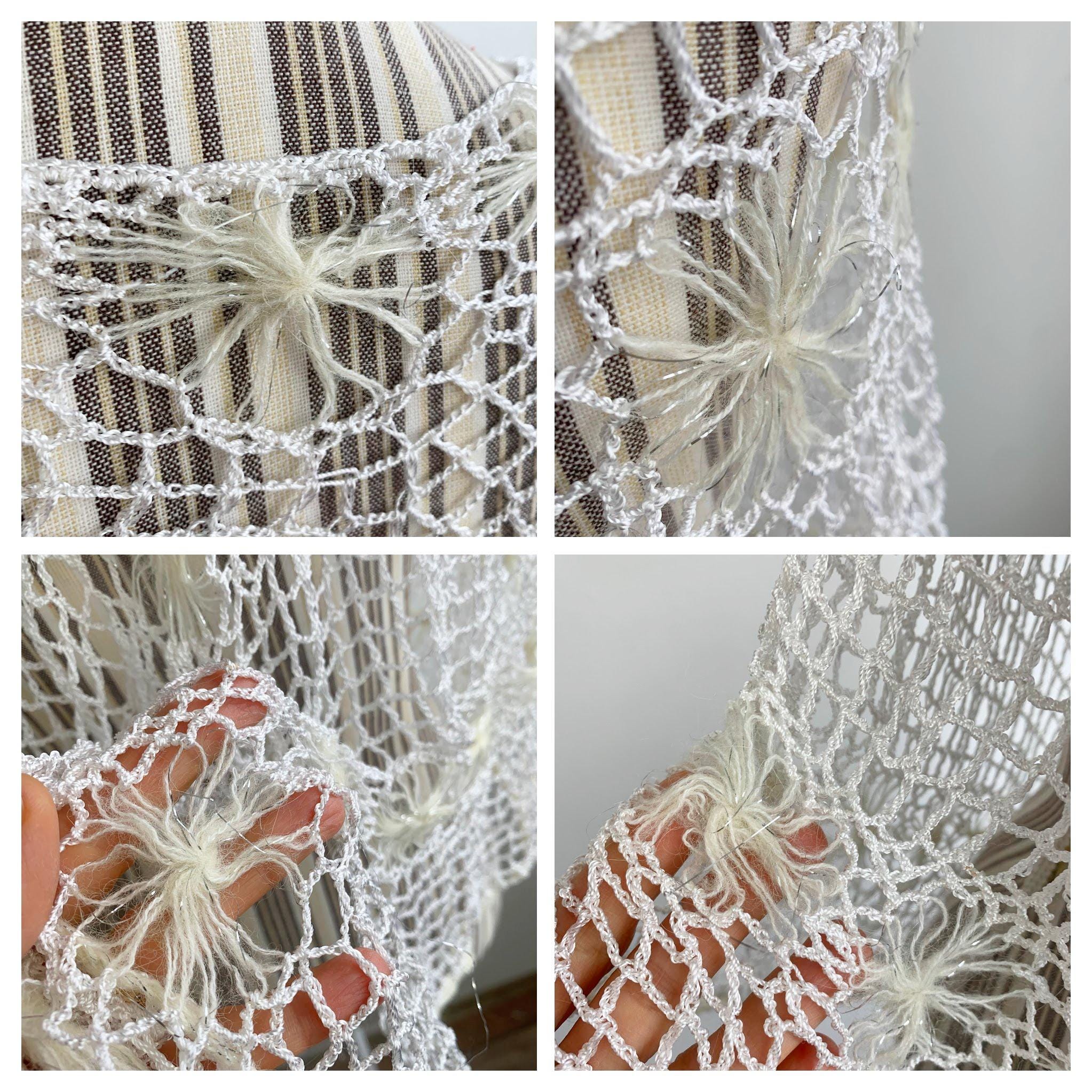 This is a beautiful white lace crochet poncho for women made of pearl white silky viscose thread which has a beautiful shine when exposed to light and delicate cream color mohair wool and silver lame accents. This sheer mesh top has beautiful lacey geometric pattern and scalloped edges. This boho shawl cape will look awesome as a beach cover up or as a bohemian lace crop top.