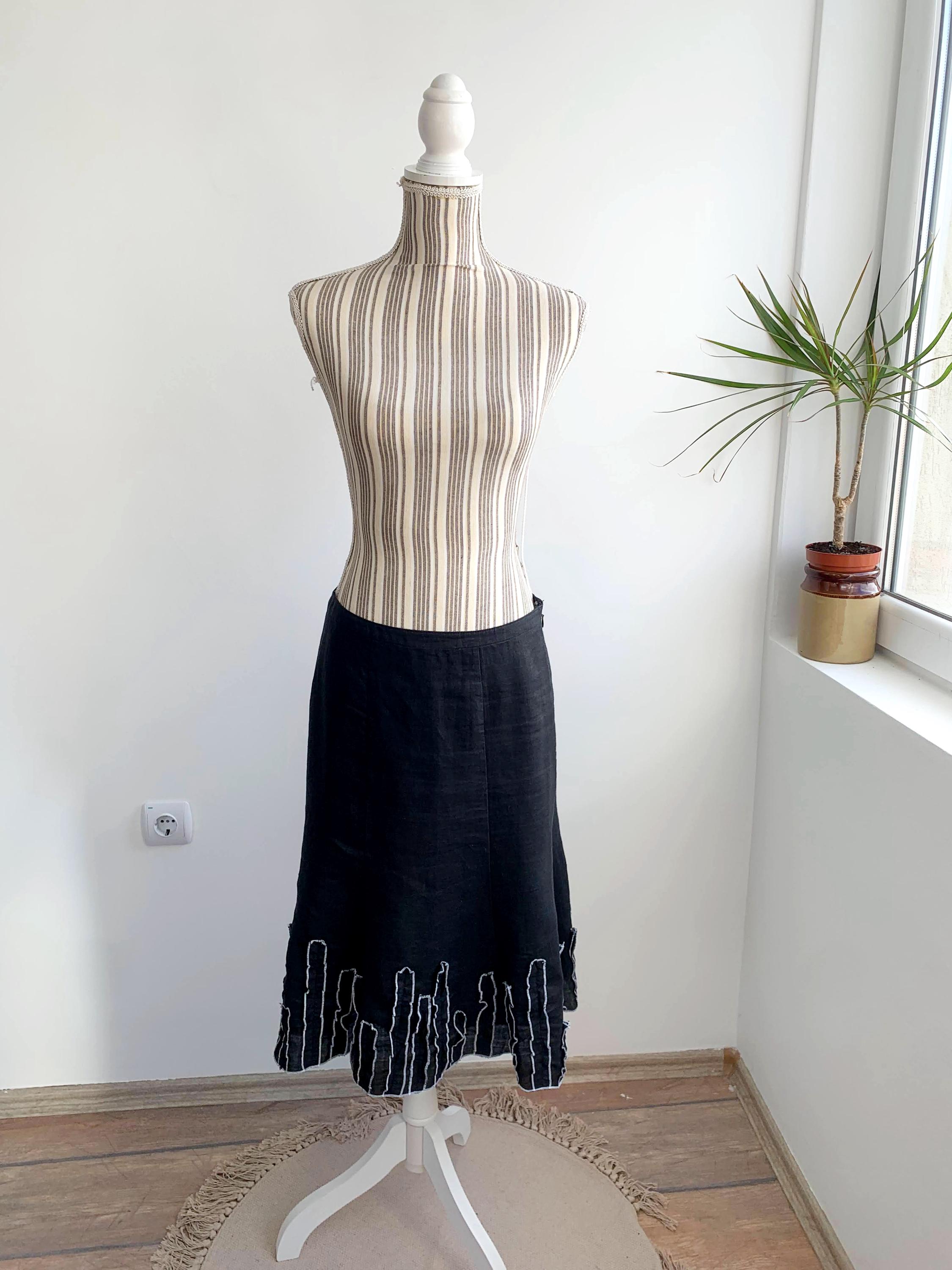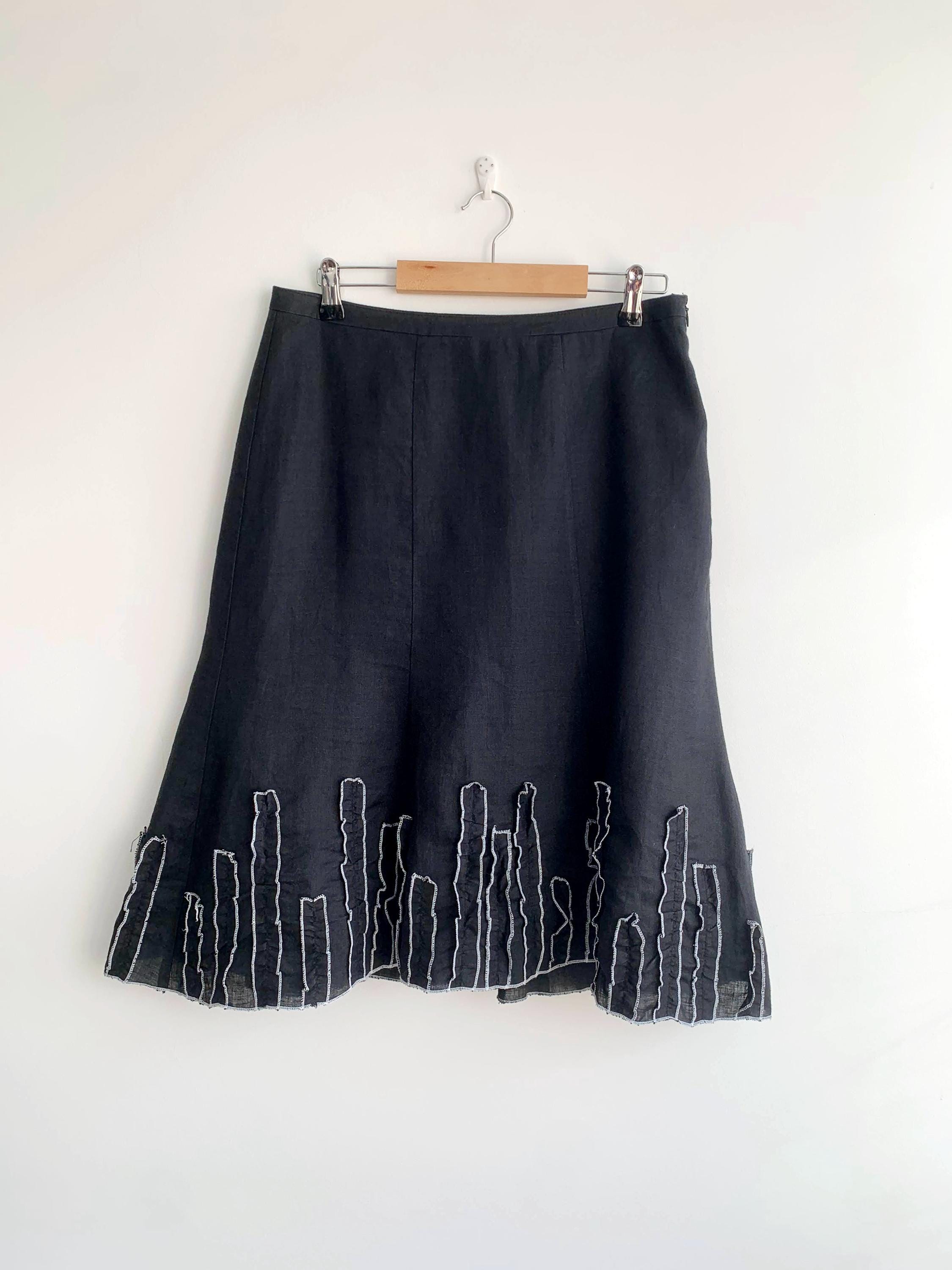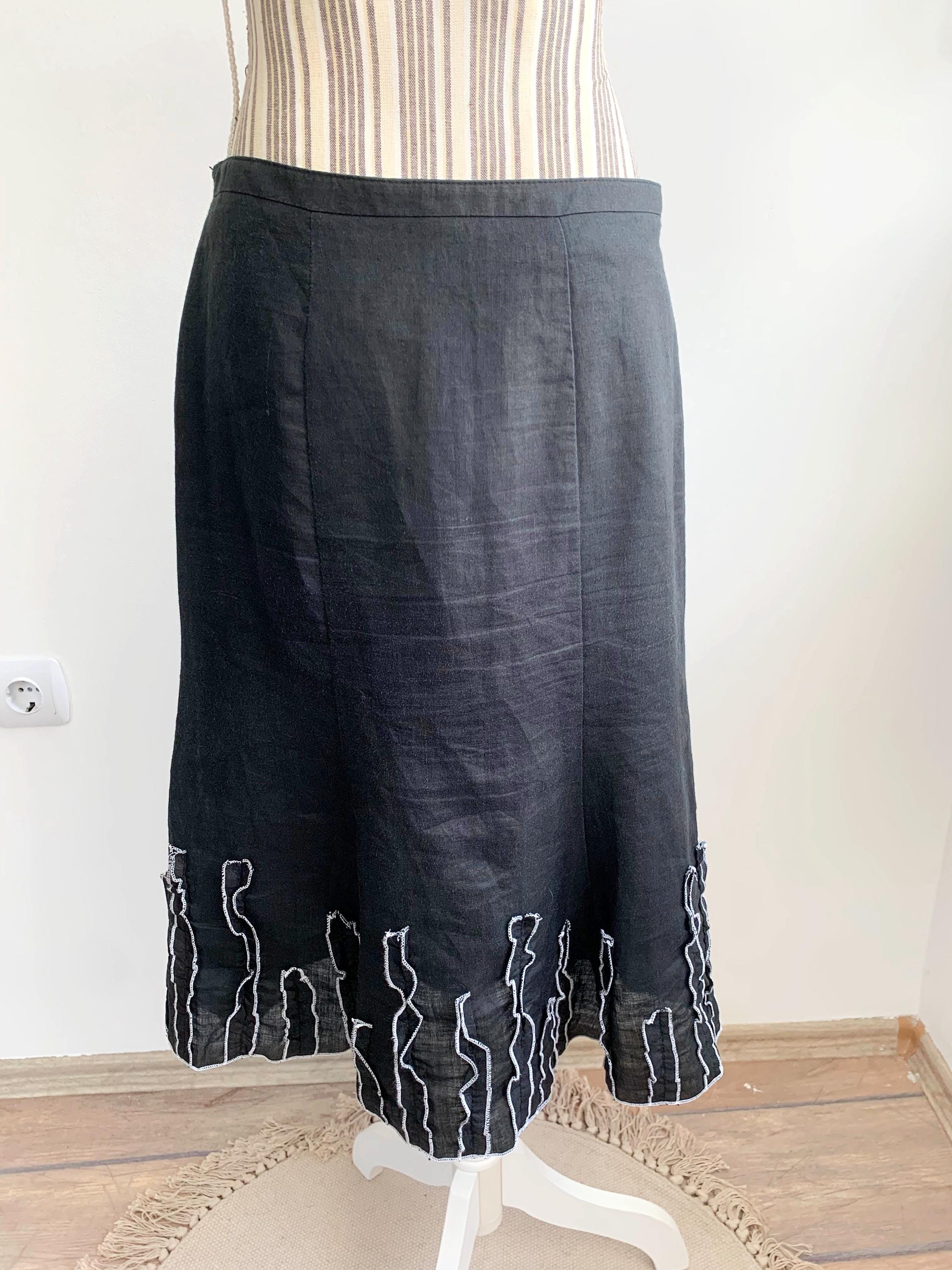 This is a vintage Y2K black below the knee pure linen skirt with flared bottom and ruffled detailing. This linen midi skirt has side zip and button closure and pure cotton lining.