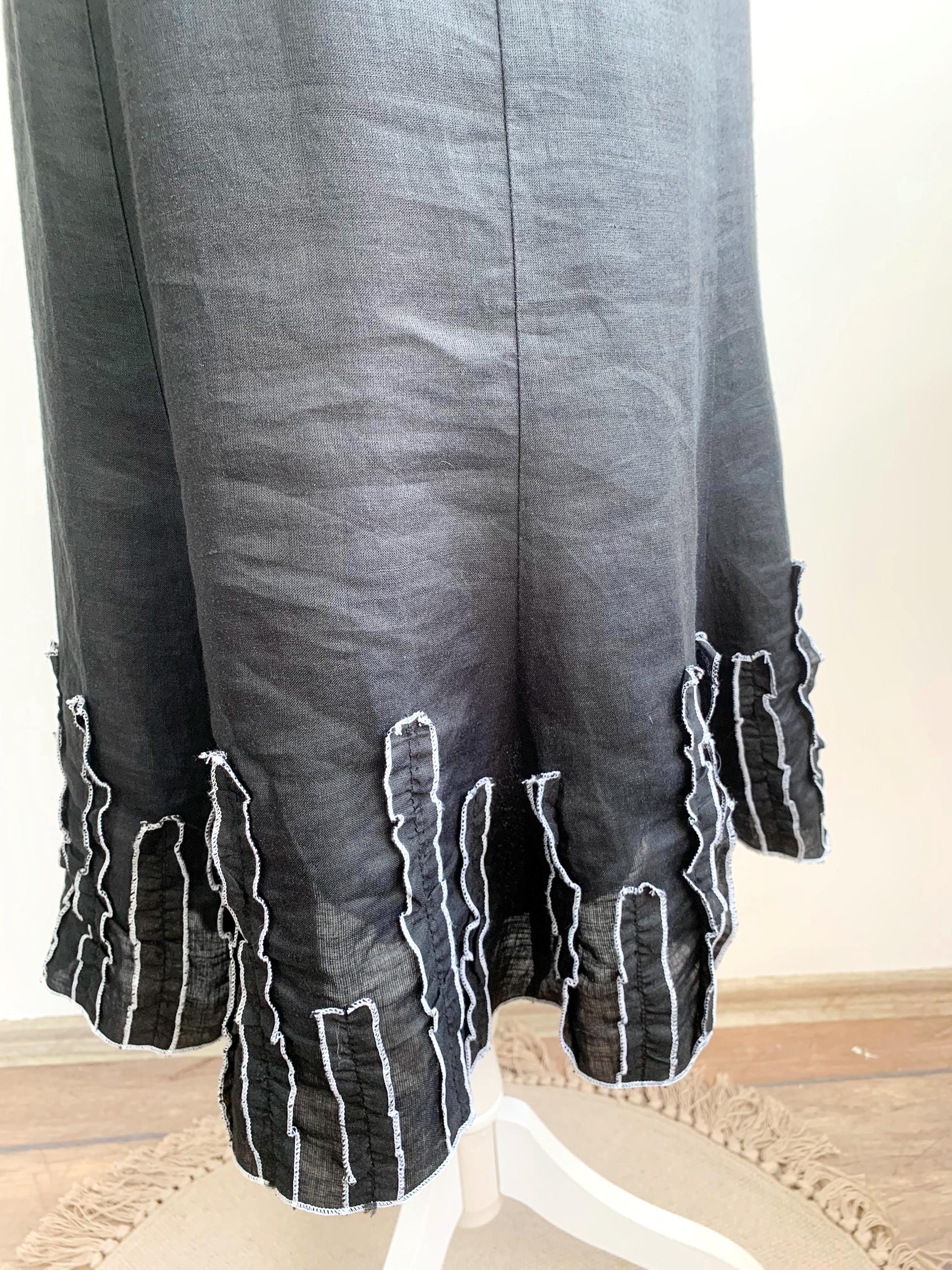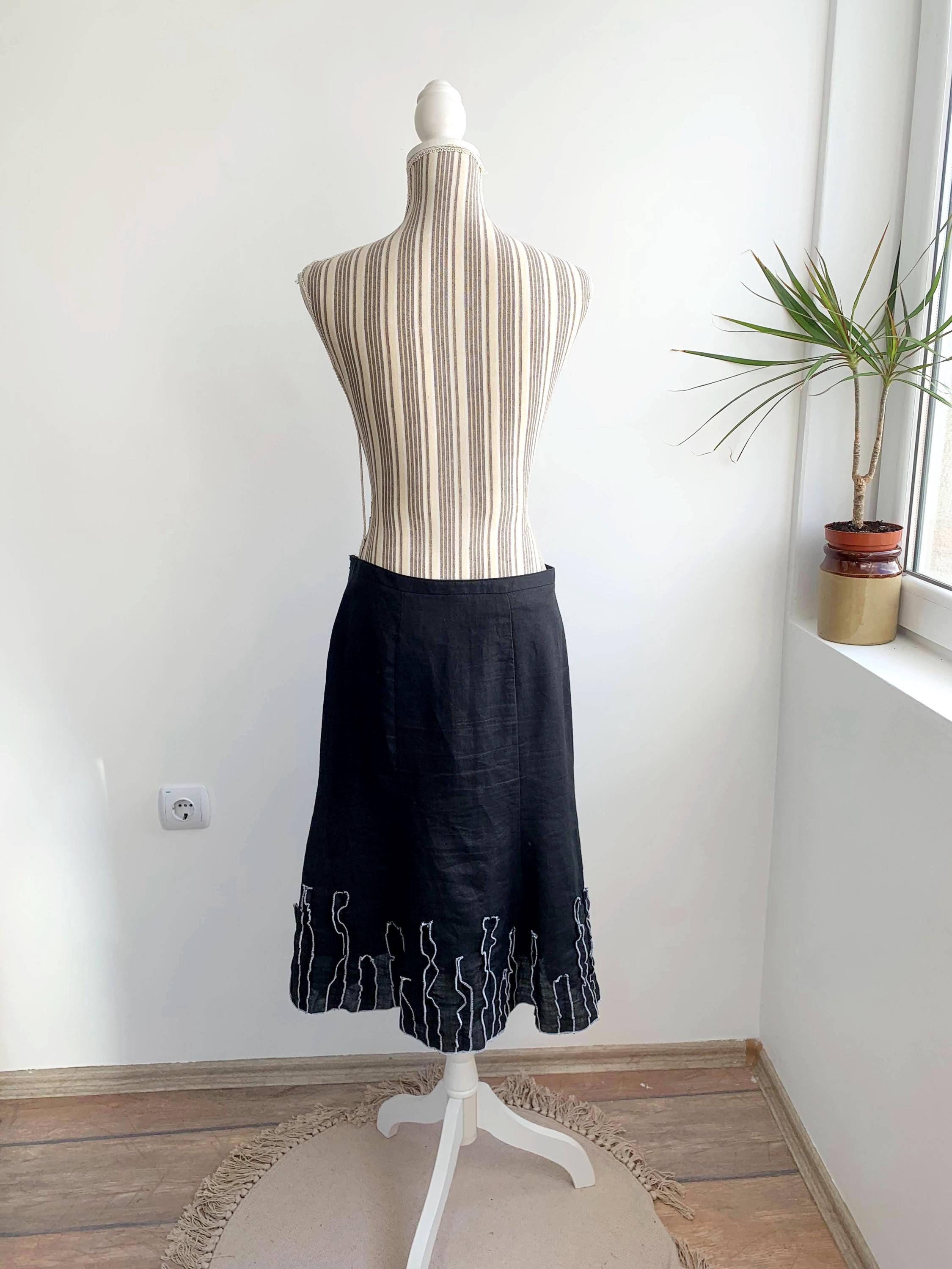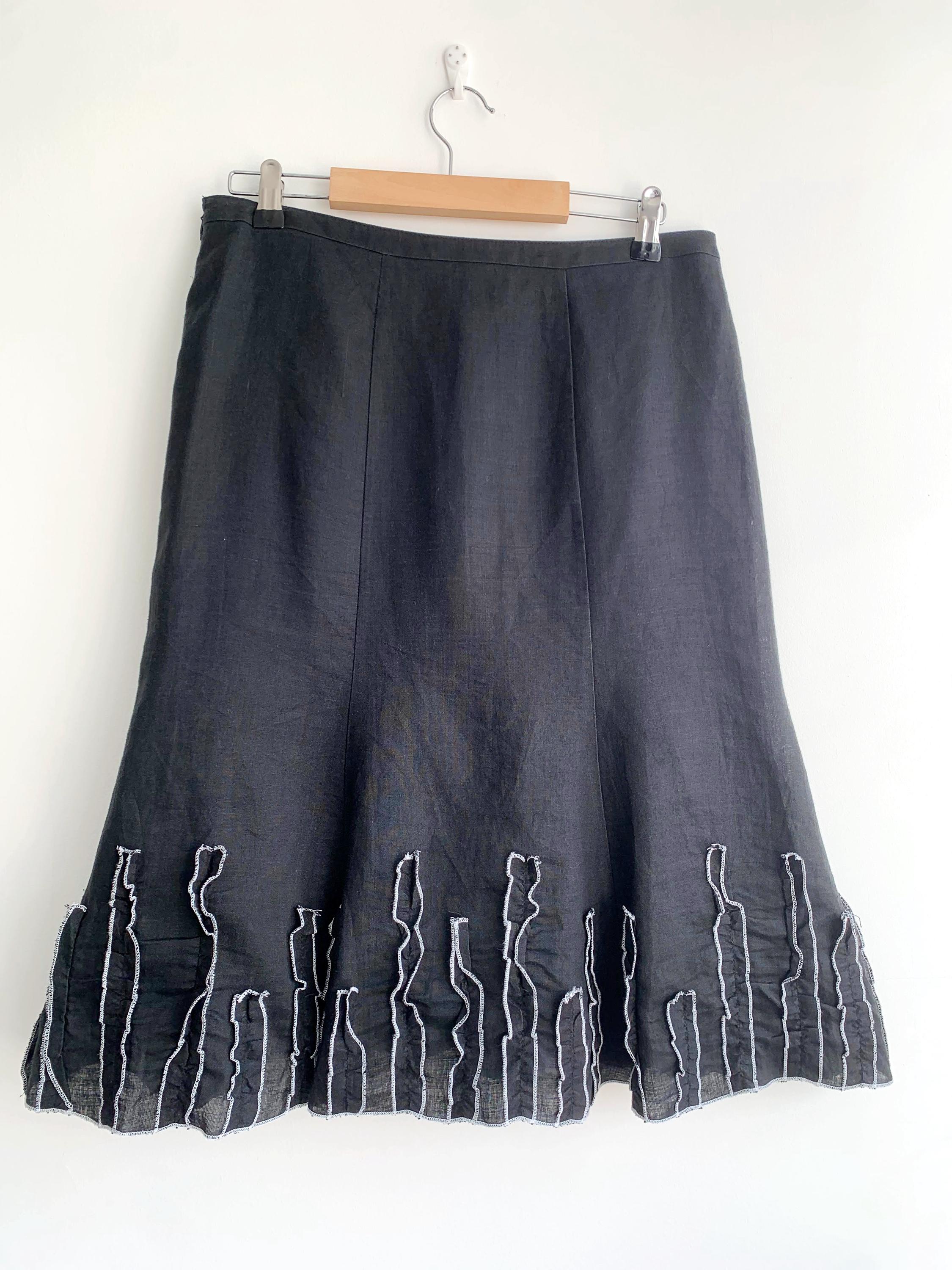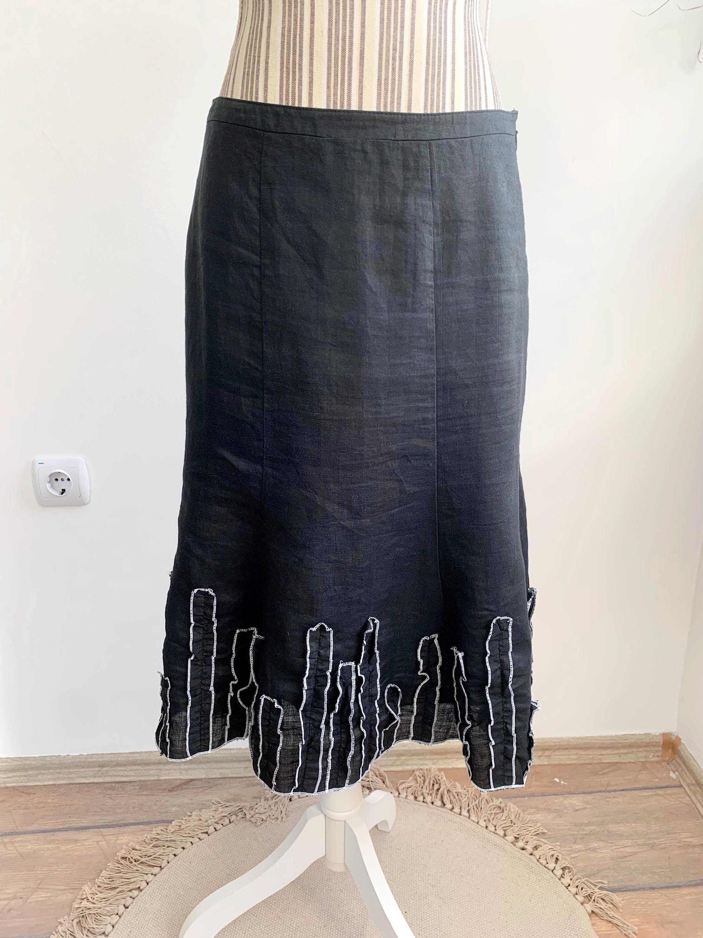 This is a vintage Y2K black below the knee pure linen skirt with flared bottom and ruffled detailing. This linen midi skirt has side zip and button closure and pure cotton lining.