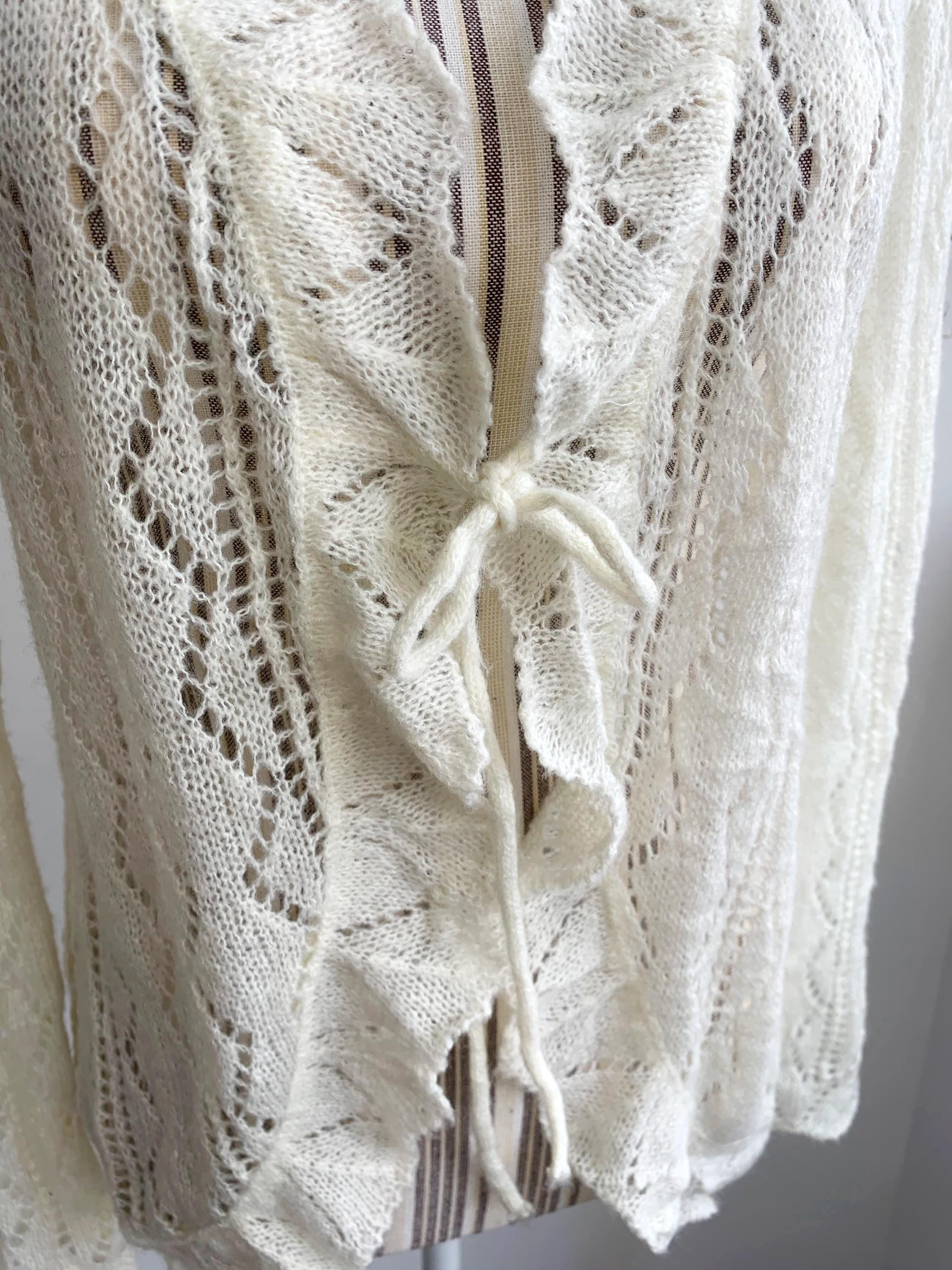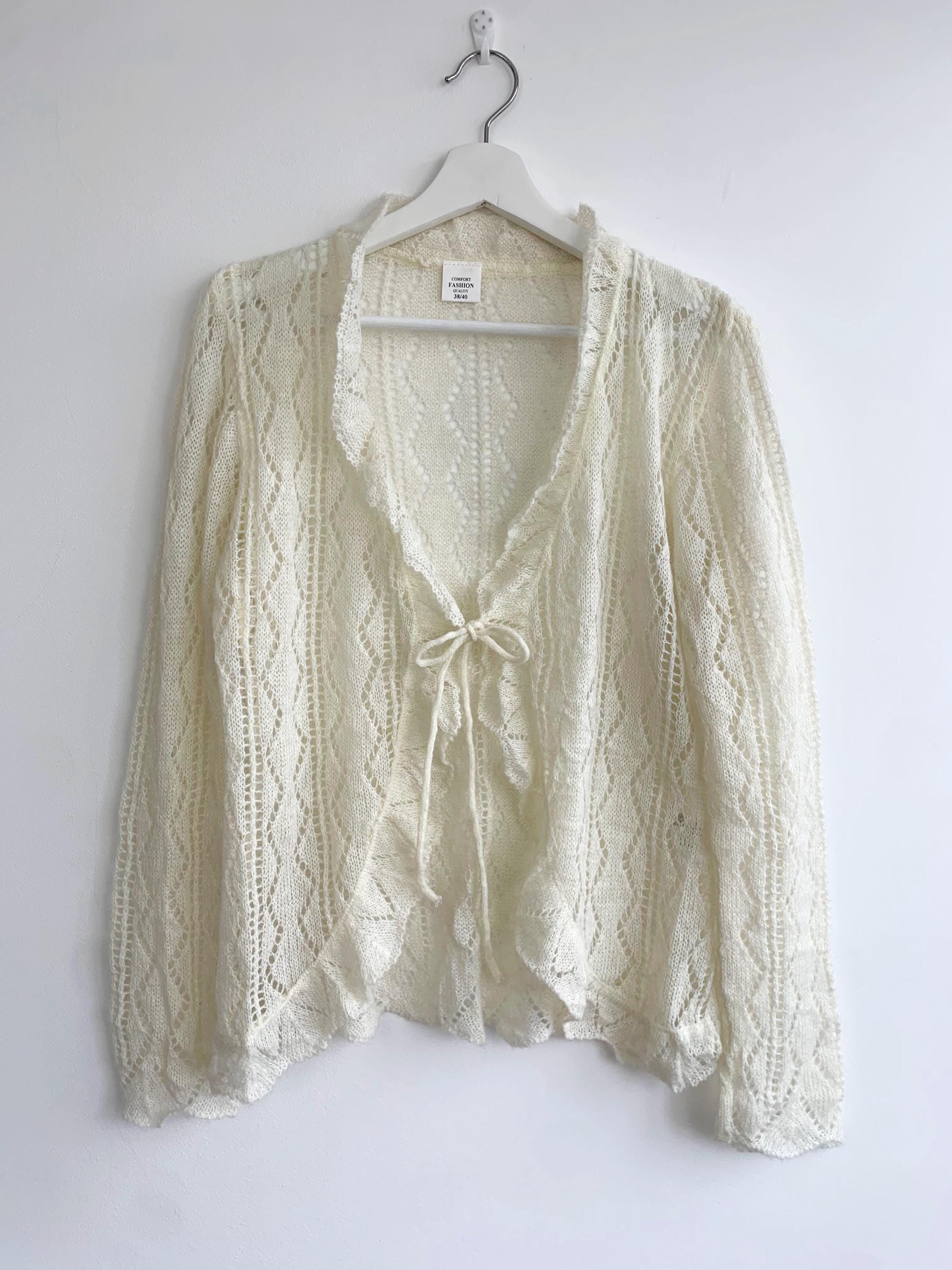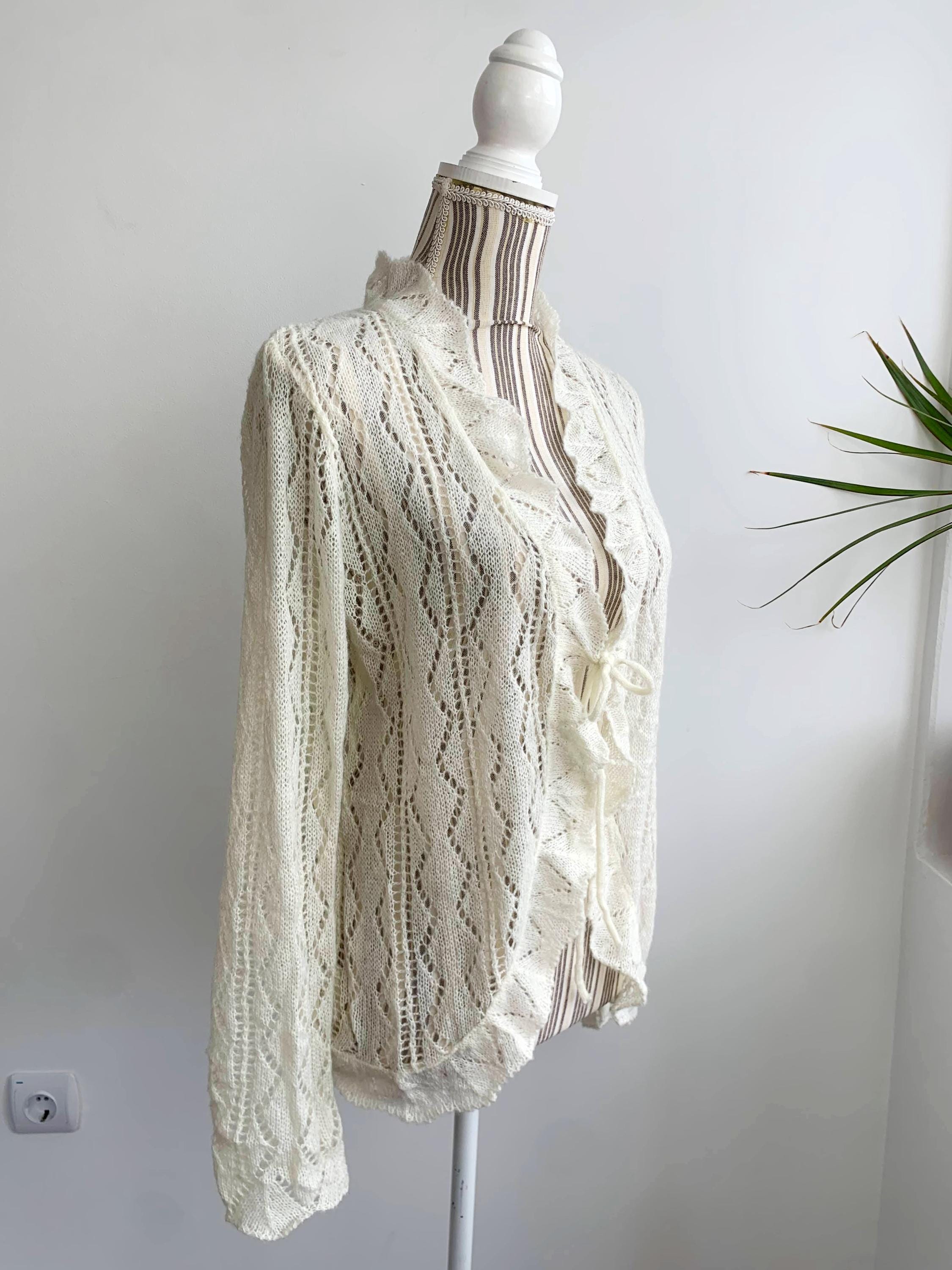 Check out this gorgeous vintage off white openwork cardigan with tie front closure, ruffled collared neckline and long sleeves. This sheer mesh cardigan has a lace fishnet pattern, perfect for layering for the spring/ fall season. Adorable vintage gift for her.