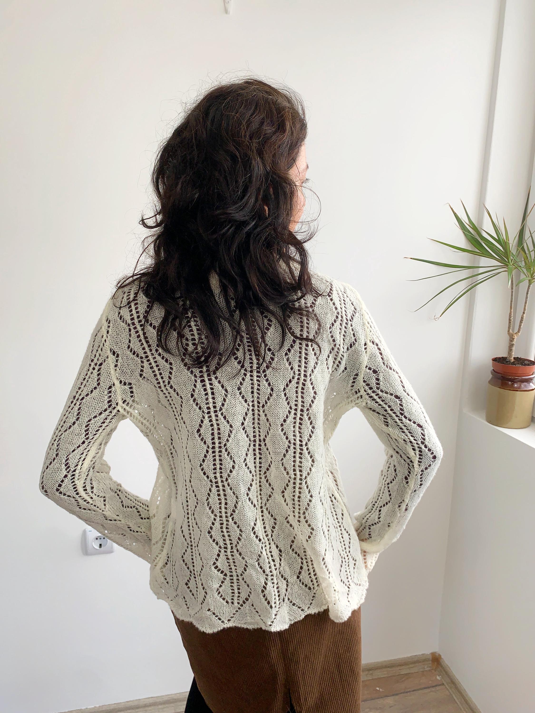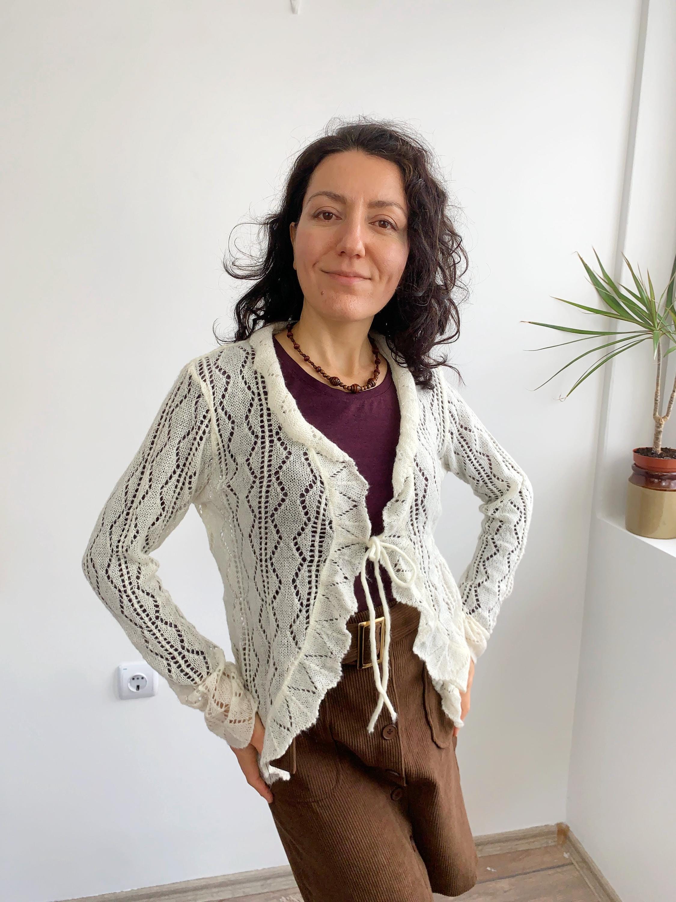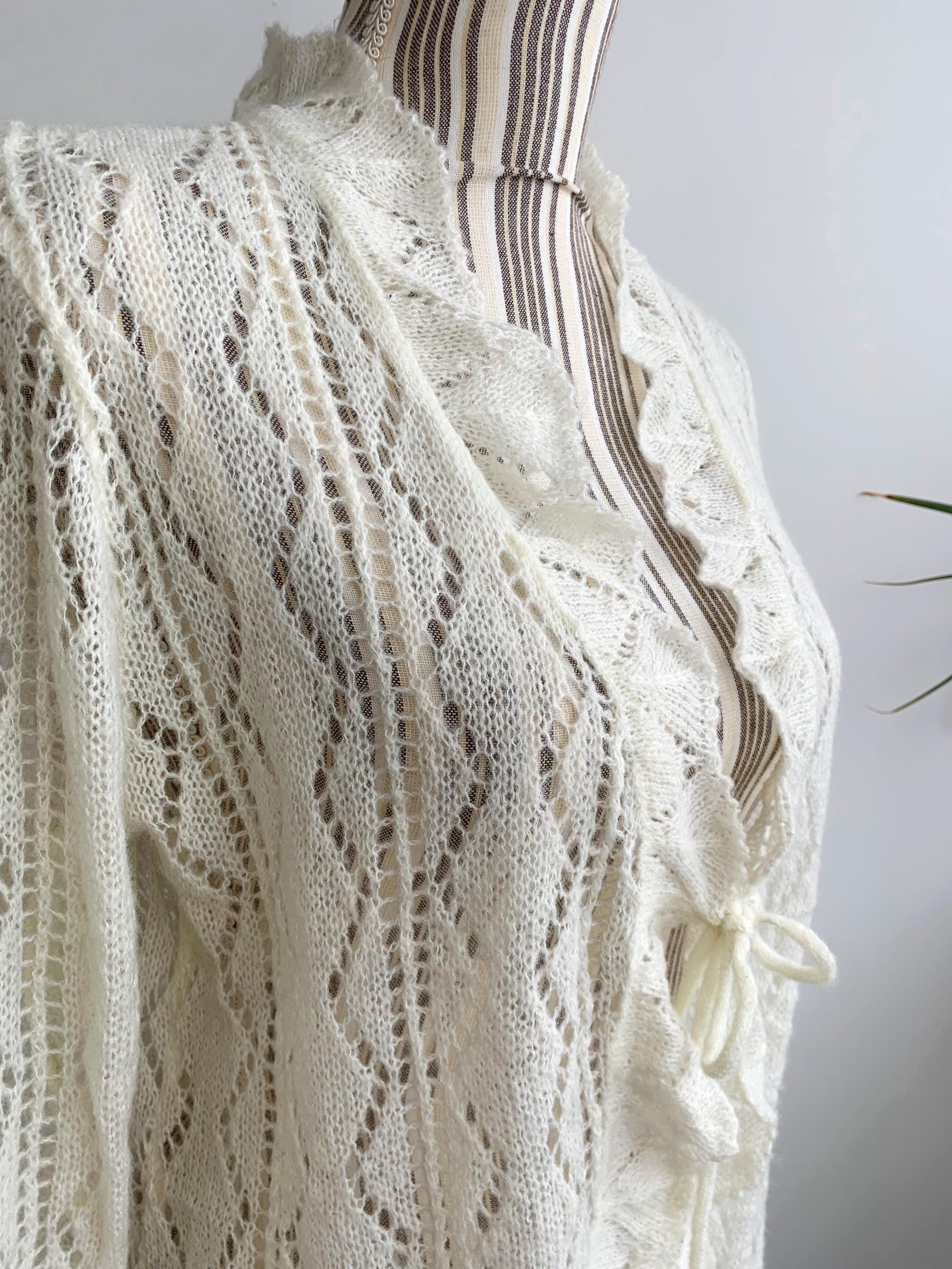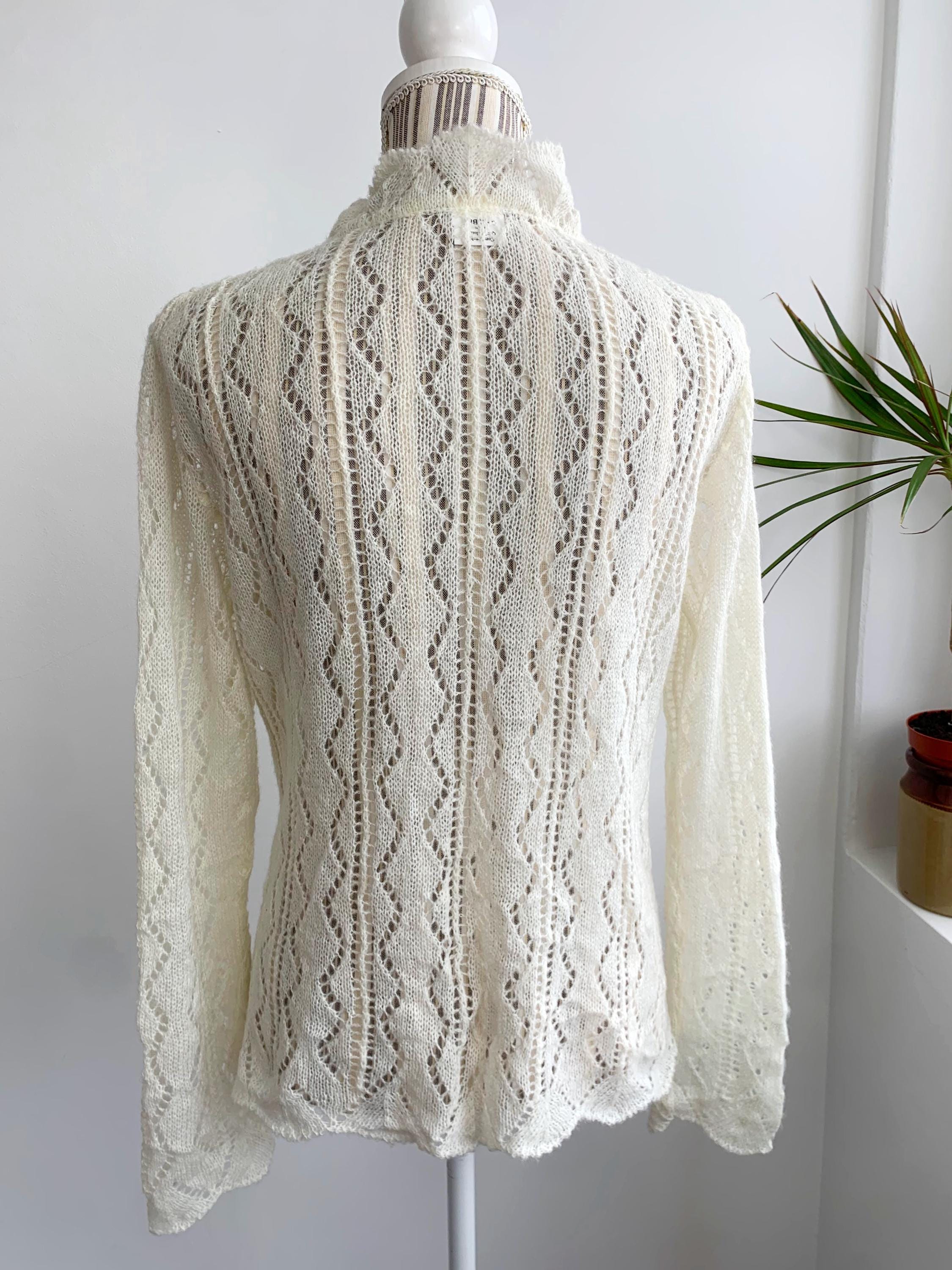 Check out this gorgeous vintage off white openwork cardigan with tie front closure, ruffled collared neckline and long sleeves. This sheer mesh cardigan has a lace fishnet pattern, perfect for layering for the spring/ fall season. Adorable vintage gift for her.