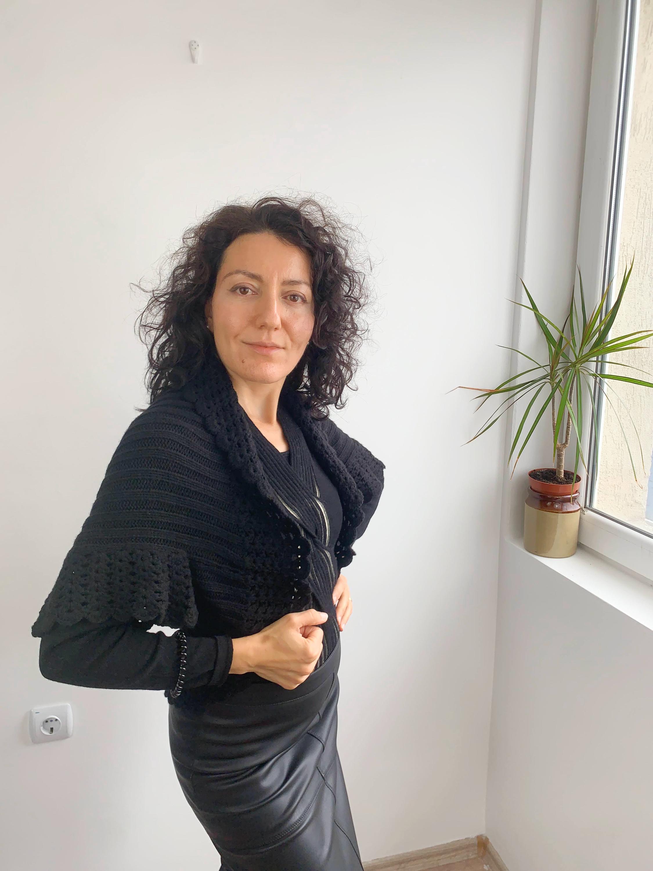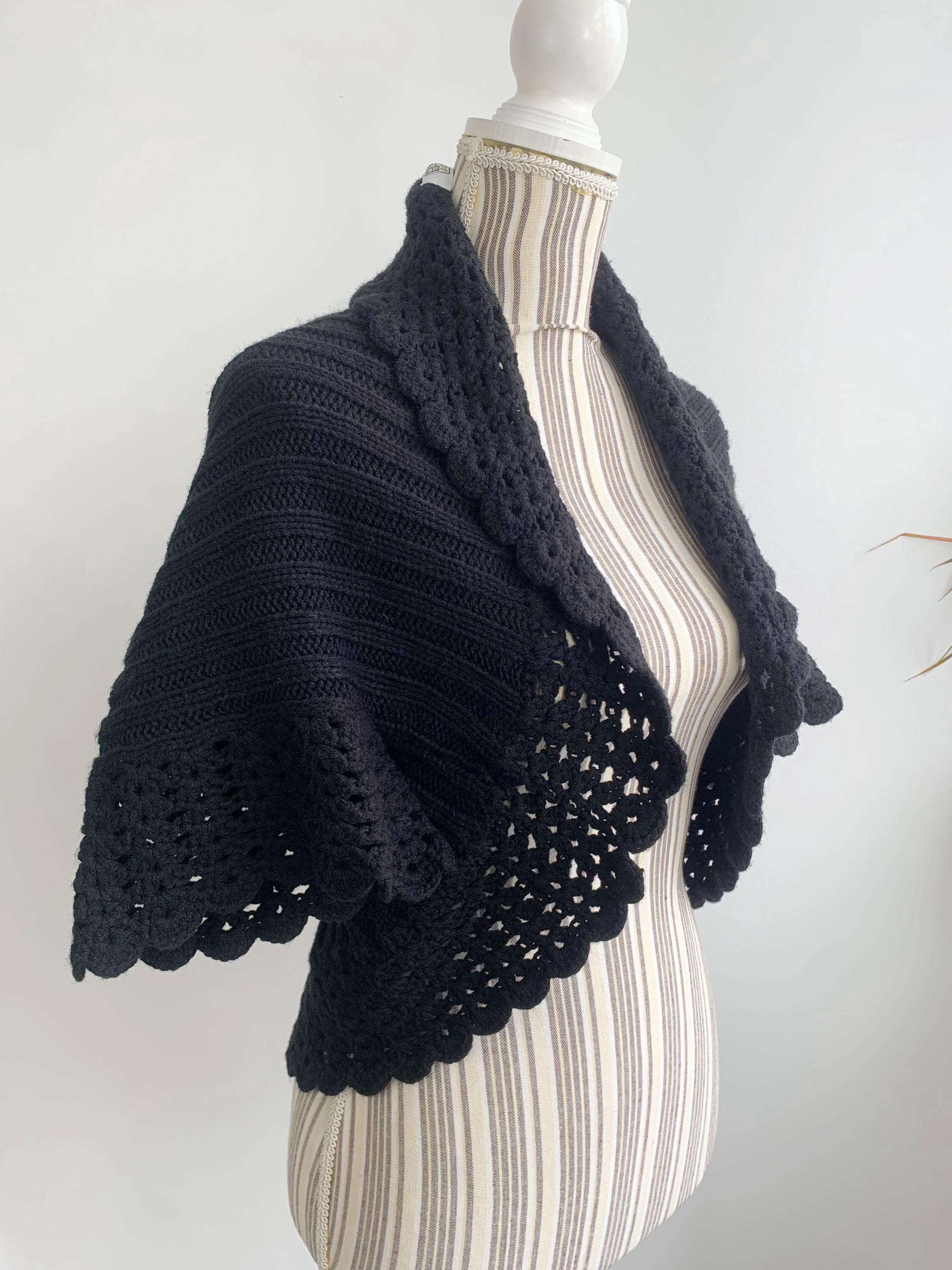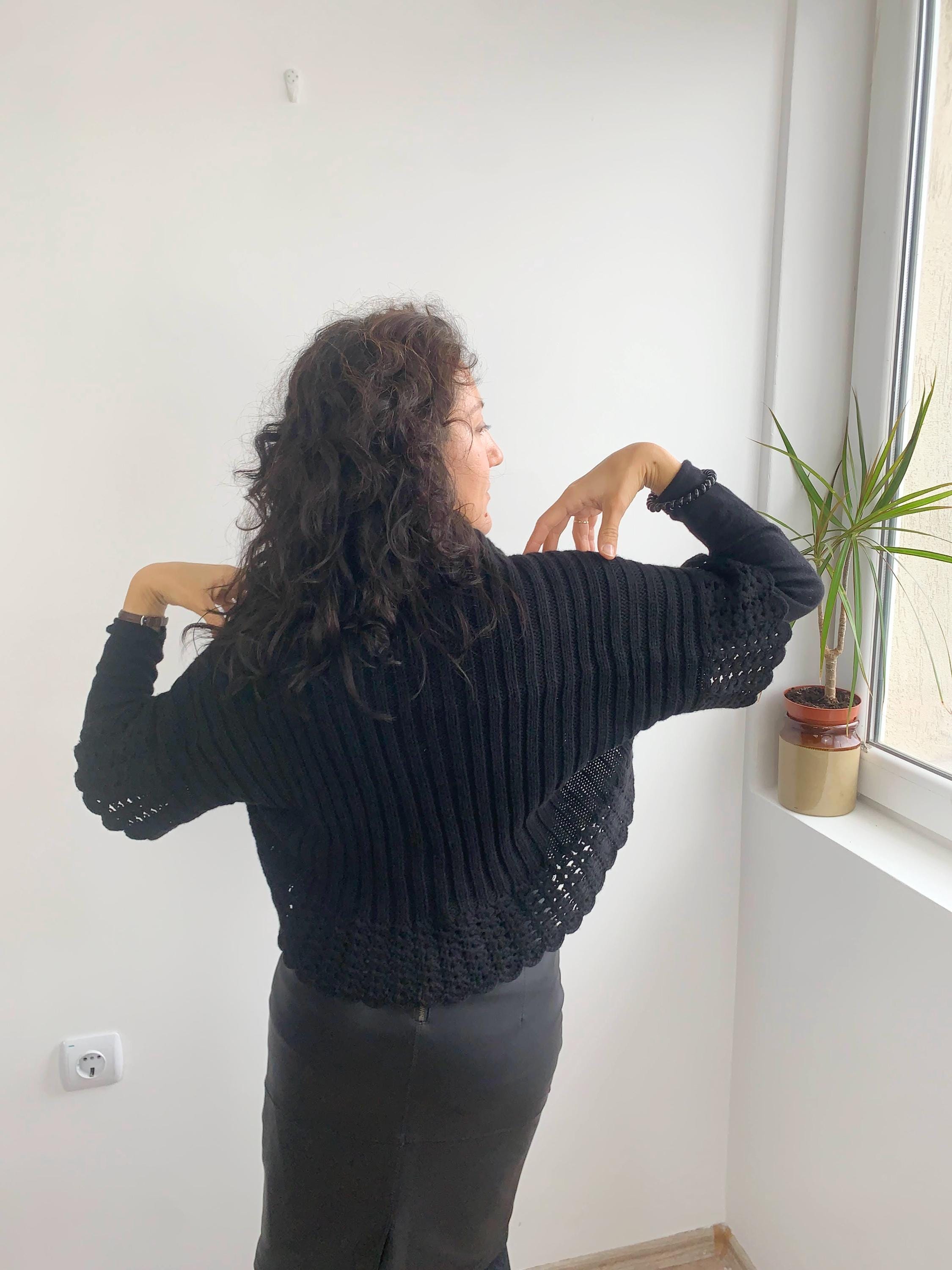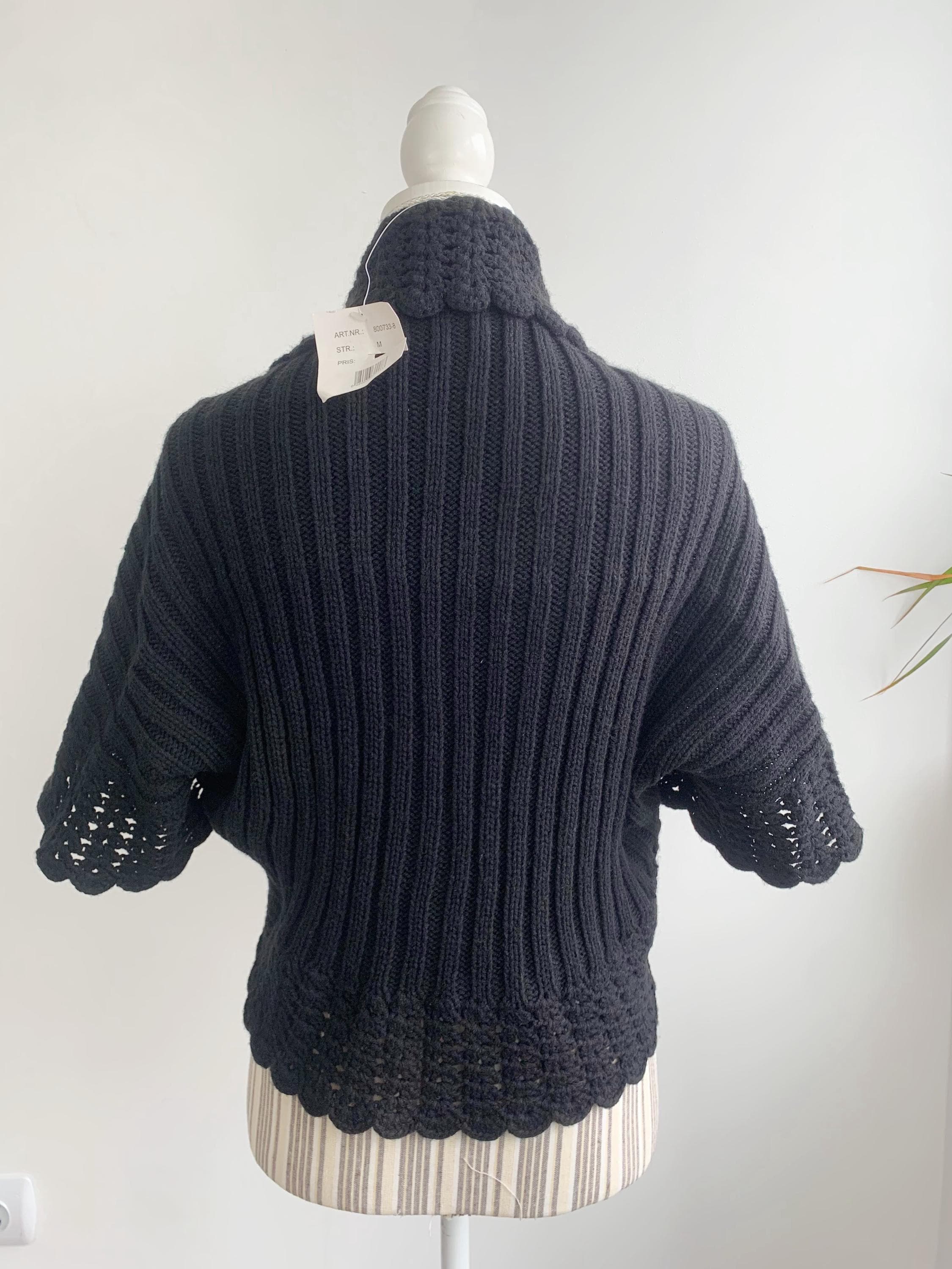 This is a pretty black knitted cardigan with delicate crochet lace short sleeves and collar. This open front cardigan top is made of soft acrylic yarn in black color. This gorgeous vintage bolero cover up would best fit size S M (size M is marked). It does have a bit of stretch