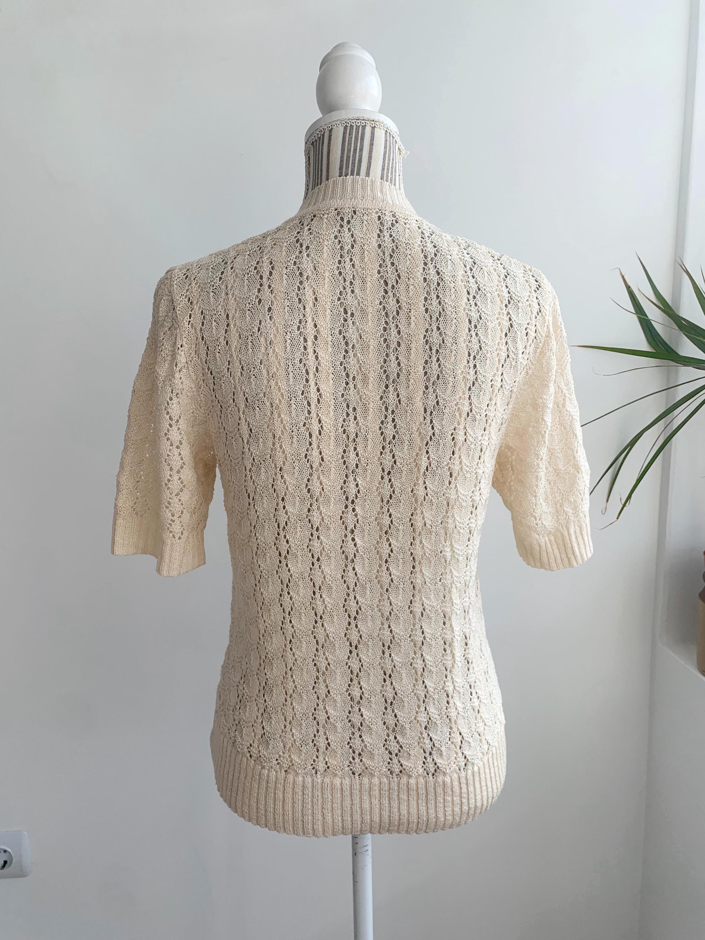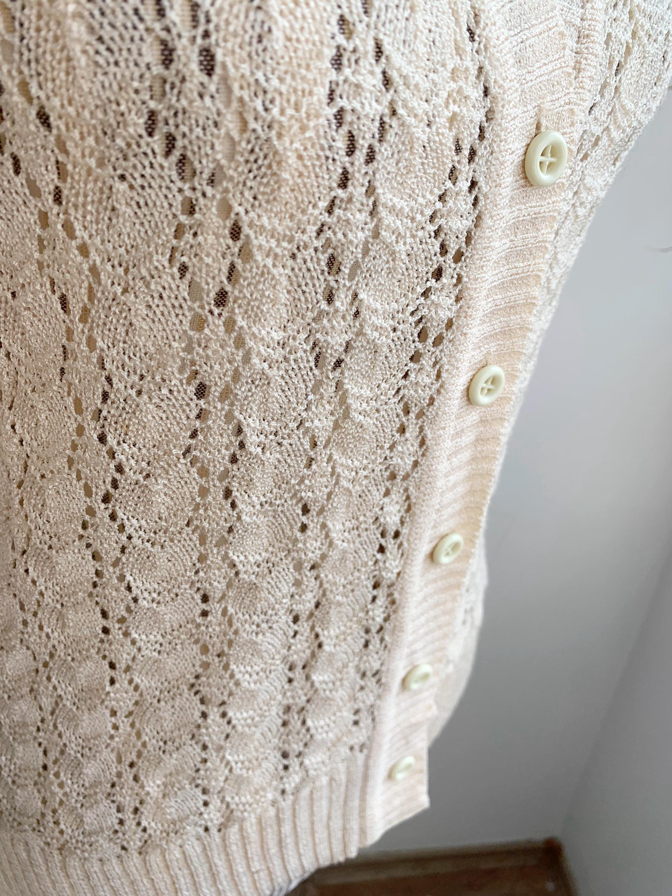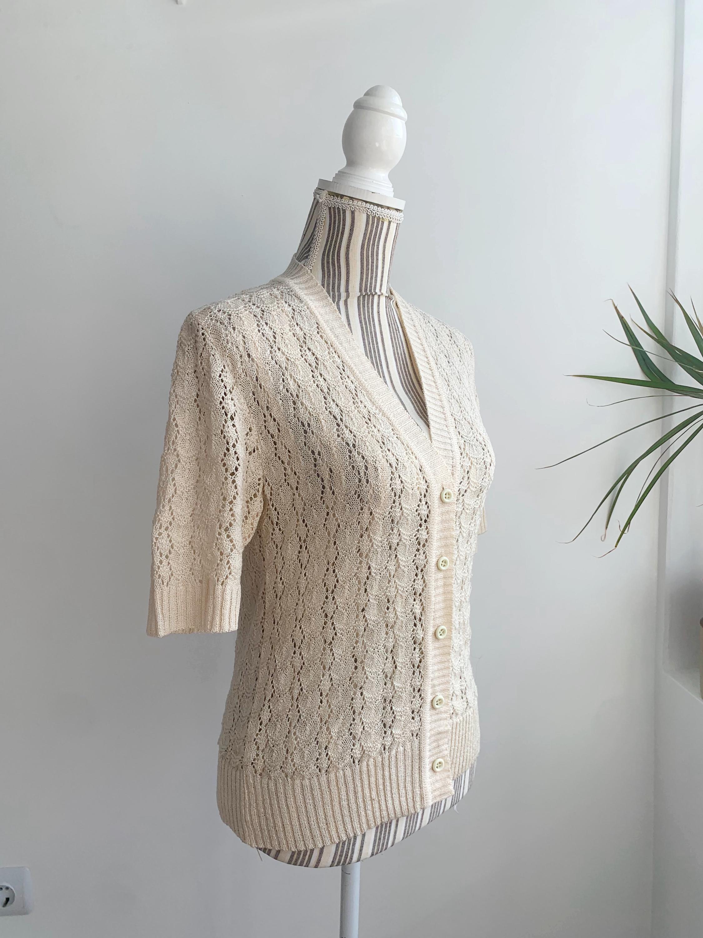 This is a beautiful vintage 80s romantic knitted lace cardigan with short sleeves, v neck, button front closure which fits like size S. This off white lace cardigan has a fitted silhouette and very delicate romantic vibe. Please check the measurements below.