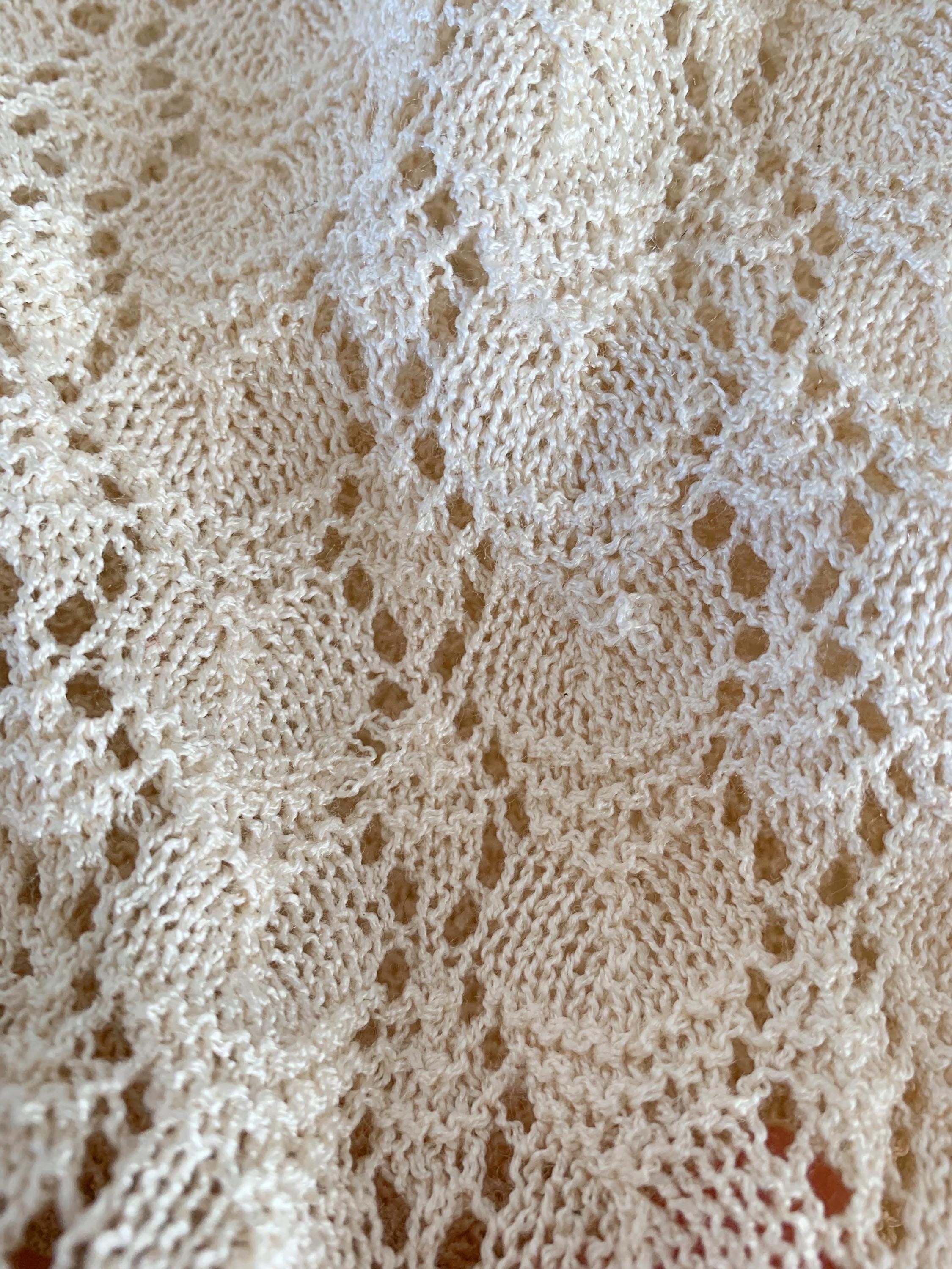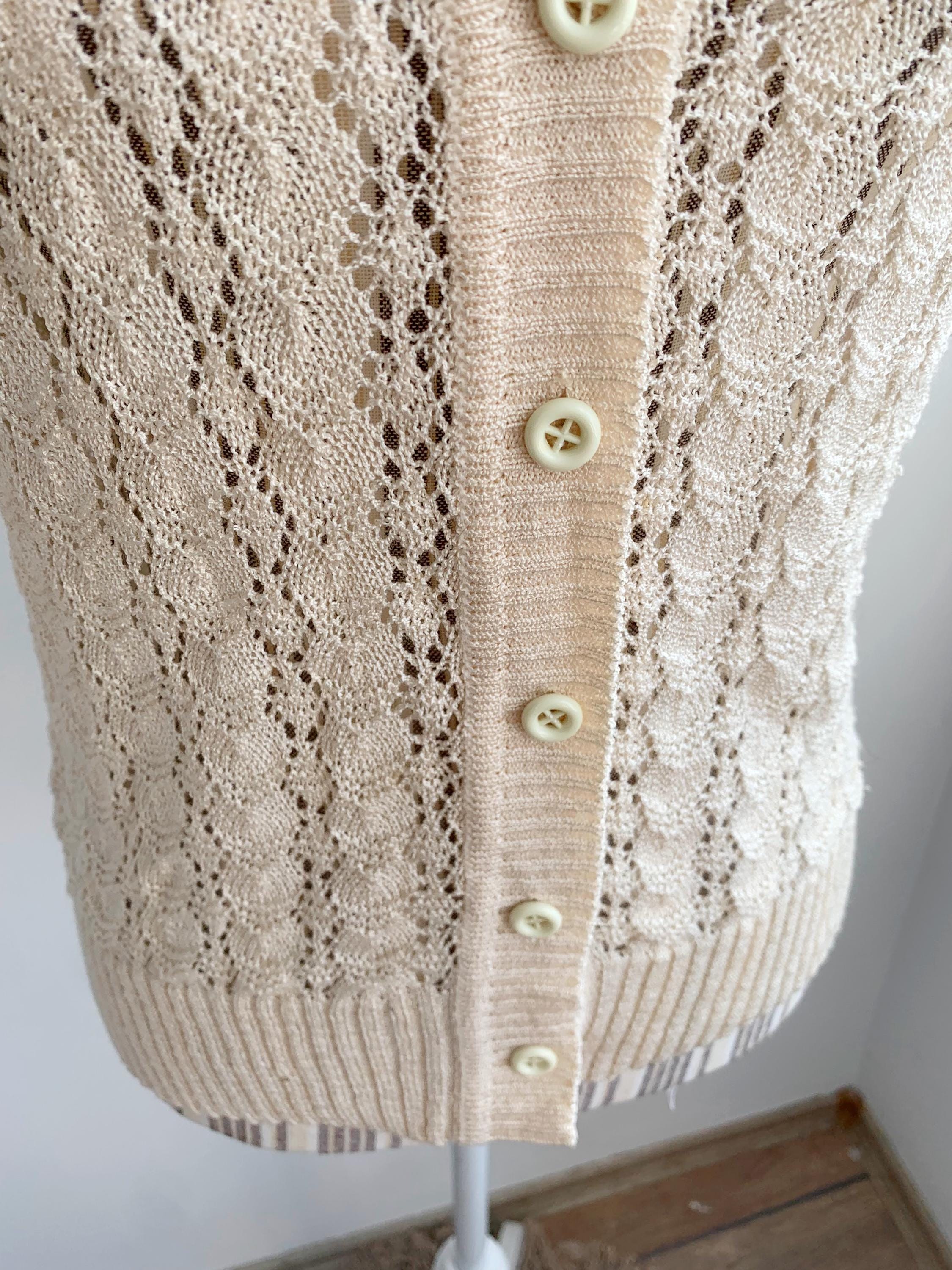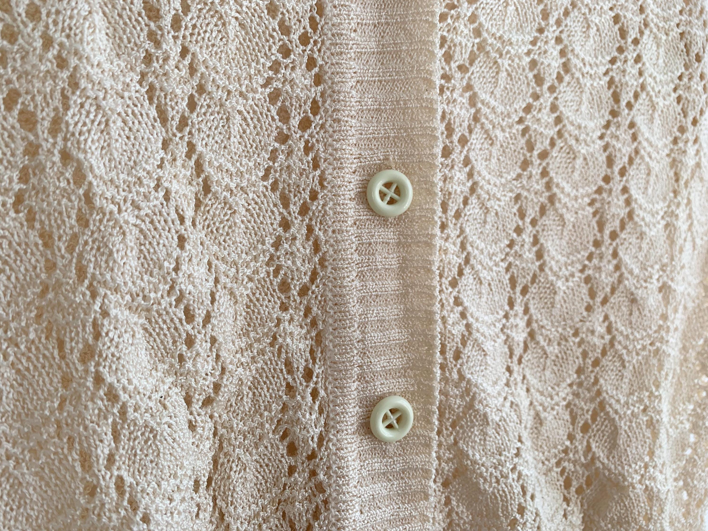 This is a beautiful vintage 80s romantic knitted lace cardigan with short sleeves, v neck, button front closure which fits like size S. This off white lace cardigan has a fitted silhouette and very delicate romantic vibe. Please check the measurements below.