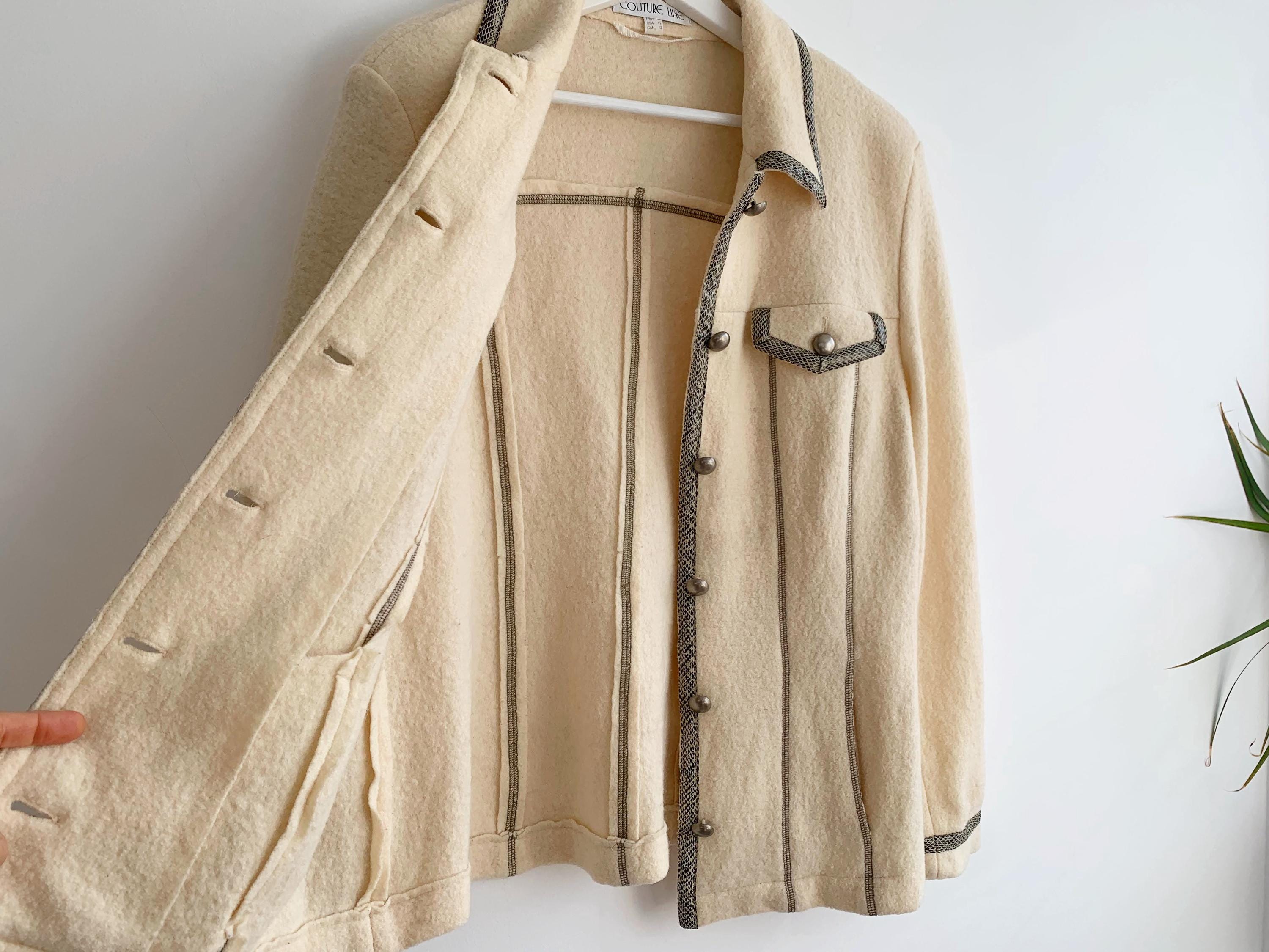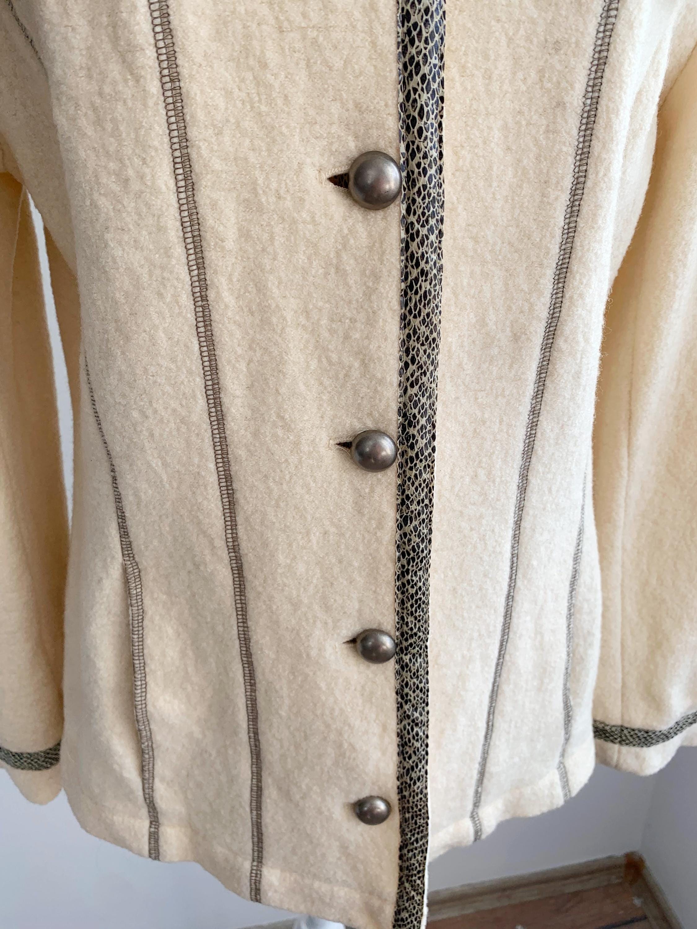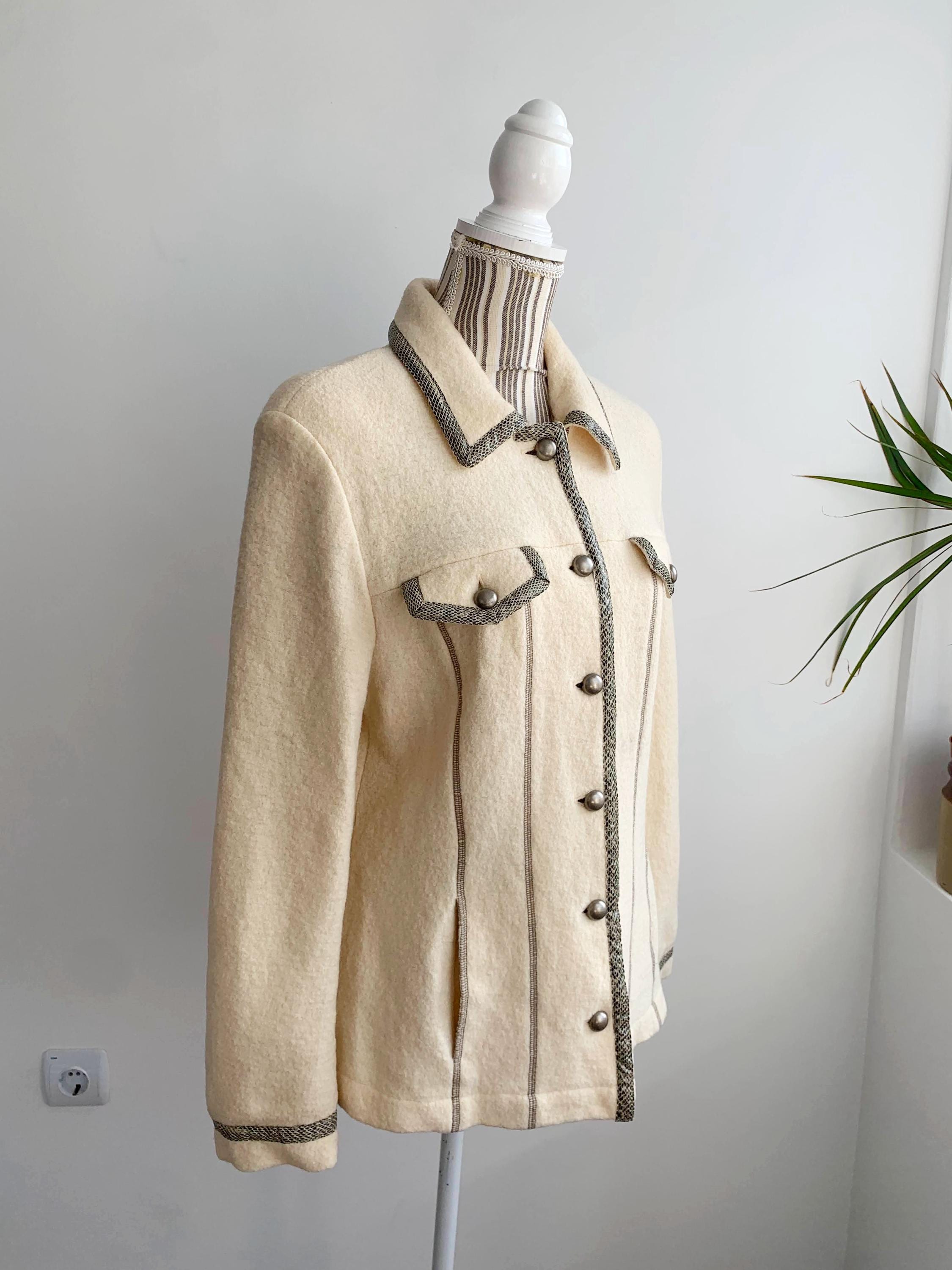This is s beautiful vintage 90s ecru pure wool blazer for women with collar, button front closure and two side pockets. This unlined wool blazer is perfect for the spring and autumn seasons. This short wool coat is made of 100% wool fabric, super soft and cozy. It has no lining underneath. This off white blazer has light shoulder pads. Cute snakeskin like trim at the edges. Fits like size L.