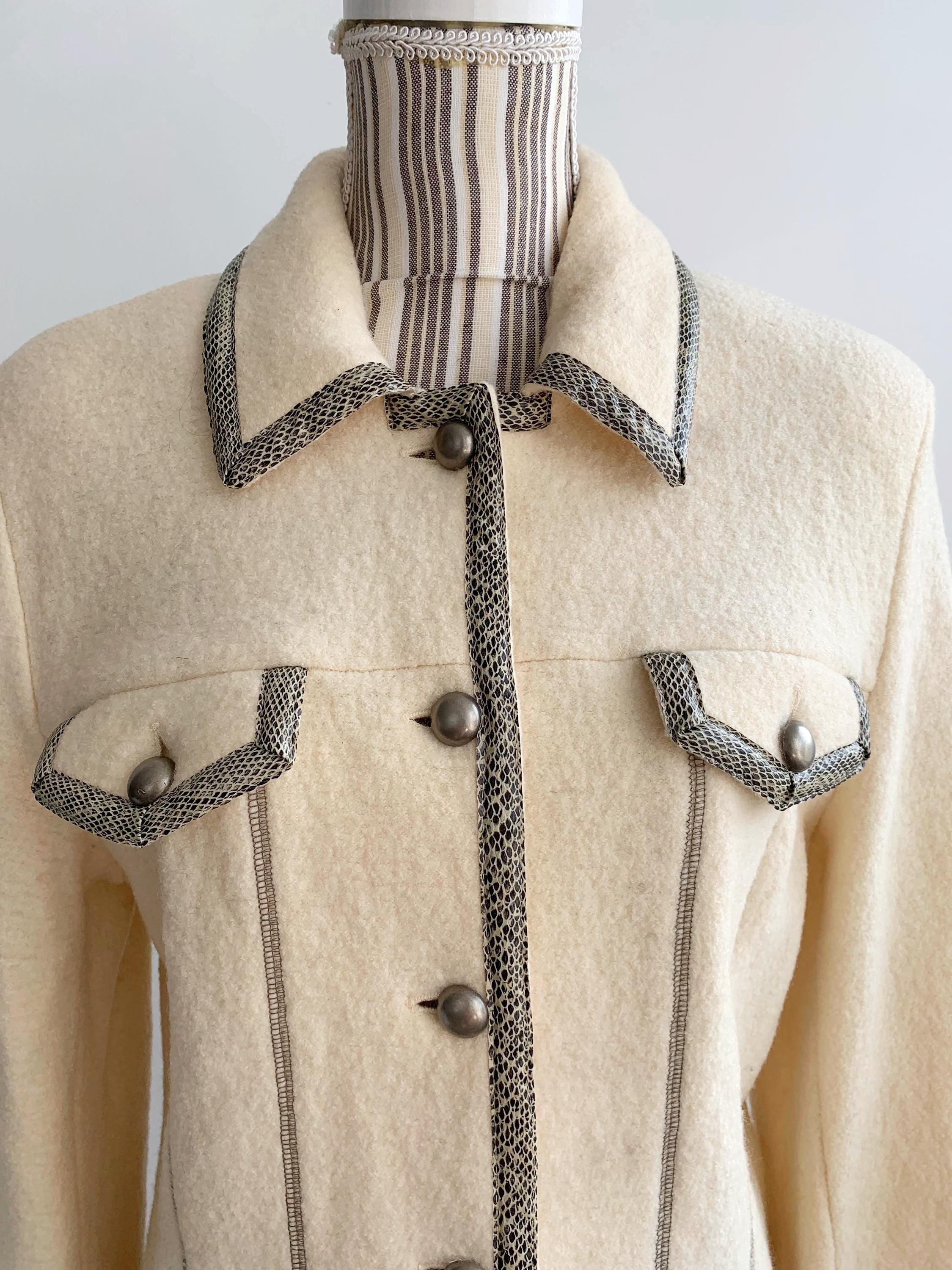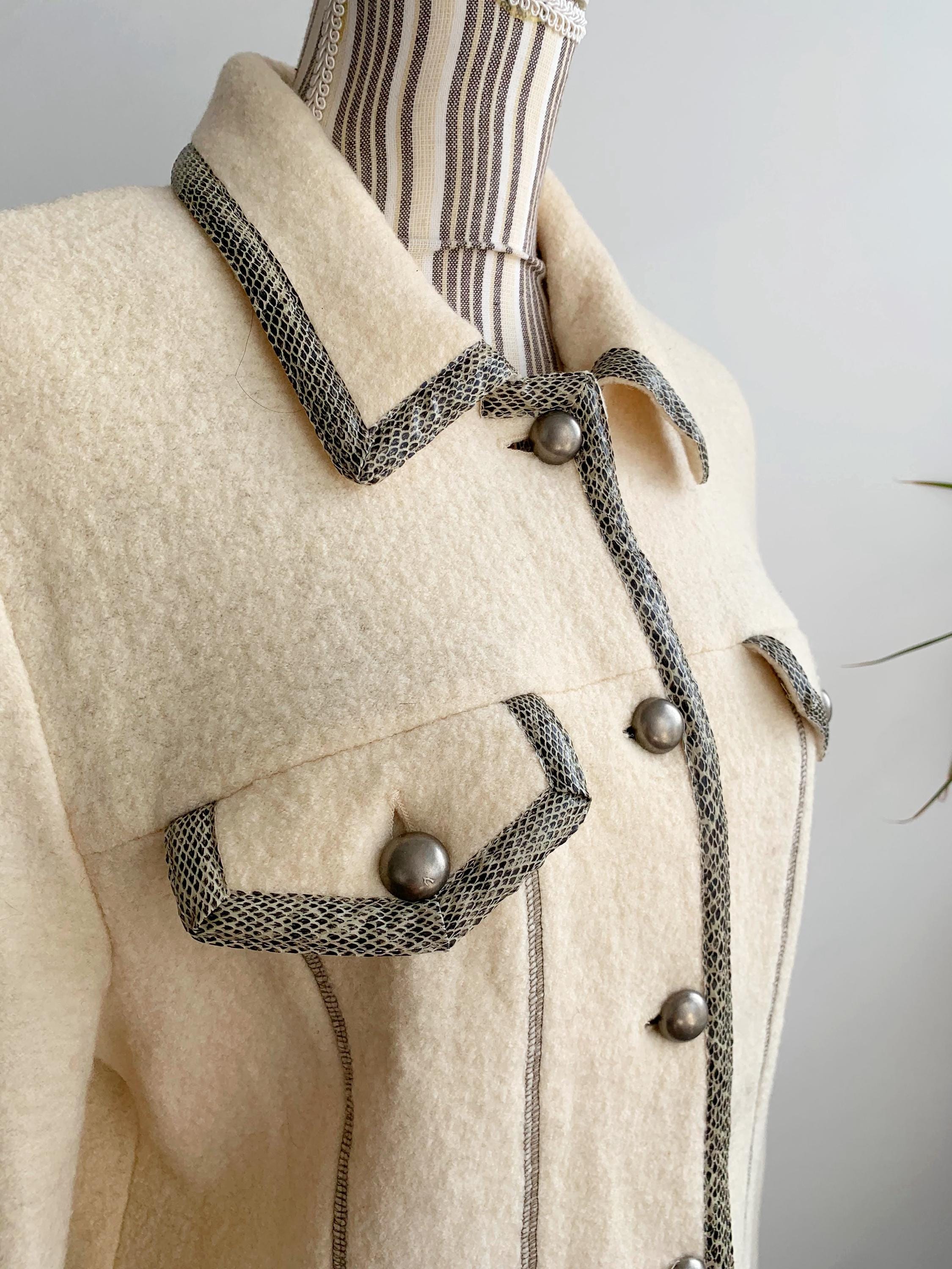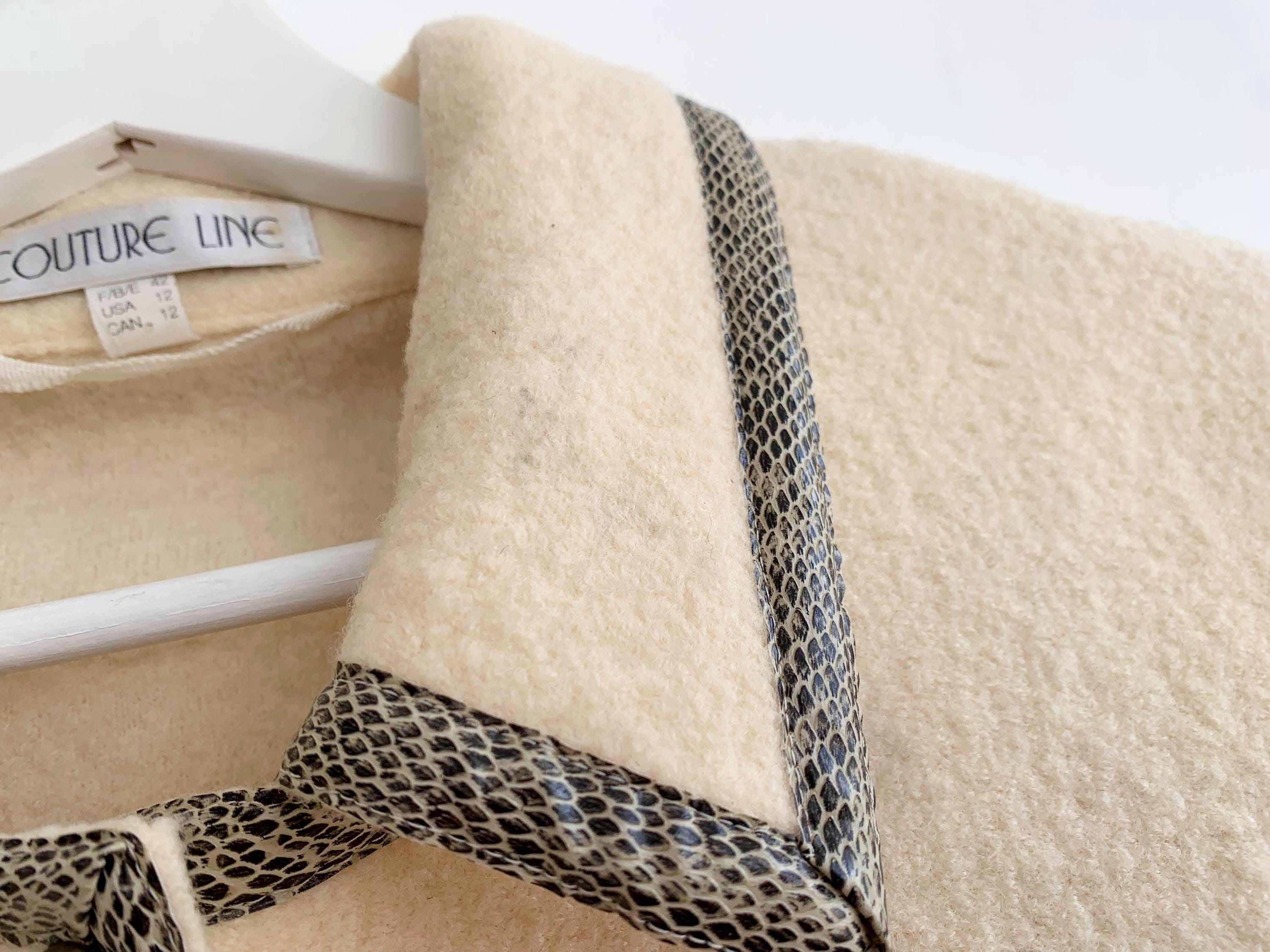 This is s beautiful vintage 90s ecru pure wool blazer for women with collar, button front closure and two side pockets. This unlined wool blazer is perfect for the spring and autumn seasons. This short wool coat is made of 100% wool fabric, super soft and cozy. It has no lining underneath. This off white blazer has light shoulder pads. Cute snakeskin like trim at the edges. Fits like size L.