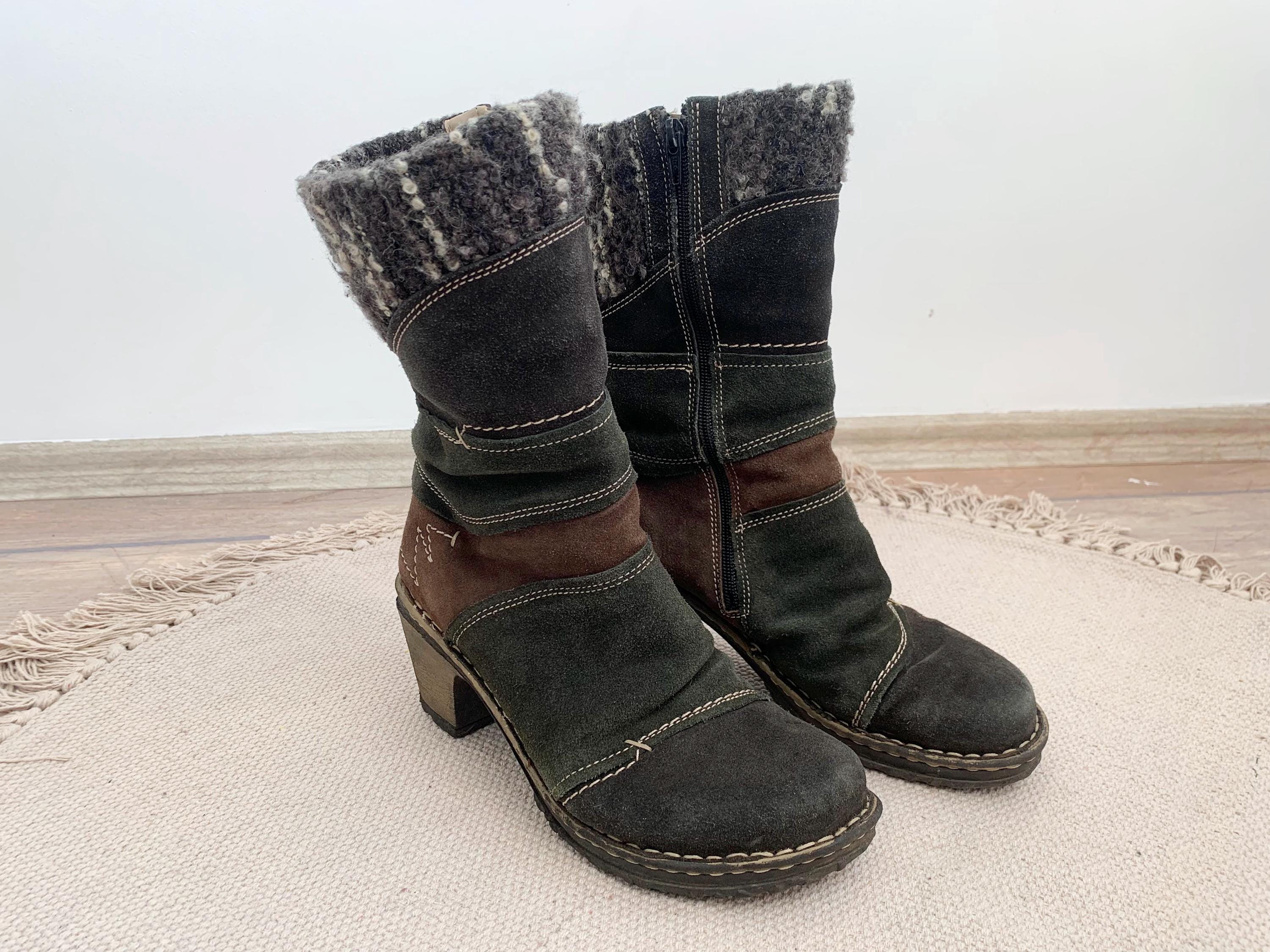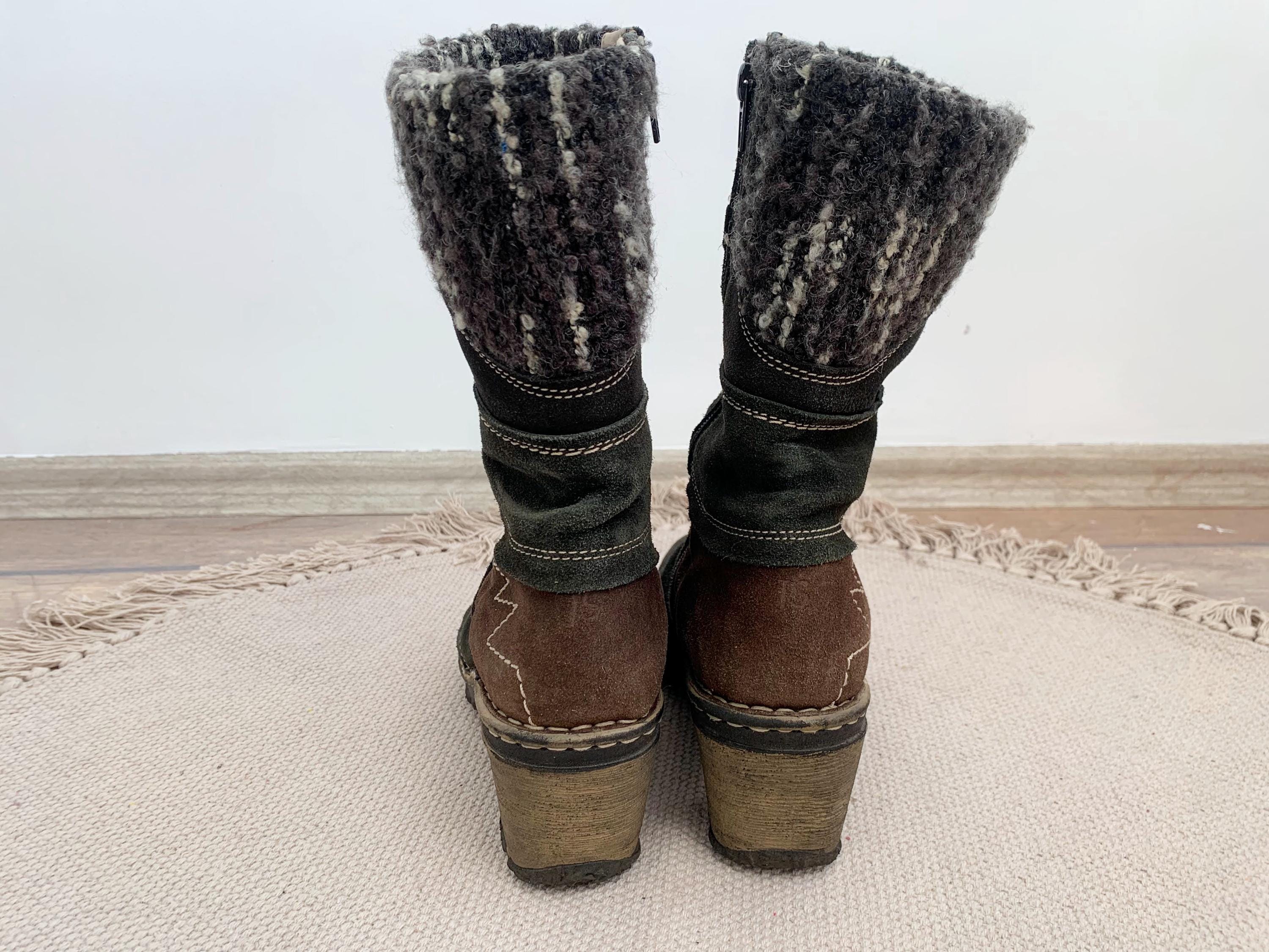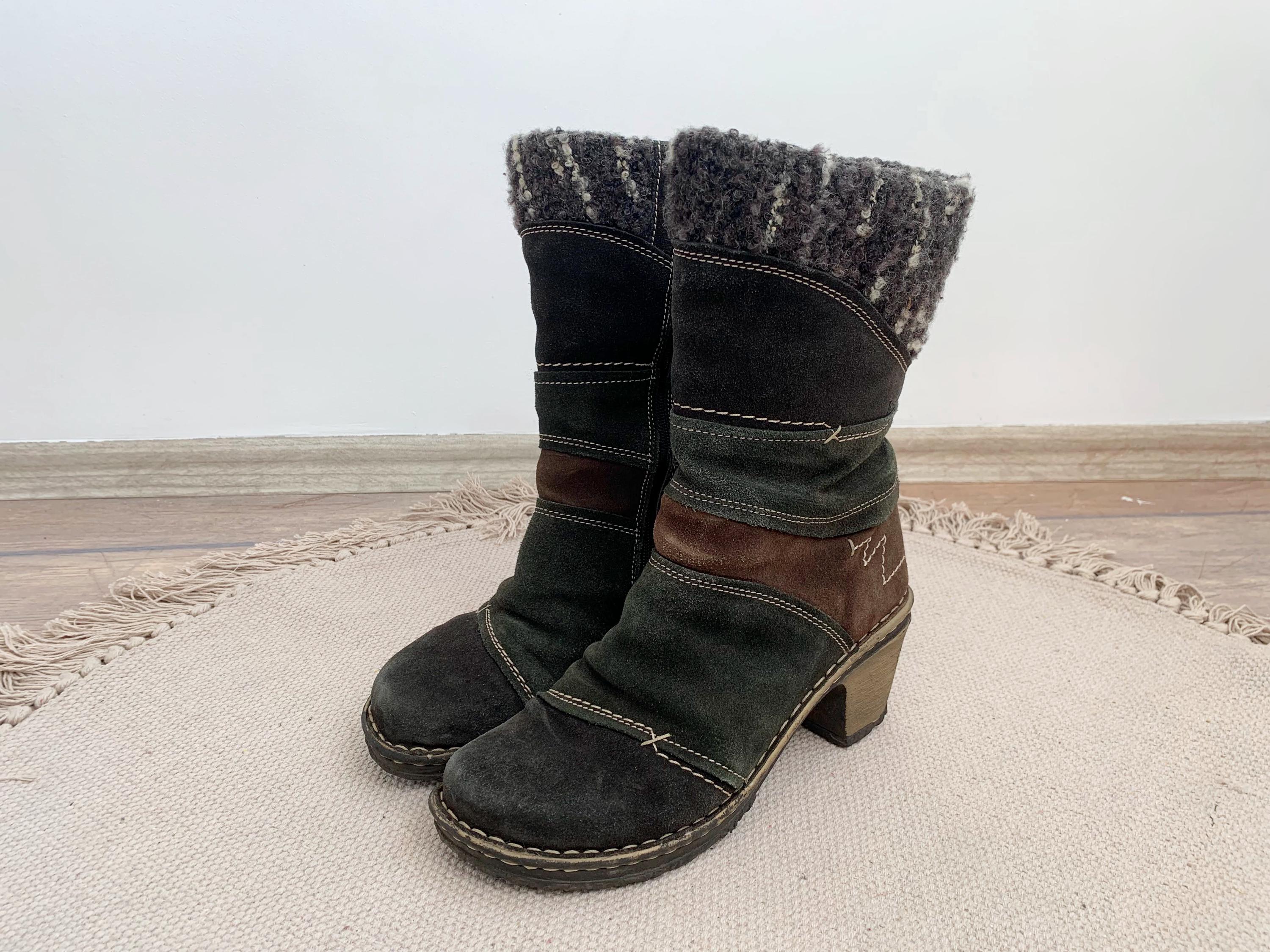 These are vintage Y2K Joseph Seibel distressed suede leather boots for women with chunky platform rubber non slip sole and comfortable heels. These chunky leather boots are made of thick genuine suede leather in shades of black and brown color with soft fluffy knitted cuffs at the top and warm lining with side zip closure. These ankle boots are super comfortable to wear with their wide toe box. These leather snow boots have warm lining so they will keep your feet warm in the cold days. These ankle boots have wide toe box for extra comfort. The size marked is EUR 39, they fit like UK 5.5, US 8. Please check the measurements below.