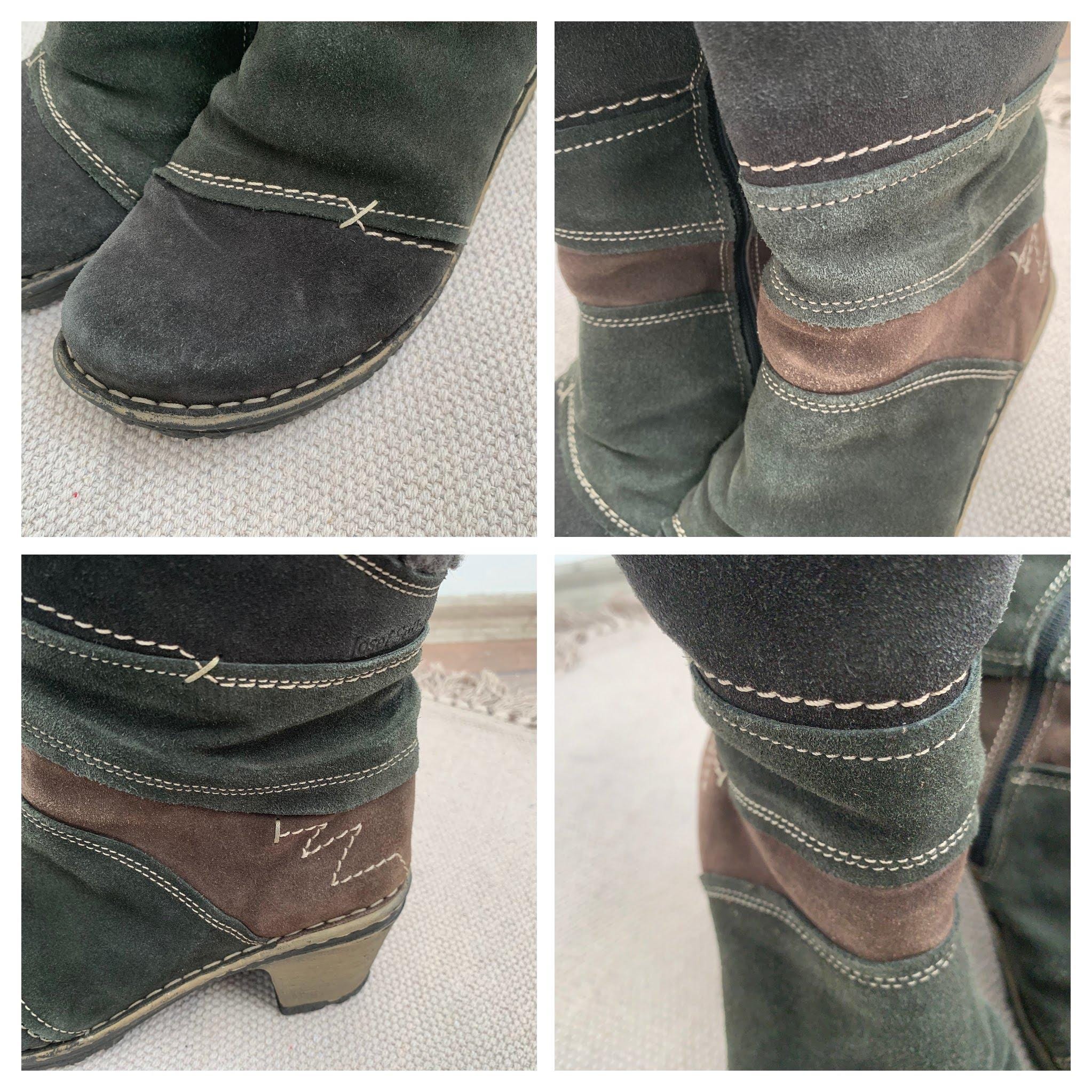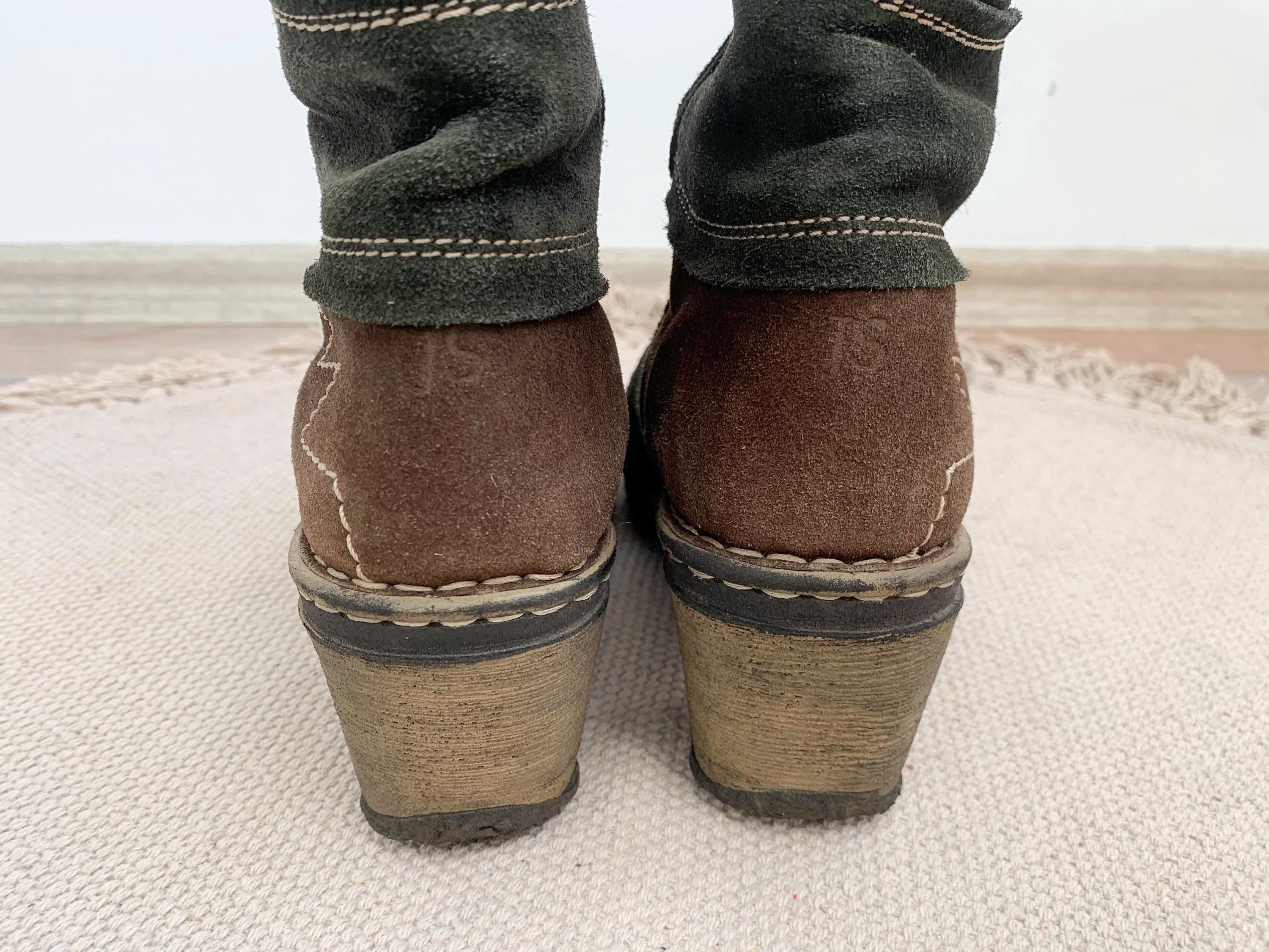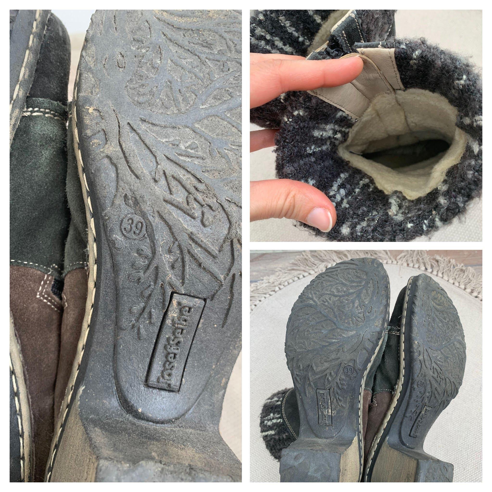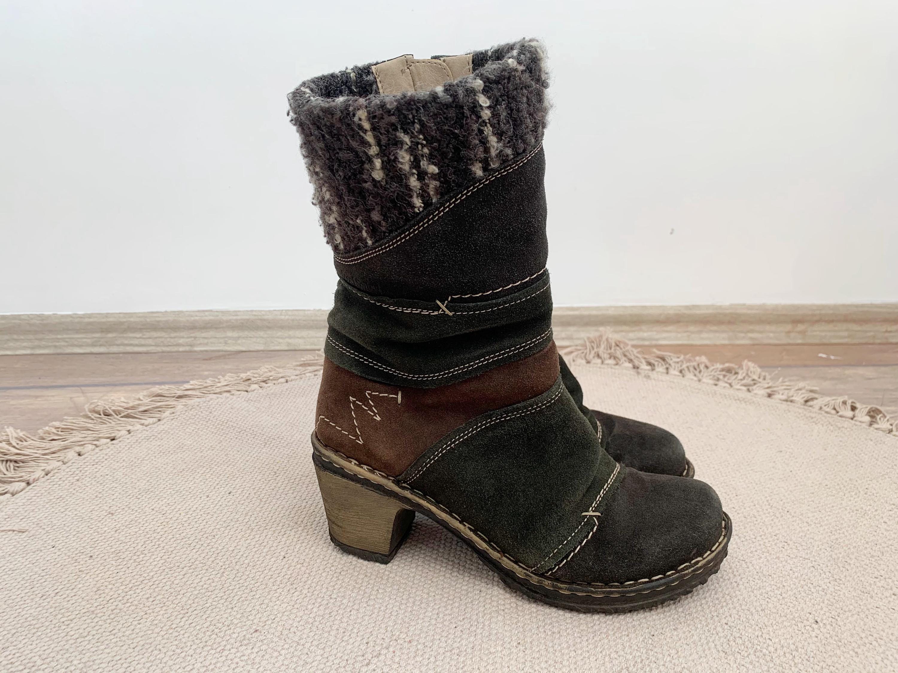 These are vintage Y2K Joseph Seibel distressed suede leather boots for women with chunky platform rubber non slip sole and comfortable heels. These chunky leather boots are made of thick genuine suede leather in shades of black and brown color with soft fluffy knitted cuffs at the top and warm lining with side zip closure. These ankle boots are super comfortable to wear with their wide toe box. These leather snow boots have warm lining so they will keep your feet warm in the cold days. These ankle boots have wide toe box for extra comfort. The size marked is EUR 39, they fit like UK 5.5, US 8. Please check the measurements below.