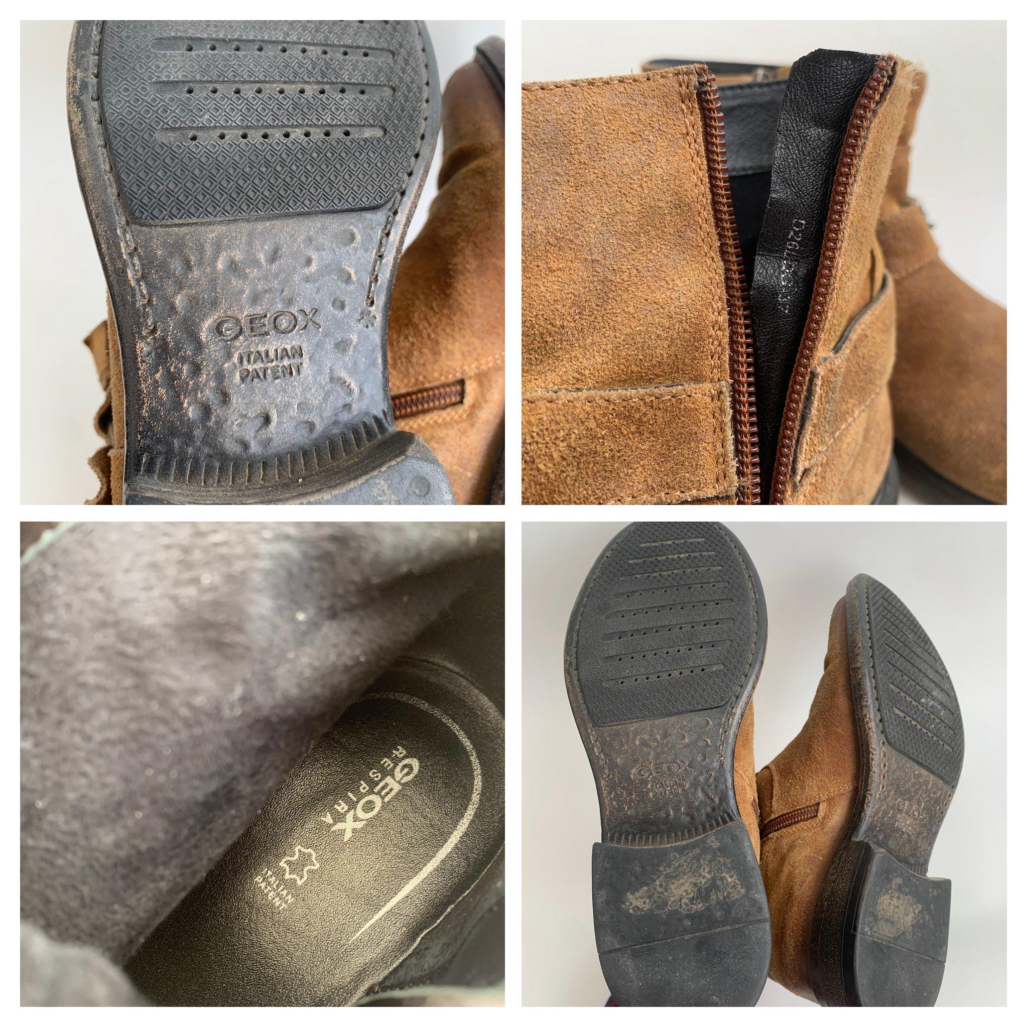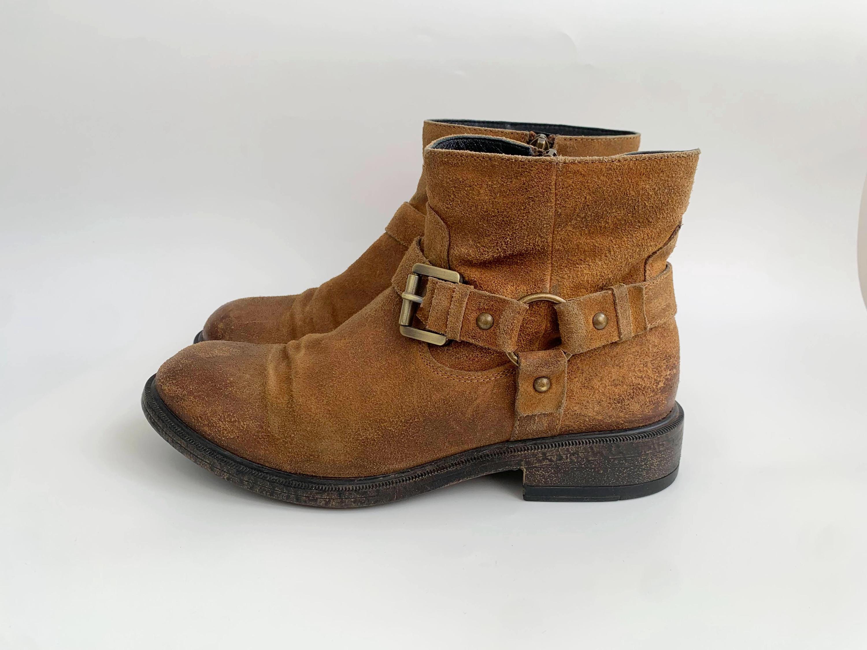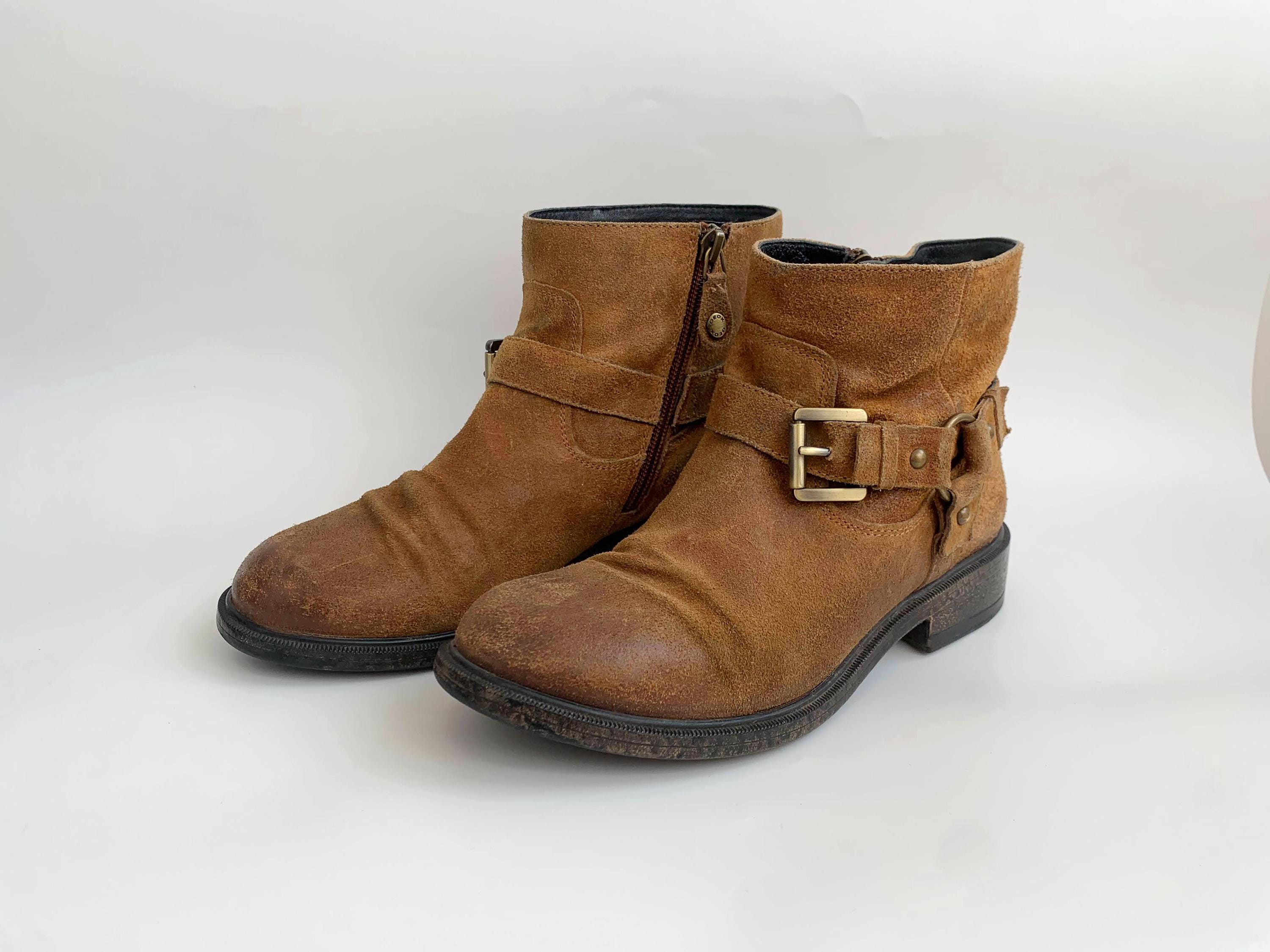 These are vintage low heel camel brown suede leather ankle boots for women with buckle detailing and side zip up closure by GEOX Respira. These western bohemian country flat leather boots are made of genuine suede leather and rubber sole. These low ankle boots have a heavily distressed look. These southwestern low suede boots are size EUR 37 women's shoe size, they fit like size UK 4, US 6.