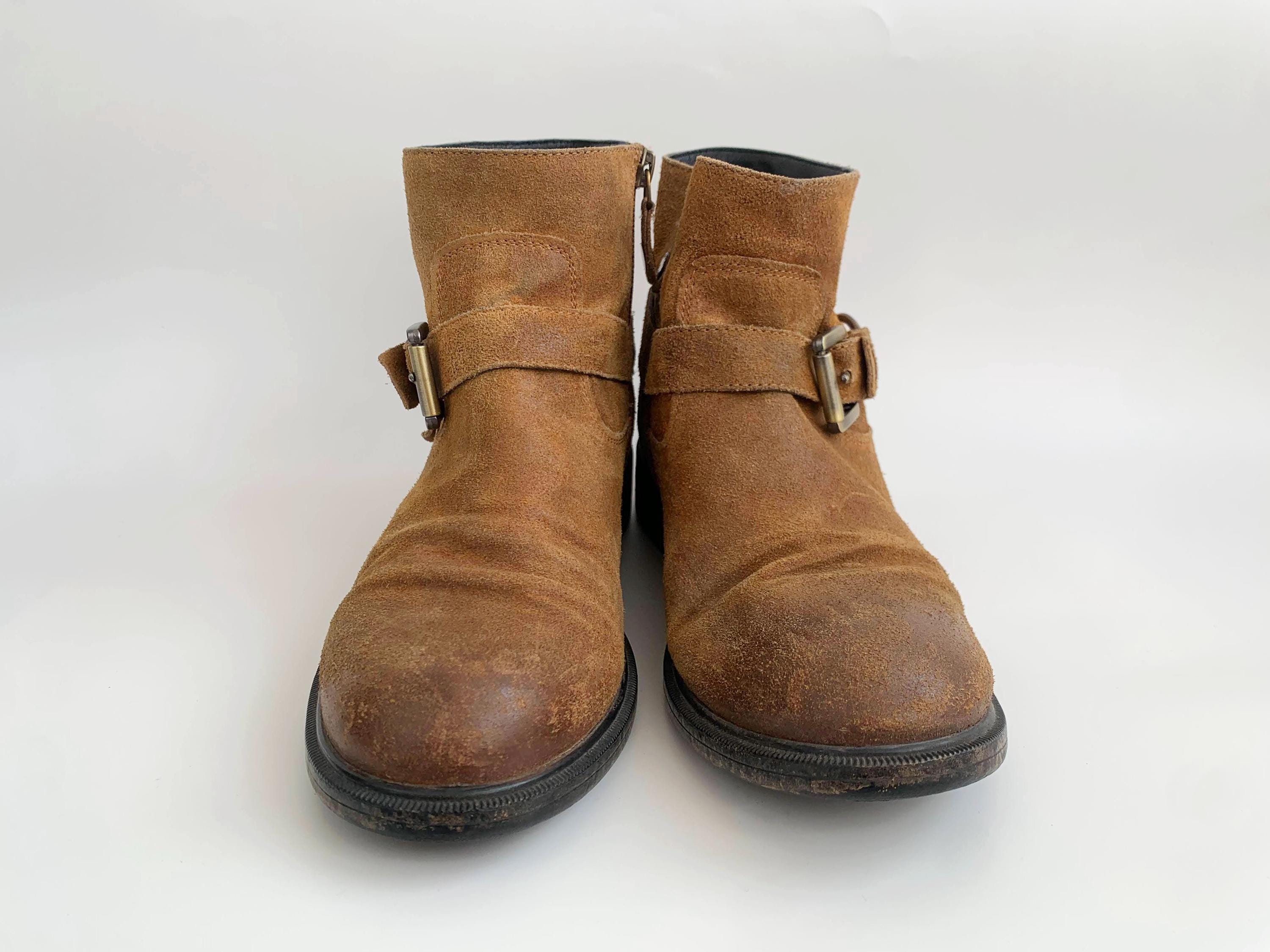 Condition: These camel brown suede leather boots were pre-loved and they have a heavily distressed look with numerous marks and scratches on the suede leather surface as shown in the photos