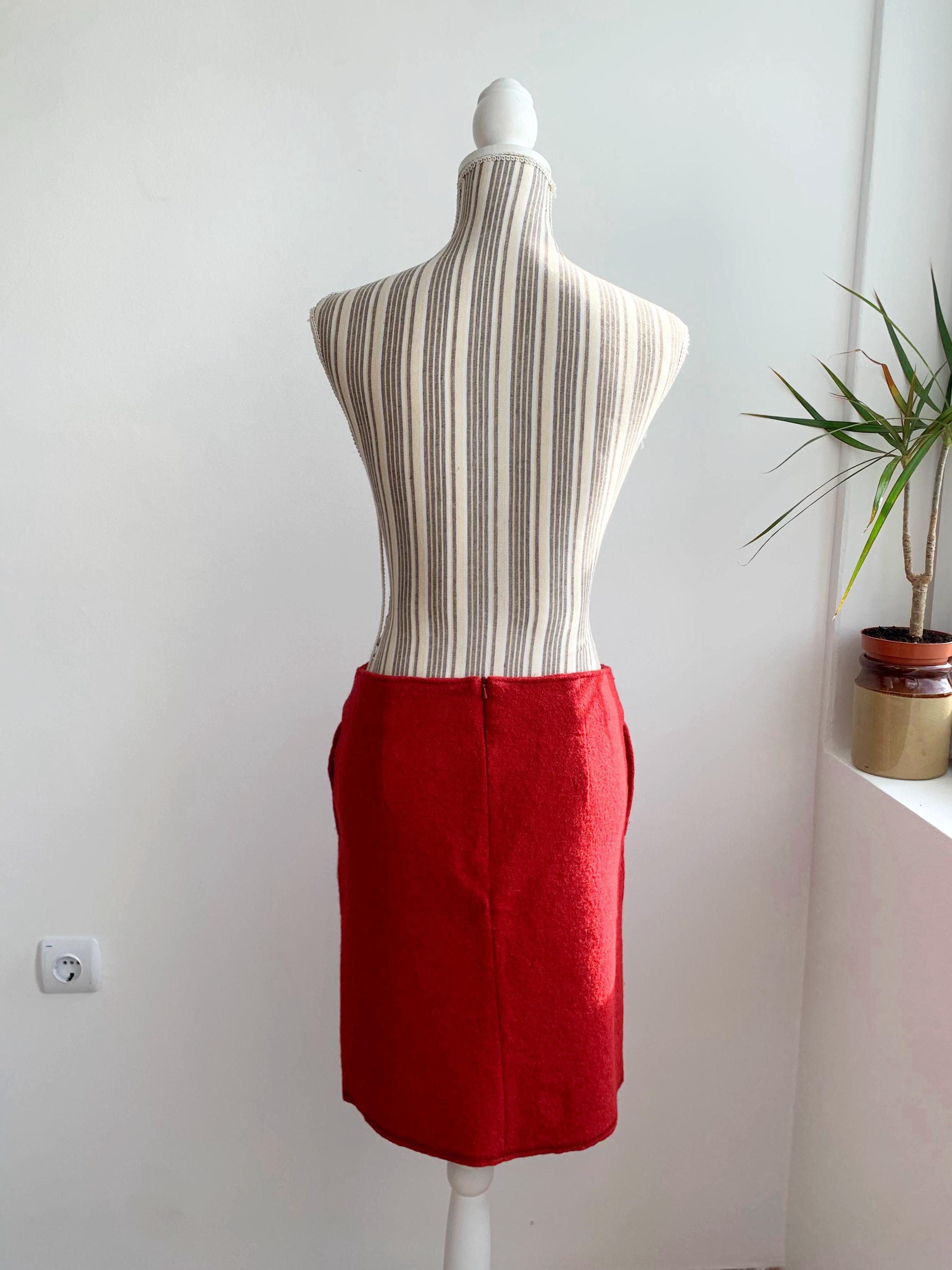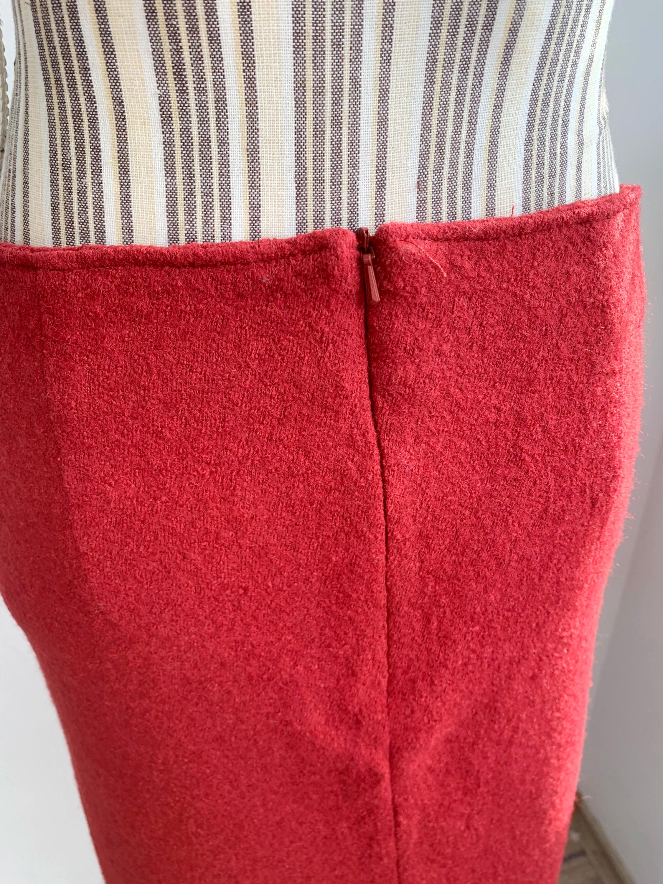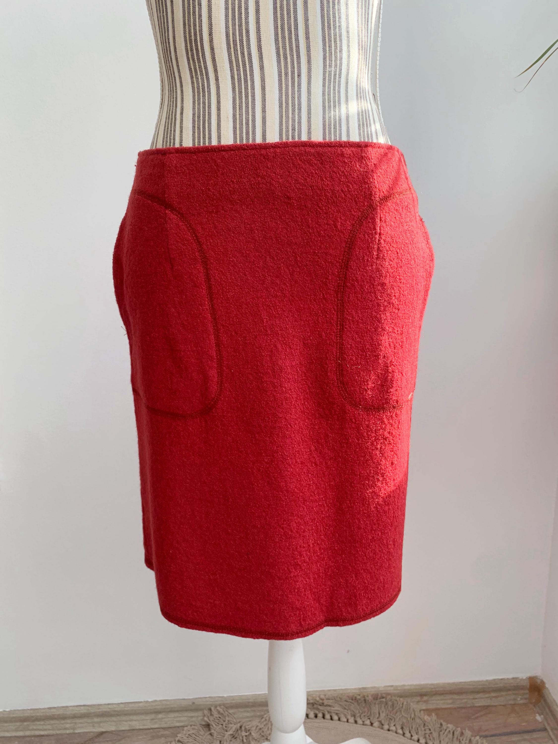 Beautiful vintage short wool blend skirt, made of warm boucle felted wool fabric with back zipper and polyester lining. This burgundy red wool skirt has two side pockets. The size marked is 34, which fits like size S. Please check the measurements below: