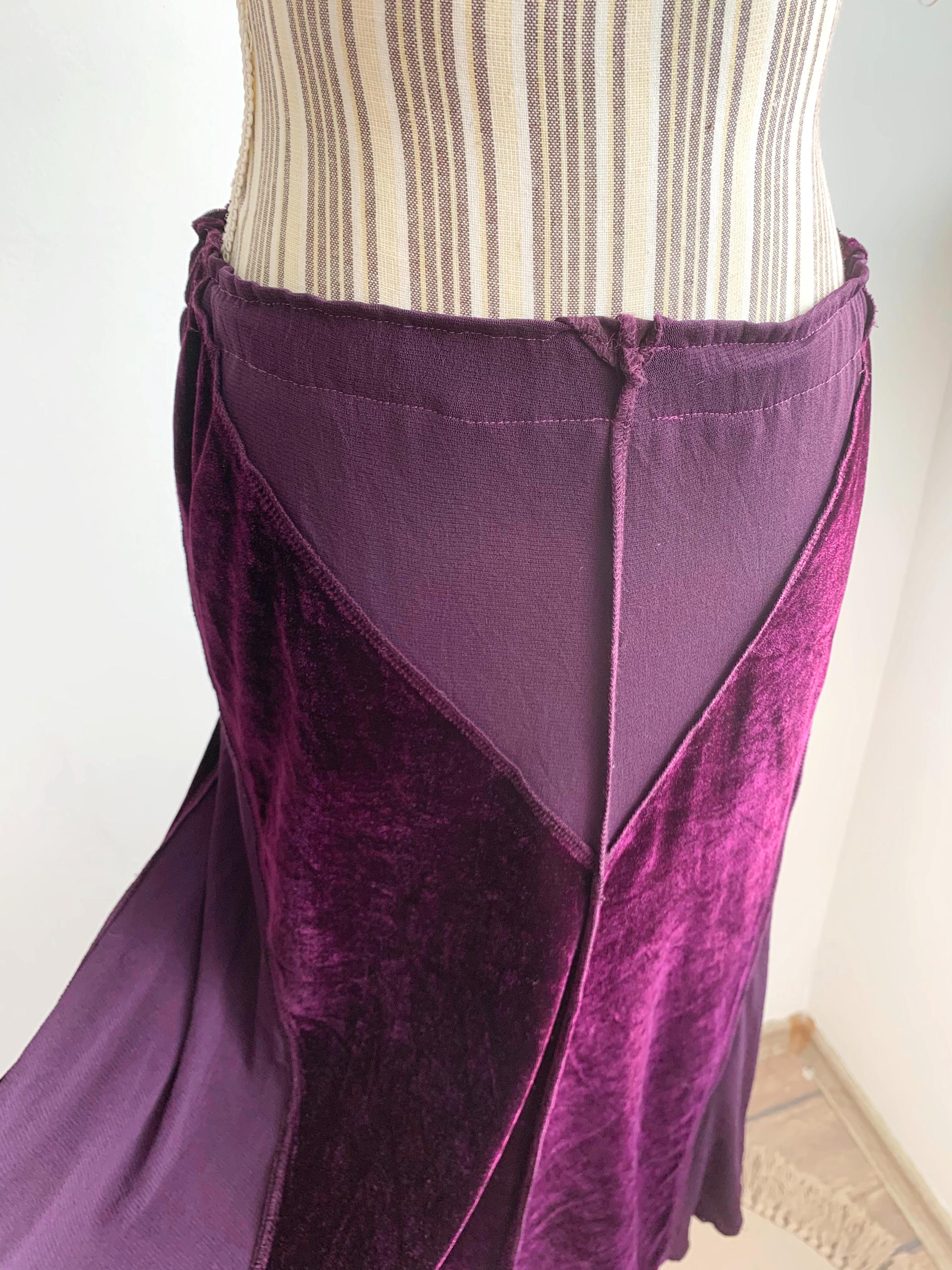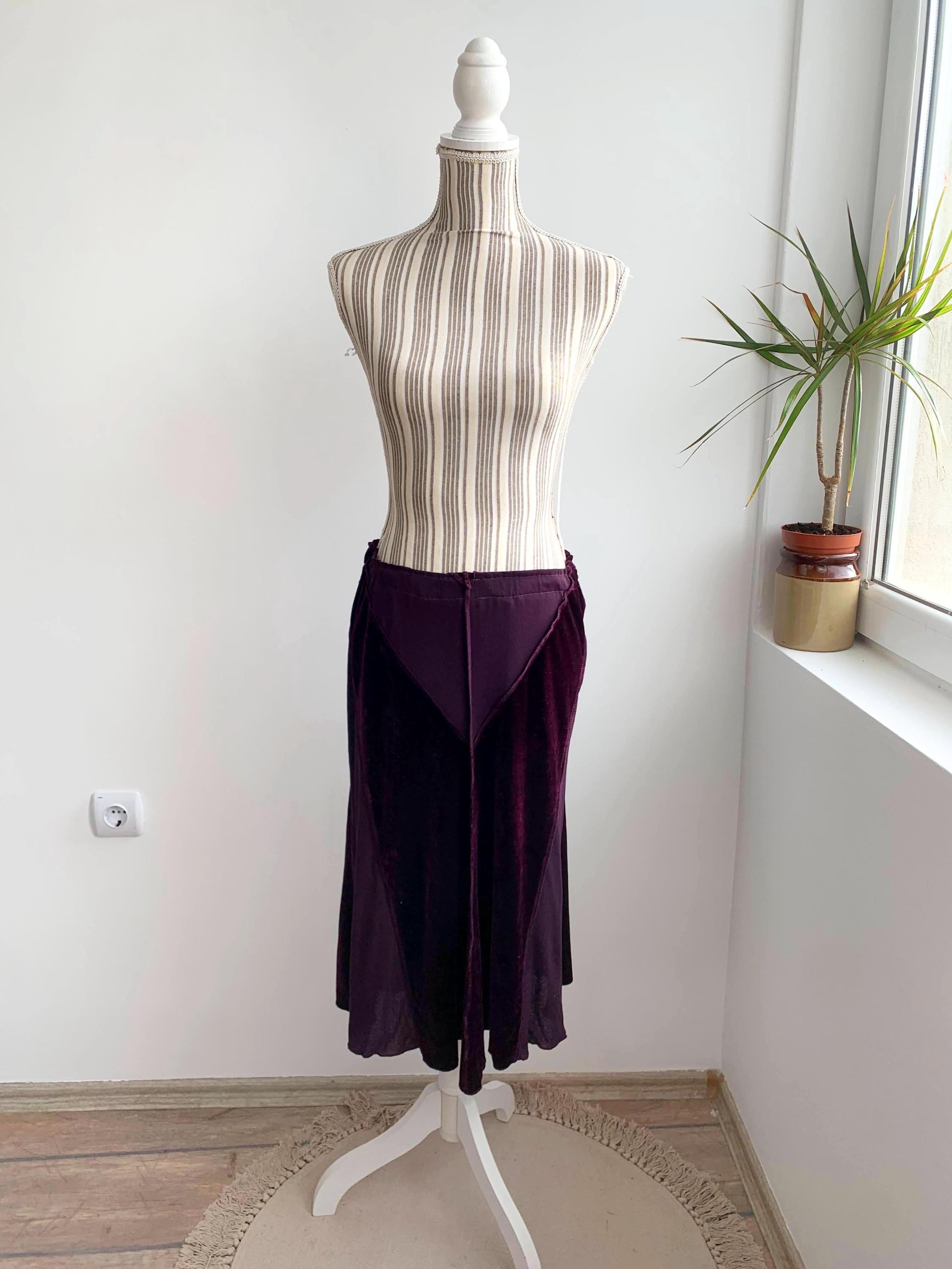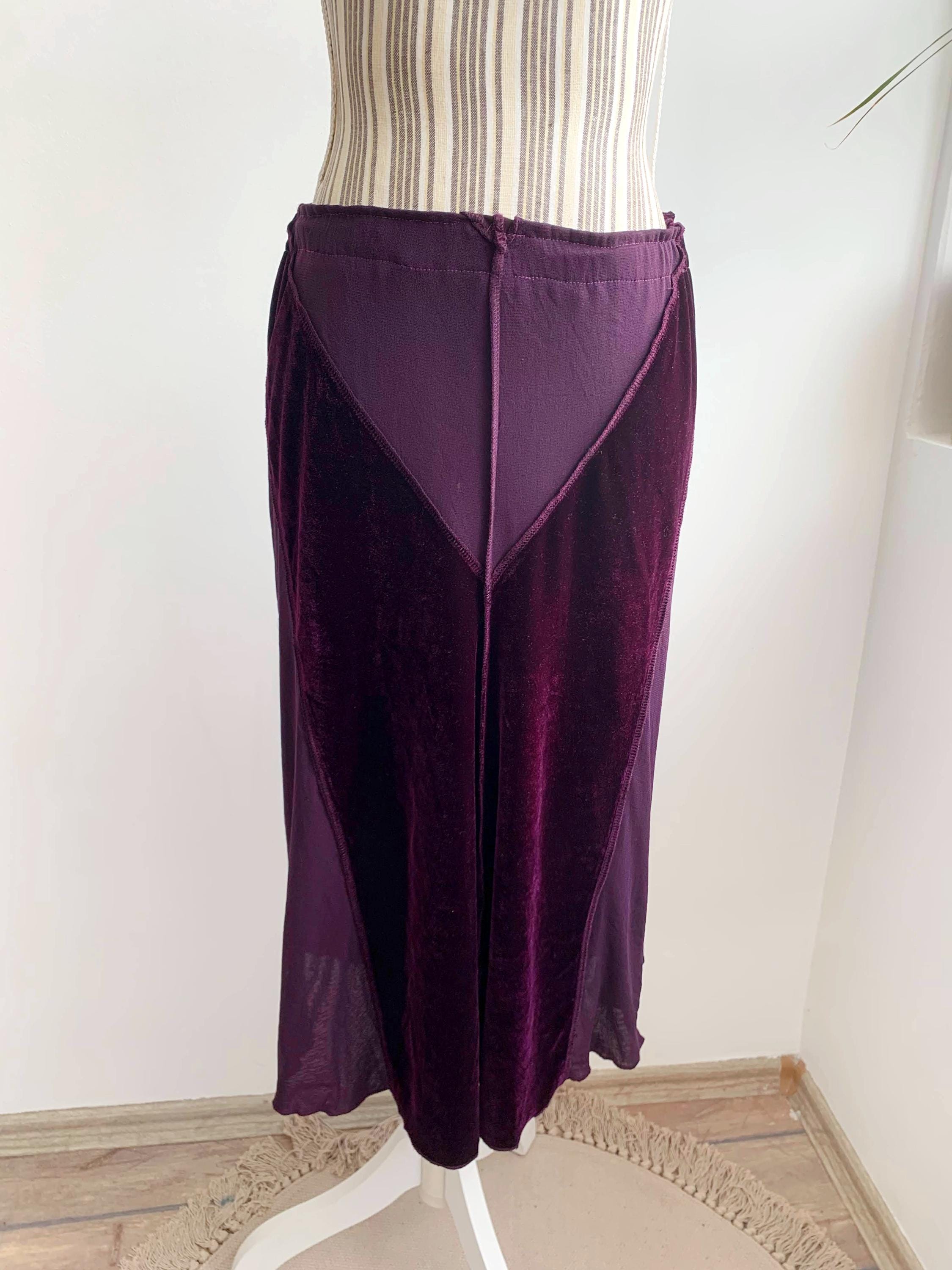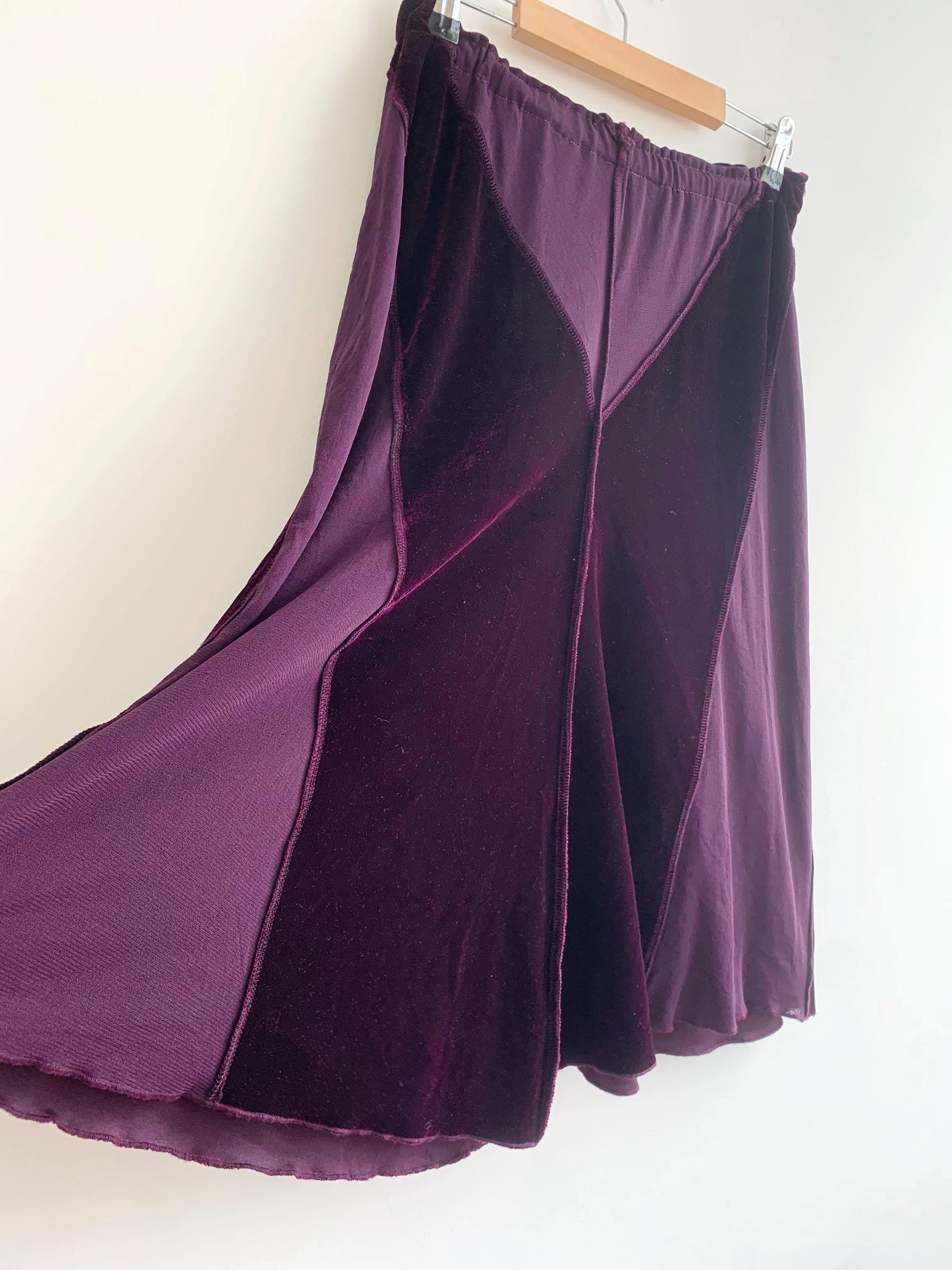 This is a vintage 90s eggplant burgundy purple flared midi skirt for women made of stretchy velvet fabric with sheer mesh tulle panels. This mid calf midi skirt has flared silhouette and elastic waistline. This grunge midi skirt has no tag or label. It fits like size S. Please check the measurements below.