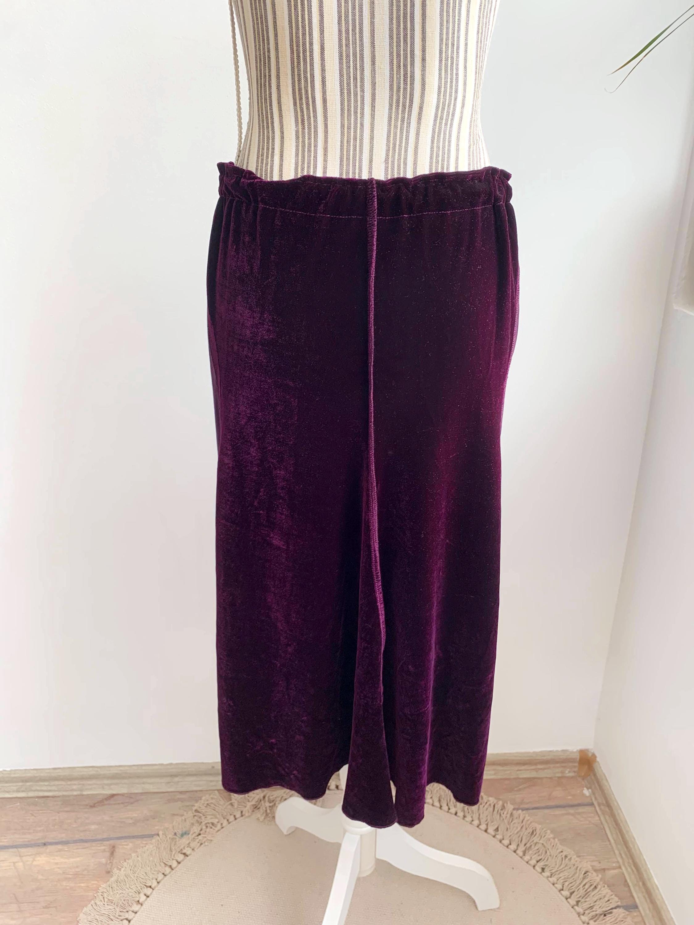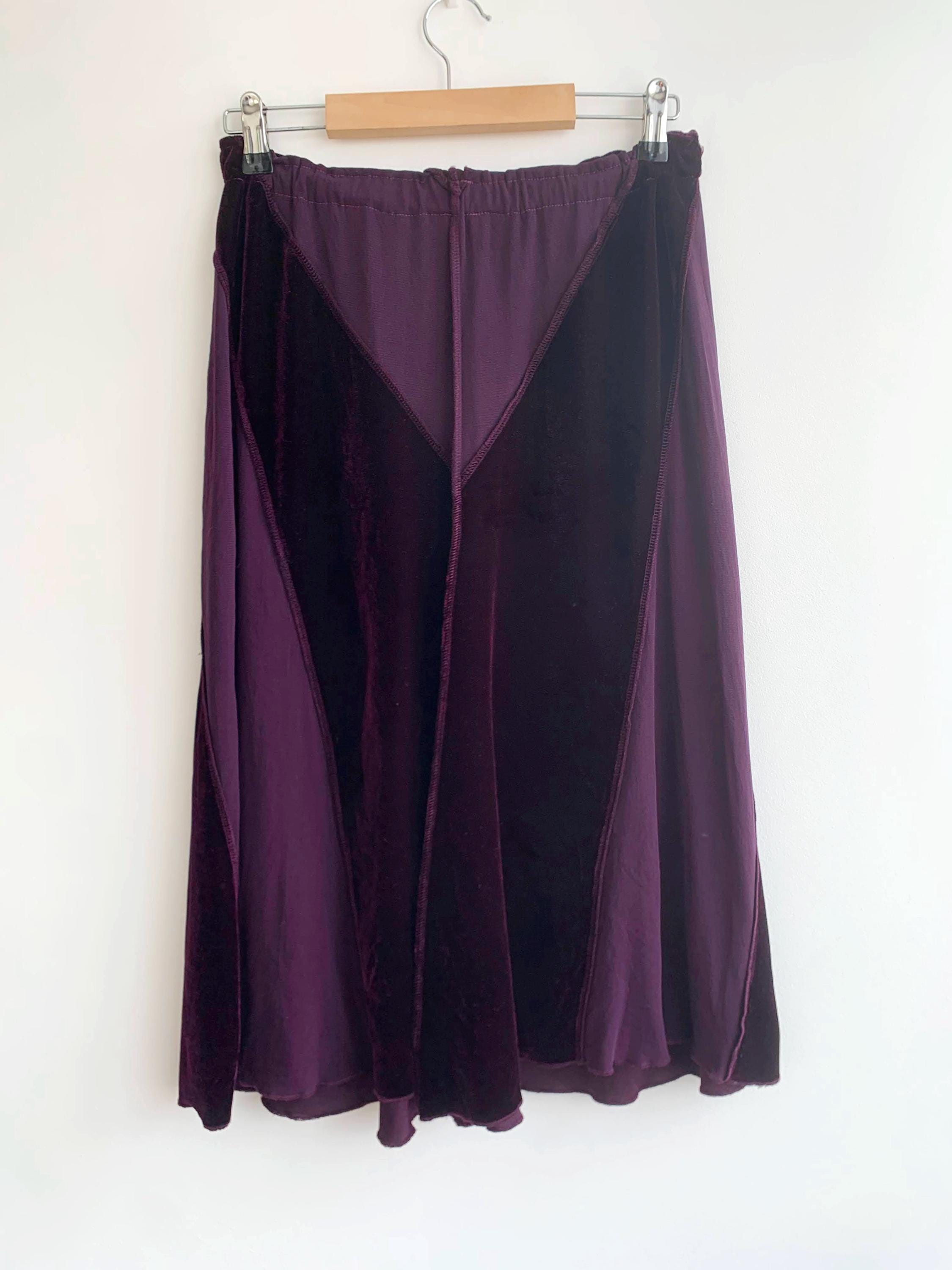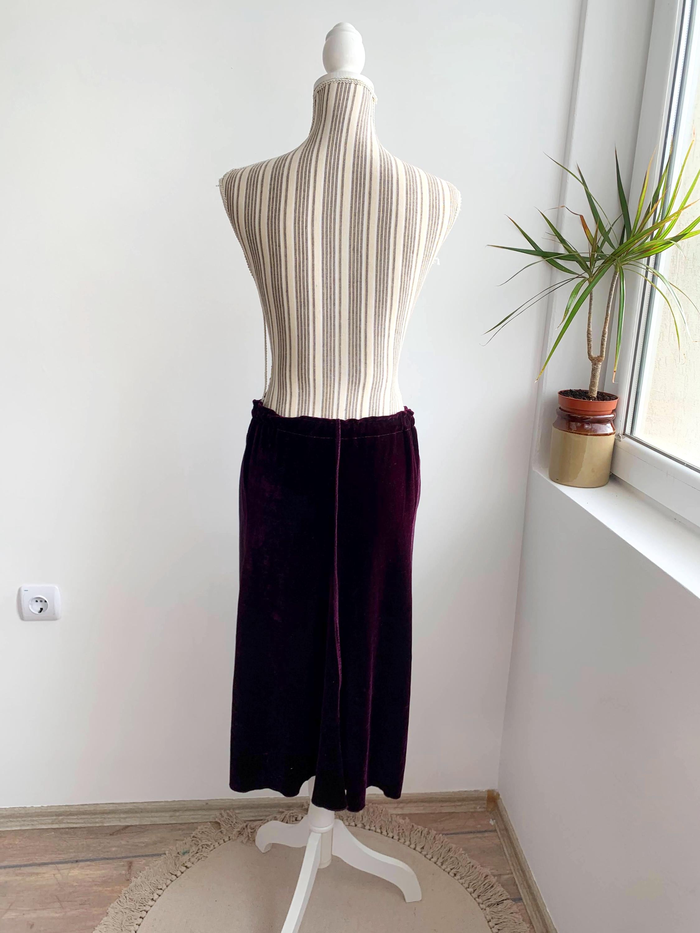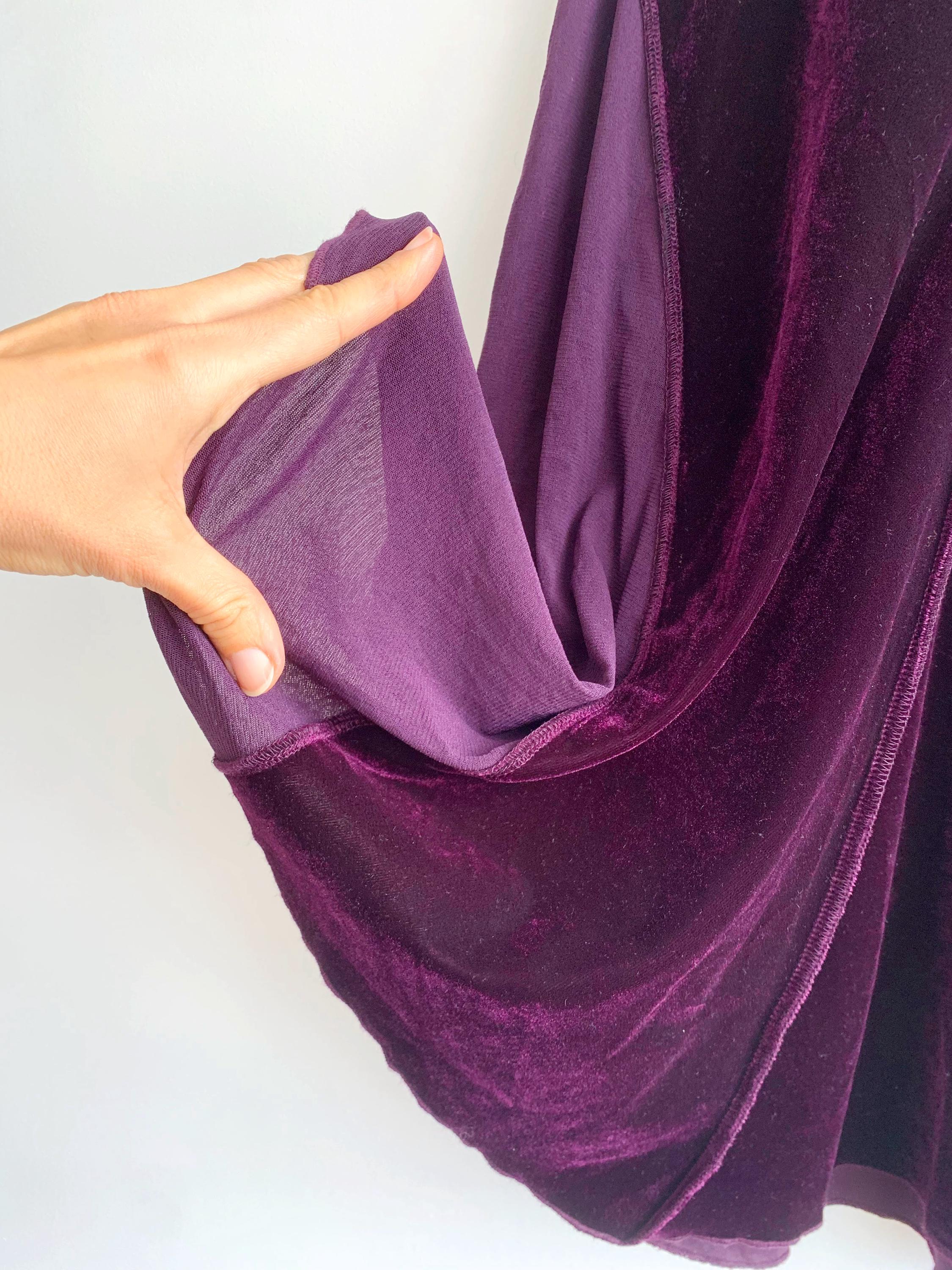 This is a vintage 90s eggplant burgundy purple flared midi skirt for women made of stretchy velvet fabric with sheer mesh tulle panels. This mid calf midi skirt has flared silhouette and elastic waistline. This grunge midi skirt has no tag or label. It fits like size S. Please check the measurements below.