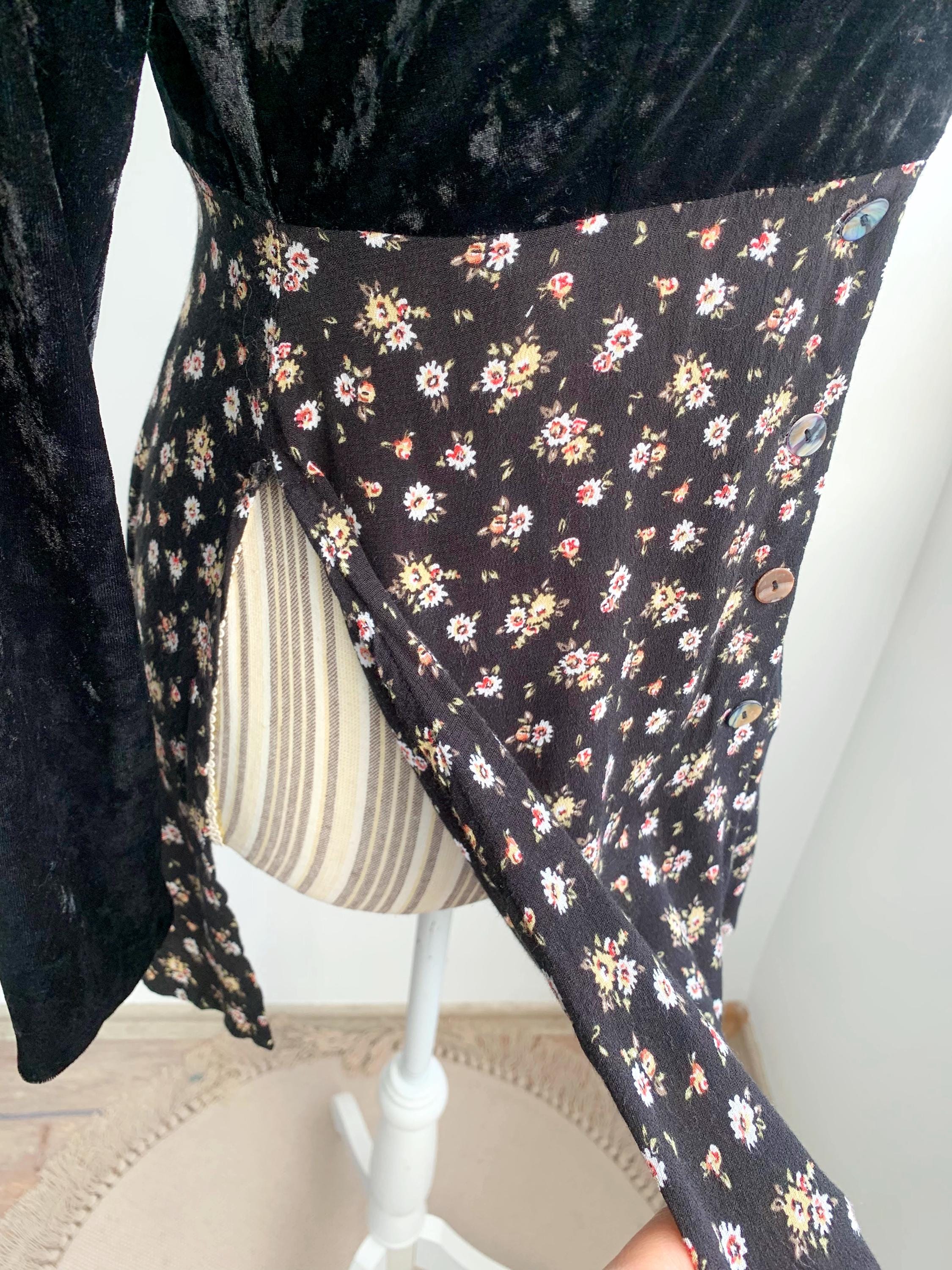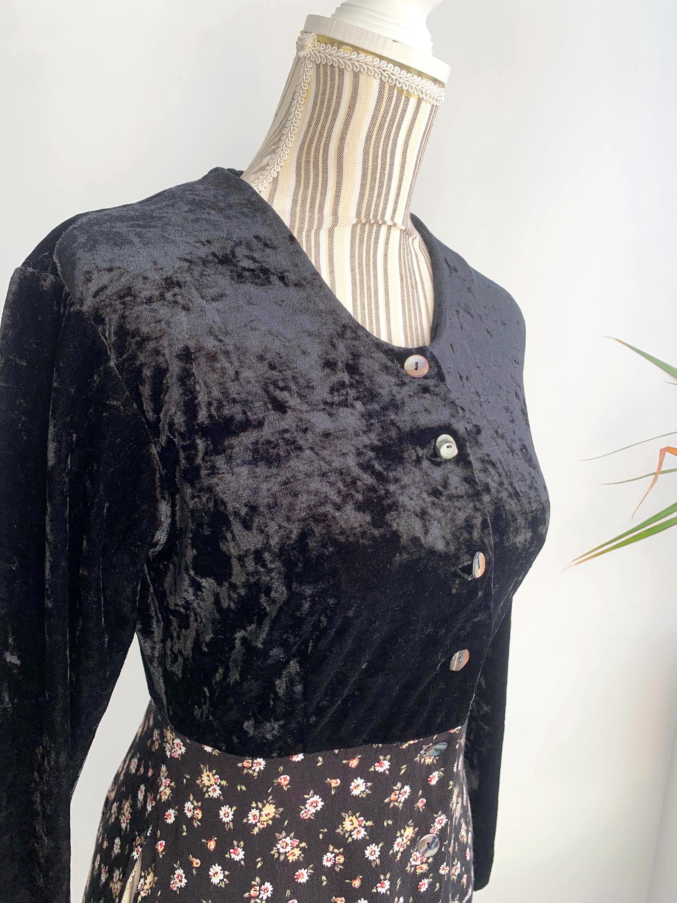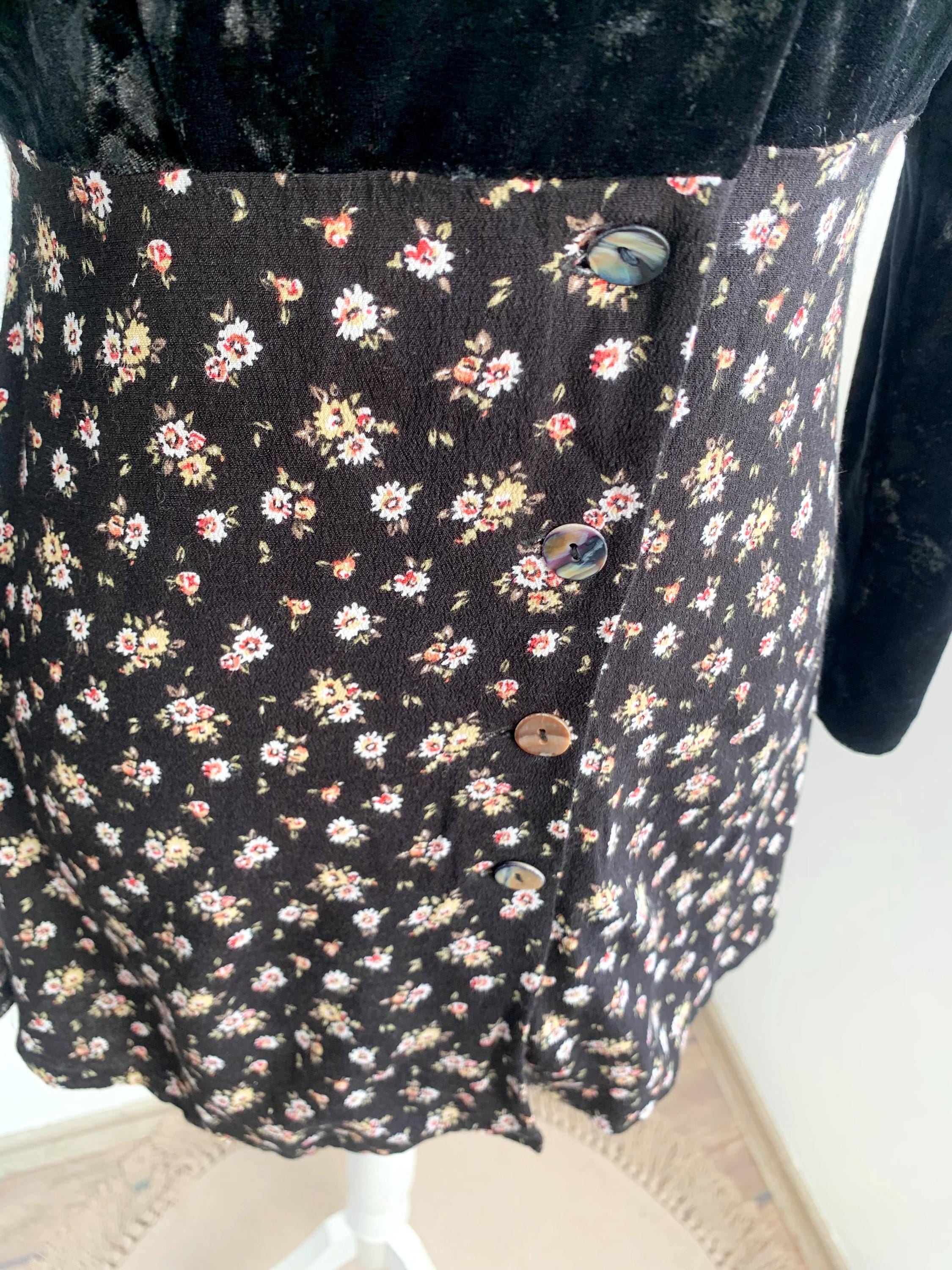 This is a wonderful unique high waisted 90s black velvet button up top with floral viscose bottom part with deep side slits by Esprit. Cute floral velvet shirt for women size 36 with button front closure and scoop neck.