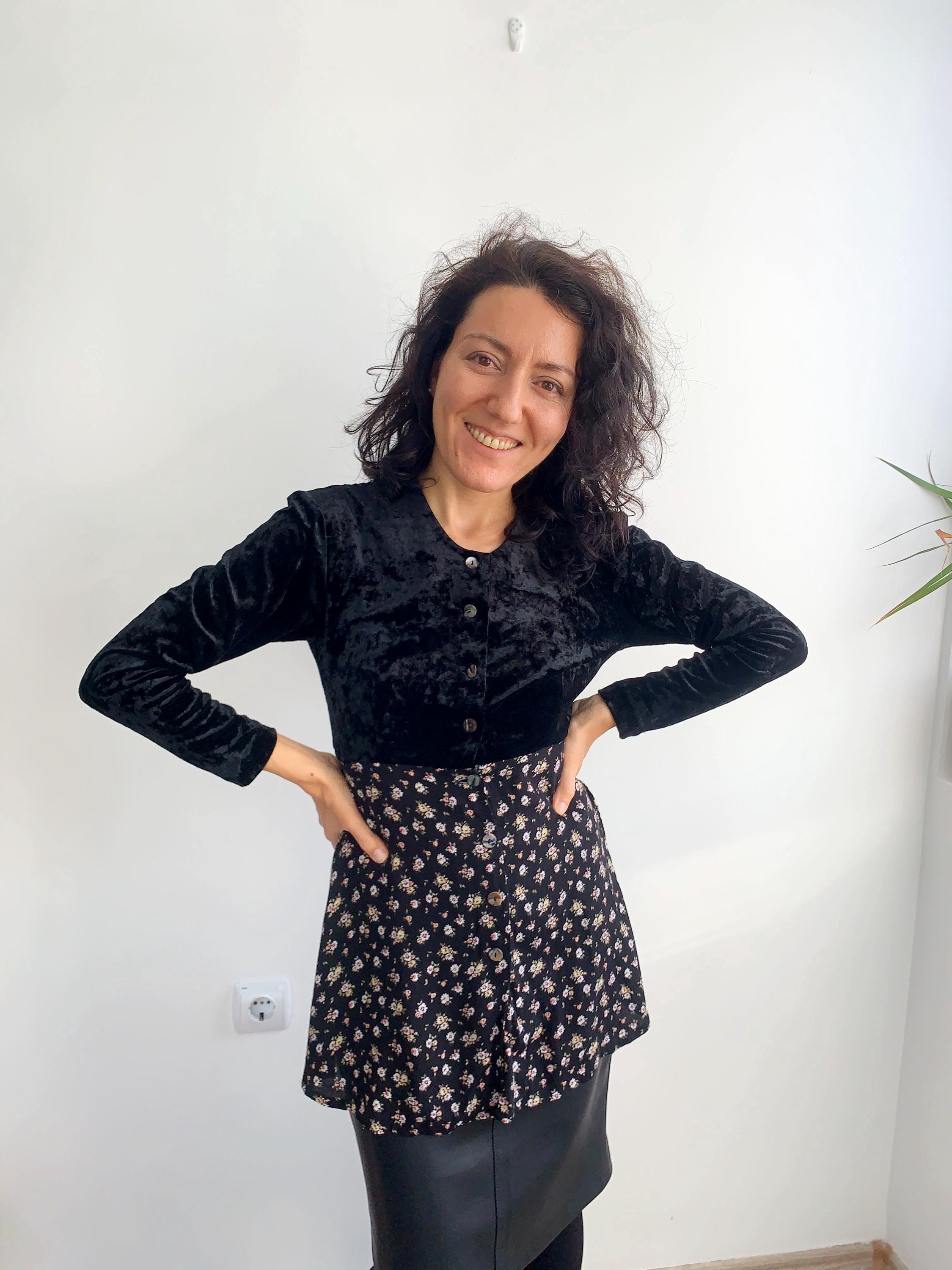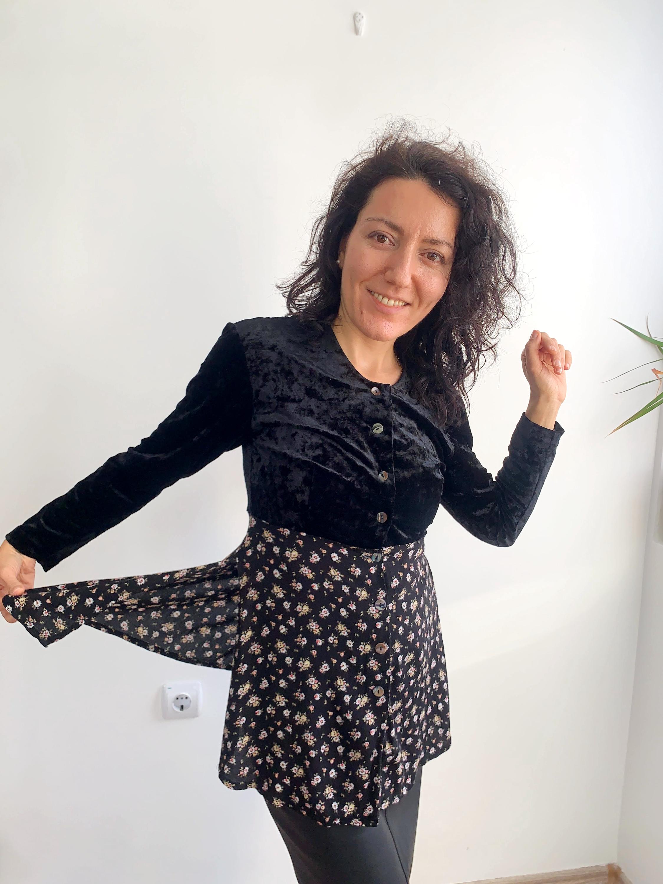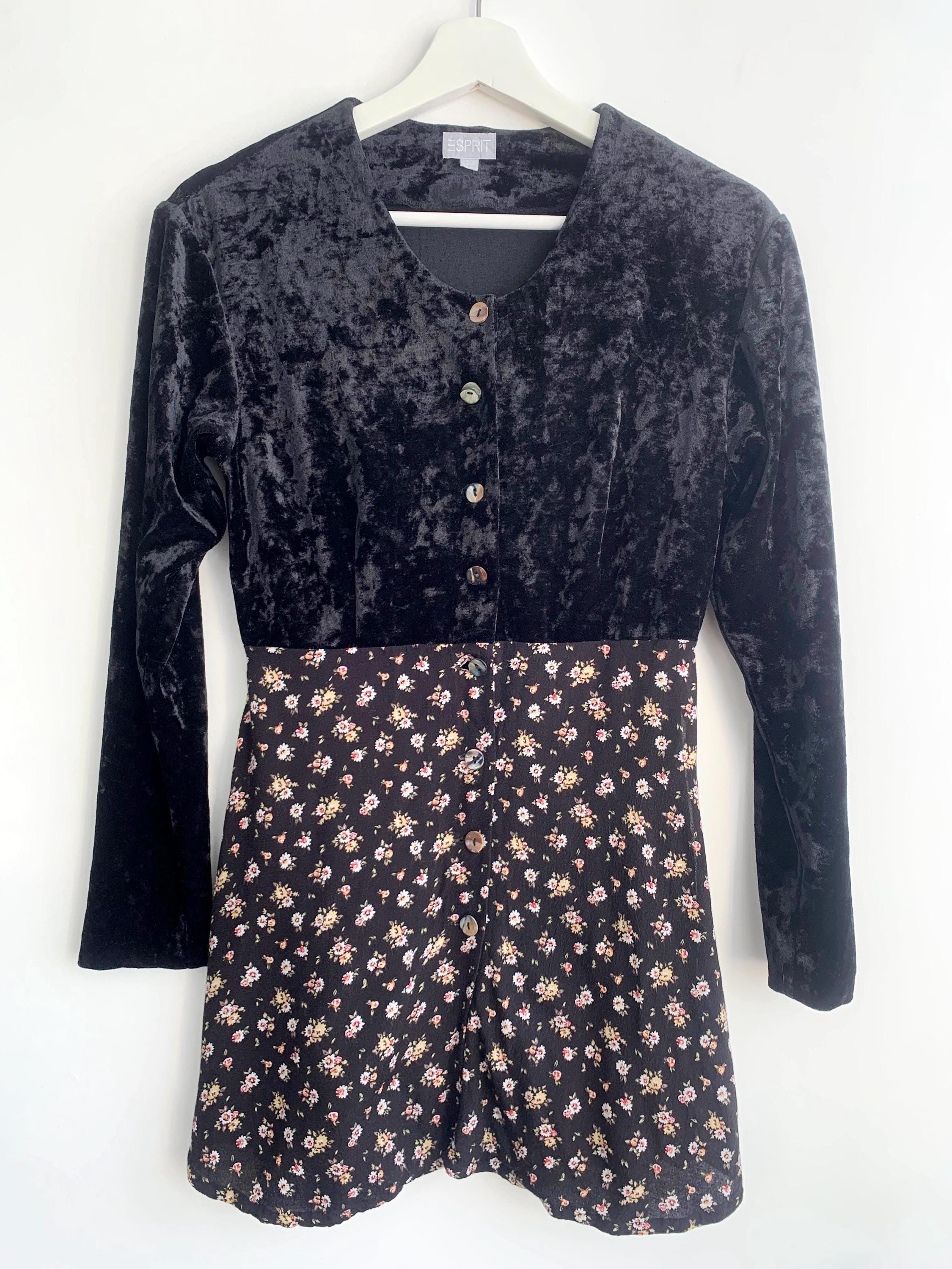 This is a wonderful unique high waisted 90s black velvet button up top with floral viscose bottom part with deep side slits by Esprit. Cute floral velvet shirt for women size 36 with button front closure and scoop neck.