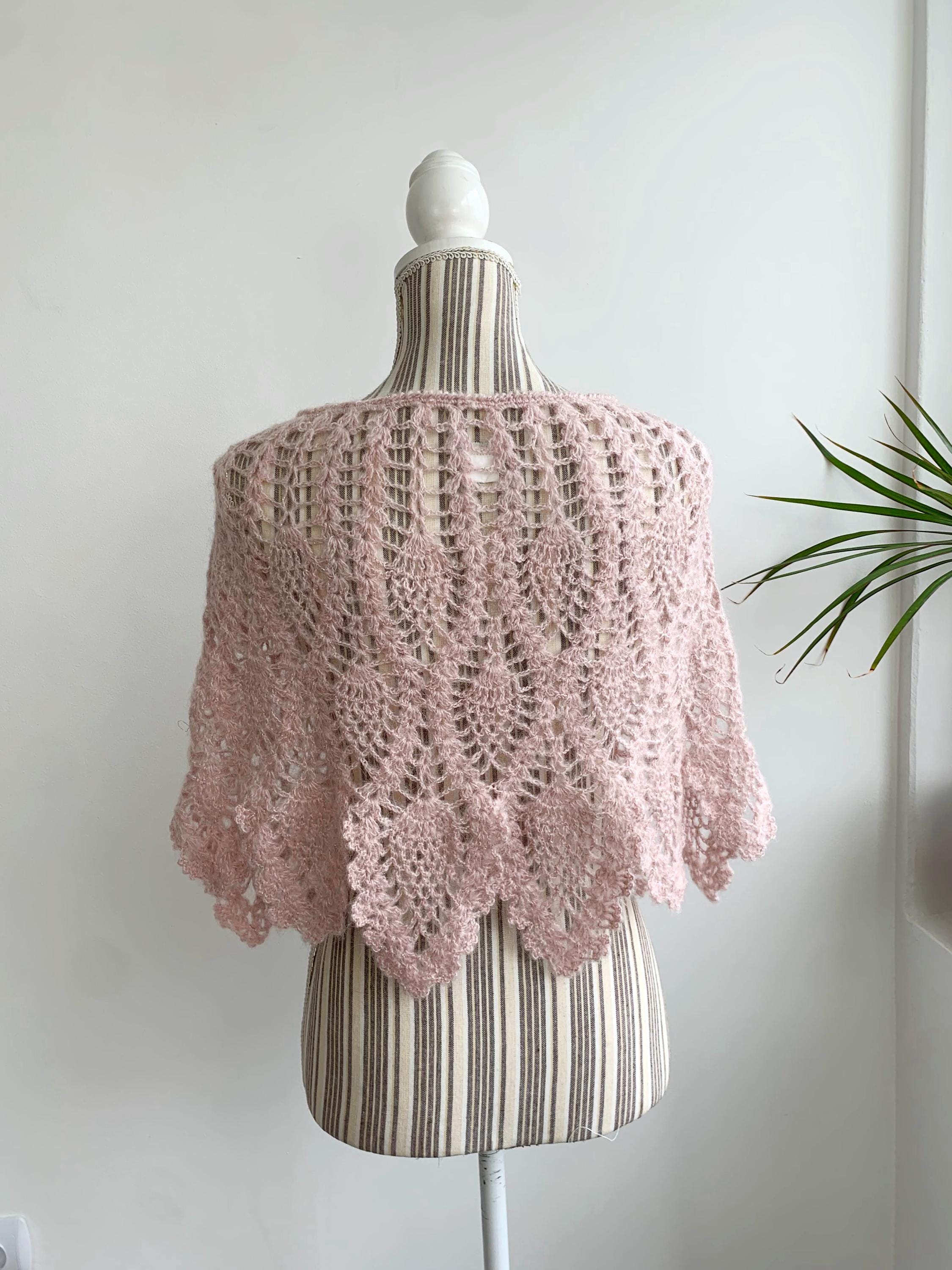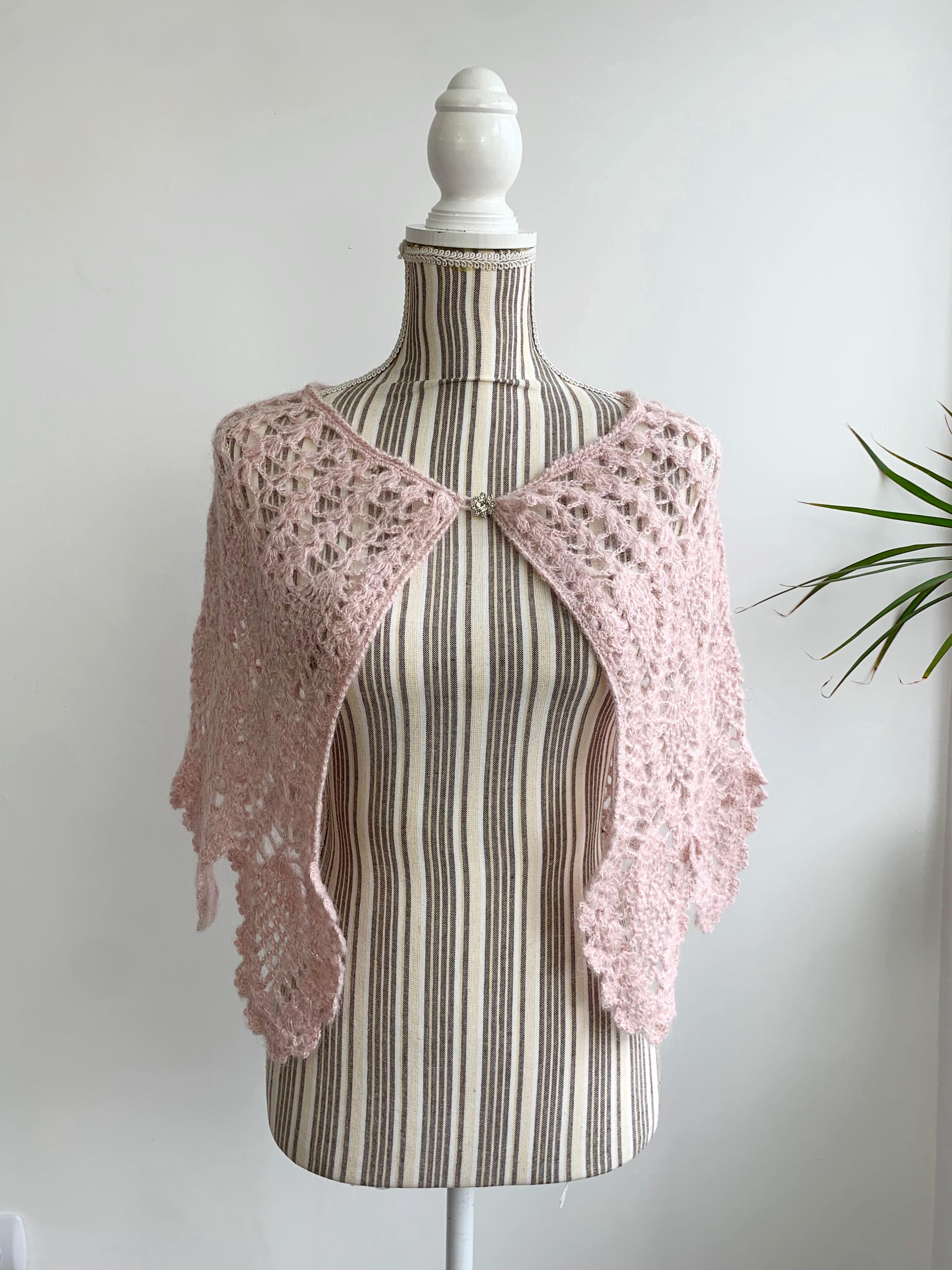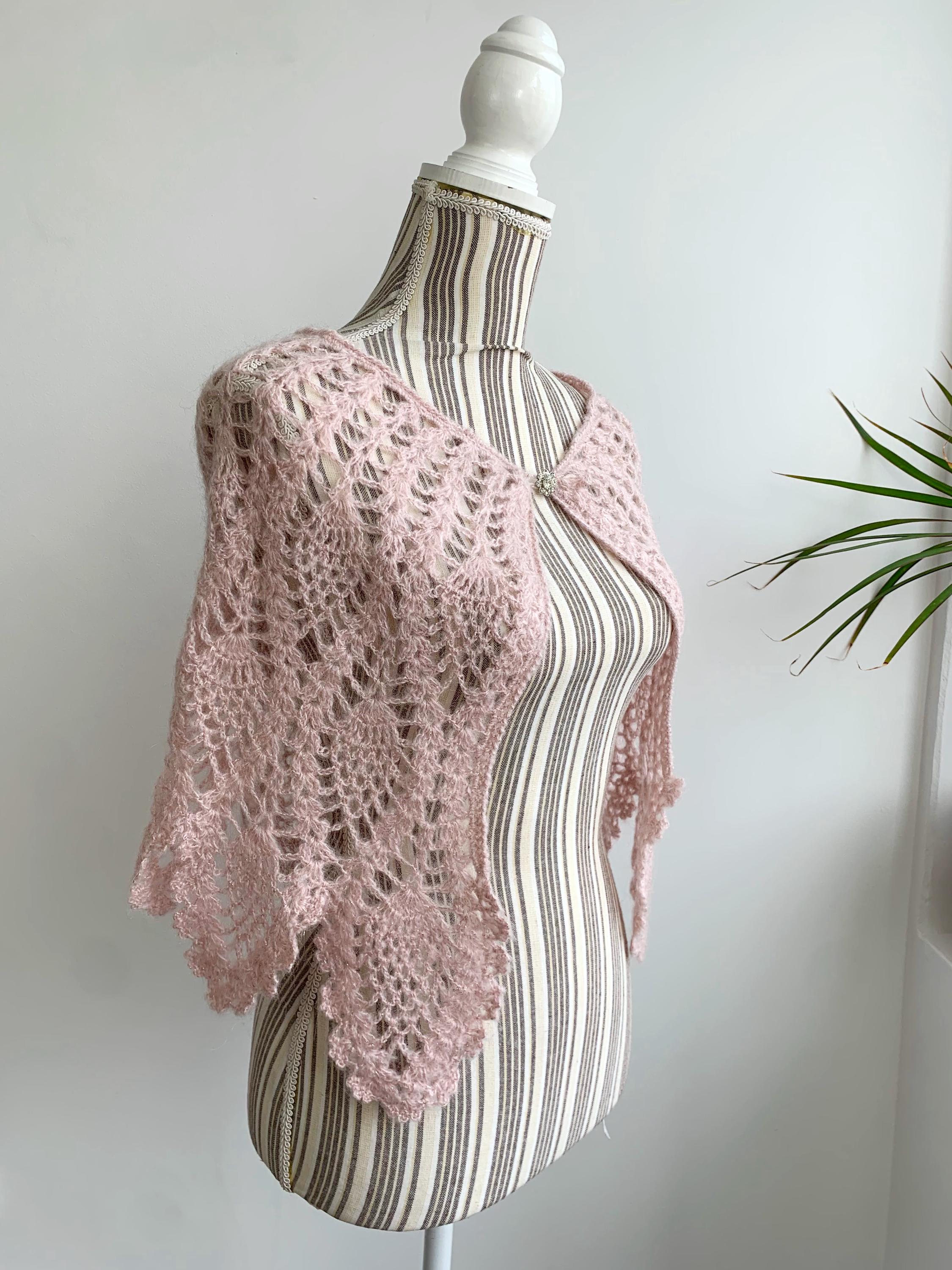 This is a pretty bohemian pale pink boho crochet shawlette for women with silver lame and rhinestone floral single button closure. This lace shoulder shawl wrap is made of soft acrylic mohair lurex blend yarn. This boho shawlette will add delicate femininity to your outfit.
