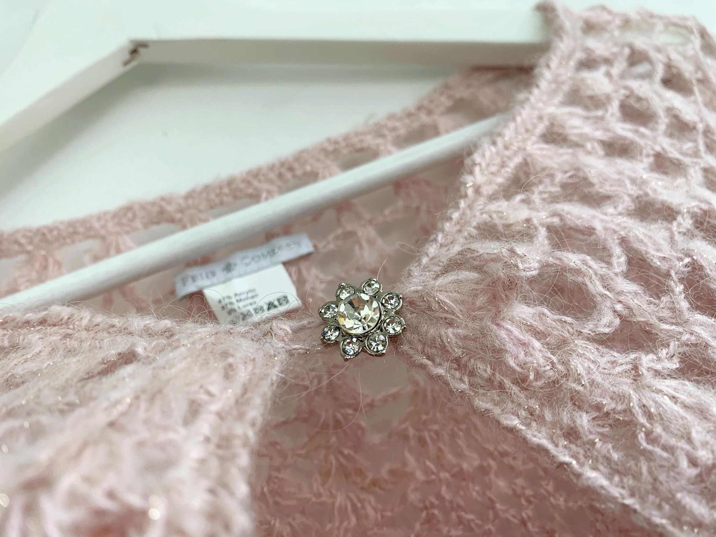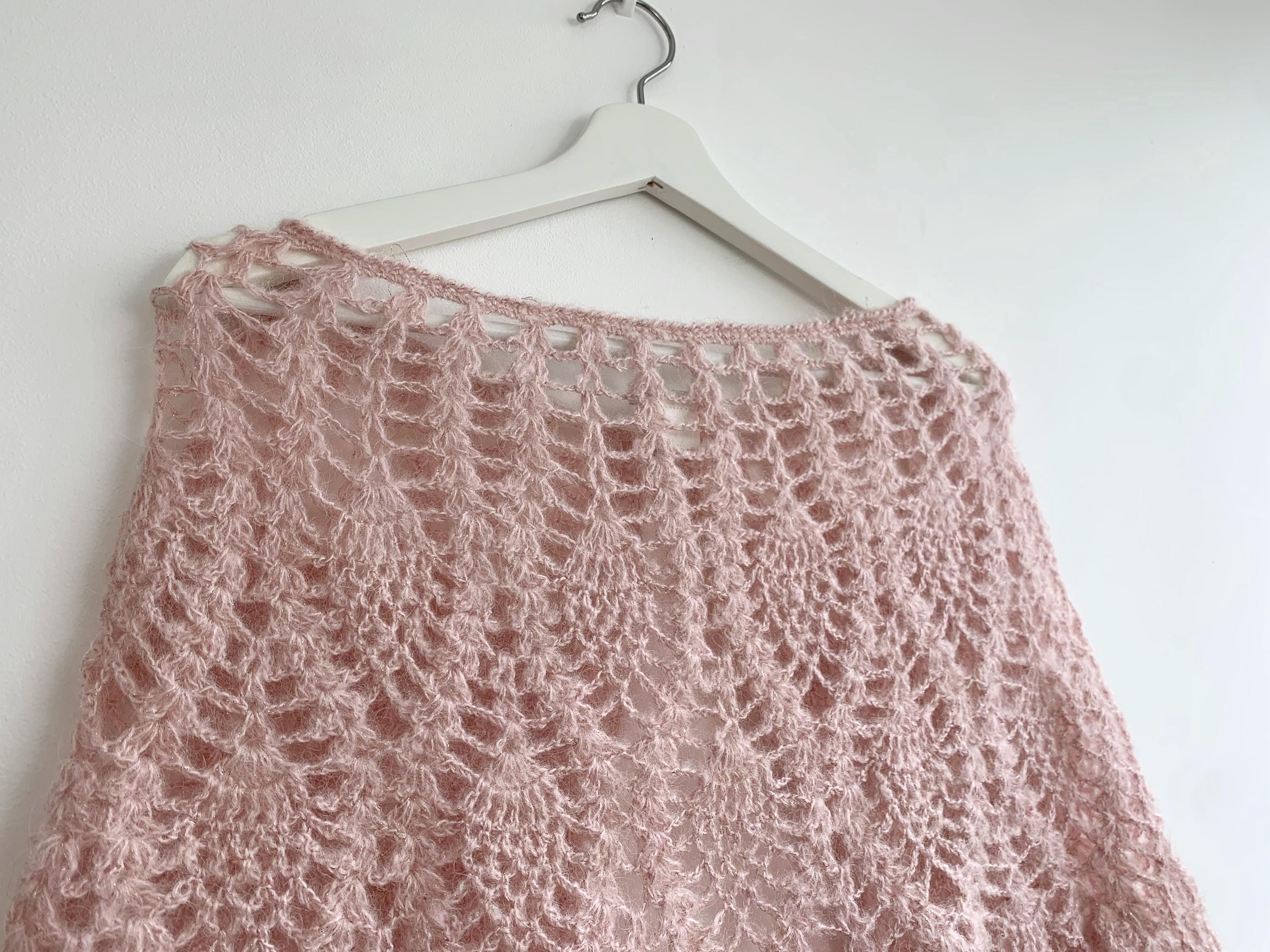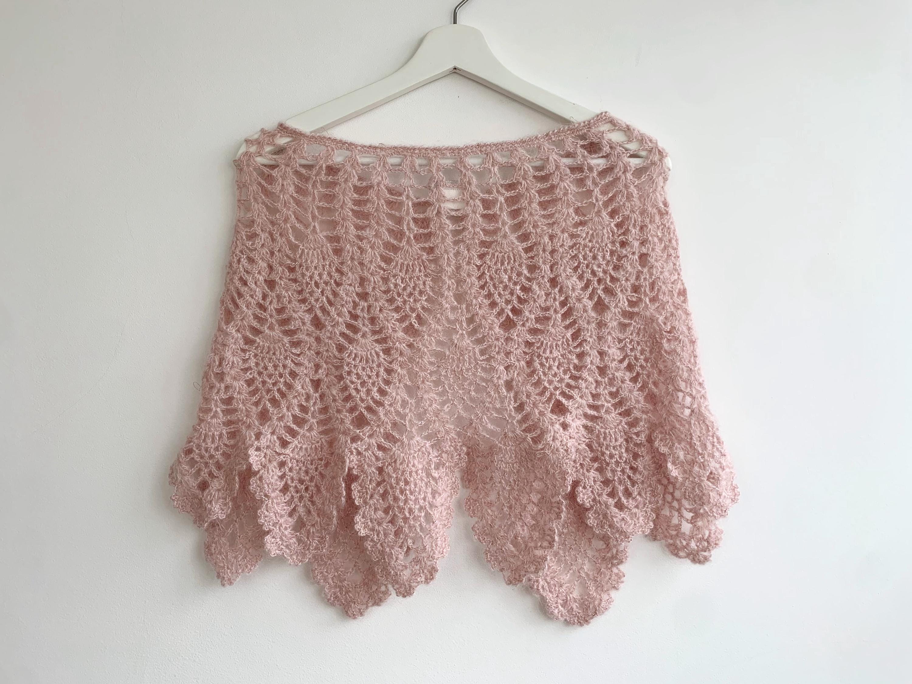 This is a pretty bohemian pale pink boho crochet shawlette for women with silver lame and rhinestone floral single button closure. This lace shoulder shawl wrap is made of soft acrylic mohair lurex blend yarn. This boho shawlette will add delicate femininity to your outfit.