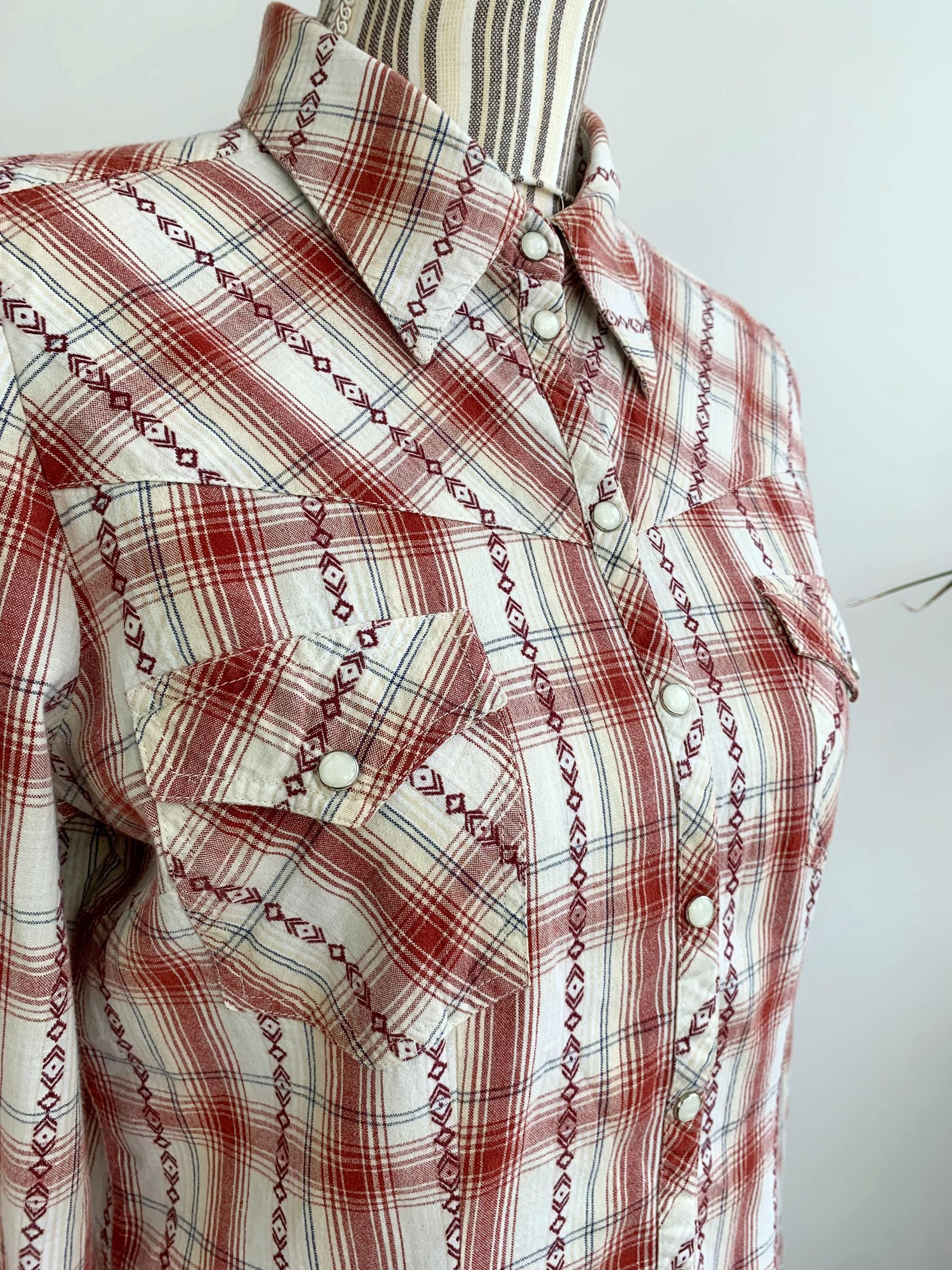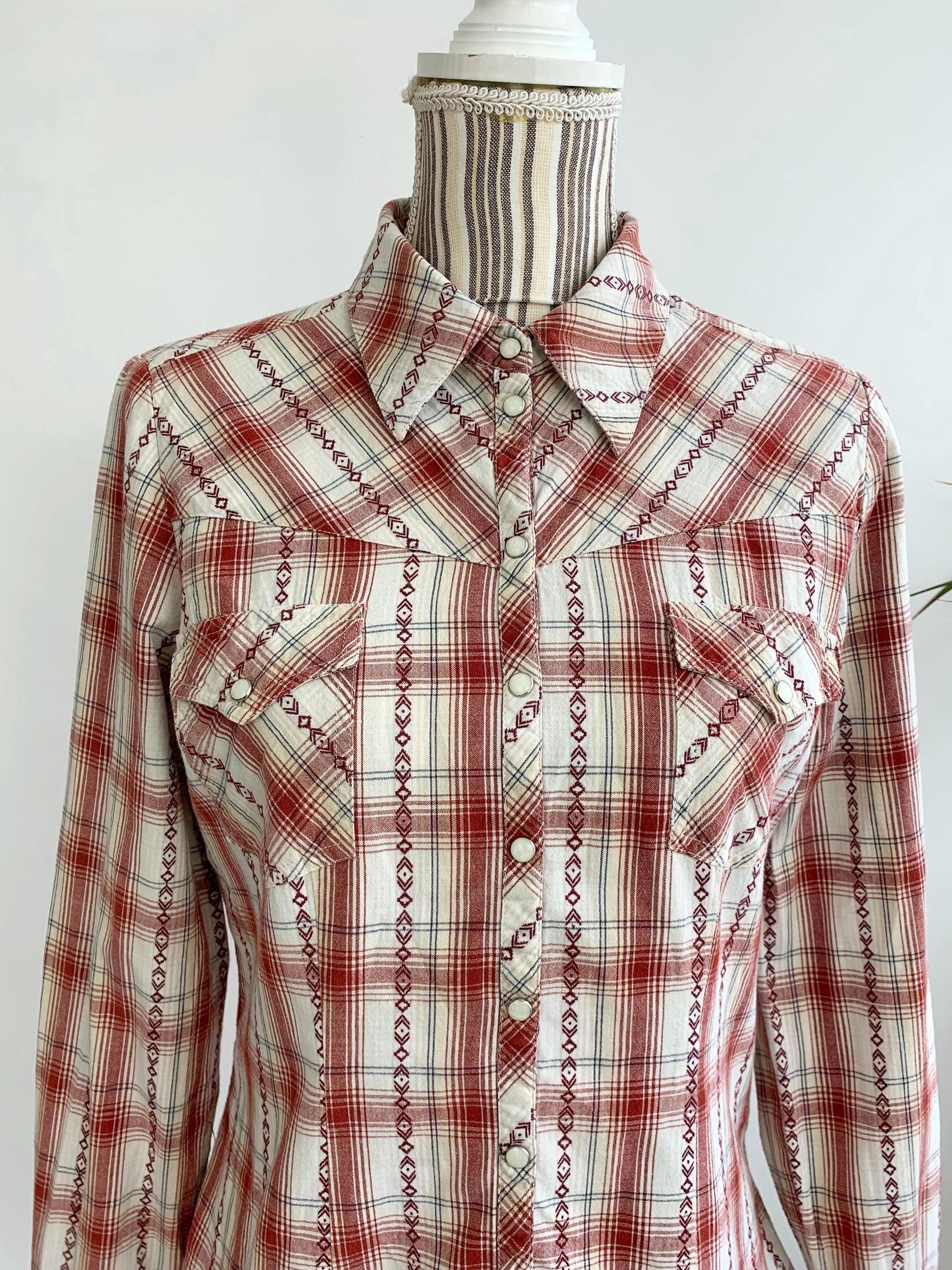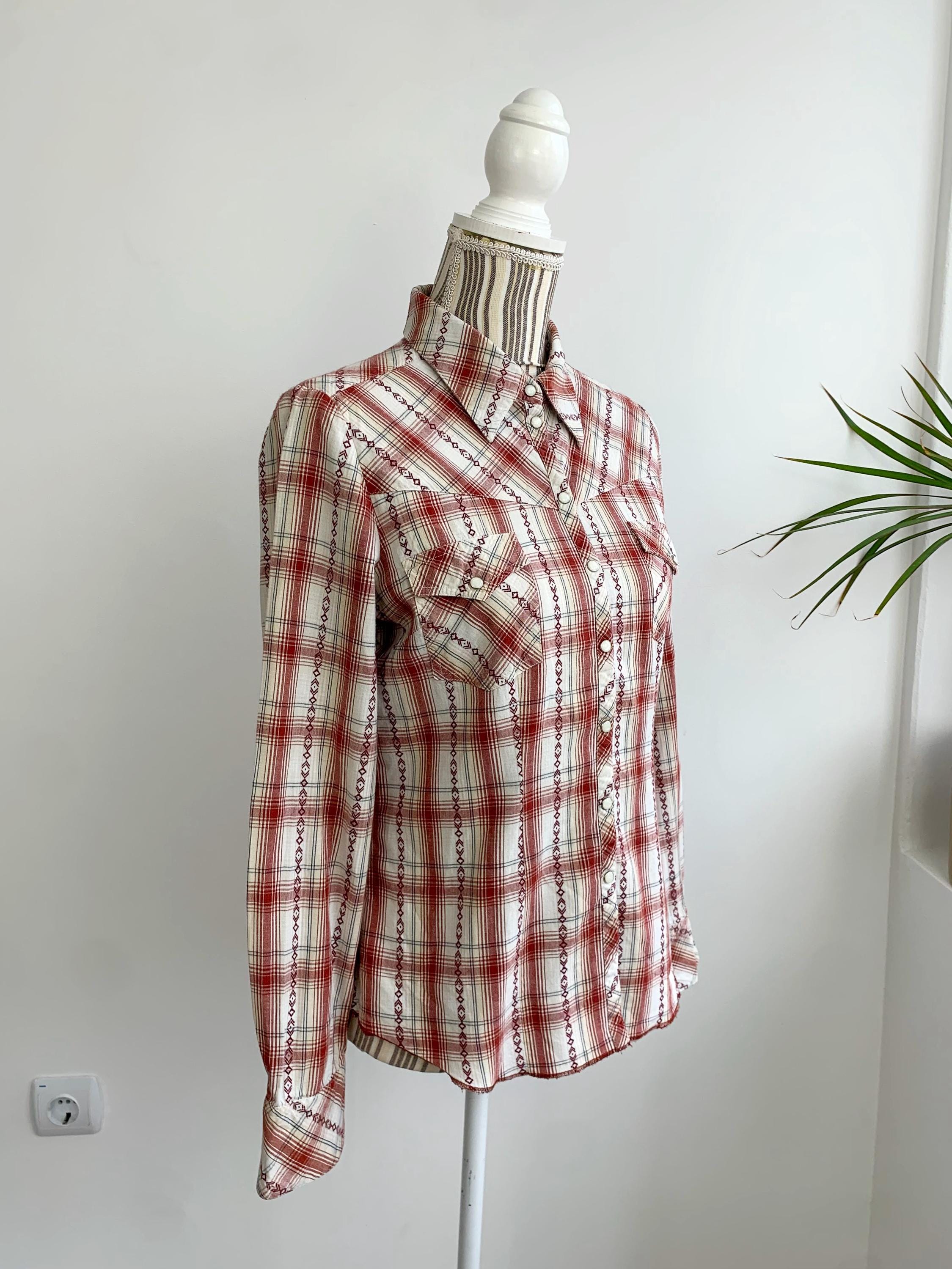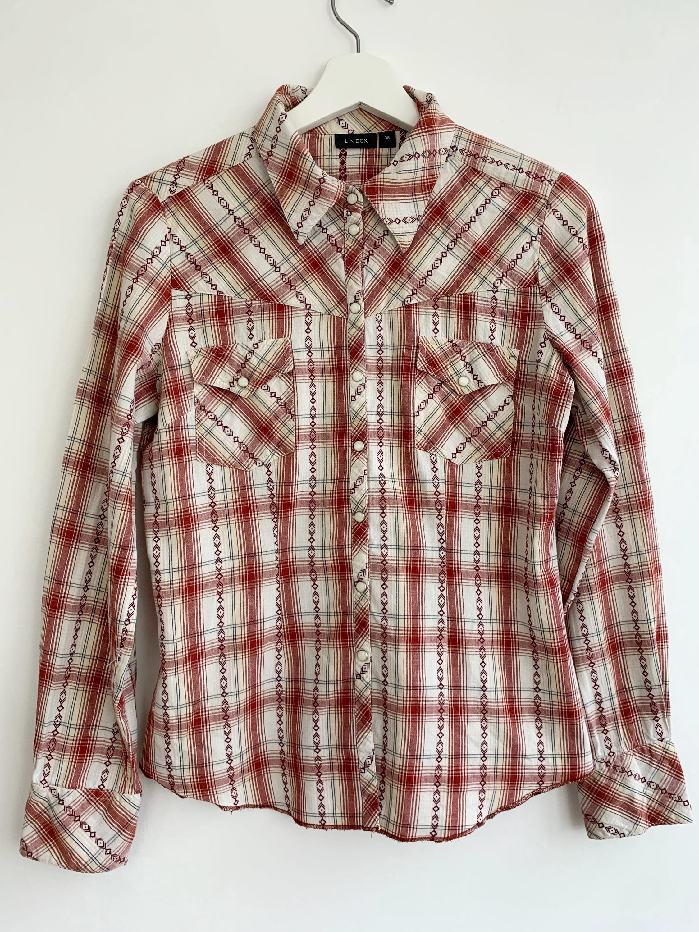 This is a vintage Y2K long sleeve cotton plaid shirt for women by the brand Lindex. This checkered shirt has snap button front closure and cutaway collar. This loose fit check shirt has a relaxed fit boxy silhouette. This vintage button down is made of non stretchy pure cotton fabric which feels awesome on the skin. The size marked is 38, which fits like size S/M . Please check the measurements below.
