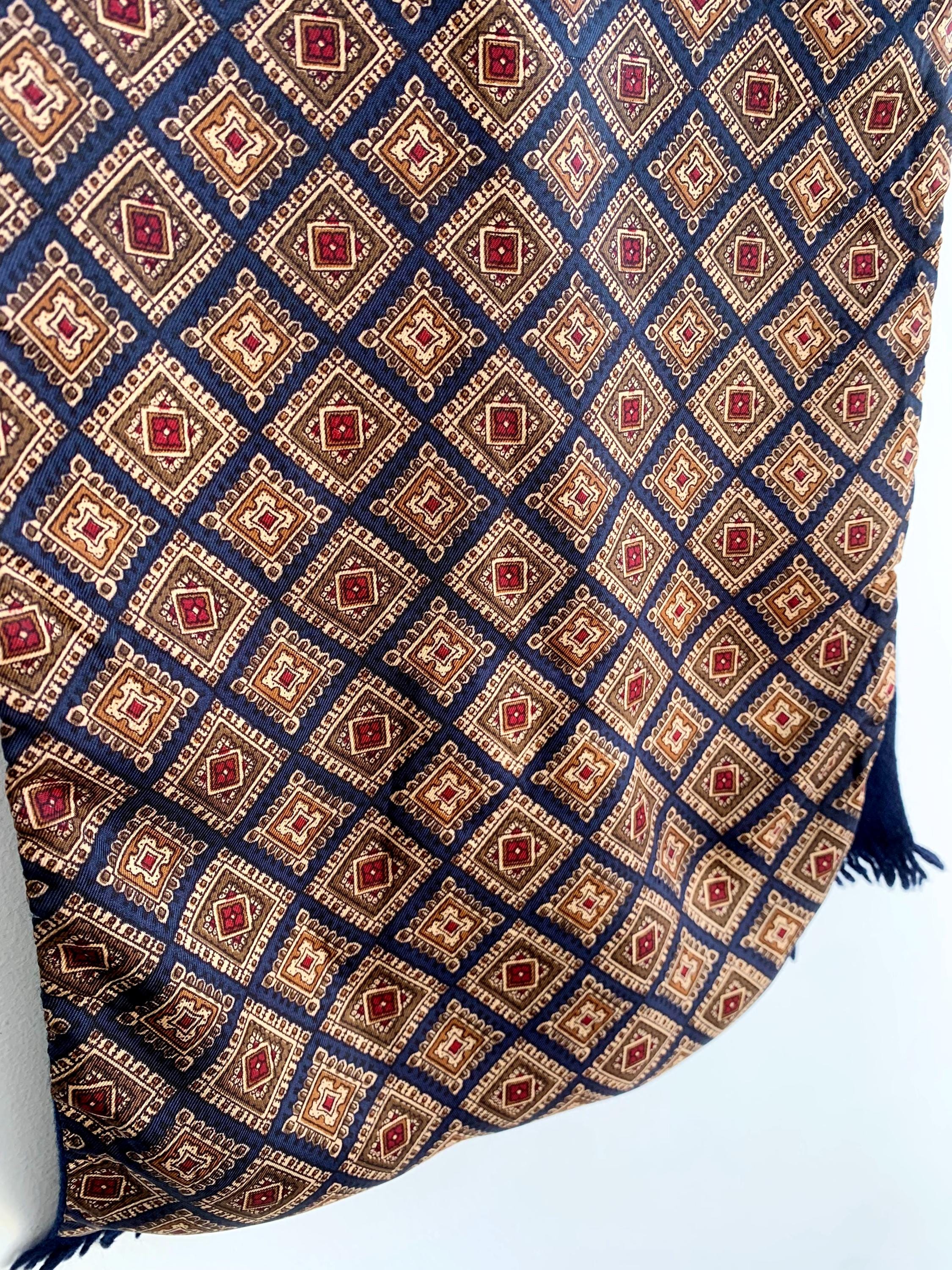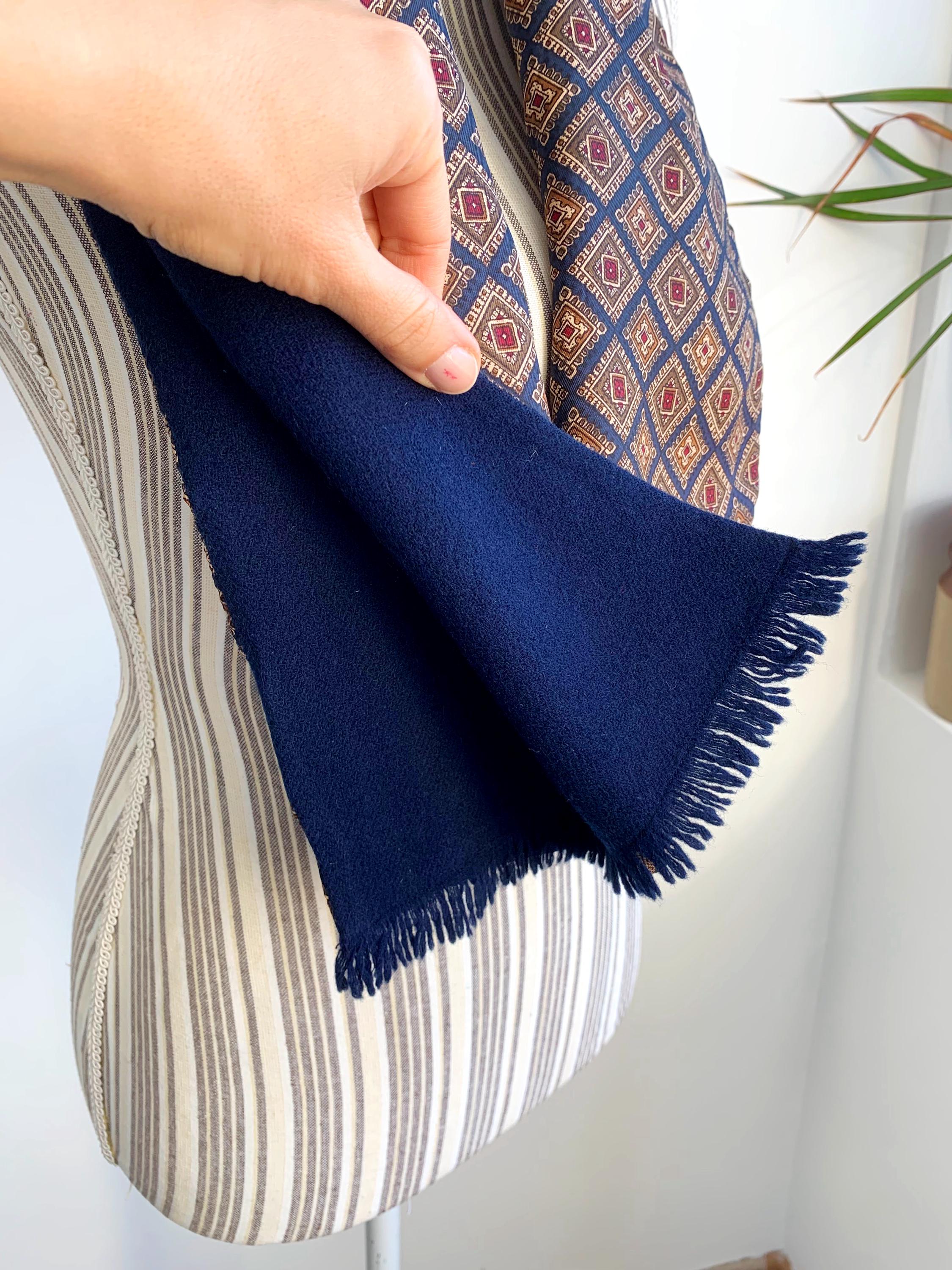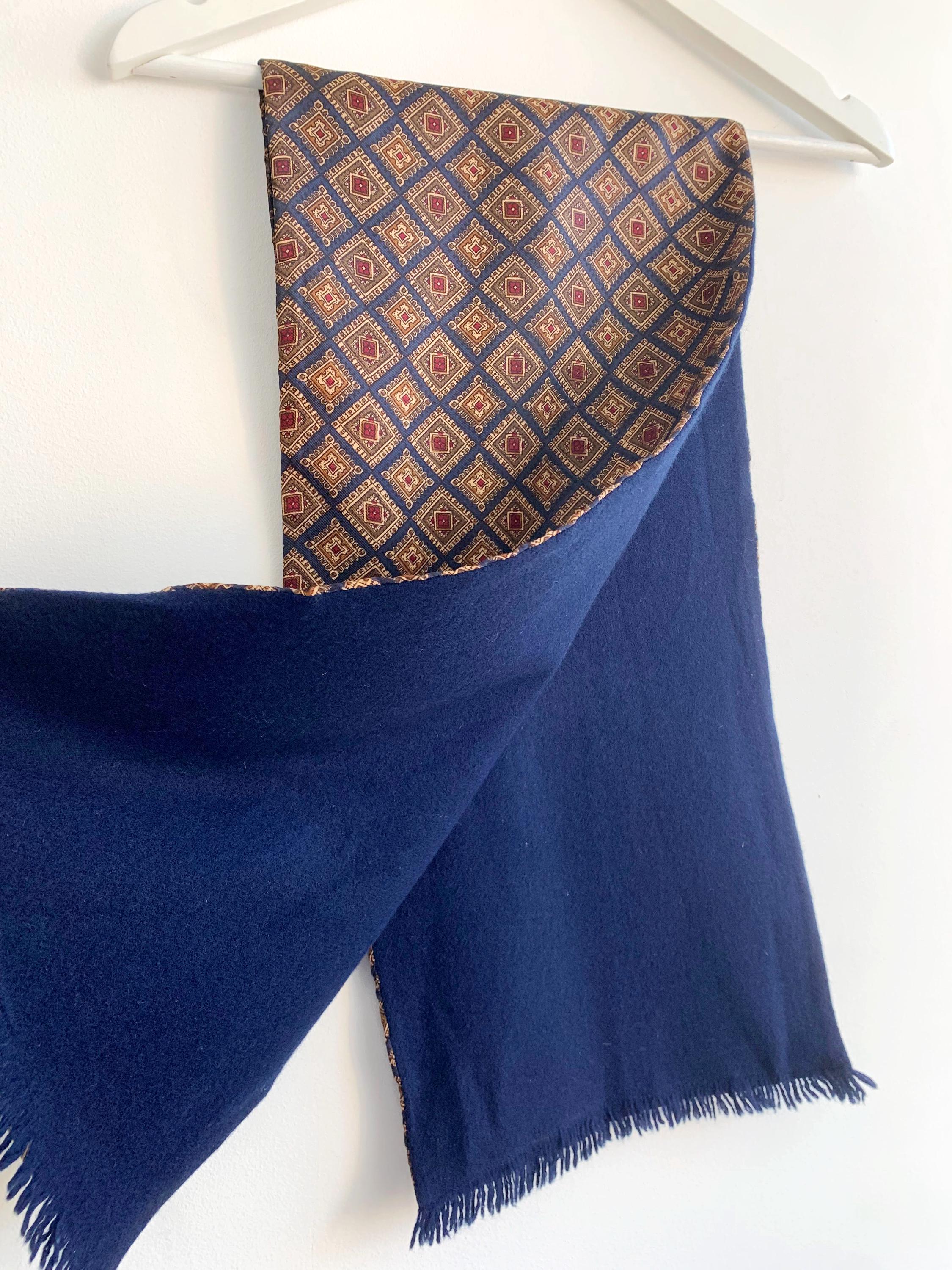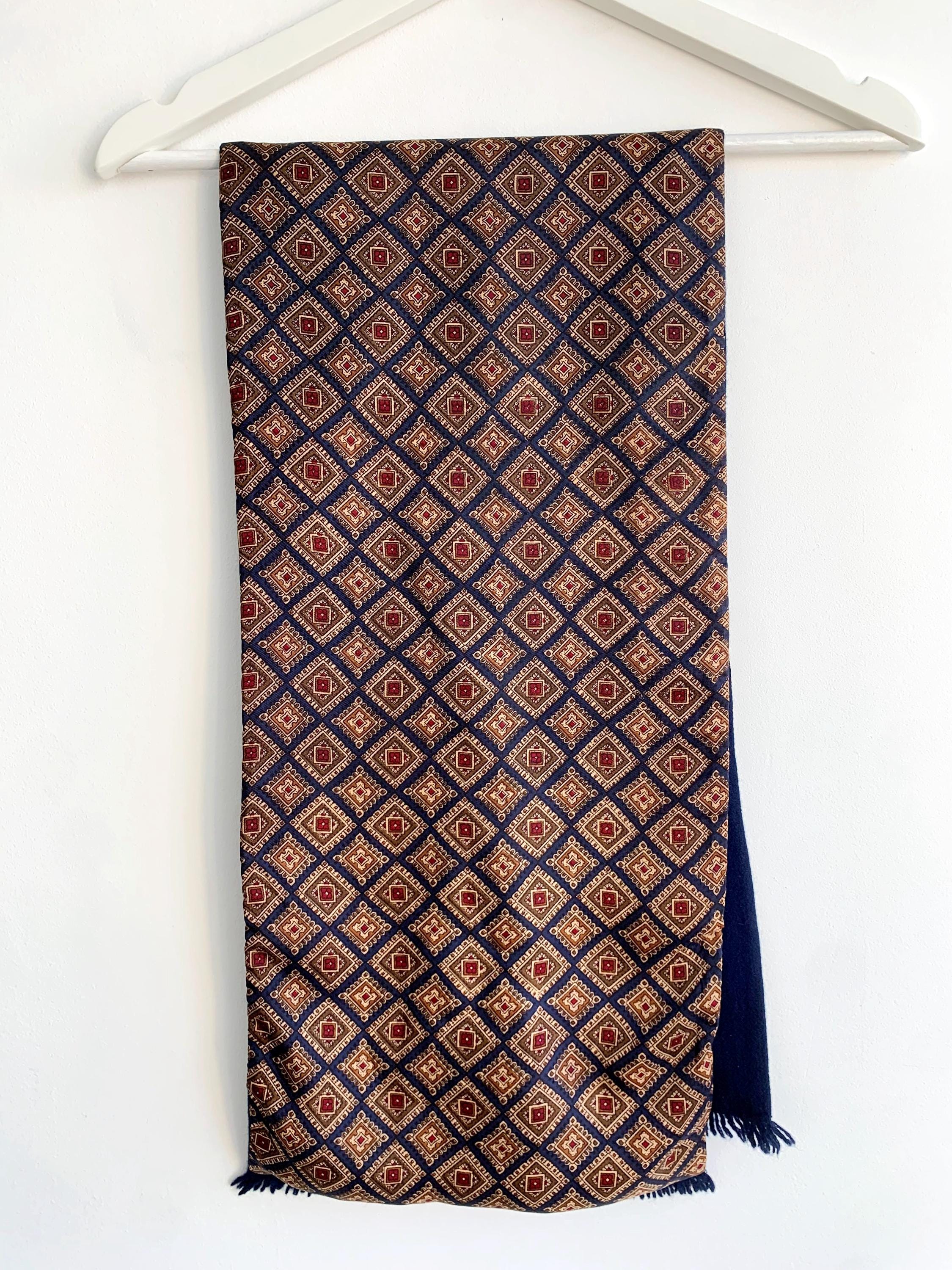 This is a vintage double sided neck scarf - the front side is made of silky satin fabric with gorgeous geometric oriental print in shades of navy blue, camel beige, khaki green and burgundy red. The back side is made of soft wool fabric in navy blue color. Perfect vintage gift for him.