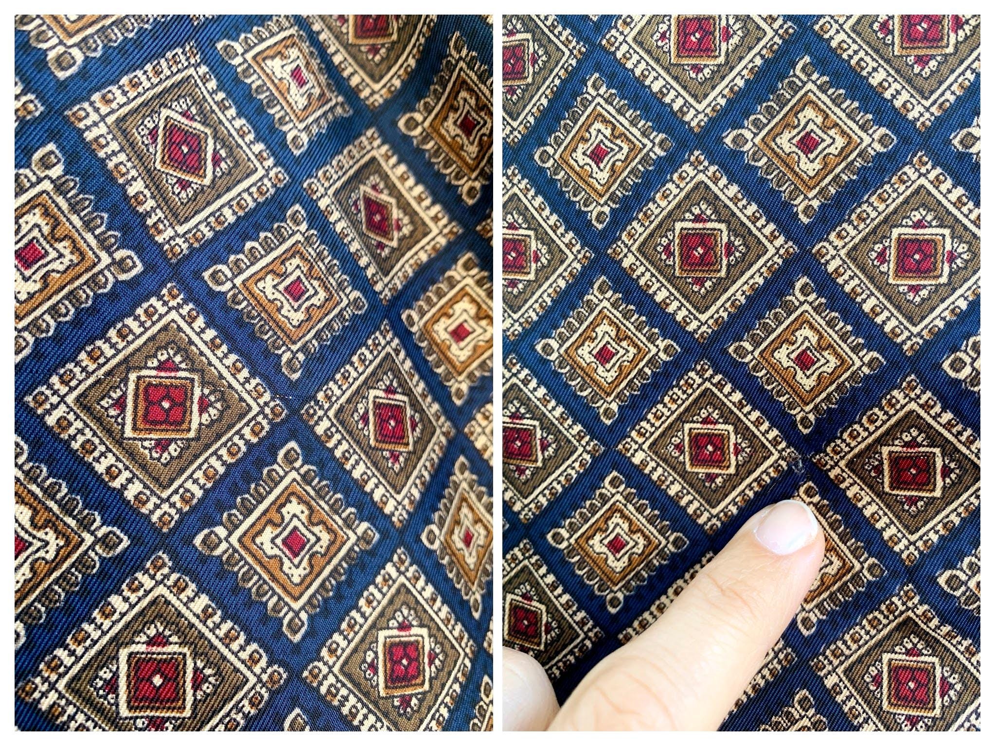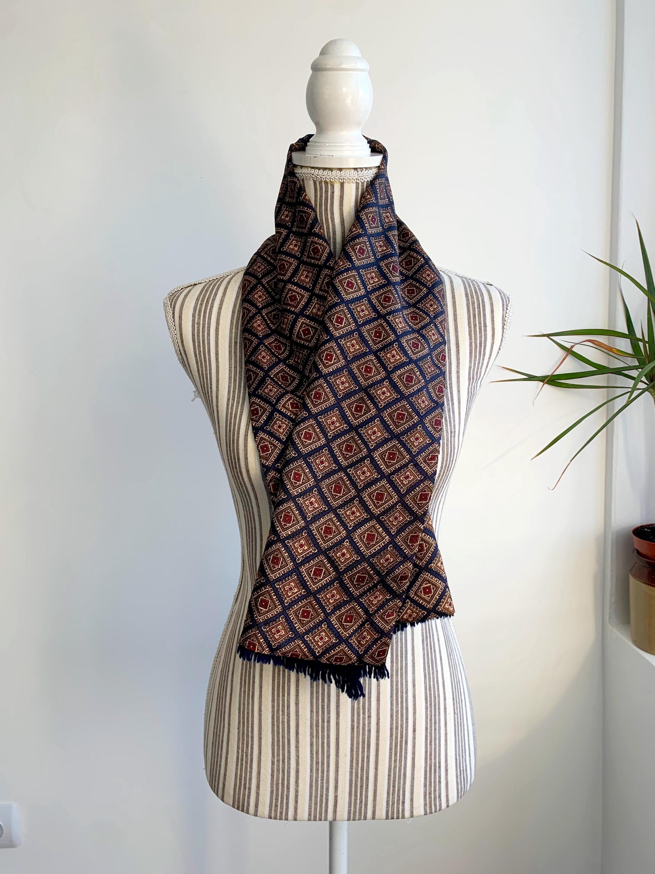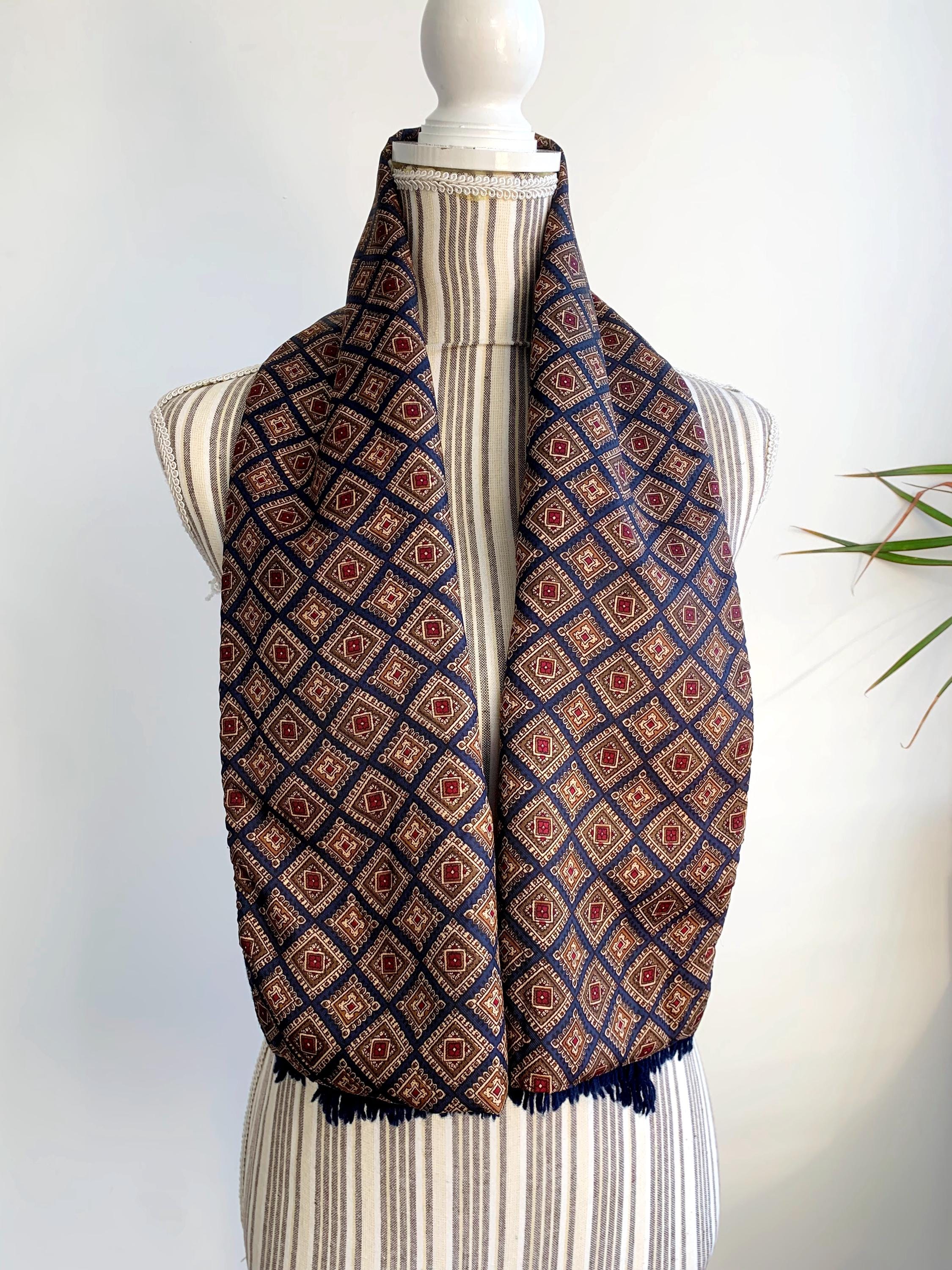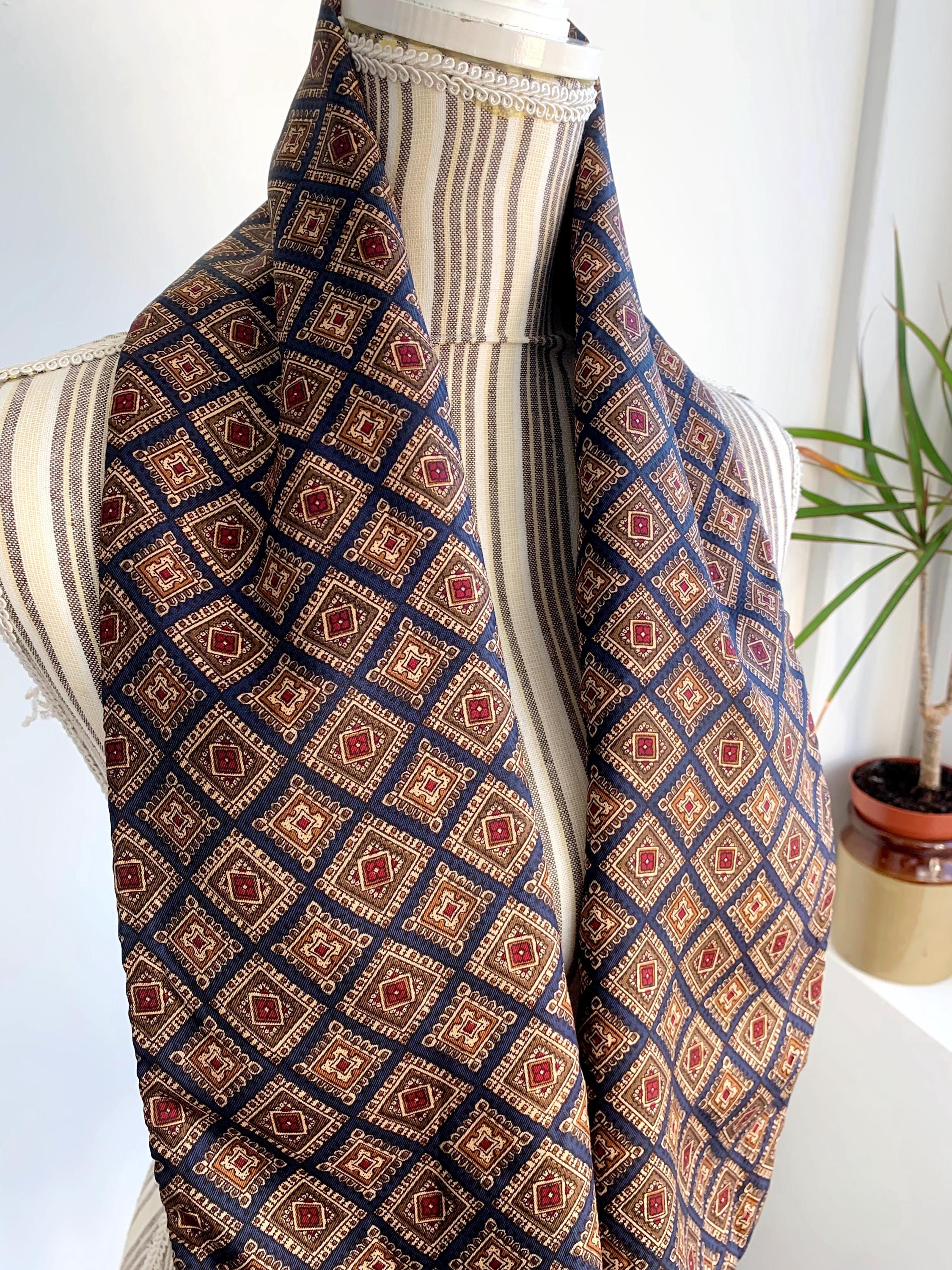 This is a vintage double sided neck scarf - the front side is made of silky satin fabric with gorgeous geometric oriental print in shades of navy blue, camel beige, khaki green and burgundy red. The back side is made of soft wool fabric in navy blue color. Perfect vintage gift for him.