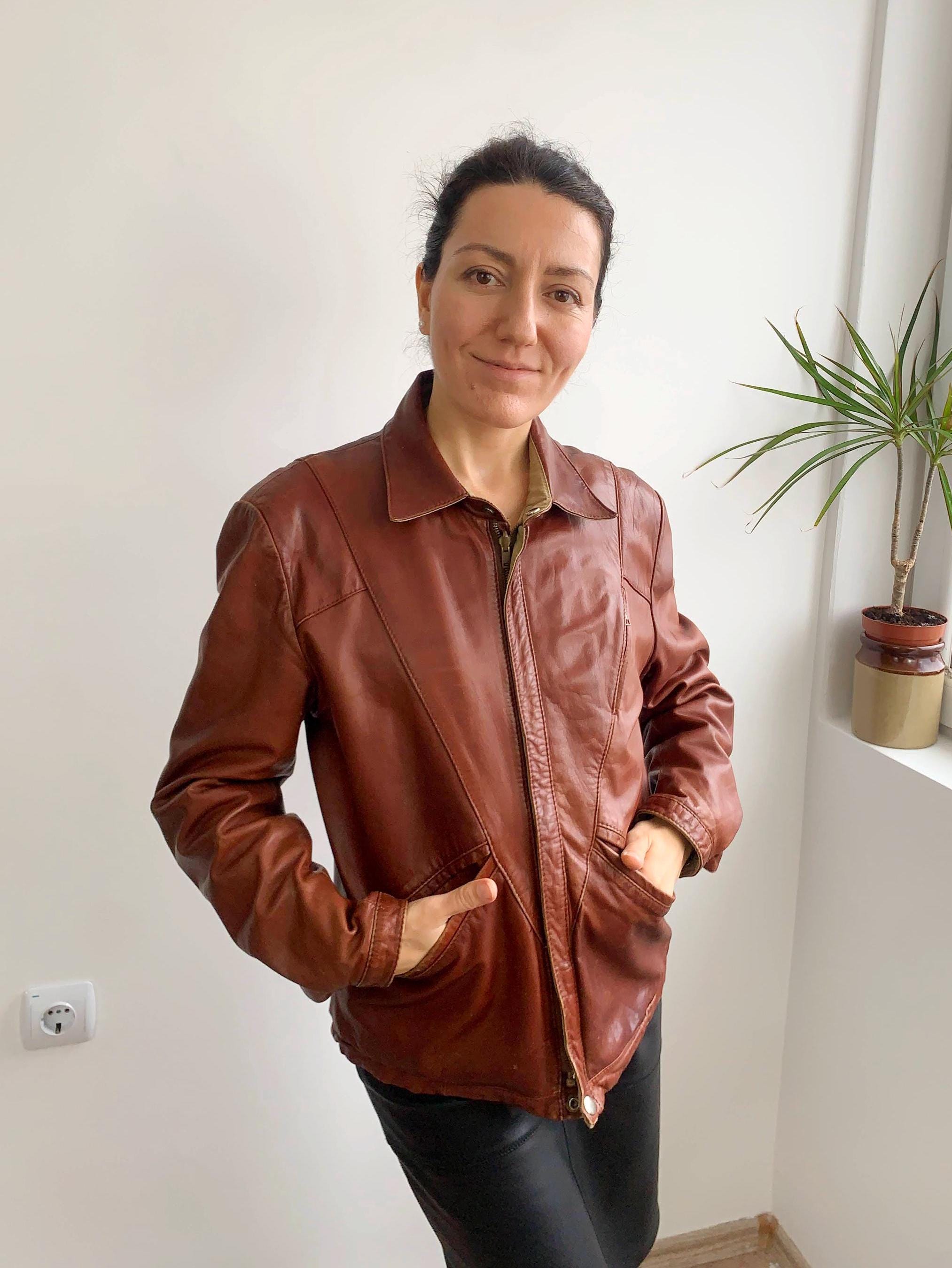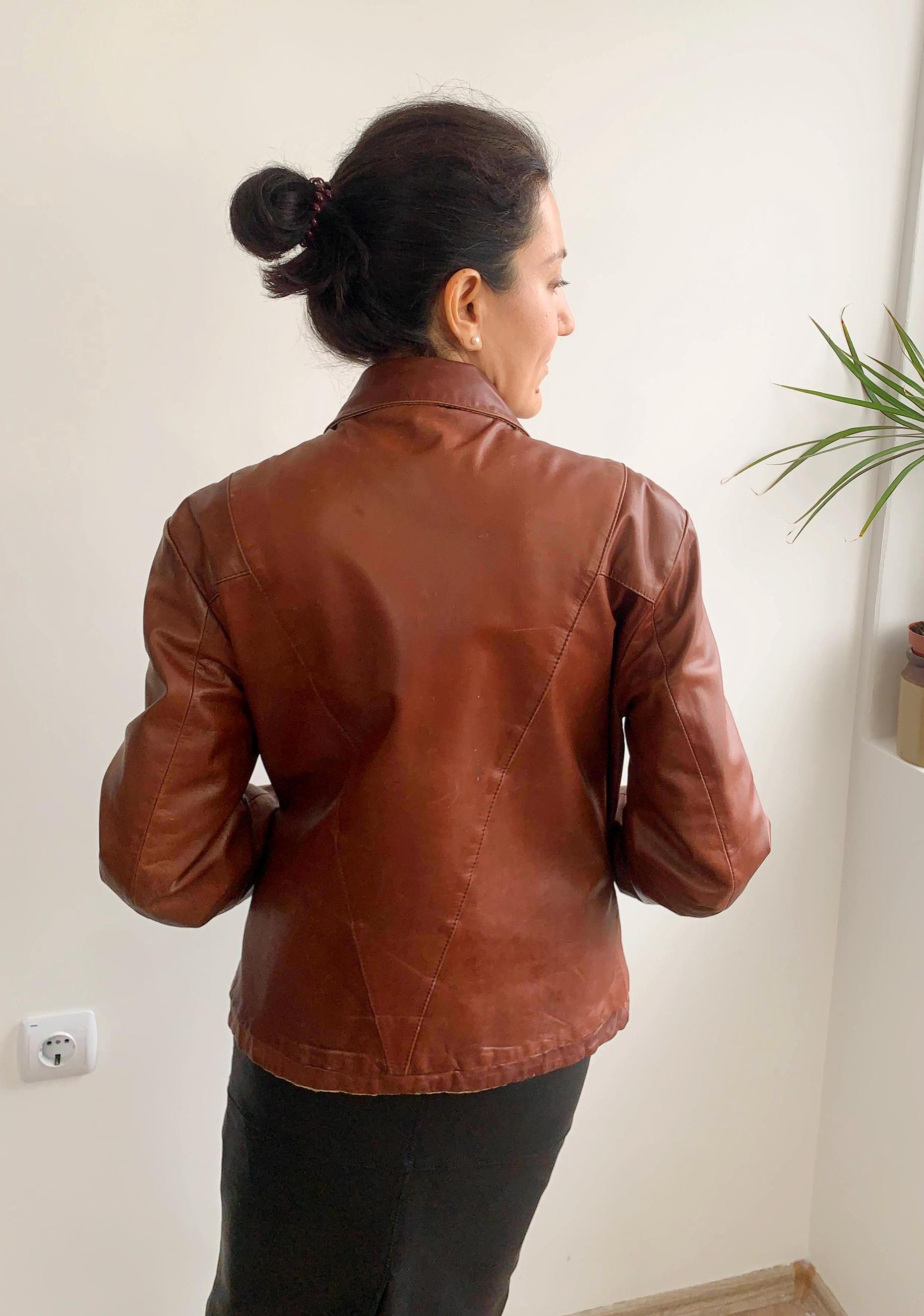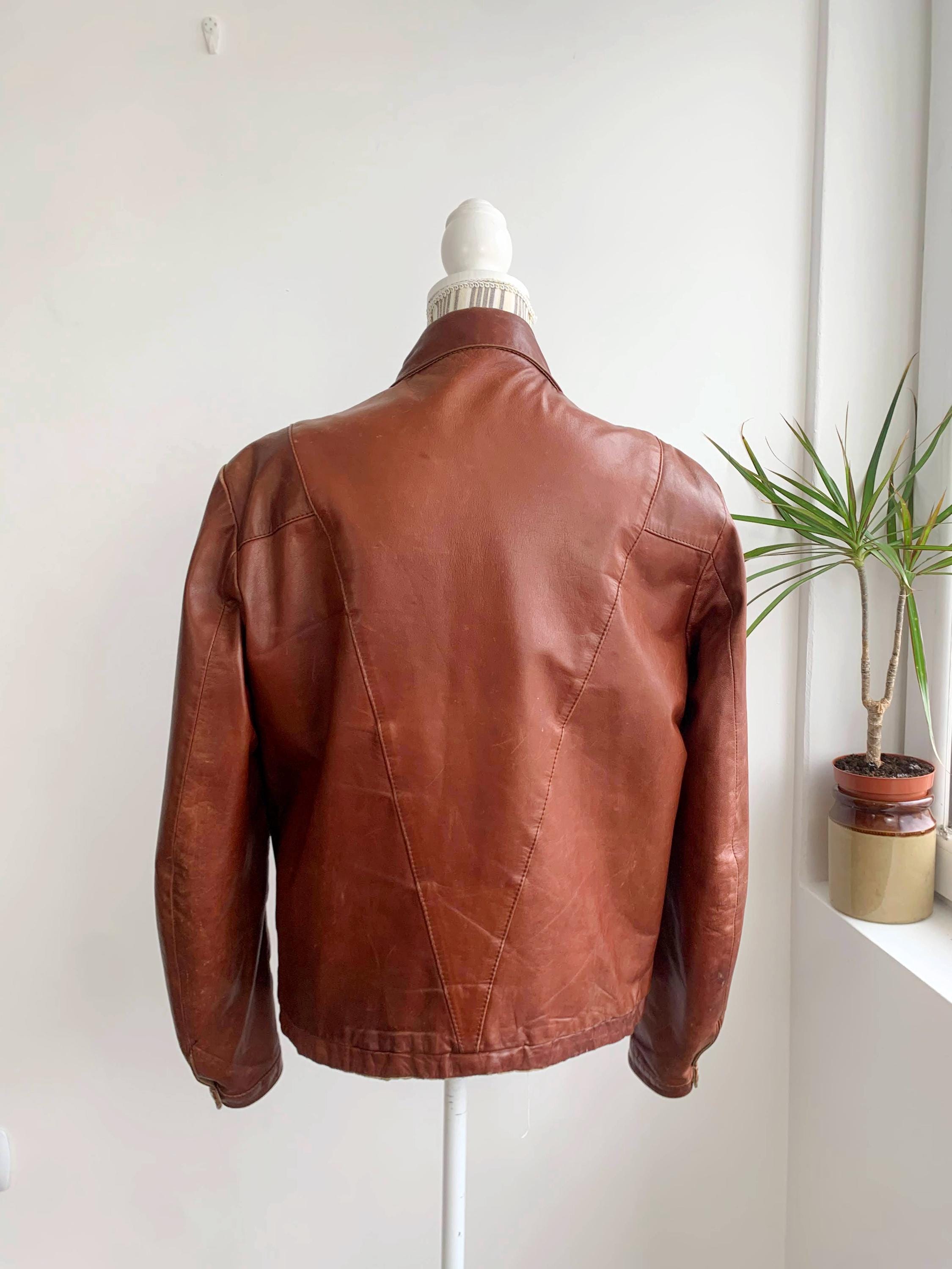 This is a vintage 70s genuine leather bomber jacket for men size 50, which fits like S/M mens clothing size. This distressed leather jacket is suitable for women too with its unisex design, it would best fit women's clothing size M/L. This heavily distressed leather bomber jacket has zip up closure , zip up chest pocket and and two pockets. This boho chic toffee brown leather jacket is made of sturdy genuine leather and cotton lining. This motorcycle jacket has relaxed casual look, perfect for every day. Please check the measurements below.