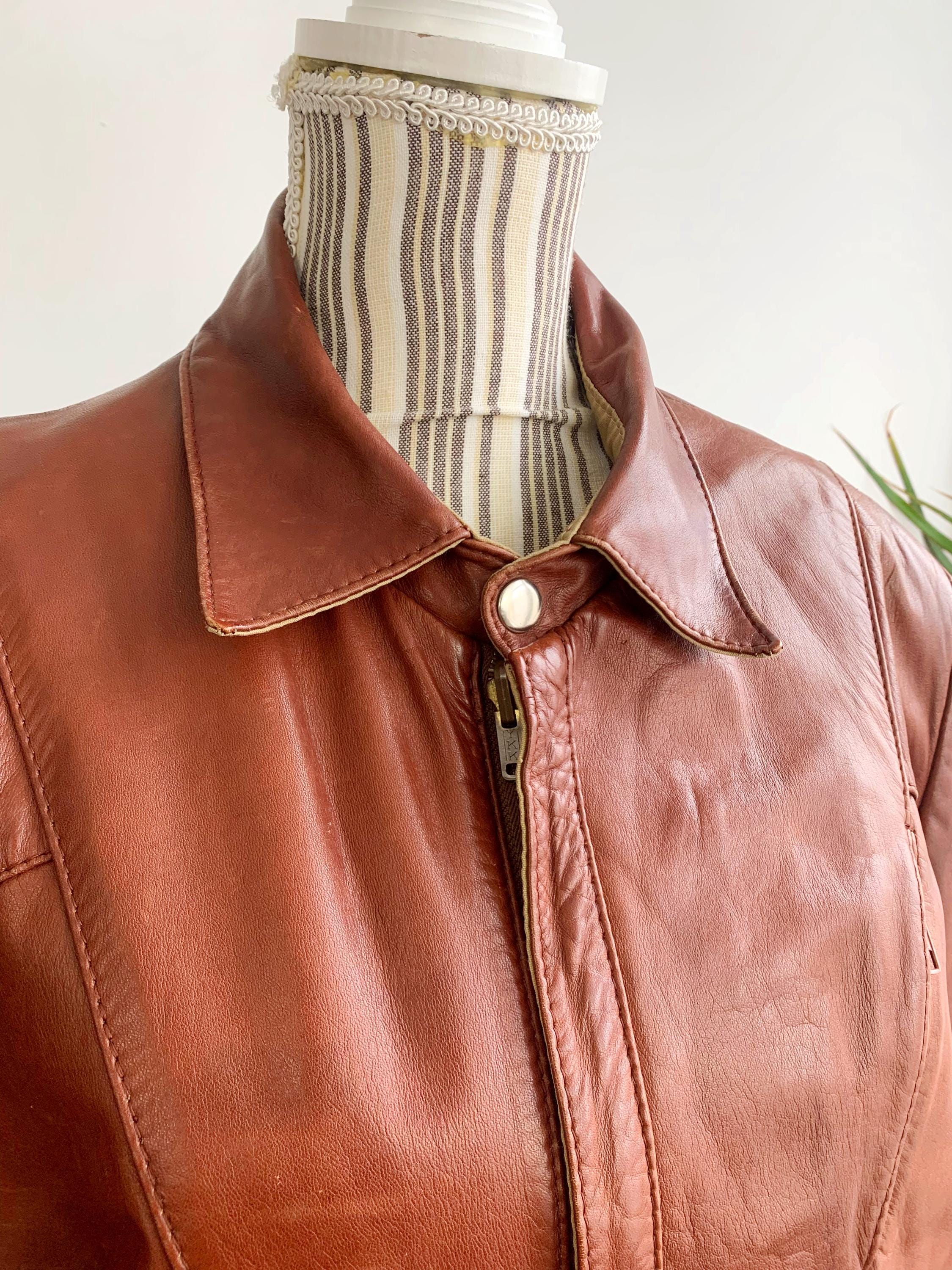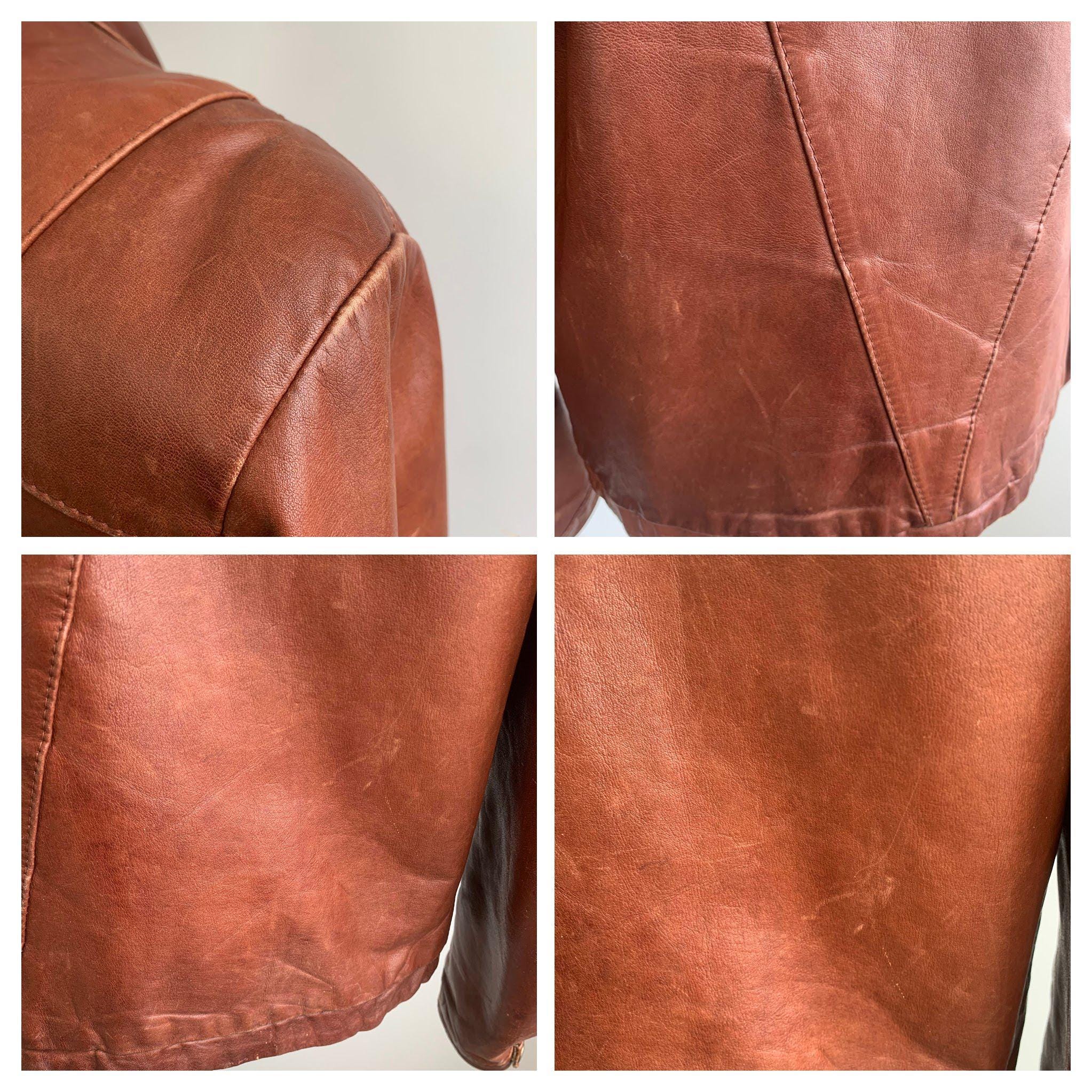 Condition: this brown leather jacket was pre- loved and has heavily distressed look with numerous scratches and marks on the genuine leather surface, fading around the edges and some darkening of the cotton lining inside at the cuffs.